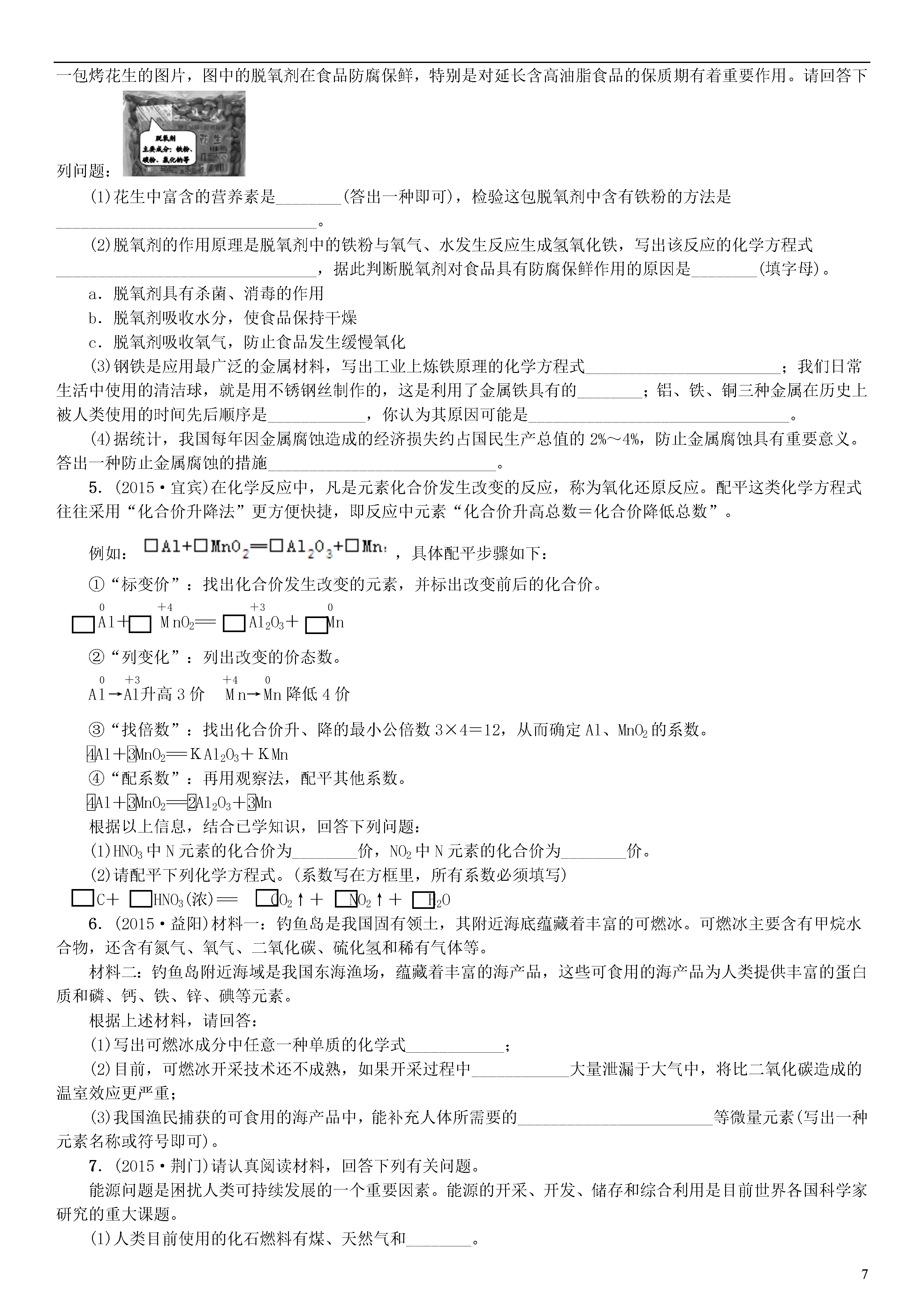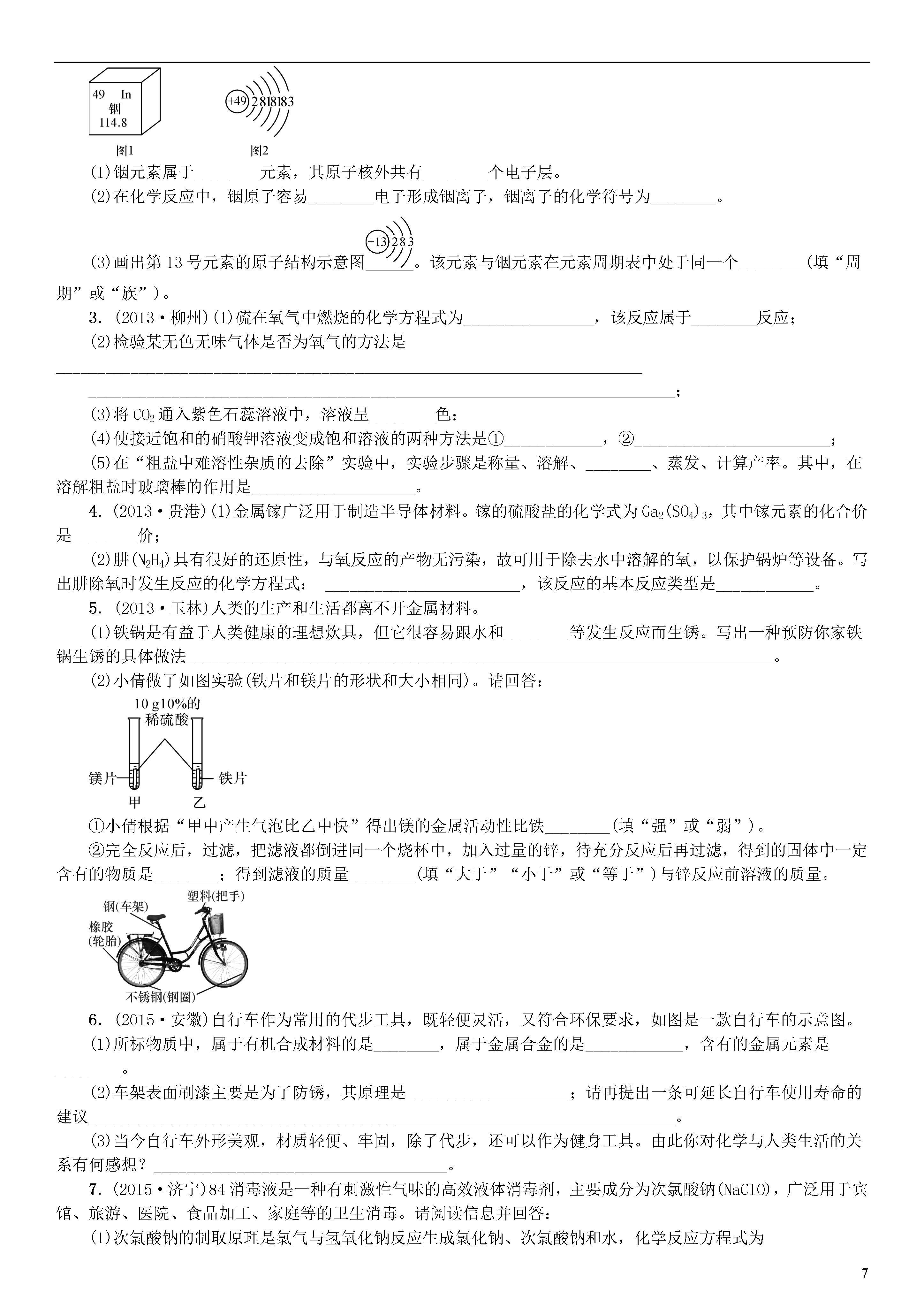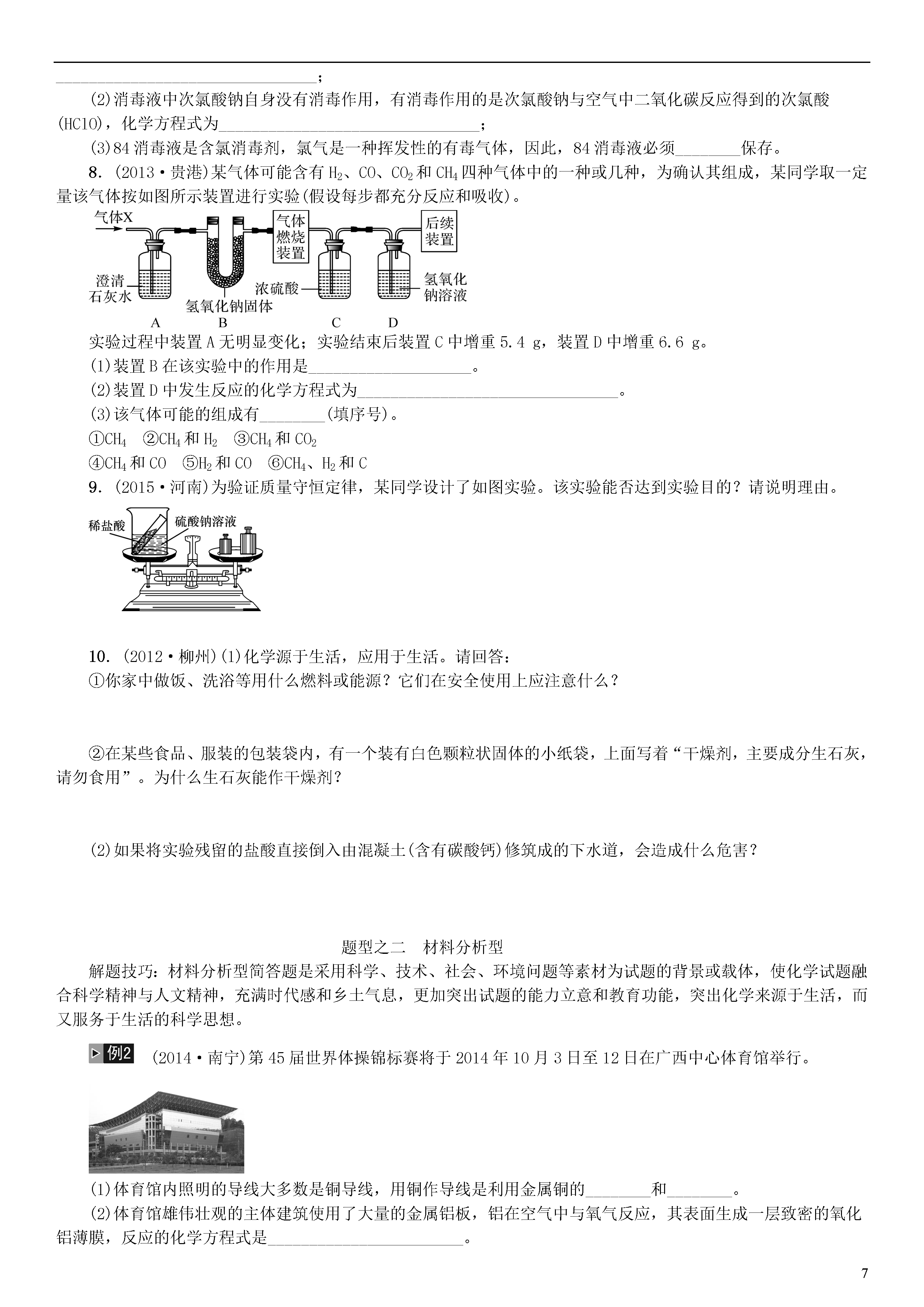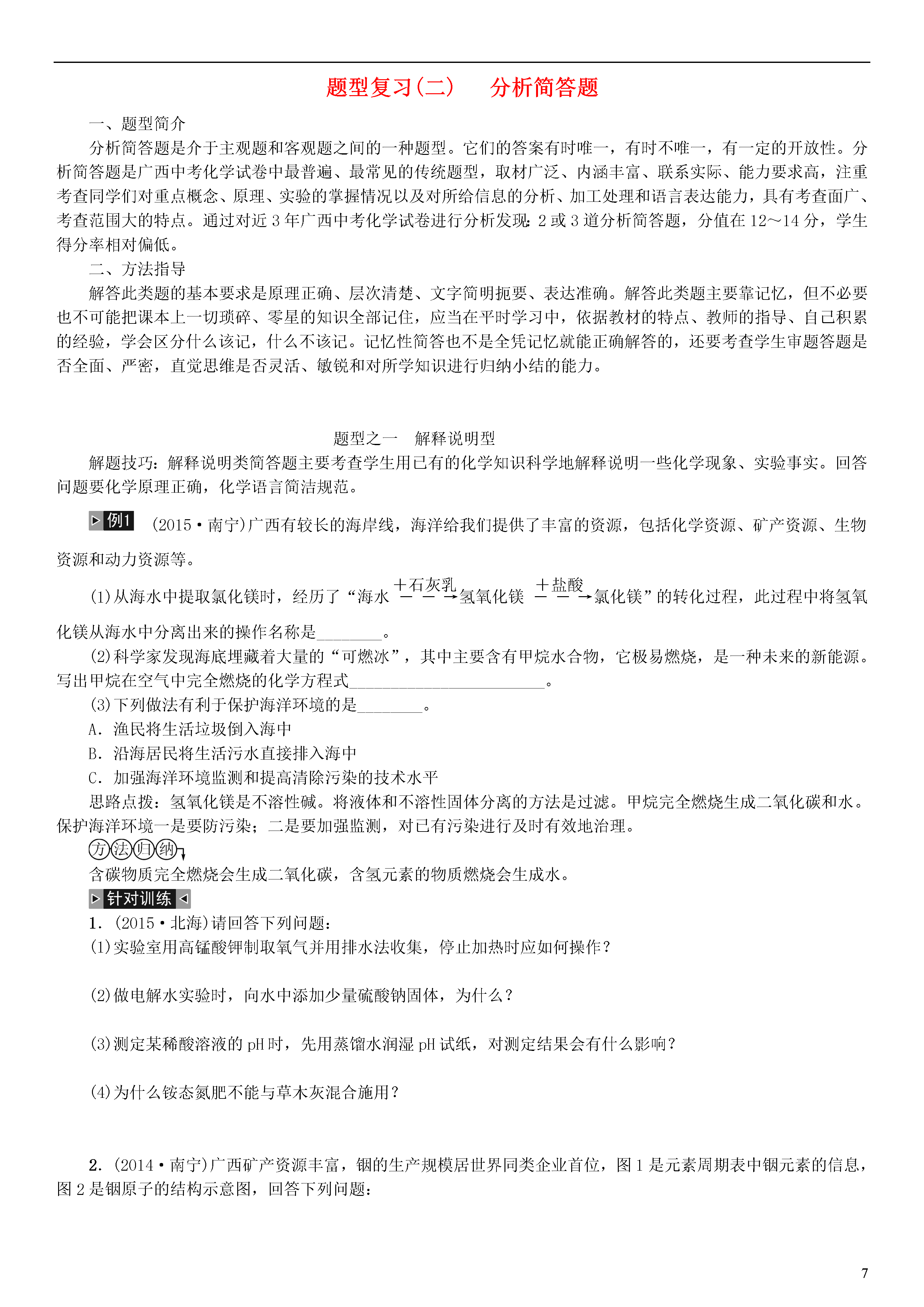 7题型复习(二)分析简答题一、题型简介分析简答题是介于主观题和客观题之间的一种题型。它们的答案有时唯一,有时不唯一,有一定的开放性。分析简答题是广西中考化学试卷中最普遍、最常见的传统题型,取材广泛、内涵丰富、联系实际、能力要求高,注重考查同学们对重点概念、原理、实验的掌握情况以及对所给信息的分析、加工处理和语言表达能力,具有考查面广、考查范围大的特点。通过对近3年广西中考化学试卷进行分析发现:2或3道分析简答题,分值在12~14分,学生得分率相对偏低。二、方法指导解答此类题的基本要求是原理正确、层次清楚、文字简明扼要、表达准确。解答此类题主要靠记忆,但不必要也不可能把课本上一切琐碎、零星的知识全部记住,应当在平时学习中,依据教材的特点、教师的指导、自己积累的经验,学会区分什么该记,什么不该记。记忆性简答也不是全凭记忆就能正确解答的,还要考查学生审题答题是否全面、严密,直觉思维是否灵活、敏锐和对所学知识进行归纳小结的能力。题型之一解释说明型解题技巧:解释说明类简答题主要考查学生用已有的化学知识科学地解释说明一些化学现象、实验事实。回答问题要化学原理正确,化学语言简洁规范。(2015·南宁)广西有较长的海岸线,海洋给我们提供了丰富的资源,包括化学资源、矿产资源、生物资源和动力资源等。(1)从海水中提取氯化镁时,经历了“海水eq\o(――→,\s\up7(+石灰乳))氢氧化镁eq\o(――→,\s\up7(+盐酸))氯化镁”的转化过程,此过程中将氢氧化镁从海水中分离出来的操作名称是________。(2)科学家发现海底埋藏着大量的“可燃冰”,其中主要含有甲烷水合物,它极易燃烧,是一种未来的新能源。写出甲烷在空气中完全燃烧的化学方程式________________________。(3)下列做法有利于保护海洋环境的是________。A.渔民将生活垃圾倒入海中B.沿海居民将生活污水直接排入海中C.加强海洋环境监测和提高清除污染的技术水平思路点拨:氢氧化镁是不溶性碱。将液体和不溶性固体分离的方法是过滤。甲烷完全燃烧生成二氧化碳和水。保护海洋环境一是要防污染;二是要加强监测,对已有污染进行及时有效地治理。含碳物质完全燃烧会生成二氧化碳,含氢元素的物质燃烧会生成水。1.(2015·北海)请回答下列问题:(1)实验室用高锰酸钾制取氧气并用排水法收集,停止加热时应如何操作?(2)做电解水实验时,向水中添加少量硫酸钠固体,为什么?(3)测定某稀酸溶液的pH时,先用蒸馏水润湿pH试纸,对测定结果会有什么影响?(4)为什么铵态氮肥不能与草木灰混合施用?2.(2014·南宁)广西矿产资源丰富,铟的生产规模居世界同类企业首位,图1是元素周期表中铟元素的信息,图2是铟原子的结构示意图,回答下列问题:(1)铟元素属于________元素,其原子核外共有________个电子层。(2)在化学反应中,铟原子容易________电子形成铟离子,铟离子的化学符号为________。(3)画出第13号元素的原子结构示意图。该元素与铟元素在元素周期表中处于同一个________(填“周期”或“族”)。3.(2013·柳州)(1)硫在氧气中燃烧的化学方程式为________________,该反应属于________反应;(2)检验某无色无味气体是否为氧气的方法是________________________________________________________________________________________________________________________________________________;(3)将CO2通入紫色石蕊溶液中,溶液呈________色;(4)使接近饱和的硝酸钾溶液变成饱和溶液的两种方法是①____________,②________________________;(5)在“粗盐中难溶性杂质的去除”实验中,实验步骤是称量、溶解、________、蒸发、计算产率。其中,在溶解粗盐时玻璃棒的作用是____________________。4.(2013·贵港)(1)金属镓广泛用于制造半导体材料。镓的硫酸盐的化学式为Ga2(SO4)3,其中镓元素的化合价是________价;(2)肼(N2H4)具有很好的还原性,与氧反应的产物无污染,故可用于除去水中溶解的氧,以保护锅炉等设备。写出肼除氧时发生反应的化学方程式:________________________,该反应的基本反应类型是____________。5.(2013·玉林)人类的生产和生活都离不开金属材料。(1)铁锅是有益于人类健康的理