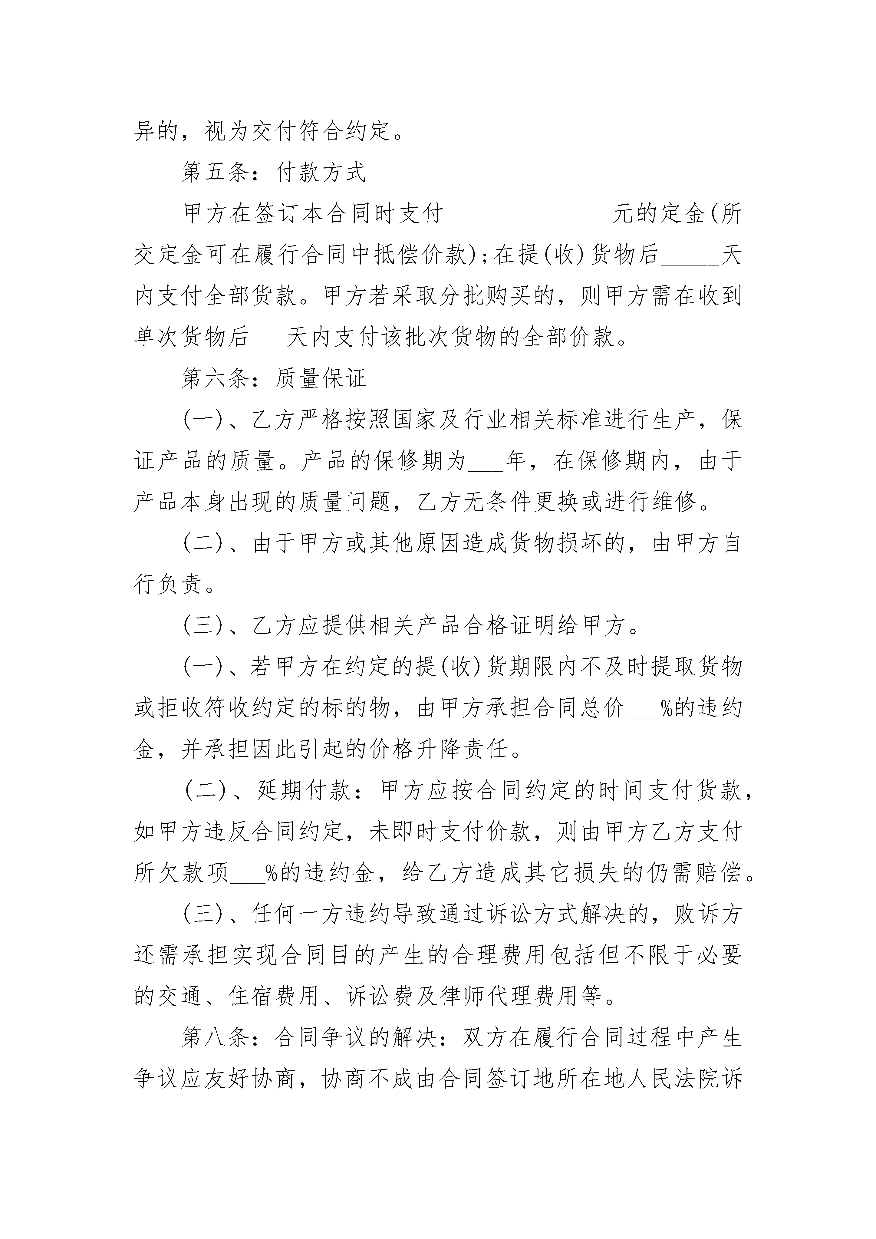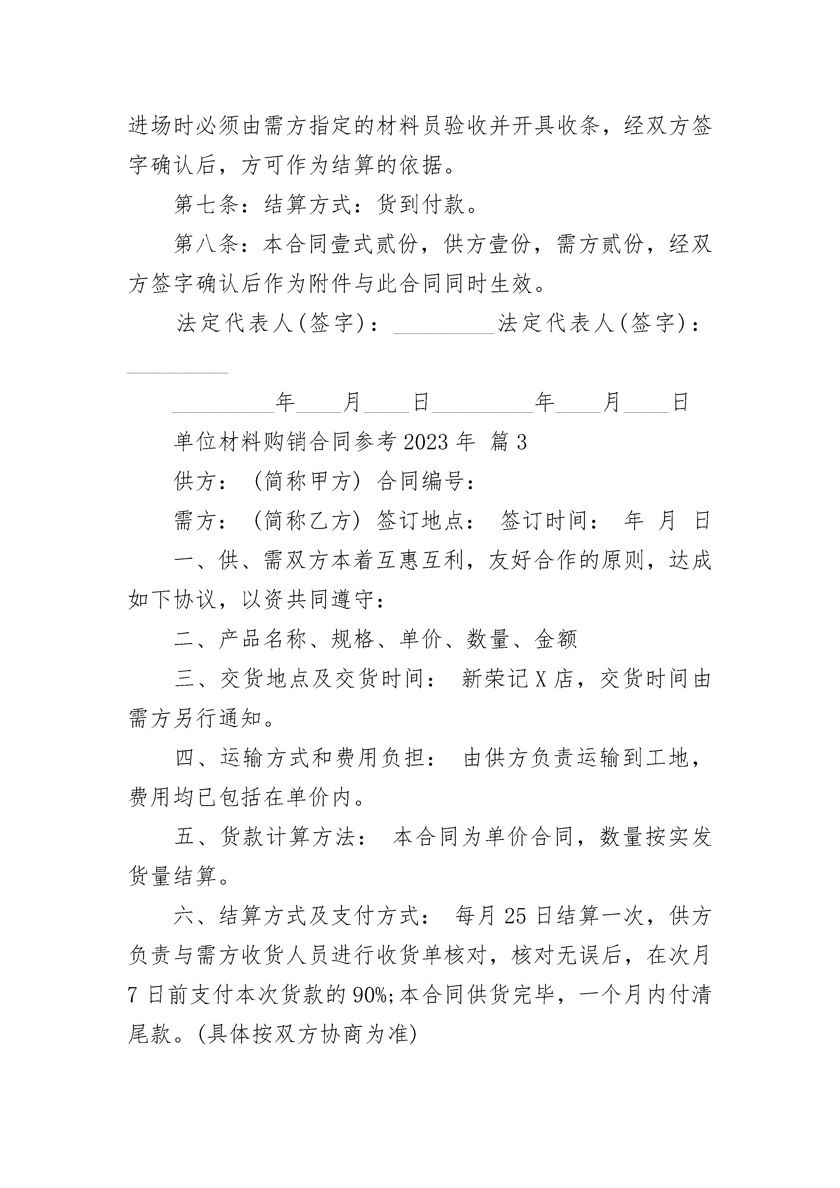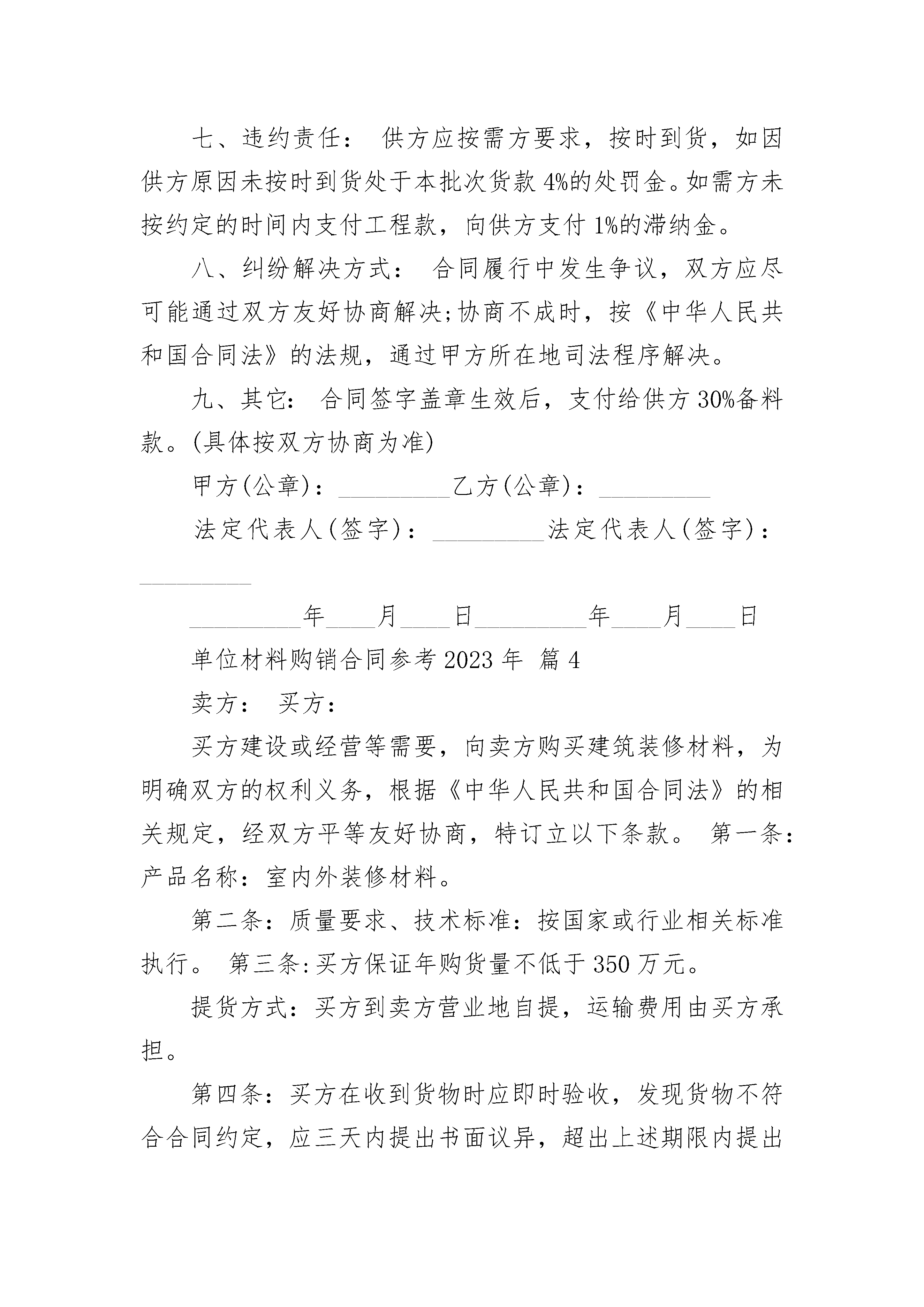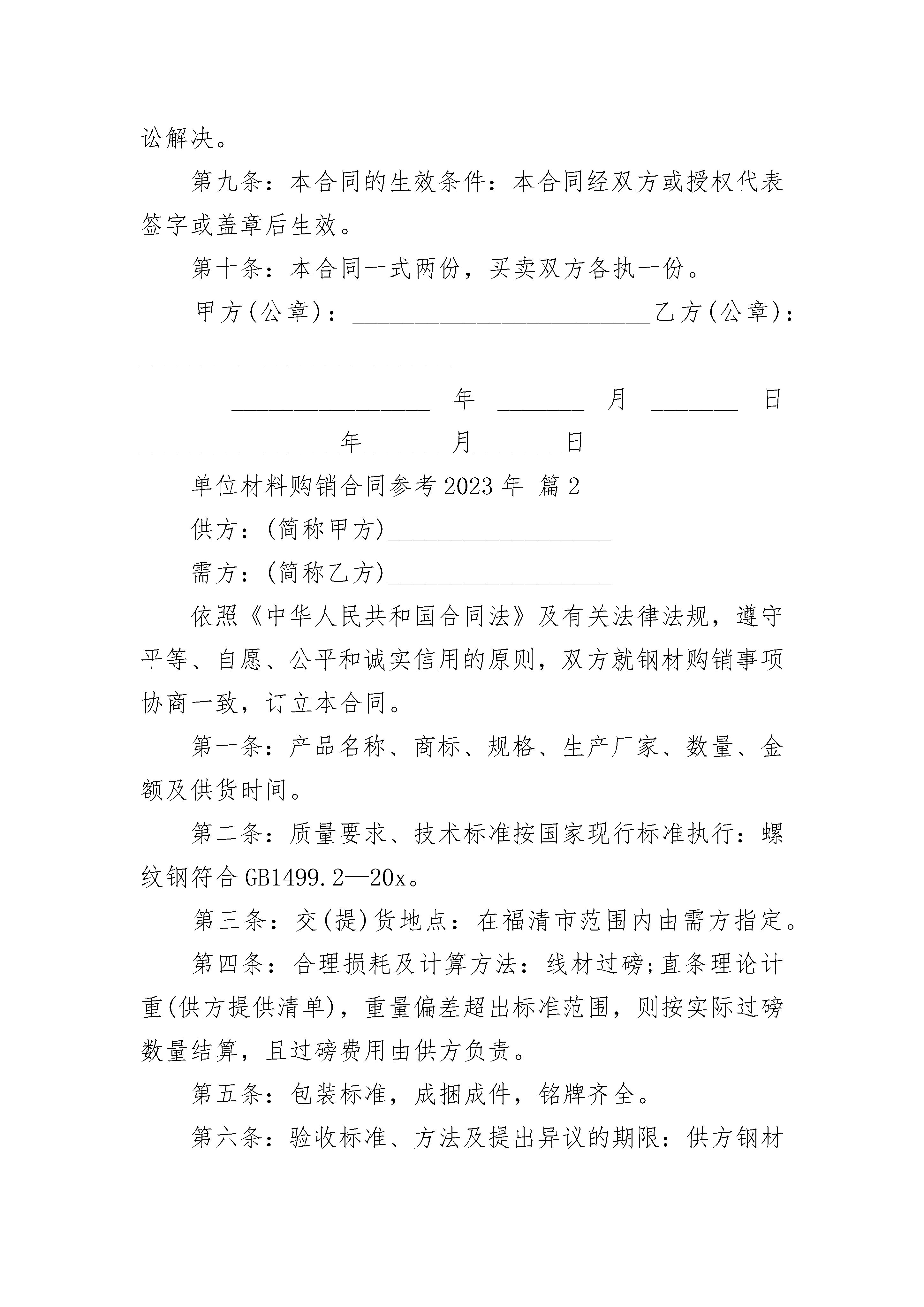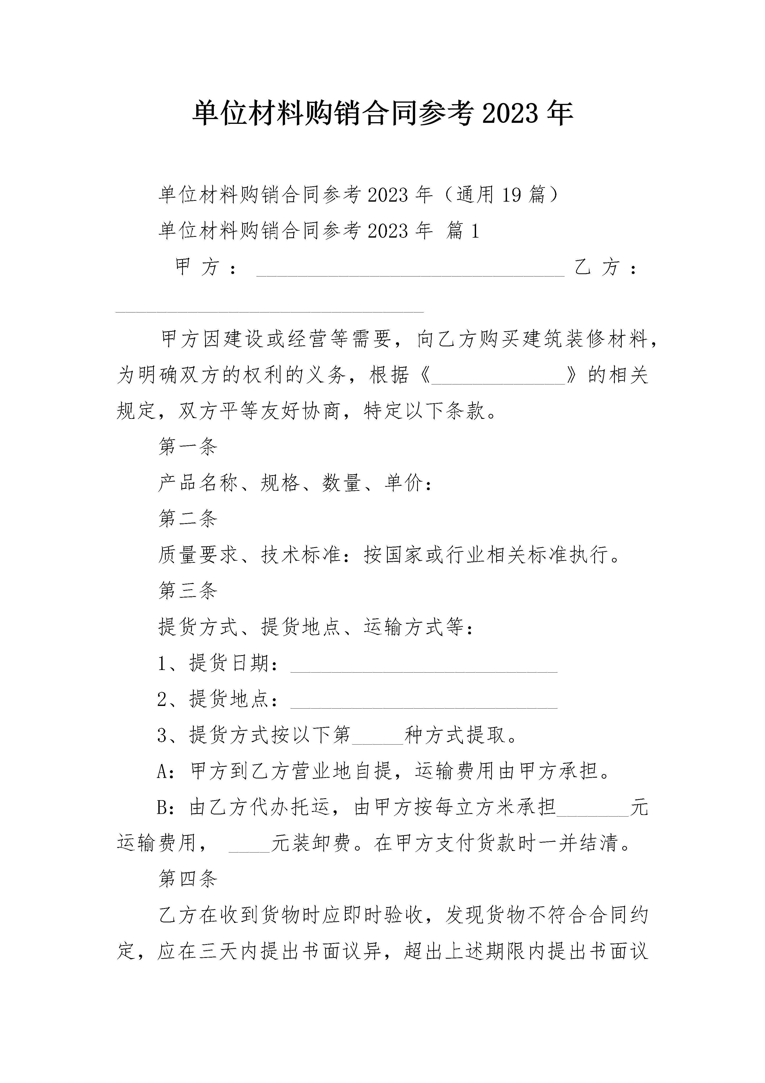 单位材料购销合同参考2023年单位材料购销合同参考2023年(通用19篇)单位材料购销合同参考2023年篇1甲方:______________________________乙方:______________________________甲方因建设或经营等需要,向乙方购买建筑装修材料,为明确双方的权利的义务,根据《_____________》的相关规定,双方平等友好协商,特定以下条款。第一条产品名称、规格、数量、单价:第二条质量要求、技术标准:按国家或行业相关标准执行。第三条提货方式、提货地点、运输方式等:1、提货日期:__________________________2、提货地点:__________________________3、提货方式按以下第_____种方式提取。A:甲方到乙方营业地自提,运输费用由甲方承担。B:由乙方代办托运,由甲方按每立方米承担_______元运输费用,____元装卸费。在甲方支付货款时一并结清。第四条乙方在收到货物时应即时验收,发现货物不符合合同约定,应在三天内提出书面议异,超出上述期限内提出书面议异的,视为交付符合约定。第五条:付款方式甲方在签订本合同时支付______________元的定金(所交定金可在履行合同中抵偿价款);在提(收)货物后_____天内支付全部货款。甲方若采取分批购买的,则甲方需在收到单次货物后___天内支付该批次货物的全部价款。第六条:质量保证(一)、乙方严格按照国家及行业相关标准进行生产,保证产品的质量。产品的保修期为___年,在保修期内,由于产品本身出现的质量问题,乙方无条件更换或进行维修。(二)、由于甲方或其他原因造成货物损坏的,由甲方自行负责。(三)、乙方应提供相关产品合格证明给甲方。(一)、若甲方在约定的提(收)货期限内不及时提取货物或拒收符收约定的标的物,由甲方承担合同总价___%的违约金,并承担因此引起的价格升降责任。(二)、延期付款:甲方应按合同约定的时间支付货款,如甲方违反合同约定,未即时支付价款,则由甲方乙方支付所欠款项___%的违约金,给乙方造成其它损失的仍需赔偿。(三)、任何一方违约导致通过诉讼方式解决的,败诉方还需承担实现合同目的产生的合理费用包括但不限于必要的交通、住宿费用、诉讼费及律师代理费用等。第八条:合同争议的解决:双方在履行合同过程中产生争议应友好协商,协商不成由合同签订地所在地人民法院诉讼解决。第九条:本合同的生效条件:本合同经双方或授权代表签字或盖章后生效。第十条:本合同一式两份,买卖双方各执一份。甲方(公章):________________________乙方(公章):_________________________________________年_______月_______日________________年_______月_______日单位材料购销合同参考2023年篇2供方:(简称甲方)__________________需方:(简称乙方)__________________依照《中华人民共和国合同法》及有关法律法规,遵守平等、自愿、公平和诚实信用的原则,双方就钢材购销事项协商一致,订立本合同。第一条:产品名称、商标、规格、生产厂家、数量、金额及供货时间。第二条:质量要求、技术标准按国家现行标准执行:螺纹钢符合GB1499.2—20x。第三条:交(提)货地点:在福清市范围内由需方指定。第四条:合理损耗及计算方法:线材过磅;直条理论计重(供方提供清单),重量偏差超出标准范围,则按实际过磅数量结算,且过磅费用由供方负责。第五条:包装标准,成捆成件,铭牌齐全。第六条:验收标准、方法及提出异议的期限:供方钢材进场时必须由需方指定的材料员验收并开具收条,经双方签字确认后,方可作为结算的依据。第七条:结算方式:货到付款。第八条:本合同壹式贰份,供方壹份,需方贰份,经双方签字确认后作为附件与此合同同时生效。法定代表人(签字):_________法定代表人(签字):__________________年____月____日_________年____月____日单位材料购销合同参考2023年篇3供方:(简称甲方)合同编号:需方:(简称乙方)签订地点:签订时间:年月日一、供、需双方本着互惠互利,友好合作的原则,达成如下协议,以资共同遵守:二、产品名称、规格、单价、数量、金额三、交货地点及交货时间:新荣记X店,交货时间由需方另行通知。四、运输方式和费用负担:由供方负责运输到工地,费用均已包括在单价内。五、货款计算方法:本合同为单价合同,数量按实发货量结算。六、结算方式及支付方式:每月25日结算一次,供方负责与需方收货人员进行收货单核对,核对无误后,在次月7日前支付本次货款的90%;本合同供货完毕,一个月内付清尾款。(具体按双