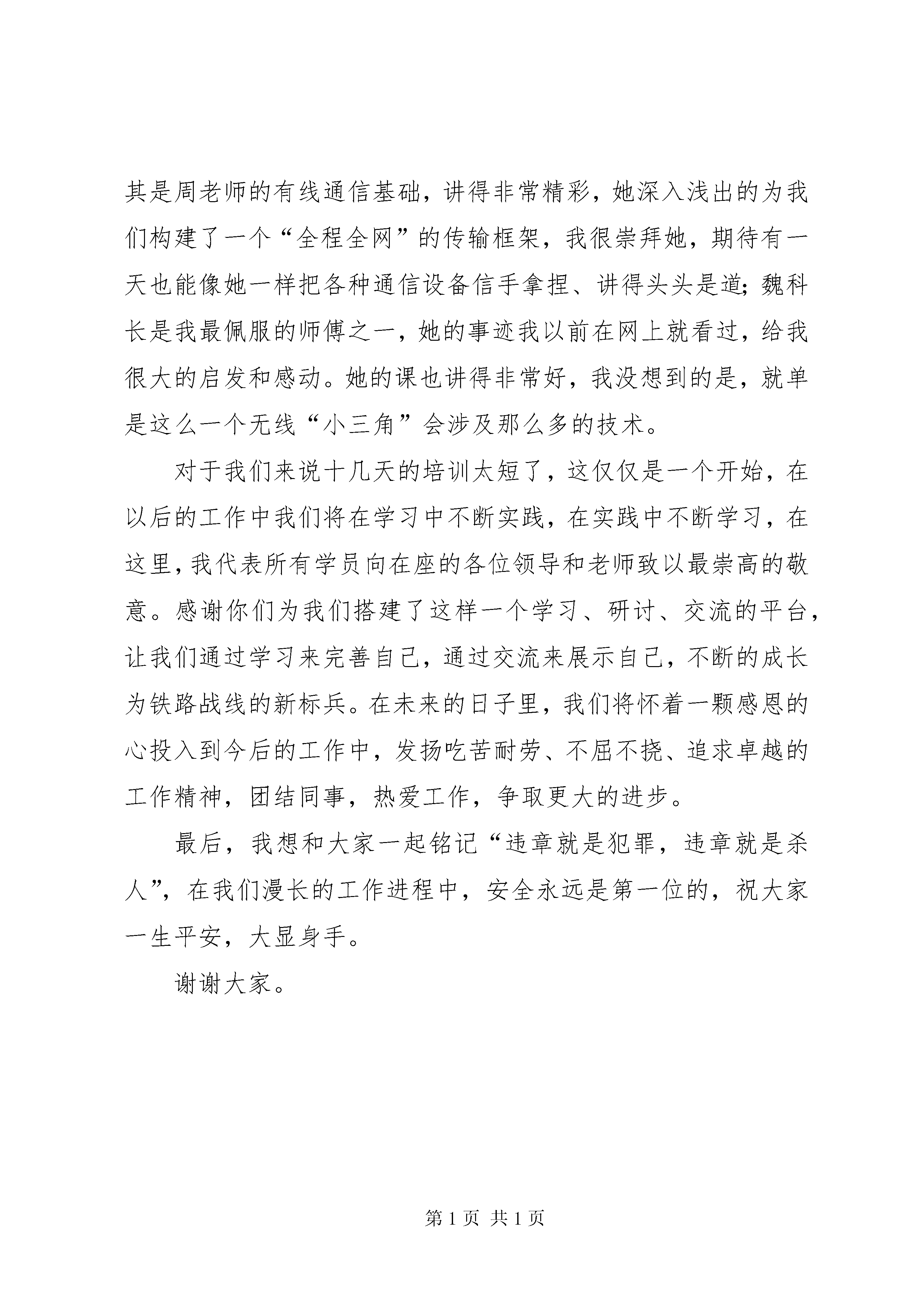 在全区公安机关警务技能强化提高班结业典礼上的代表发言在培训班结业典礼上的发言尊敬的各位领导、老师、同学们:大家好。我叫xxx,来自xx省,毕业于天津铁道职业技术学院。能够成为xxxxxxx通信段的一名职工,我感到非常荣幸,尤其是今天能代表培训班的学员在这里发言,更让我感到无比激动。十天的培训虽然短暂,但是却让我们在这里学到了知识,感受到了铁路这个大家庭的温暖,十天中,我们经历了太多的心理变化,回想这10天的培训,仍历历在目……我们班上共有五十九名学员,大部分都来自于外地,初进兰州时,我内心是凄凉的,真有一种“过一层隧道,凉一层心”的感觉,直到鹿科长的第一堂课,才让我从“局情段貌”的叙述开始了解这个充满浓重西北风情的地域,才萌生了汉武挥鞭,成就一番大事的想法。随后,跟着x老师、韩老师进入到规章制度、劳动安全授课中,我第一次把安全和工作结合到一起,第一次感觉到生命的脆弱,强烈地意识到铁路安全的重要性,从那时起我就在心里筑起了安全长城,时刻铭记于心。回想这十天的课程,从概况到基础,从理论到实践,我们每一个人都学到了很多,尤其是周老师的有线通信基础,讲得非常精彩,她深入浅出的为我们构建了一个“全程全网”的传输框架,我很崇拜她,期待有一天也能像她一样把各种通信设备信手拿捏、讲得头头是道;魏科长是我最佩服的师傅之一,她的事迹我以前在网上就看过,给我很大的启发和感动。她的课也讲得非常好,我没想到的是,就单是这么一个无线“小三角”会涉及那么多的技术。对于我们来说十几天的培训太短了,这仅仅是一个开始,在以后的工作中我们将在学习中不断实践,在实践中不断学习,在这里,我代表所有学员向在座的各位领导和老师致以最崇高的敬意。感谢你们为我们搭建了这样一个学习、研讨、交流的平台,让我们通过学习来完善自己,通过交流来展示自己,不断的成长为铁路战线的新标兵。在未来的日子里,我们将怀着一颗感恩的心投入到今后的工作中,发扬吃苦耐劳、不屈不挠、追求卓越的工作精神,团结同事,热爱工作,争取更大的进步。最后,我想和大家一起铭记“违章就是犯罪,违章就是杀人”,在我们漫长的工作进程中,安全永远是第一位的,祝大家一生平安,大显身手。谢谢大家。