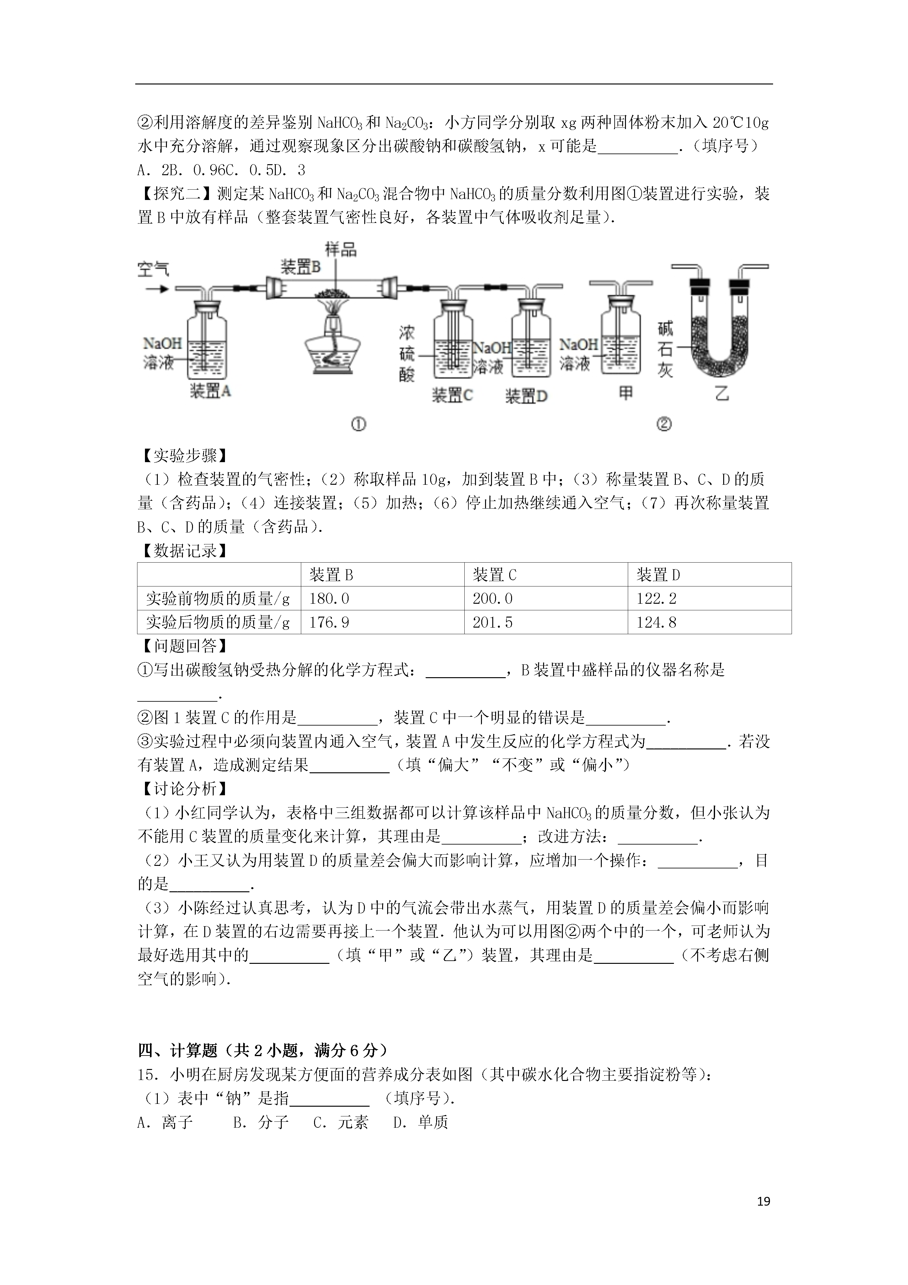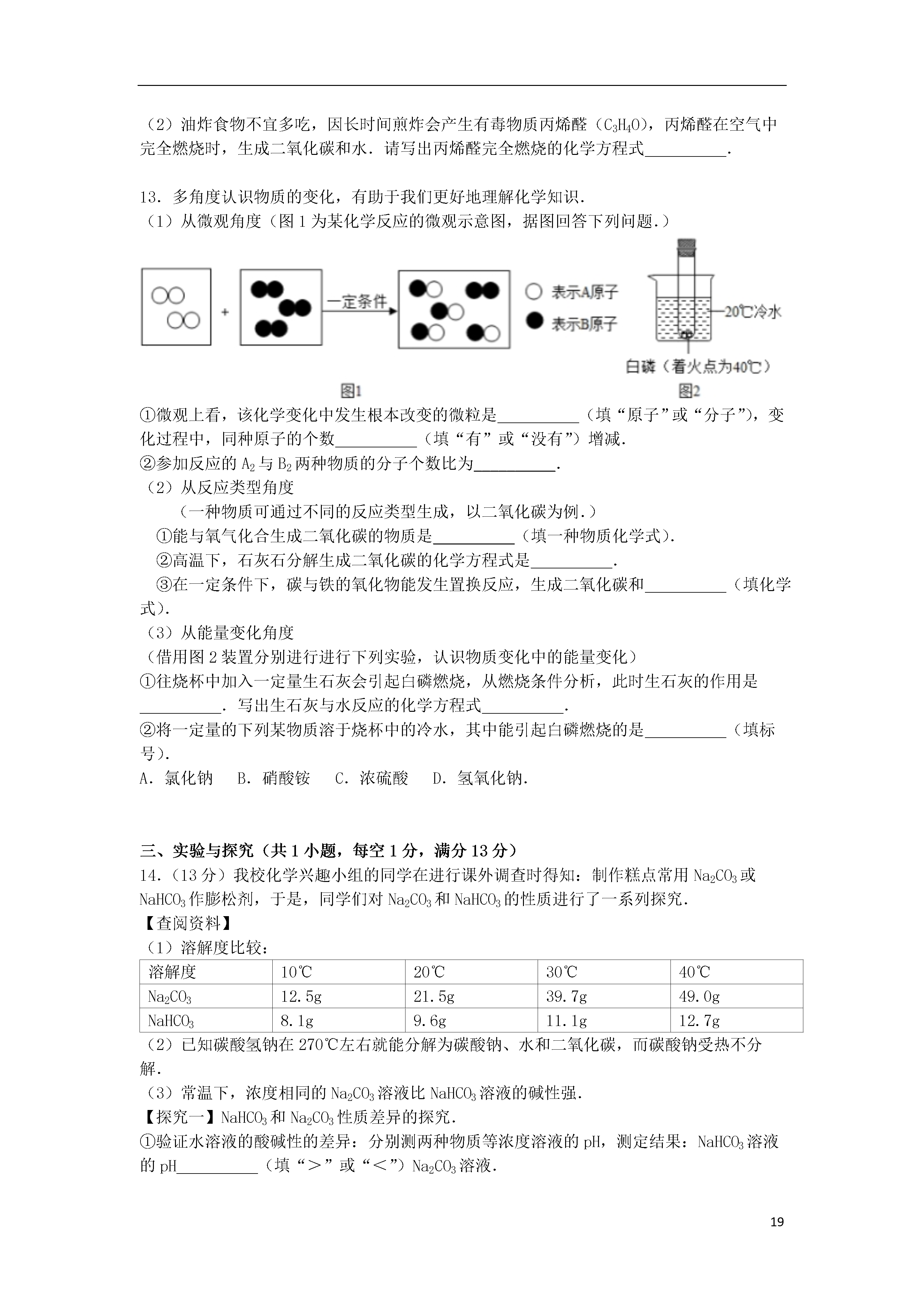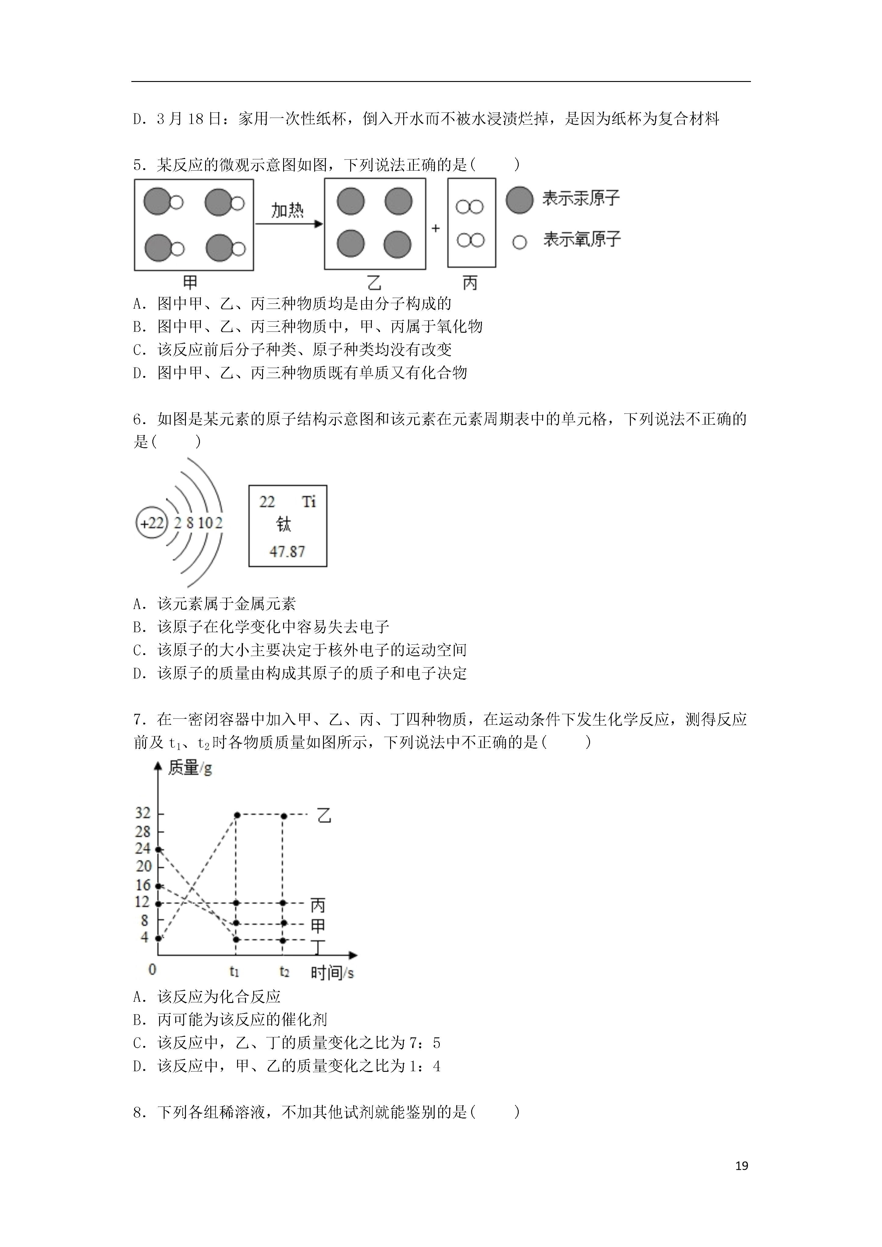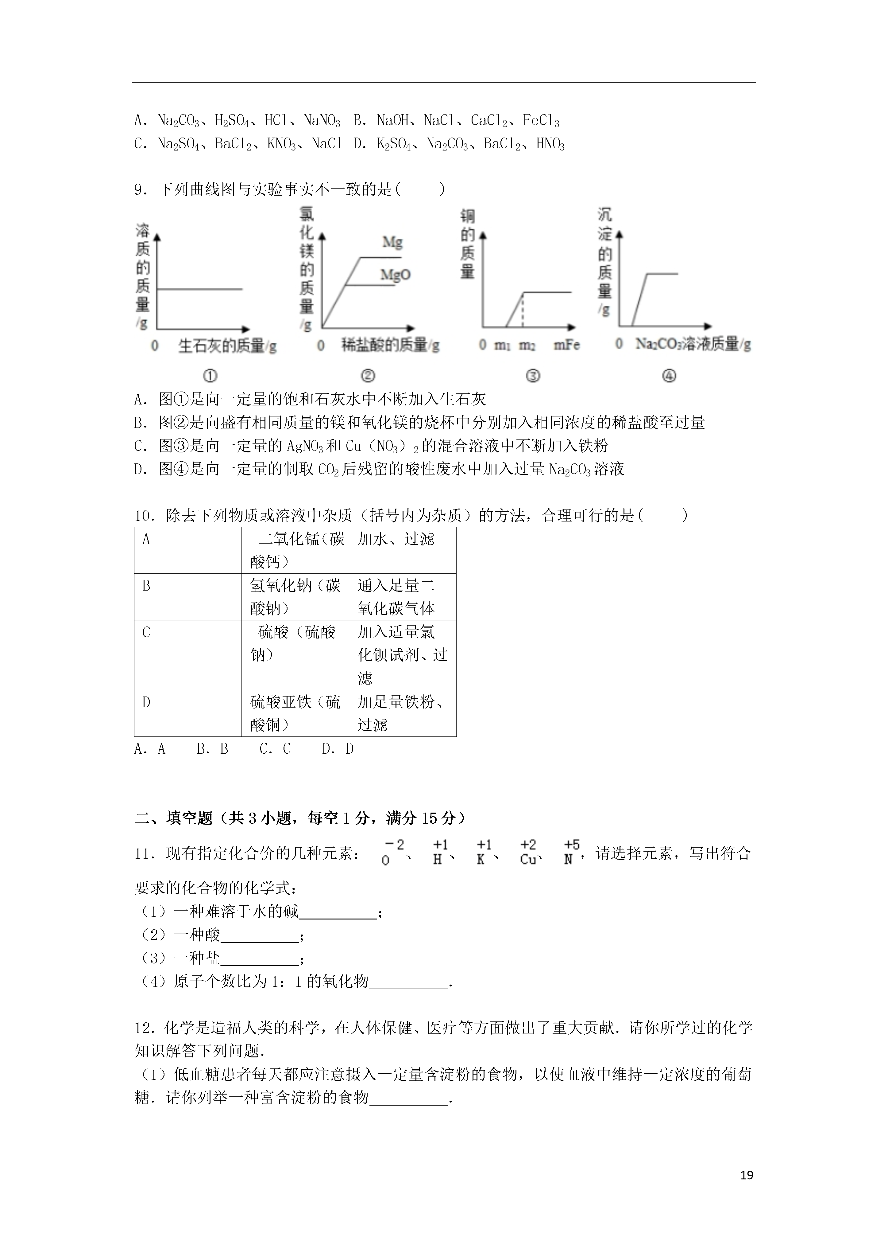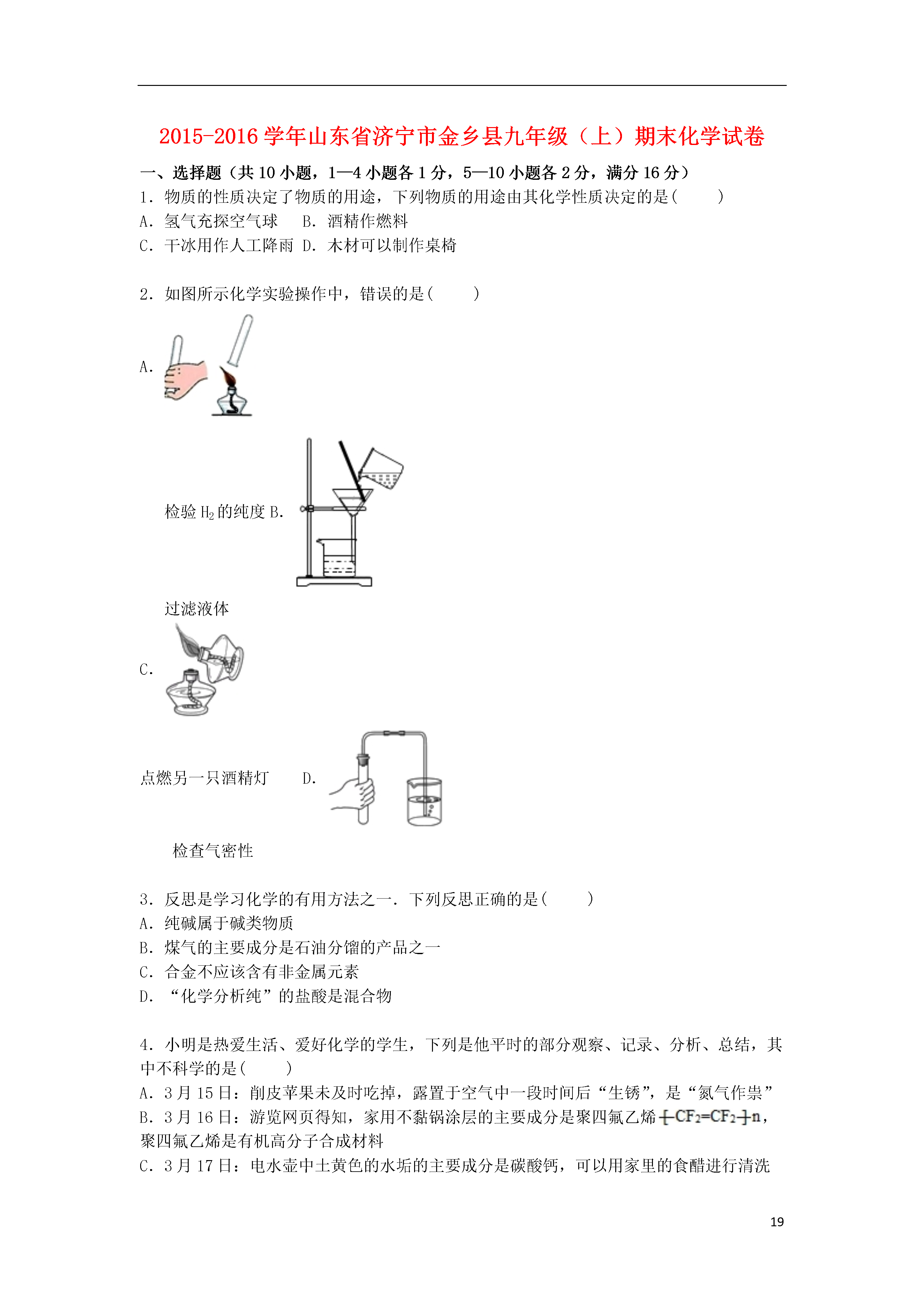 192015-2016学年山东省济宁市金乡县九年级(上)期末化学试卷一、选择题(共10小题,1—4小题各1分,5—10小题各2分,满分16分)1.物质的性质决定了物质的用途,下列物质的用途由其化学性质决定的是()A.氢气充探空气球B.酒精作燃料C.干冰用作人工降雨D.木材可以制作桌椅2.如图所示化学实验操作中,错误的是()A.检验H2的纯度B.过滤液体C.点燃另一只酒精灯D.检查气密性3.反思是学习化学的有用方法之一.下列反思正确的是()A.纯碱属于碱类物质B.煤气的主要成分是石油分馏的产品之一C.合金不应该含有非金属元素D.“化学分析纯”的盐酸是混合物4.小明是热爱生活、爱好化学的学生,下列是他平时的部分观察、记录、分析、总结,其中不科学的是()A.3月15日:削皮苹果未及时吃掉,露置于空气中一段时间后“生锈”,是“氮气作祟”B.3月16日:游览网页得知,家用不黏锅涂层的主要成分是聚四氟乙烯,聚四氟乙烯是有机高分子合成材料C.3月17日:电水壶中土黄色的水垢的主要成分是碳酸钙,可以用家里的食醋进行清洗D.3月18日:家用一次性纸杯,倒入开水而不被水浸渍烂掉,是因为纸杯为复合材料5.某反应的微观示意图如图,下列说法正确的是()A.图中甲、乙、丙三种物质均是由分子构成的B.图中甲、乙、丙三种物质中,甲、丙属于氧化物C.该反应前后分子种类、原子种类均没有改变D.图中甲、乙、丙三种物质既有单质又有化合物6.如图是某元素的原子结构示意图和该元素在元素周期表中的单元格,下列说法不正确的是()A.该元素属于金属元素B.该原子在化学变化中容易失去电子C.该原子的大小主要决定于核外电子的运动空间D.该原子的质量由构成其原子的质子和电子决定7.在一密闭容器中加入甲、乙、丙、丁四种物质,在运动条件下发生化学反应,测得反应前及t1、t2时各物质质量如图所示,下列说法中不正确的是()A.该反应为化合反应B.丙可能为该反应的催化剂C.该反应中,乙、丁的质量变化之比为7:5D.该反应中,甲、乙的质量变化之比为1:48.下列各组稀溶液,不加其他试剂就能鉴别的是()A.Na2CO3、H2SO4、HCl、NaNO3B.NaOH、NaCl、CaCl2、FeCl3C.Na2SO4、BaCl2、KNO3、NaClD.K2SO4、Na2CO3、BaCl2、HNO39.下列曲线图与实验事实不一致的是()A.图①是向一定量的饱和石灰水中不断加入生石灰B.图②是向盛有相同质量的镁和氧化镁的烧杯中分别加入相同浓度的稀盐酸至过量C.图③是向一定量的AgNO3和Cu(NO3)2的混合溶液中不断加入铁粉D.图④是向一定量的制取CO2后残留的酸性废水中加入过量Na2CO3溶液10.除去下列物质或溶液中杂质(括号内为杂质)的方法,合理可行的是()A二氧化锰(碳酸钙)加水、过滤B氢氧化钠(碳酸钠)通入足量二氧化碳气体C硫酸(硫酸钠)加入适量氯化钡试剂、过滤D硫酸亚铁(硫酸铜)加足量铁粉、过滤A.AB.BC.CD.D二、填空题(共3小题,每空1分,满分15分)11.现有指定化合价的几种元素:、、、、,请选择元素,写出符合要求的化合物的化学式:(1)一种难溶于水的碱__________;(2)一种酸__________;(3)一种盐__________;(4)原子个数比为1:1的氧化物__________.12.化学是造福人类的科学,在人体保健、医疗等方面做出了重大贡献.请你所学过的化学知识解答下列问题.(1)低血糖患者每天都应注意摄入一定量含淀粉的食物,以使血液中维持一定浓度的葡萄糖.请你列举一种富含淀粉的食物__________.(2)油炸食物不宜多吃,因长时间煎炸会产生有毒物质丙烯醛(C3H4O),丙烯醛在空气中完全燃烧时,生成二氧化碳和水.请写出丙烯醛完全燃烧的化学方程式__________.13.多角度认识物质的变化,有助于我们更好地理解化学知识.(1)从微观角度(图1为某化学反应的微观示意图,据图回答下列问题.)①微观上看,该化学变化中发生根本改变的微粒是__________(填“原子”或“分子”),变化过程中,同种原子的个数__________(填“有”或“没有”)增减.②参加反应的A2与B2两种物质的分子个数比为__________.(2)从反应类型角度(一种物质可通过不同的反应类型生成,以二氧化碳为例.)①能与氧气化合生成二氧化碳的物质是__________(填一种物质化学式).②高温下,石灰石分解生成二氧化碳的化学方程式是__________.③在一定条件下,碳与铁的氧化物能发生置换反应,生成二