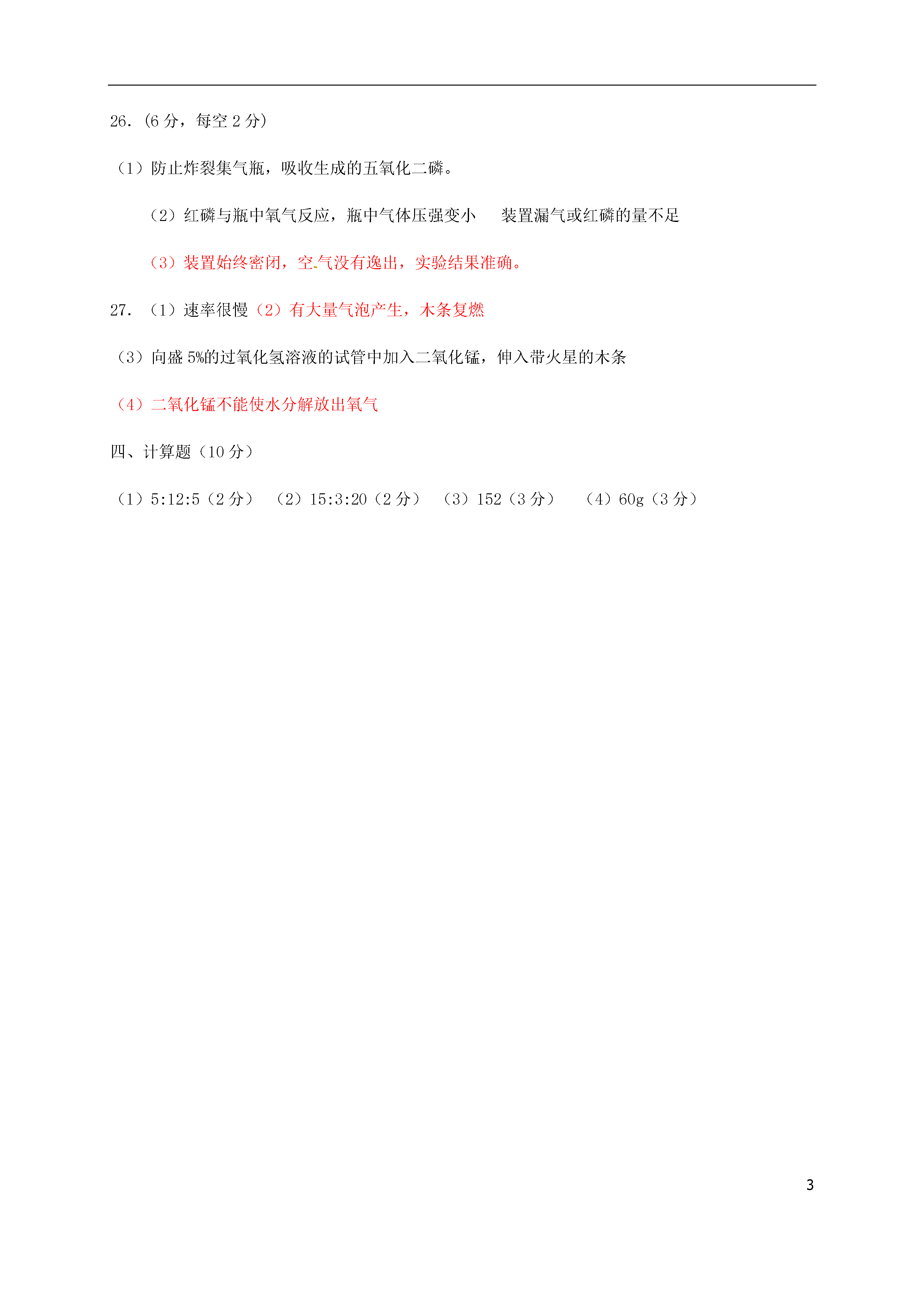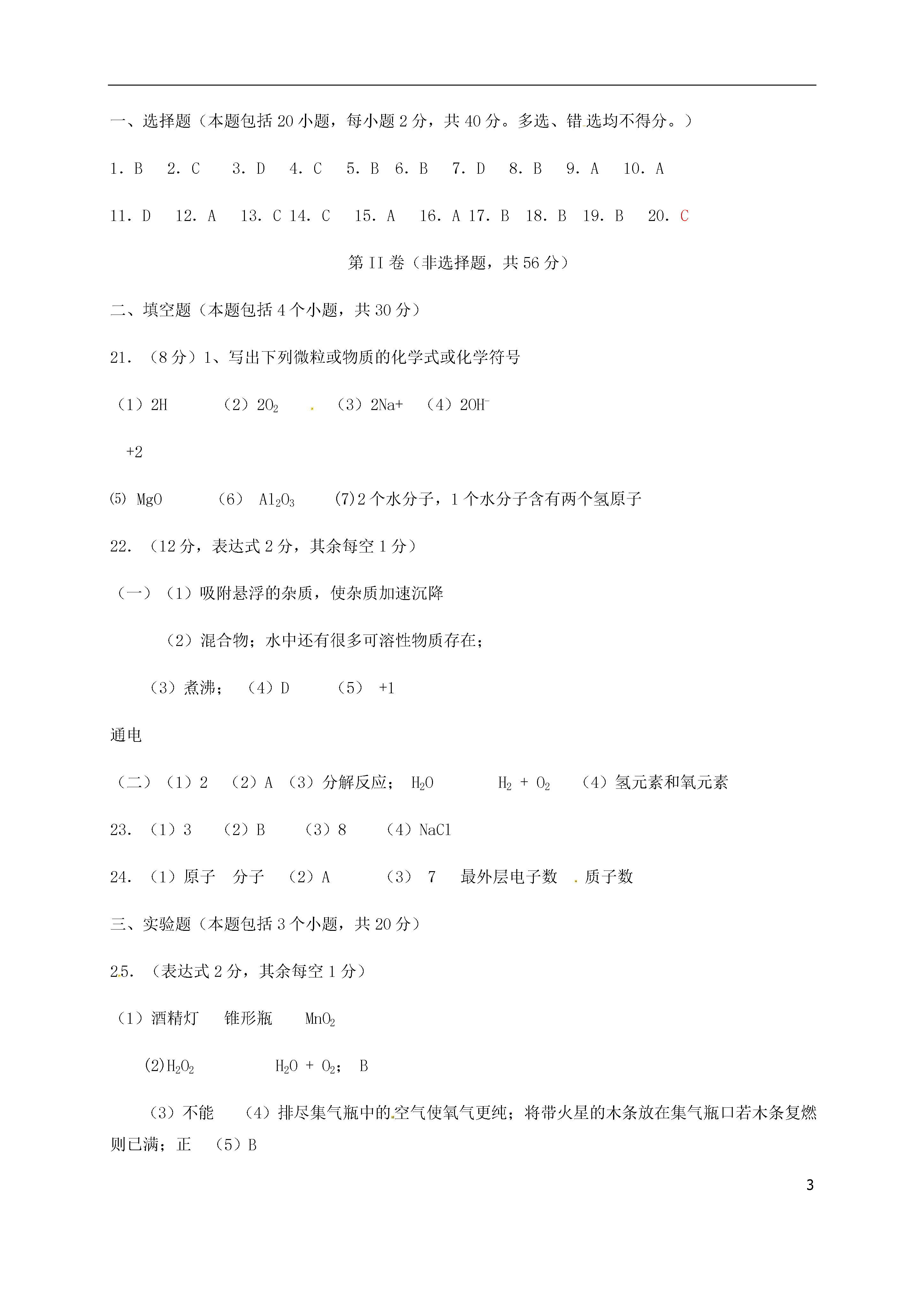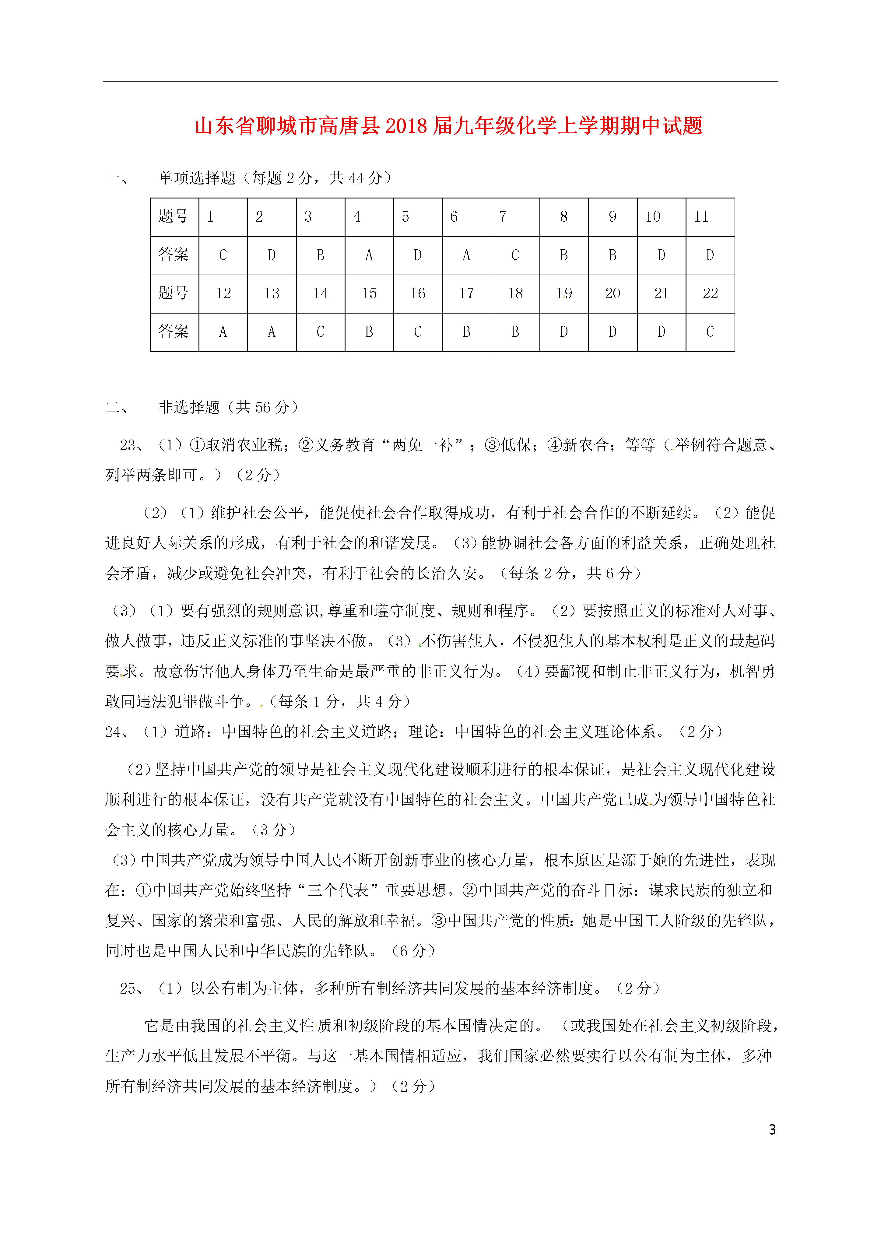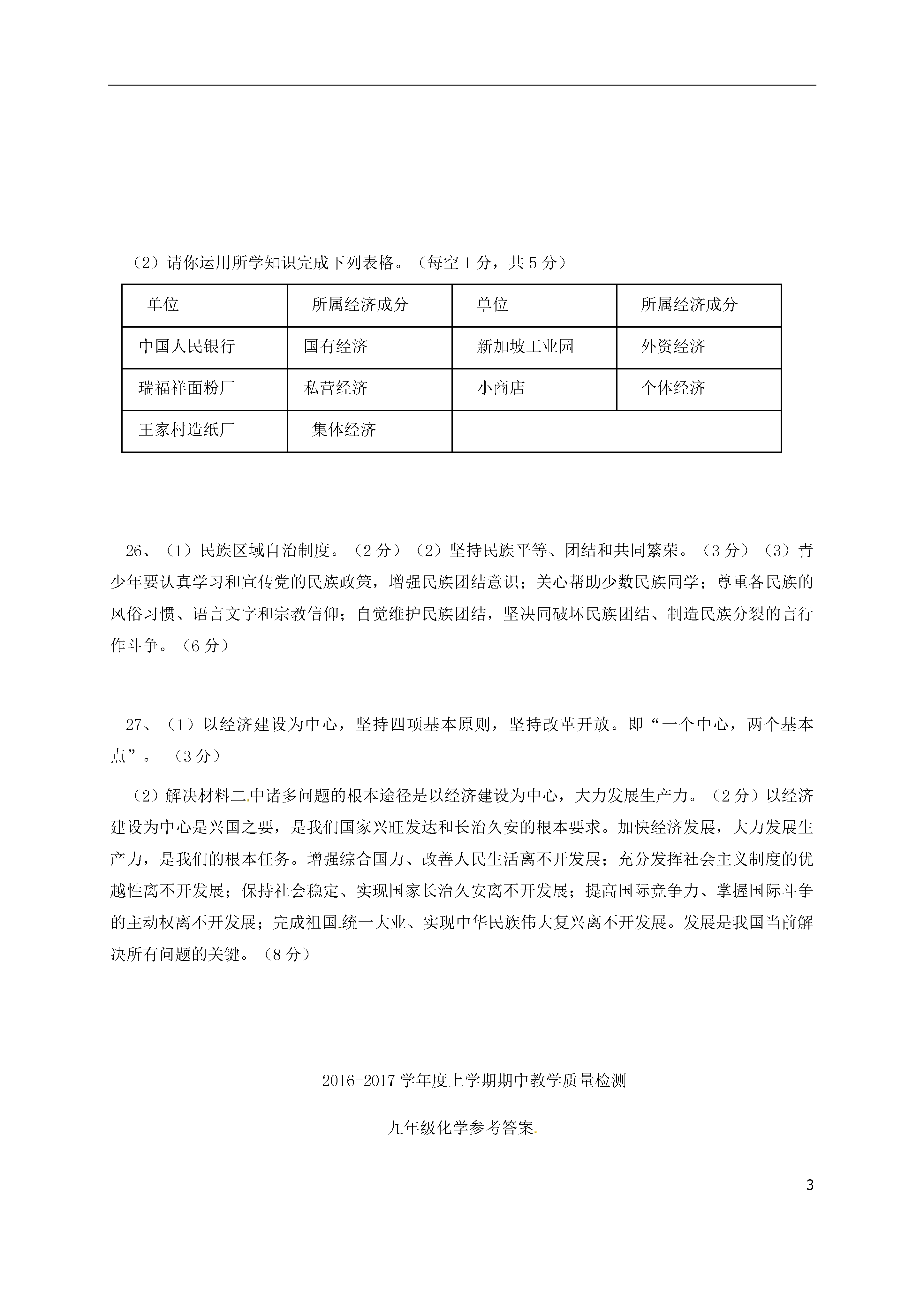 3山东省聊城市高唐县2018届九年级化学上学期期中试题单项选择题(每题2分,共44分)题号123]4567891011答案CDBADACBBDD题号1213141516171819202122答案AACBCBBDDDC非选择题(共56分)23、(1)①取消农业税;②义务教育“两免一补”;③低保;④新农合;等等(举例符合题意、列举两条即可。)(2分)(2)(1)维护社会公平,能促使社会合作取得成功,有利于社会合作的不断延续。(2)能促进良好人际关系的形成,有利于社会的和谐发展。(3)能协调社会各方面的利益关系,正确处理社会矛盾,减少或避免社会冲突,有利于社会的长治久安。(每条2分,共6分)(3)(1)要有强烈的规则意识,尊重和遵守制度、规则和程序。(2)要按照正义的标准对人对事、做人做事,违反正义标准的事坚决不做。(3)不伤害他人,不侵犯他人的基本权利是正义的最起码要求。故意伤害他人身体乃至生命是最严重的非正义行为。(4)要鄙视和制止非正义行为,机智勇敢同违法犯罪做斗争。(每条1分,共4分)24、(1)道路:中国特色的社会主义道路;理论:中国特色的社会主义理论体系。(2分)(2)坚持中国共产党的领导是社会主义现代化建设顺利进行的根本保证,是社会主义现代化建设顺利进行的根本保证,没有共产党就没有中国特色的社会主义。中国共产党已成为领导中国特色社会主义的核心力量。(3分)(3)中国共产党成为领导中国人民不断开创新事业的核心力量,根本原因是源于她的先进性,表现在:①中国共产党始终坚持“三个代表”重要思想。②中国共产党的奋斗目标:谋求民族的独立和复兴、国家的繁荣和富强、人民的解放和幸福。③中国共产党的性质:她是中国工人阶级的先锋队,同时也是中国人民和中华民族的先锋队。(6分)25、(1)以公有制为主体,多种所有制经济共同发展的基本经济制度。(2分)它是由我国的社会主义性质和初级阶段的基本国情决定的。(或我国处在社会主义初级阶段,生产力水平低且发展不平衡。与这一基本国情相适应,我们国家必然要实行以公有制为主体,多种所有制经济共同发展的基本经济制度。)(2分)(2)请你运用所学知识完成下列表格。(每空1分,共5分)单位所属经济成分单位所属经济成分中国人民银行国有经济新加坡工业园外资经济瑞福祥面粉厂私营经济小商店个体经济王家村造纸厂集体经济26、(1)民族区域自治制度。(2分)(2)坚持民族平等、团结和共同繁荣。(3分)(3)青少年要认真学习和宣传党的民族政策,增强民族团结意识;关心帮助少数民族同学;尊重各民族的风俗习惯、语言文字和宗教信仰;自觉维护民族团结,坚决同破坏民族团结、制造民族分裂的言行作斗争。(6分)27、(1)以经济建设为中心,坚持四项基本原则,坚持改革开放。即“一个中心,两个基本点”。(3分)(2)解决材料二中诸多问题的根本途径是以经济建设为中心,大力发展生产力。(2分)以经济建设为中心是兴国之要,是我们国家兴旺发达和长治久安的根本要求。加快经济发展,大力发展生产力,是我们的根本任务。增强综合国力、改善人民生活离不开发展;充分发挥社会主义制度的优越性离不开发展;保持社会稳定、实现国家长治久安离不开发展;提高国际竞争力、掌握国际斗争的主动权离不开发展;完成祖国统一大业、实现中华民族伟大复兴离不开发展。发展是我国当前解决所有问题的关键。(8分)2016-2017学年度上学期期中教学质量检测九年级化学参考答案一、选择题(本题包括20小题,每小题2分,共40分。多选、错选均不得分。)1.B2.C3.D4.C5.B6.B7.D8.B9.A10.A11.D12.A13.C14.C15.A16.A17.B18.B19.B20.C第II卷(非选择题,共56分)二、填空题(本题包括4个小题,共30分)21.(8分)1、写出下列微粒或物质的化学式或化学符号(1)2H(2)2O2(3)2Na+(4)2OH-+2⑸MgO(6)Al2O3(7)2个水分子,1个水分子含有两个氢原子22.(12分,表达式2分,其余每空1分)(一)(1)吸附悬浮的杂质,使杂质加速沉降(2)混合物;水中还有很多可溶性物质存在;(3)煮沸;(4)D(5)+1通电(二)(1)2(2)A(3)分解反应;H2OH2+O2(4)氢元素和氧元素23.(1)3(2)B(3)8(4)NaCl24.(1)原子分子(2)A(3)7最外层电子数质子数三、实验题(本题包括3个小题,共20分)25.(表达式2分,其余每空1分)(1)酒精灯锥形瓶MnO2(2)H2O2H2O+O2;B(3)不能(4)排尽集气瓶中的空气使氧气更纯;将带火星的木条放在集气瓶口若木条复燃则已满;正(5)B26.(6分,每
