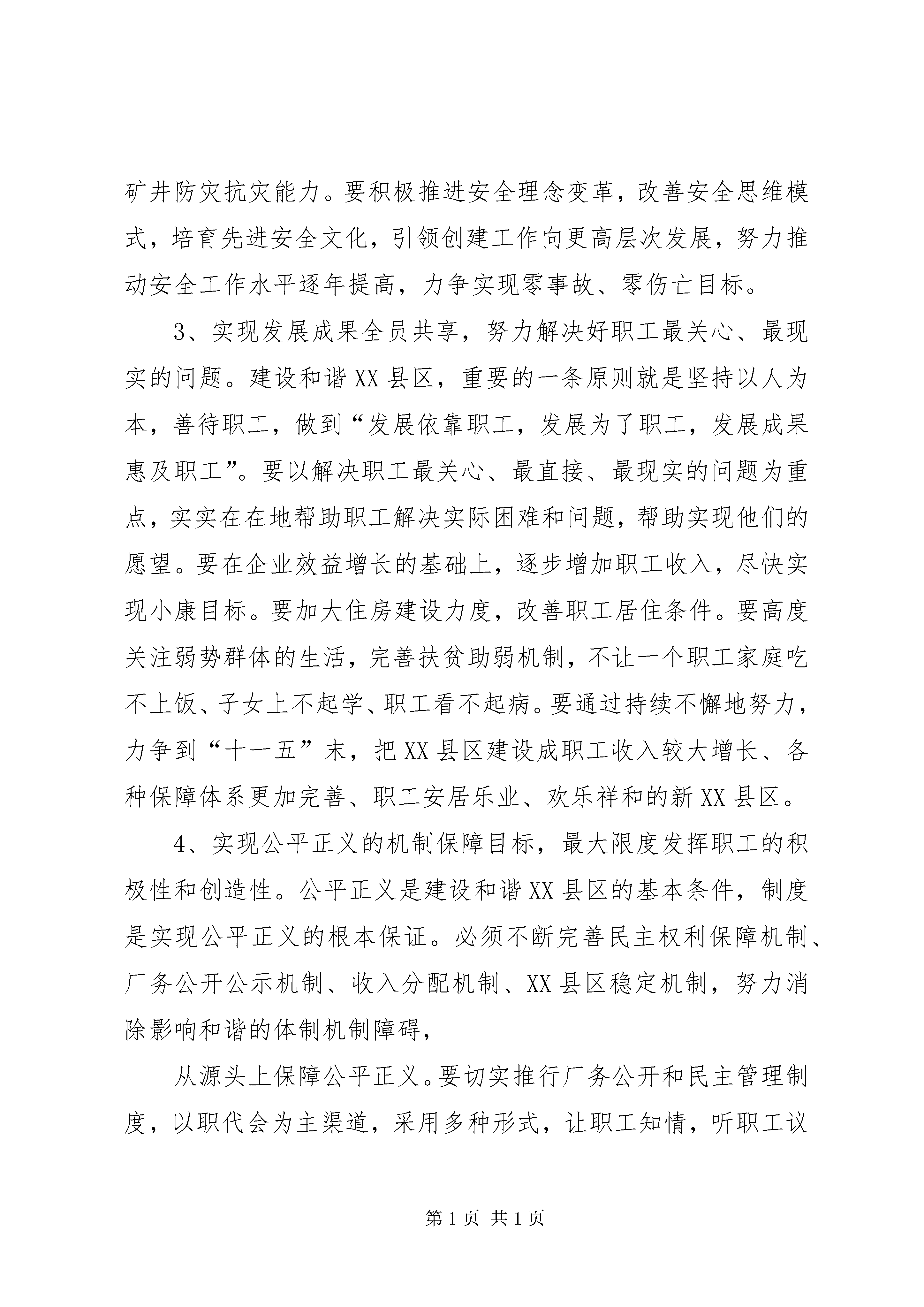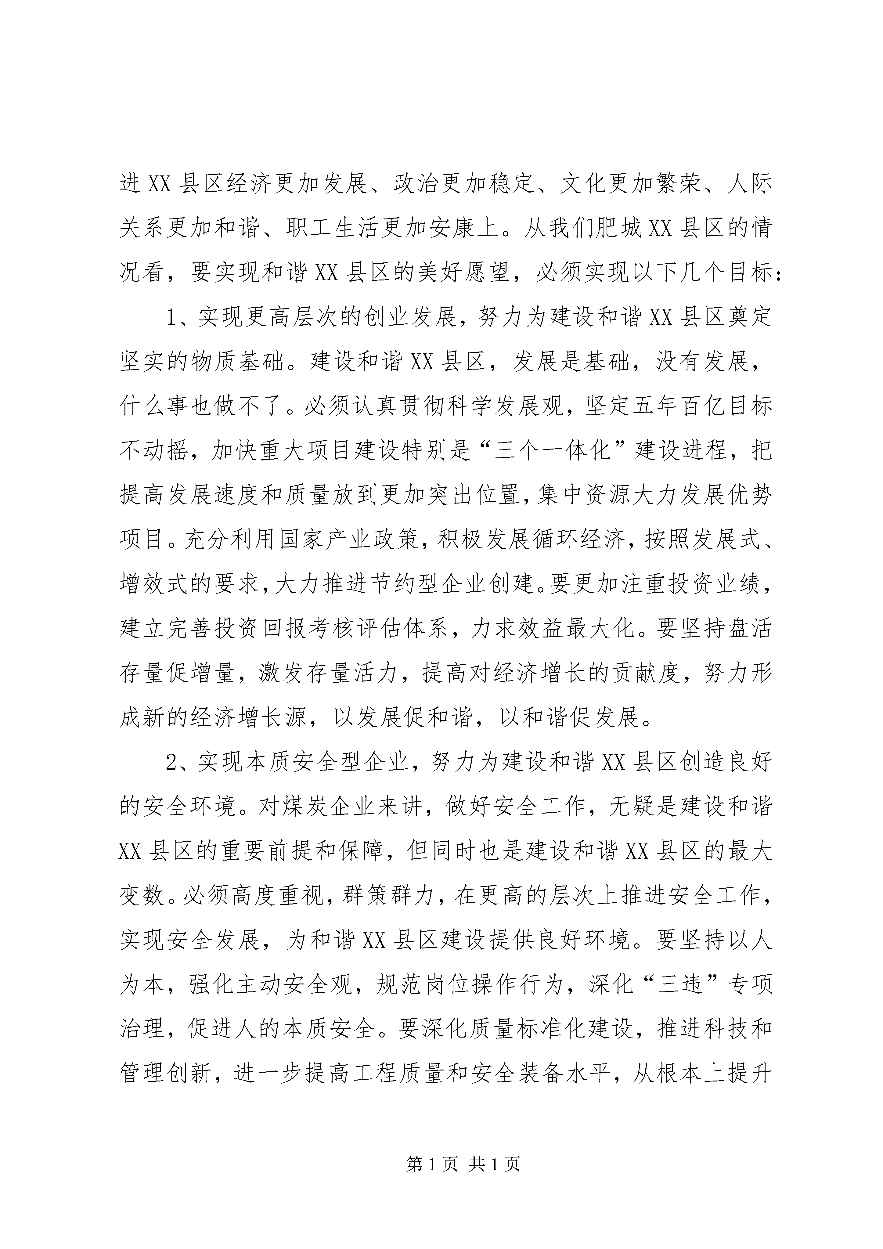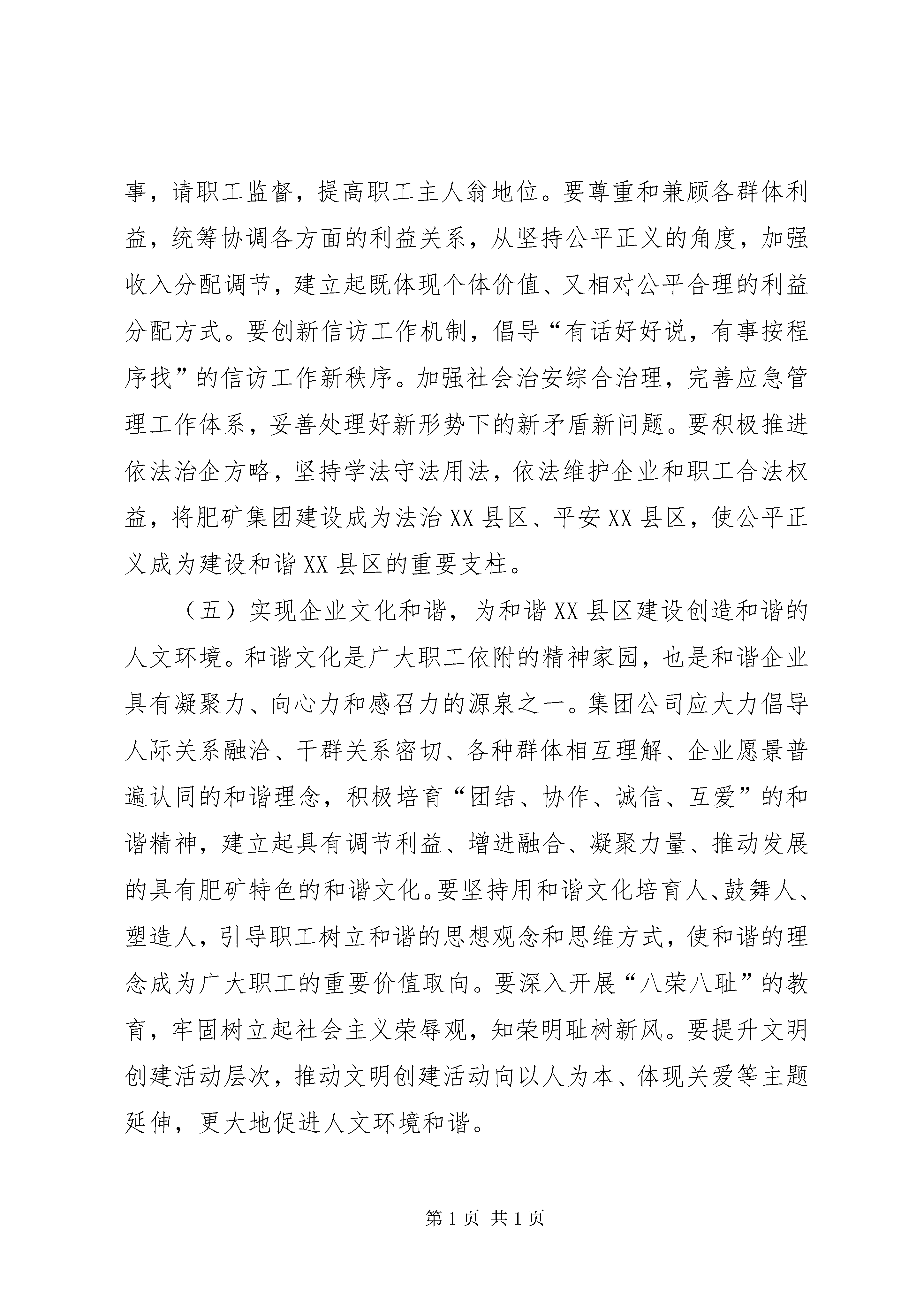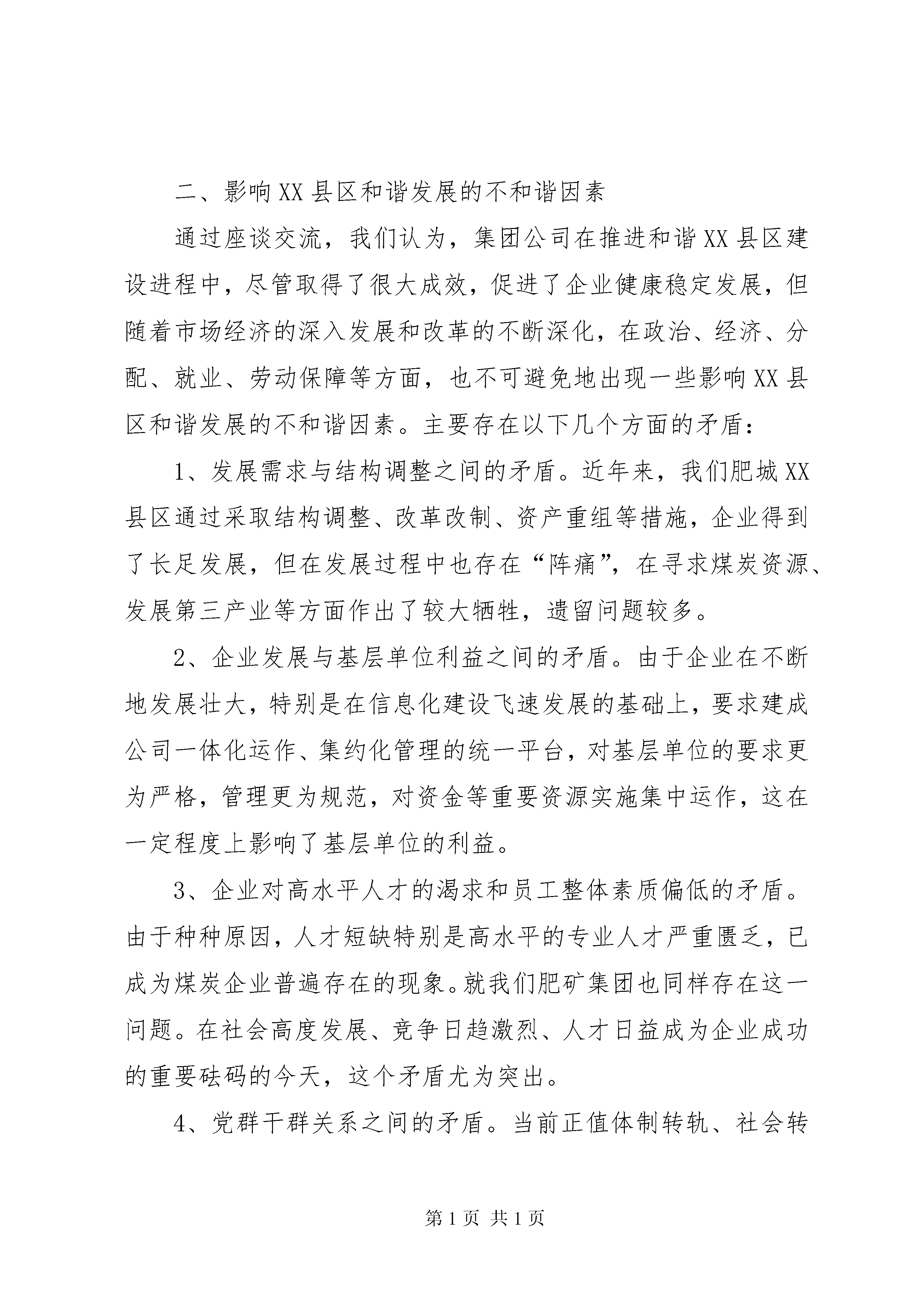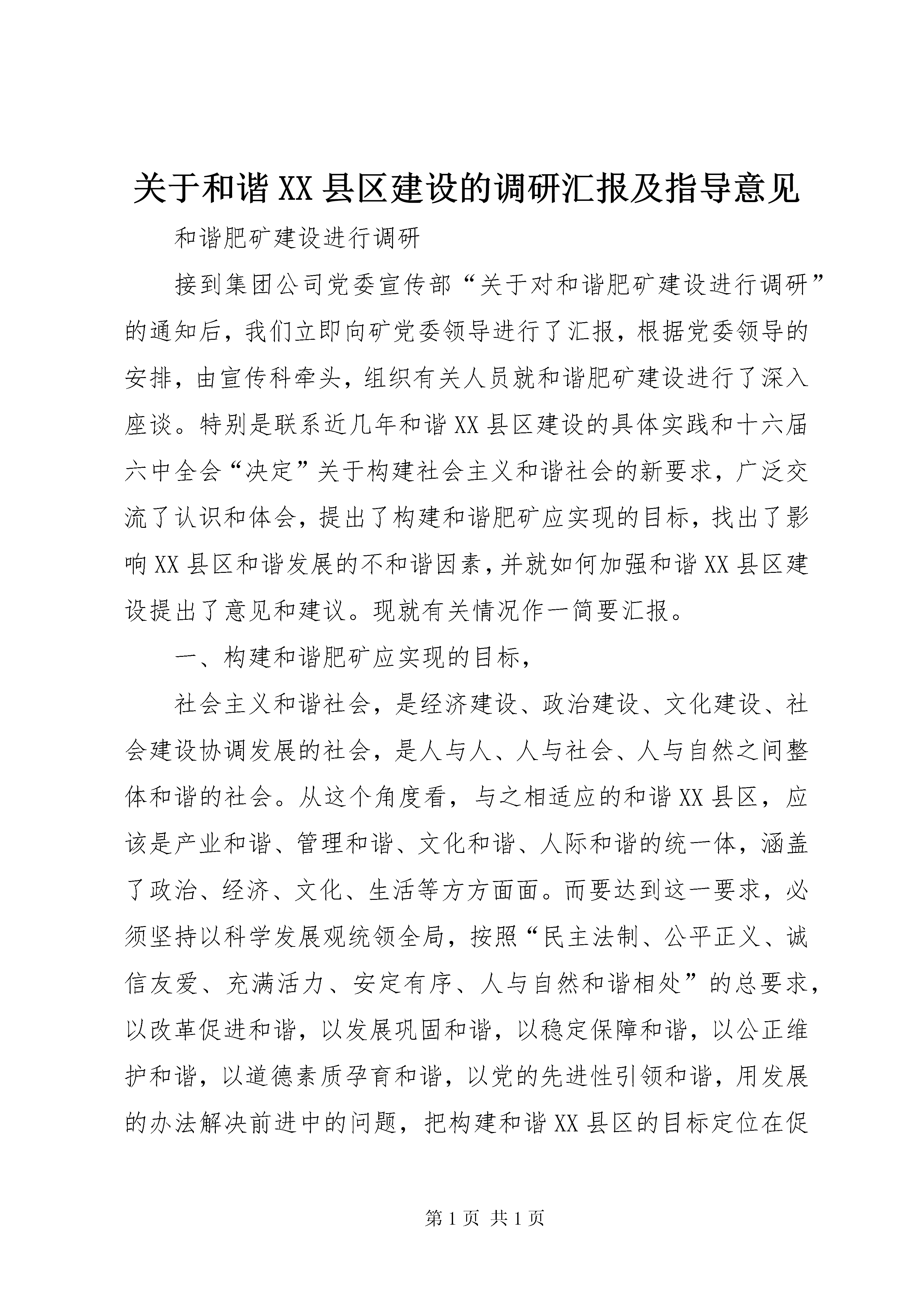 关于和谐XX县区建设的调研汇报及指导意见和谐肥矿建设进行调研接到集团公司党委宣传部“关于对和谐肥矿建设进行调研”的通知后,我们立即向矿党委领导进行了汇报,根据党委领导的安排,由宣传科牵头,组织有关人员就和谐肥矿建设进行了深入座谈。特别是联系近几年和谐XX县区建设的具体实践和十六届六中全会“决定”关于构建社会主义和谐社会的新要求,广泛交流了认识和体会,提出了构建和谐肥矿应实现的目标,找出了影响XX县区和谐发展的不和谐因素,并就如何加强和谐XX县区建设提出了意见和建议。现就有关情况作一简要汇报。一、构建和谐肥矿应实现的目标,社会主义和谐社会,是经济建设、政治建设、文化建设、社会建设协调发展的社会,是人与人、人与社会、人与自然之间整体和谐的社会。从这个角度看,与之相适应的和谐XX县区,应该是产业和谐、管理和谐、文化和谐、人际和谐的统一体,涵盖了政治、经济、文化、生活等方方面面。而要达到这一要求,必须坚持以科学发展观统领全局,按照“民主法制、公平正义、诚信友爱、充满活力、安定有序、人与自然和谐相处”的总要求,以改革促进和谐,以发展巩固和谐,以稳定保障和谐,以公正维护和谐,以道德素质孕育和谐,以党的先进性引领和谐,用发展的办法解决前进中的问题,把构建和谐XX县区的目标定位在促进XX县区经济更加发展、政治更加稳定、文化更加繁荣、人际关系更加和谐、职工生活更加安康上。从我们肥城XX县区的情况看,要实现和谐XX县区的美好愿望,必须实现以下几个目标:1、实现更高层次的创业发展,努力为建设和谐XX县区奠定坚实的物质基础。建设和谐XX县区,发展是基础,没有发展,什么事也做不了。必须认真贯彻科学发展观,坚定五年百亿目标不动摇,加快重大项目建设特别是“三个一体化”建设进程,把提高发展速度和质量放到更加突出位置,集中资源大力发展优势项目。充分利用国家产业政策,积极发展循环经济,按照发展式、增效式的要求,大力推进节约型企业创建。要更加注重投资业绩,建立完善投资回报考核评估体系,力求效益最大化。要坚持盘活存量促增量,激发存量活力,提高对经济增长的贡献度,努力形成新的经济增长源,以发展促和谐,以和谐促发展。2、实现本质安全型企业,努力为建设和谐XX县区创造良好的安全环境。对煤炭企业来讲,做好安全工作,无疑是建设和谐XX县区的重要前提和保障,但同时也是建设和谐XX县区的最大变数。必须高度重视,群策群力,在更高的层次上推进安全工作,实现安全发展,为和谐XX县区建设提供良好环境。要坚持以人为本,强化主动安全观,规范岗位操作行为,深化“三违”专项治理,促进人的本质安全。要深化质量标准化建设,推进科技和管理创新,进一步提高工程质量和安全装备水平,从根本上提升矿井防灾抗灾能力。要积极推进安全理念变革,改善安全思维模式,培育先进安全文化,引领创建工作向更高层次发展,努力推动安全工作水平逐年提高,力争实现零事故、零伤亡目标。3、实现发展成果全员共享,努力解决好职工最关心、最现实的问题。建设和谐XX县区,重要的一条原则就是坚持以人为本,善待职工,做到“发展依靠职工,发展为了职工,发展成果惠及职工”。要以解决职工最关心、最直接、最现实的问题为重点,实实在在地帮助职工解决实际困难和问题,帮助实现他们的愿望。要在企业效益增长的基础上,逐步增加职工收入,尽快实现小康目标。要加大住房建设力度,改善职工居住条件。要高度关注弱势群体的生活,完善扶贫助弱机制,不让一个职工家庭吃不上饭、子女上不起学、职工看不起病。要通过持续不懈地努力,力争到“十一五”末,把XX县区建设成职工收入较大增长、各种保障体系更加完善、职工安居乐业、欢乐祥和的新XX县区。4、实现公平正义的机制保障目标,最大限度发挥职工的积极性和创造性。公平正义是建设和谐XX县区的基本条件,制度是实现公平正义的根本保证。必须不断完善民主权利保障机制、厂务公开公示机制、收入分配机制、XX县区稳定机制,努力消除影响和谐的体制机制障碍,从源头上保障公平正义。要切实推行厂务公开和民主管理制度,以职代会为主渠道,采用多种形式,让职工知情,听职工议事,请职工监督,提高职工主人翁地位。要尊重和兼顾各群体利益,统筹协调各方面的利益关系,从坚持公平正义的角度,加强收入分配调节,建立起既体现个体价值、又相对公平合理的利益分配方式。要创新信访工作机制,倡导“有话好好说,有事按程序找”的信访工作新秩序。加强社会治安综合治理,完善应急管理工作体系,妥善处理好新形势下的新矛盾新问题。要积极推进依法治企方略,坚持学法守法用法,依法维护企业和职工合法权益,将肥矿集团建设成为法治XX县区、平安XX县区,使公平正义成为建设和谐XX县区的重要支柱。(五)实现企业文化和谐,为和谐XX县区建设创造和谐的人文环境。和谐文化是广大职工依附的精神家园,也是和谐