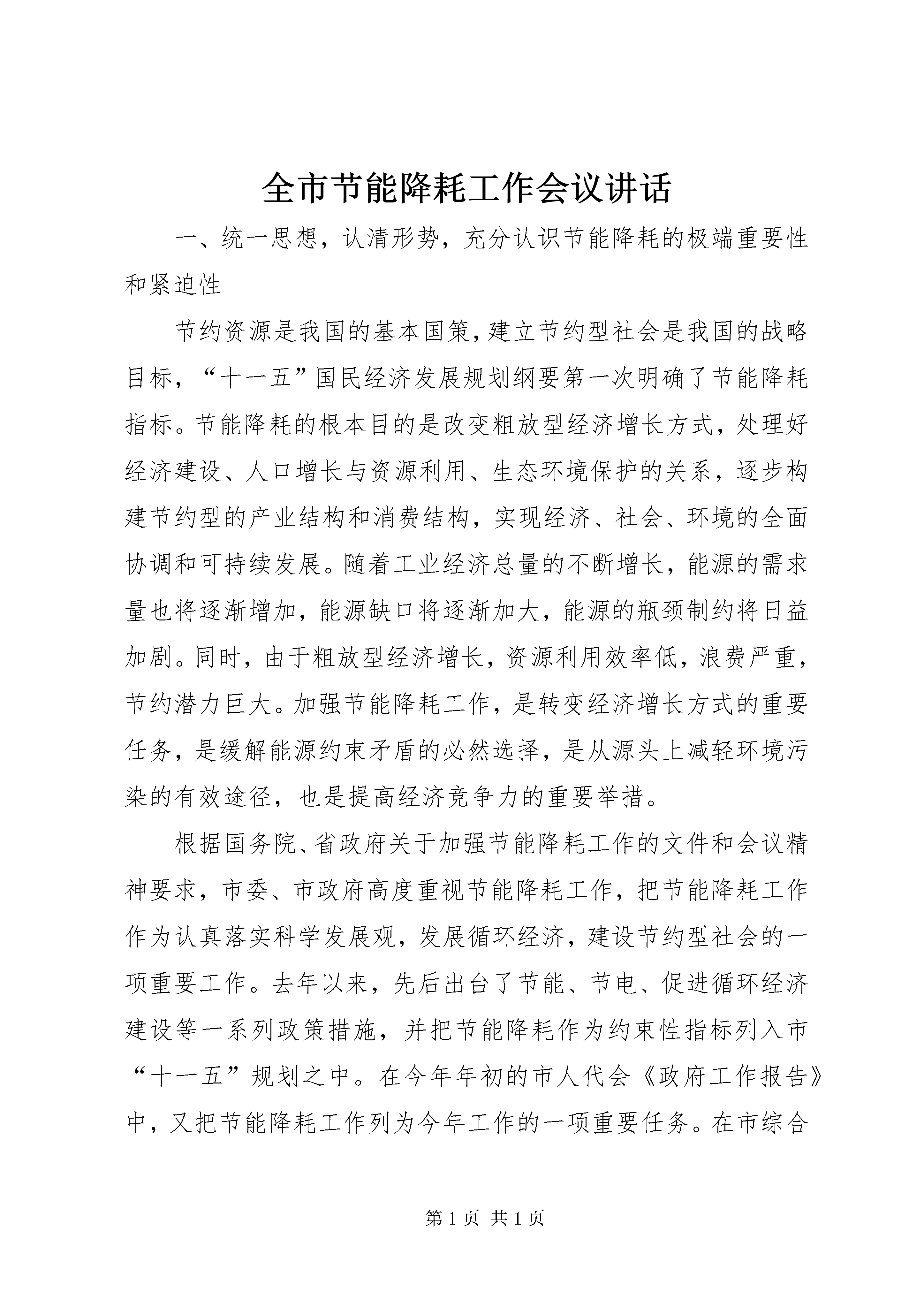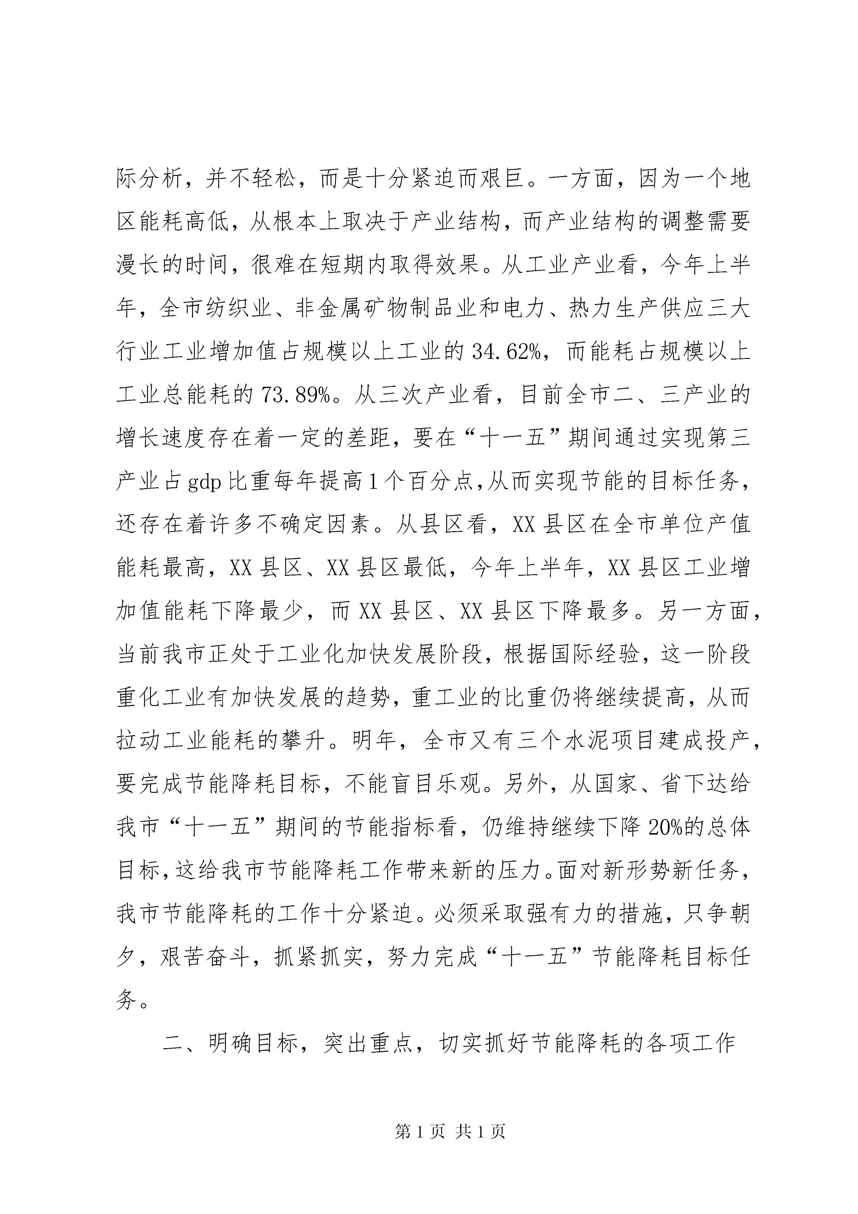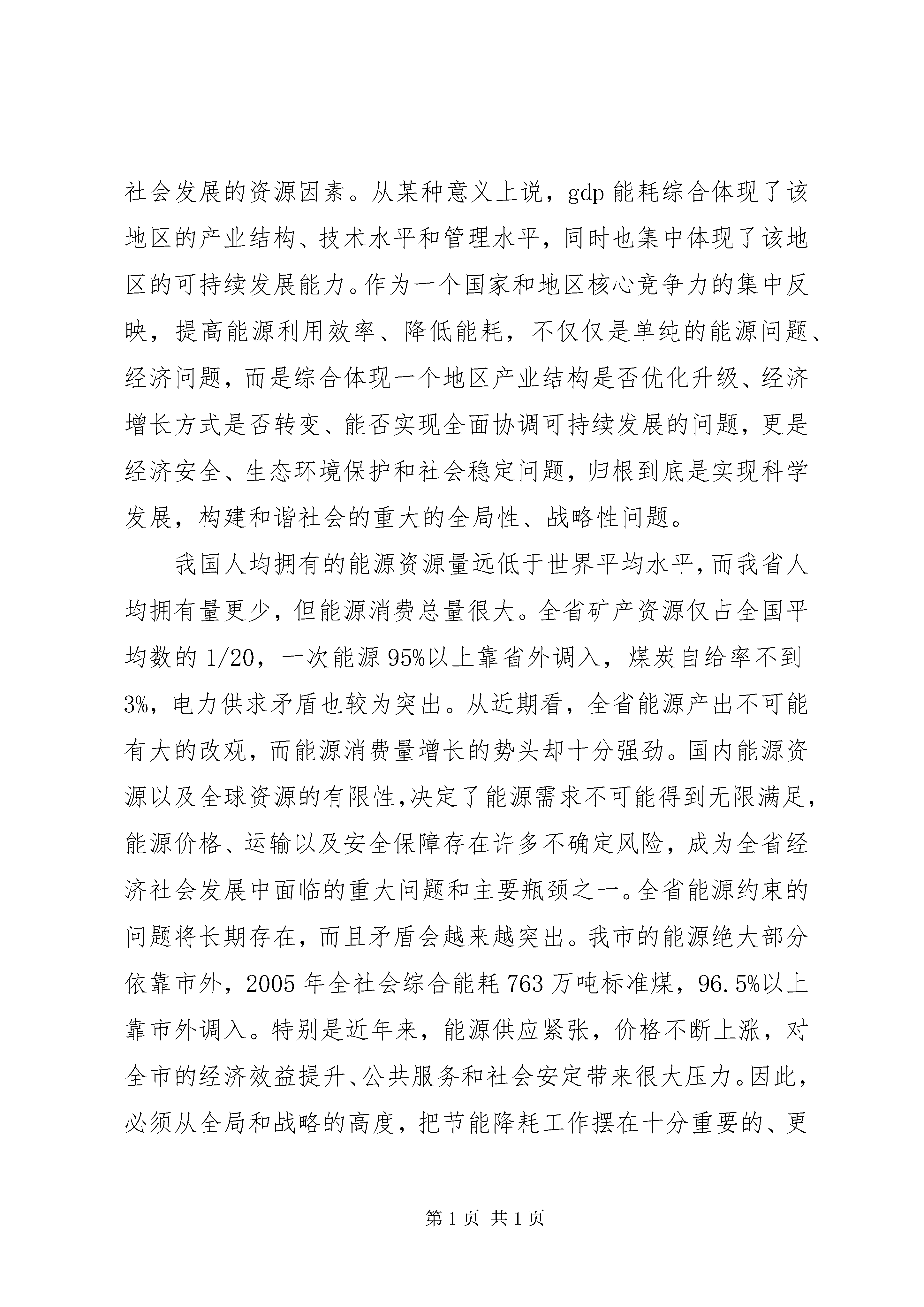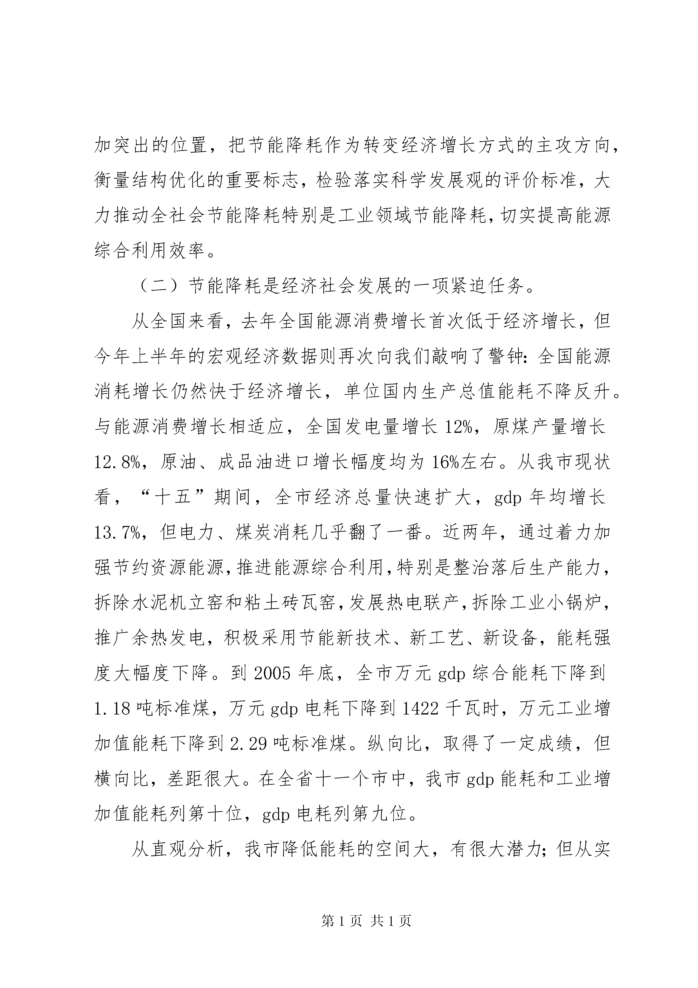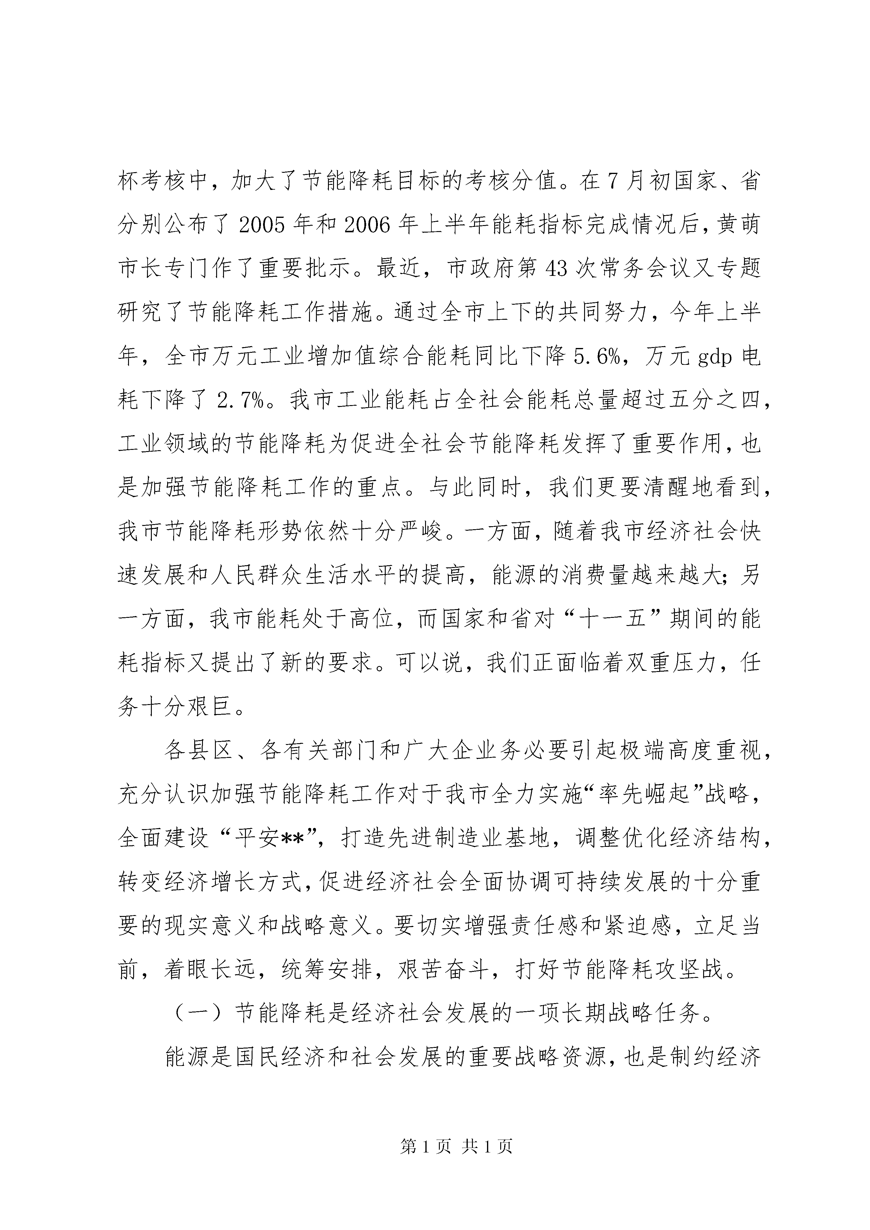 全市节能降耗工作会议讲话一、统一思想,认清形势,充分认识节能降耗的极端重要性和紧迫性节约资源是我国的基本国策,建立节约型社会是我国的战略目标,“十一五”国民经济发展规划纲要第一次明确了节能降耗指标。节能降耗的根本目的是改变粗放型经济增长方式,处理好经济建设、人口增长与资源利用、生态环境保护的关系,逐步构建节约型的产业结构和消费结构,实现经济、社会、环境的全面协调和可持续发展。随着工业经济总量的不断增长,能源的需求量也将逐渐增加,能源缺口将逐渐加大,能源的瓶颈制约将日益加剧。同时,由于粗放型经济增长,资源利用效率低,浪费严重,节约潜力巨大。加强节能降耗工作,是转变经济增长方式的重要任务,是缓解能源约束矛盾的必然选择,是从源头上减轻环境污染的有效途径,也是提高经济竞争力的重要举措。根据国务院、省政府关于加强节能降耗工作的文件和会议精神要求,市委、市政府高度重视节能降耗工作,把节能降耗工作作为认真落实科学发展观,发展循环经济,建设节约型社会的一项重要工作。去年以来,先后出台了节能、节电、促进循环经济建设等一系列政策措施,并把节能降耗作为约束性指标列入市“十一五”规划之中。在今年年初的市人代会《政府工作报告》中,又把节能降耗工作列为今年工作的一项重要任务。在市综合杯考核中,加大了节能降耗目标的考核分值。在7月初国家、省分别公布了2005年和2006年上半年能耗指标完成情况后,黄萌市长专门作了重要批示。最近,市政府第43次常务会议又专题研究了节能降耗工作措施。通过全市上下的共同努力,今年上半年,全市万元工业增加值综合能耗同比下降5.6%,万元gdp电耗下降了2.7%。我市工业能耗占全社会能耗总量超过五分之四,工业领域的节能降耗为促进全社会节能降耗发挥了重要作用,也是加强节能降耗工作的重点。与此同时,我们更要清醒地看到,我市节能降耗形势依然十分严峻。一方面,随着我市经济社会快速发展和人民群众生活水平的提高,能源的消费量越来越大;另一方面,我市能耗处于高位,而国家和省对“十一五”期间的能耗指标又提出了新的要求。可以说,我们正面临着双重压力,任务十分艰巨。各县区、各有关部门和广大企业务必要引起极端高度重视,充分认识加强节能降耗工作对于我市全力实施“率先崛起”战略,全面建设“平安**”,打造先进制造业基地,调整优化经济结构,转变经济增长方式,促进经济社会全面协调可持续发展的十分重要的现实意义和战略意义。要切实增强责任感和紧迫感,立足当前,着眼长远,统筹安排,艰苦奋斗,打好节能降耗攻坚战。(一)节能降耗是经济社会发展的一项长期战略任务。能源是国民经济和社会发展的重要战略资源,也是制约经济社会发展的资源因素。从某种意义上说,gdp能耗综合体现了该地区的产业结构、技术水平和管理水平,同时也集中体现了该地区的可持续发展能力。作为一个国家和地区核心竞争力的集中反映,提高能源利用效率、降低能耗,不仅仅是单纯的能源问题、经济问题,而是综合体现一个地区产业结构是否优化升级、经济增长方式是否转变、能否实现全面协调可持续发展的问题,更是经济安全、生态环境保护和社会稳定问题,归根到底是实现科学发展,构建和谐社会的重大的全局性、战略性问题。我国人均拥有的能源资源量远低于世界平均水平,而我省人均拥有量更少,但能源消费总量很大。全省矿产资源仅占全国平均数的1/20,一次能源95%以上靠省外调入,煤炭自给率不到3%,电力供求矛盾也较为突出。从近期看,全省能源产出不可能有大的改观,而能源消费量增长的势头却十分强劲。国内能源资源以及全球资源的有限性,决定了能源需求不可能得到无限满足,能源价格、运输以及安全保障存在许多不确定风险,成为全省经济社会发展中面临的重大问题和主要瓶颈之一。全省能源约束的问题将长期存在,而且矛盾会越来越突出。我市的能源绝大部分依靠市外,2005年全社会综合能耗763万吨标准煤,96.5%以上靠市外调入。特别是近年来,能源供应紧张,价格不断上涨,对全市的经济效益提升、公共服务和社会安定带来很大压力。因此,必须从全局和战略的高度,把节能降耗工作摆在十分重要的、更加突出的位置,把节能降耗作为转变经济增长方式的主攻方向,衡量结构优化的重要标志,检验落实科学发展观的评价标准,大力推动全社会节能降耗特别是工业领域节能降耗,切实提高能源综合利用效率。(二)节能降耗是经济社会发展的一项紧迫任务。从全国来看,去年全国能源消费增长首次低于经济增长,但今年上半年的宏观经济数据则再次向我们敲响了警钟:全国能源消耗增长仍然快于经济增长,单位国内生产总值能耗不降反升。与能源消费增长相适应,全国发电量增长12%,原煤产量增长12.8%,原油、成品油进口增长幅度均为16%左右。从我市现状看,“十五”期间,全市经济总量快速扩大,gdp年均增长13.7%,但电力、煤