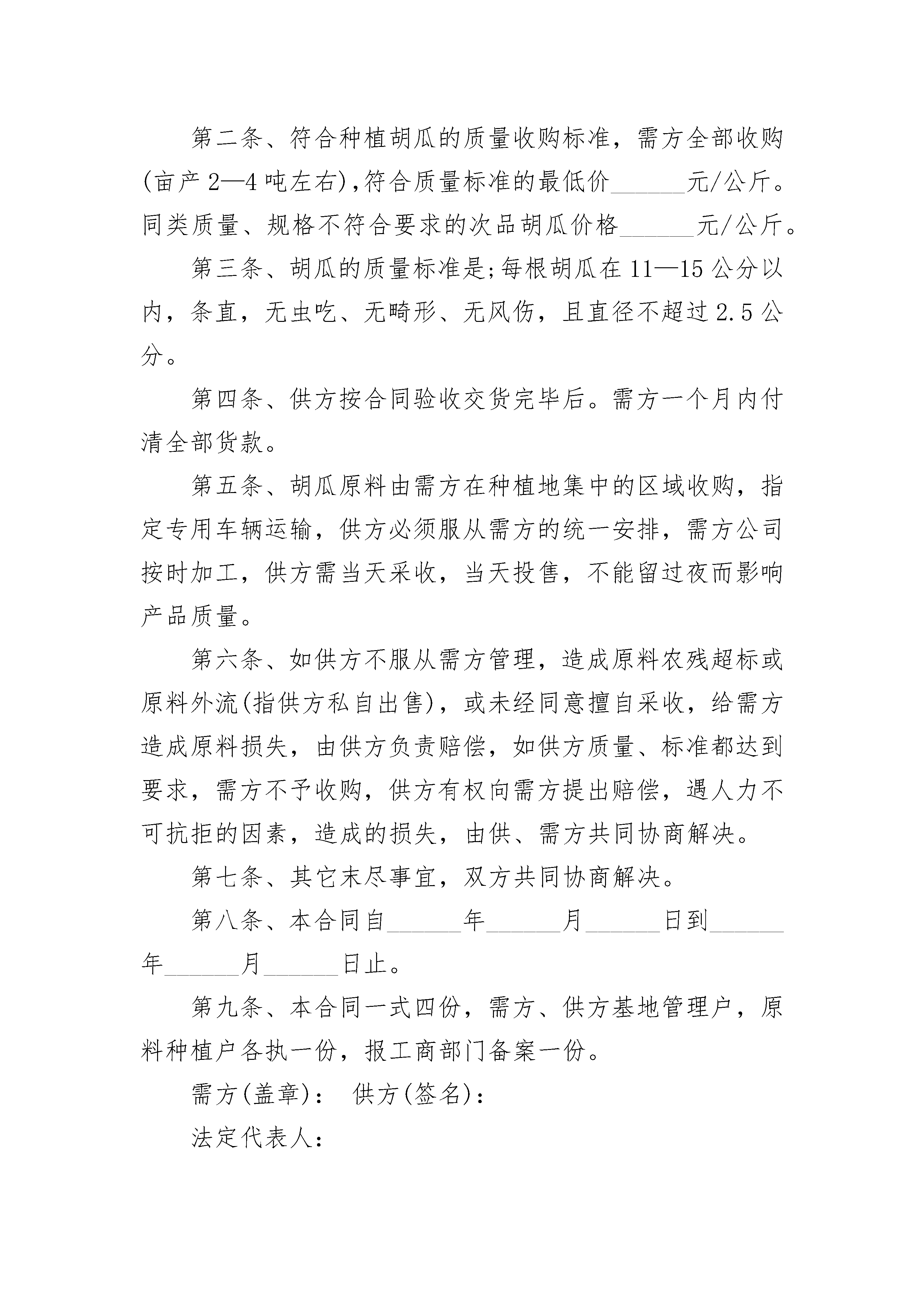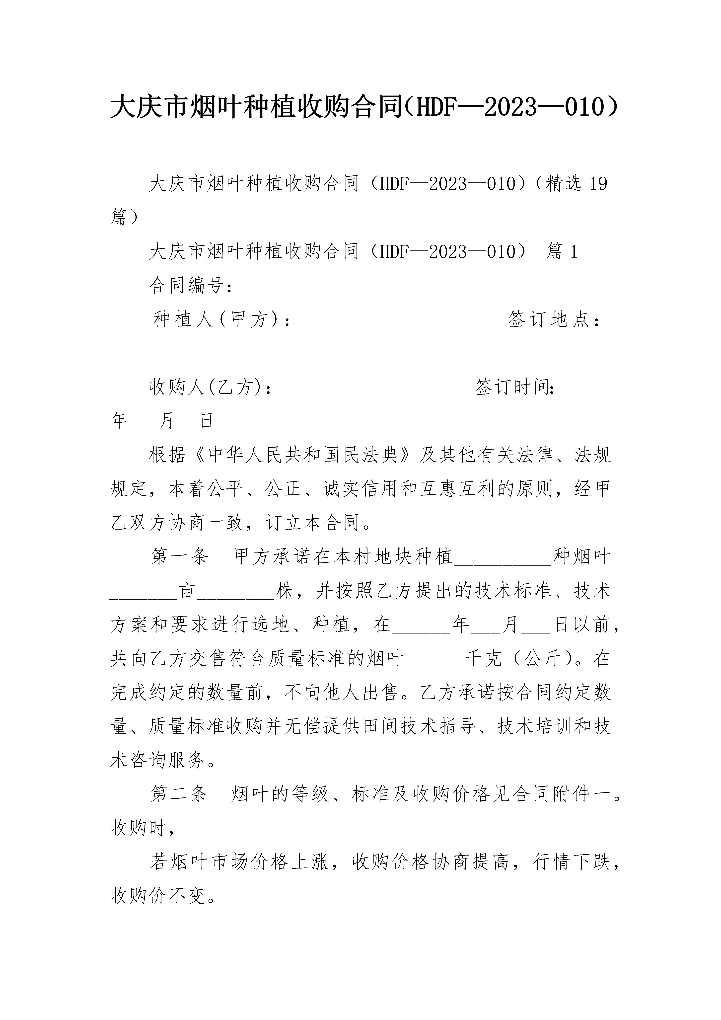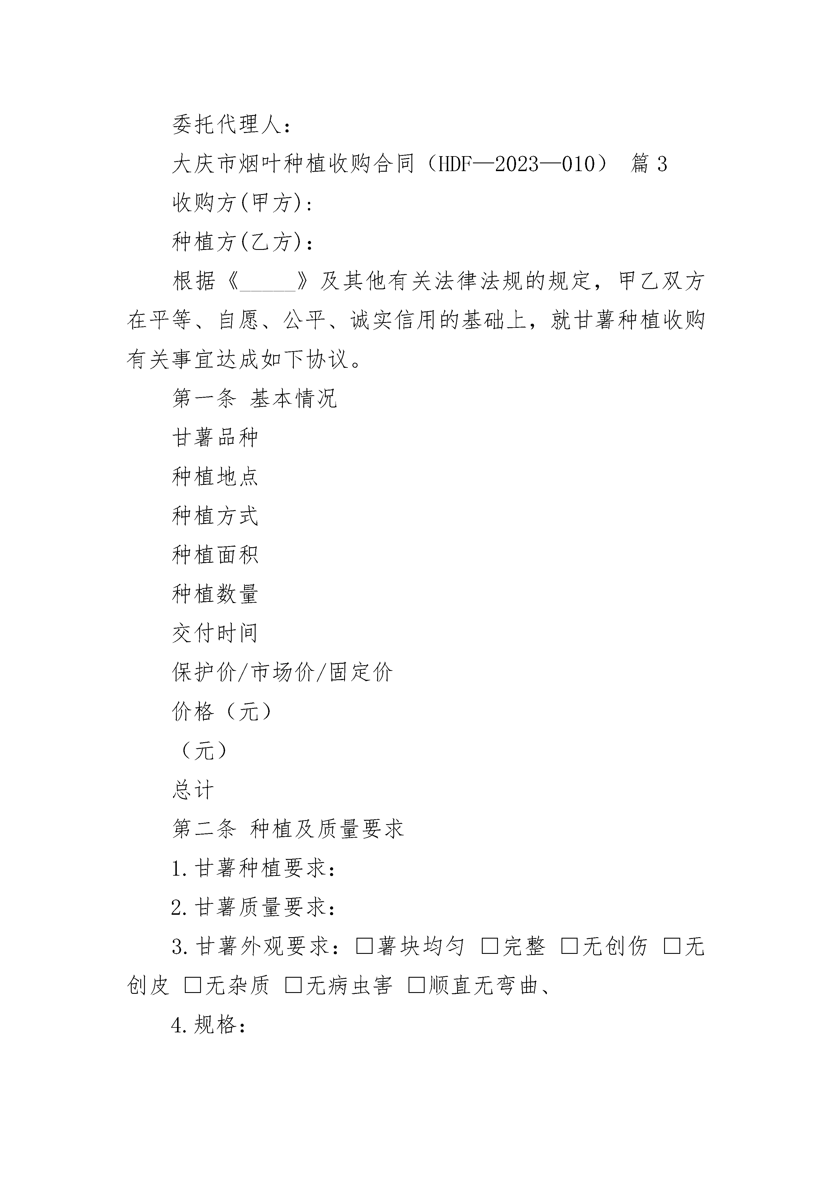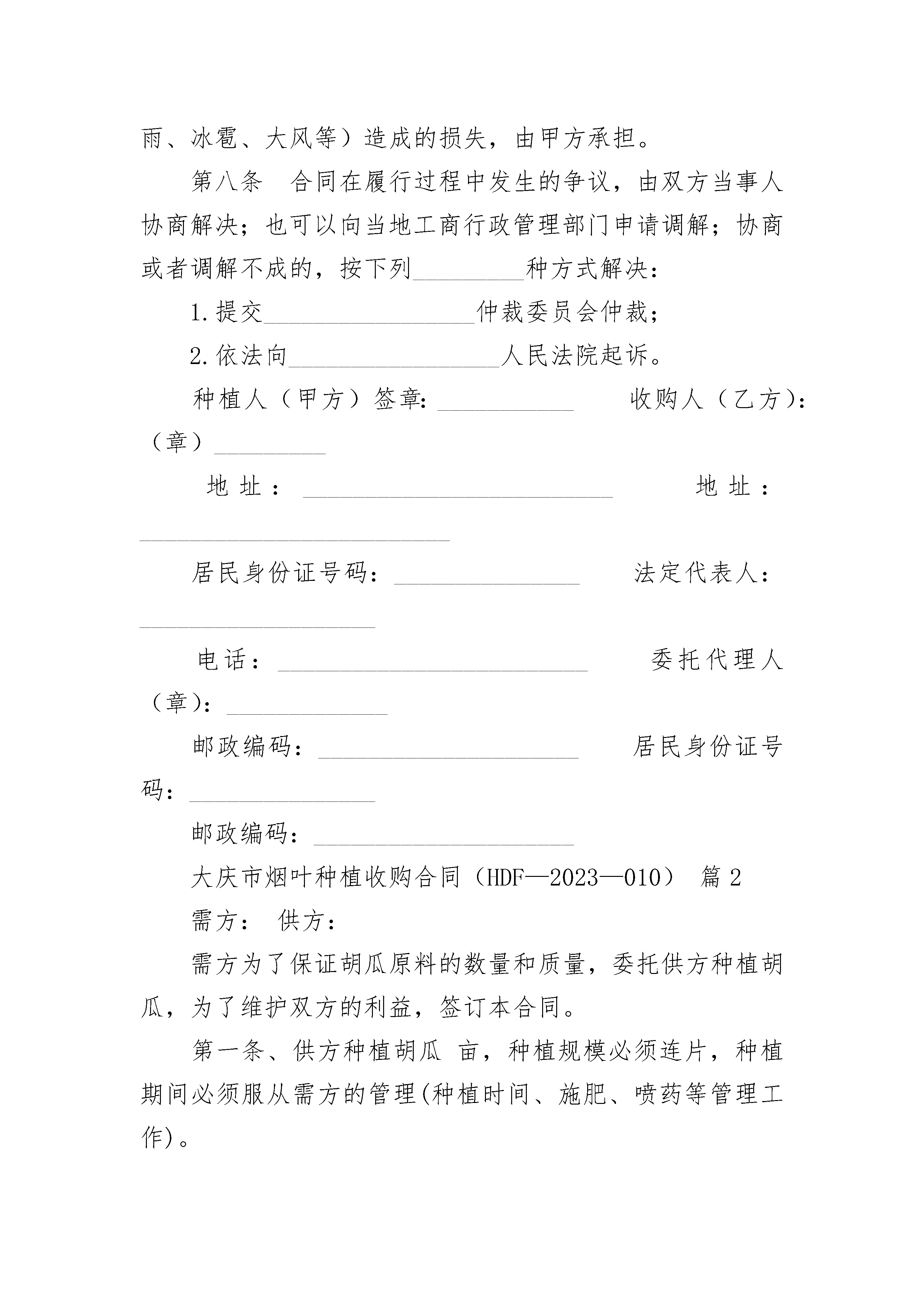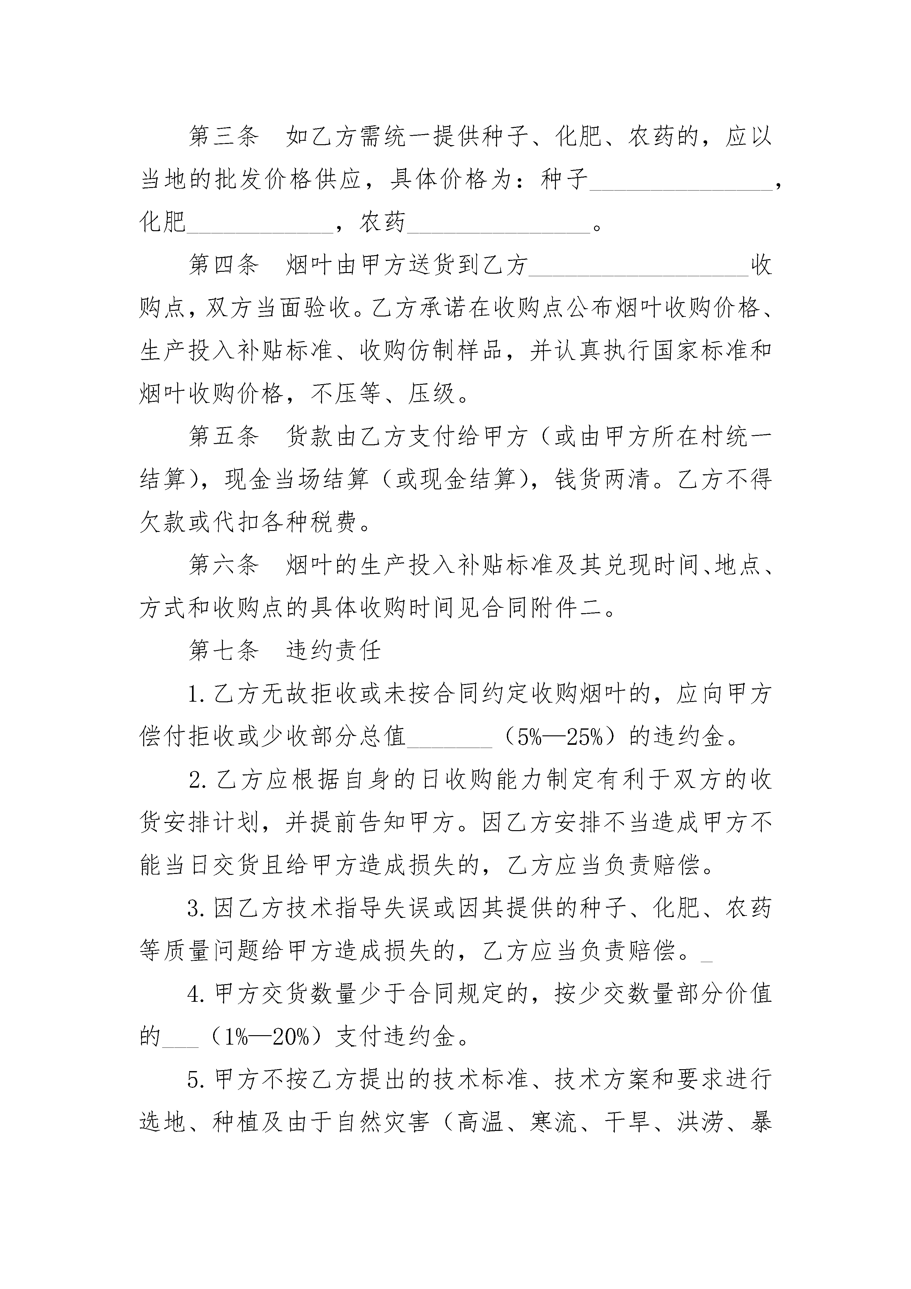 大庆市烟叶种植收购合同(HDF—2023—010)大庆市烟叶种植收购合同(HDF—2023—010)(精选19篇)大庆市烟叶种植收购合同(HDF—2023—010)篇1合同编号:__________种植人(甲方):________________签订地点:________________收购人(乙方):________________签订时间:_____年___月__日根据《中华人民共和国民法典》及其他有关法律、法规规定,本着公平、公正、诚实信用和互惠互利的原则,经甲乙双方协商一致,订立本合同。第一条甲方承诺在本村地块种植__________种烟叶_______亩________株,并按照乙方提出的技术标准、技术方案和要求进行选地、种植,在______年___月___日以前,共向乙方交售符合质量标准的烟叶______千克(公斤)。在完成约定的数量前,不向他人出售。乙方承诺按合同约定数量、质量标准收购并无偿提供田间技术指导、技术培训和技术咨询服务。第二条烟叶的等级、标准及收购价格见合同附件一。收购时,若烟叶市场价格上涨,收购价格协商提高,行情下跌,收购价不变。第三条如乙方需统一提供种子、化肥、农药的,应以当地的批发价格供应,具体价格为:种子_______________,化肥____________,农药_______________。第四条烟叶由甲方送货到乙方__________________收购点,双方当面验收。乙方承诺在收购点公布烟叶收购价格、生产投入补贴标准、收购仿制样品,并认真执行国家标准和烟叶收购价格,不压等、压级。第五条货款由乙方支付给甲方(或由甲方所在村统一结算),现金当场结算(或现金结算),钱货两清。乙方不得欠款或代扣各种税费。第六条烟叶的生产投入补贴标准及其兑现时间、地点、方式和收购点的具体收购时间见合同附件二。第七条违约责任1.乙方无故拒收或未按合同约定收购烟叶的,应向甲方偿付拒收或少收部分总值_______(5%—25%)的违约金。2.乙方应根据自身的日收购能力制定有利于双方的收货安排计划,并提前告知甲方。因乙方安排不当造成甲方不能当日交货且给甲方造成损失的,乙方应当负责赔偿。3.因乙方技术指导失误或因其提供的种子、化肥、农药等质量问题给甲方造成损失的,乙方应当负责赔偿。_4.甲方交货数量少于合同规定的,按少交数量部分价值的___(1%—20%)支付违约金。5.甲方不按乙方提出的技术标准、技术方案和要求进行选地、种植及由于自然灾害(高温、寒流、干旱、洪涝、暴雨、冰雹、大风等)造成的损失,由甲方承担。第八条合同在履行过程中发生的争议,由双方当事人协商解决;也可以向当地工商行政管理部门申请调解;协商或者调解不成的,按下列_________种方式解决:1.提交_________________仲裁委员会仲裁;2.依法向_________________人民法院起诉。种植人(甲方)签章:___________收购人(乙方):(章)_________地址:_________________________地址:_________________________居民身份证号码:_______________法定代表人:___________________电话:_________________________委托代理人(章):_____________邮政编码:_____________________居民身份证号码:_______________邮政编码:_____________________大庆市烟叶种植收购合同(HDF—2023—010)篇2需方:供方:需方为了保证胡瓜原料的数量和质量,委托供方种植胡瓜,为了维护双方的利益,签订本合同。第一条、供方种植胡瓜亩,种植规模必须连片,种植期间必须服从需方的管理(种植时间、施肥、喷药等管理工作)。第二条、符合种植胡瓜的质量收购标准,需方全部收购(亩产2—4吨左右),符合质量标准的最低价______元/公斤。同类质量、规格不符合要求的次品胡瓜价格______元/公斤。第三条、胡瓜的质量标准是;每根胡瓜在11—15公分以内,条直,无虫吃、无畸形、无风伤,且直径不超过2.5公分。第四条、供方按合同验收交货完毕后。需方一个月内付清全部货款。第五条、胡瓜原料由需方在种植地集中的区域收购,指定专用车辆运输,供方必须服从需方的统一安排,需方公司按时加工,供方需当天采收,当天投售,不能留过夜而影响产品质量。第六条、如供方不服从需方管理,造成原料农残超标或原料外流(指供方私自出售),或未经同意擅自采收,给需方造成原料损失,由供方负责赔偿,如供方质量、标准都达到要求,需方不予收购,供方有权向需方提出赔偿,遇人力不可抗拒的因素,造成的损失,由供、需方共同协商解决。第七条、其它末尽