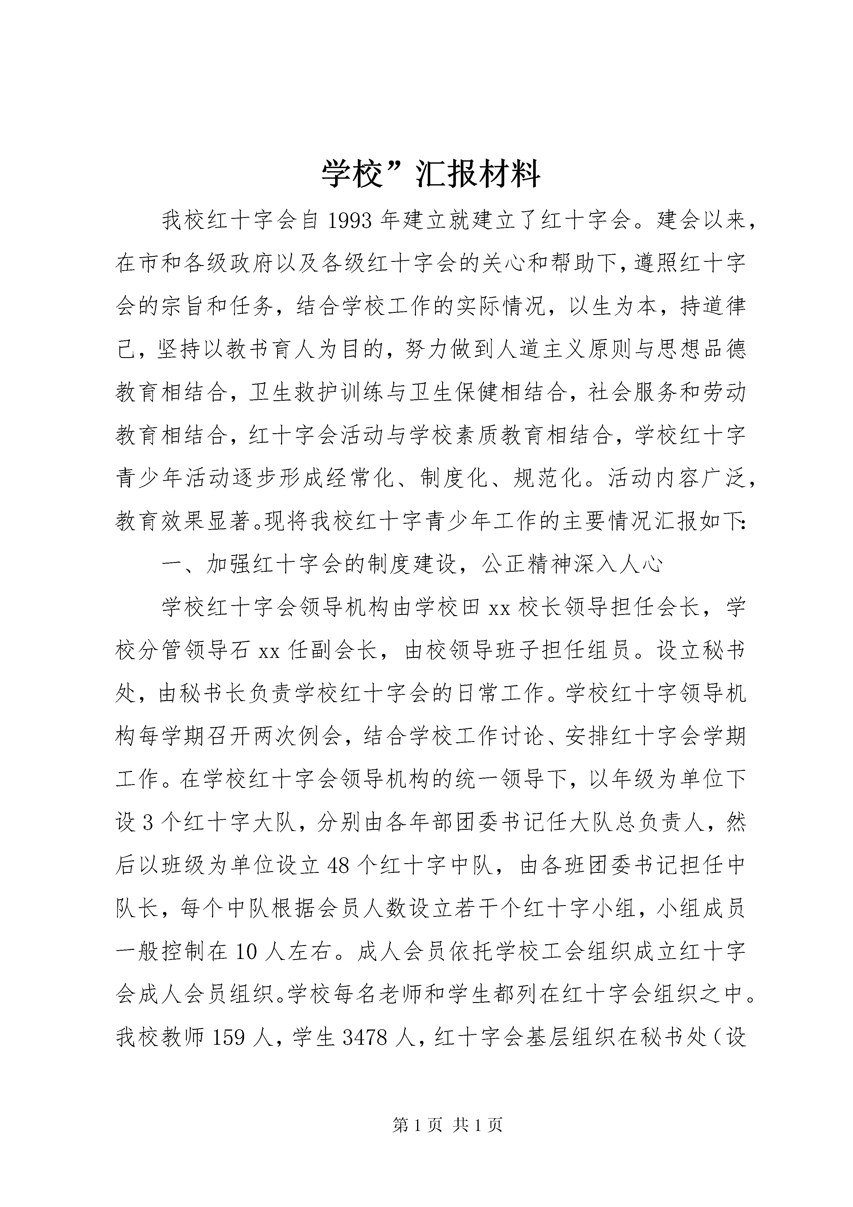 学校”汇报材料我校红十字会自1993年建立就建立了红十字会。建会以来,在市和各级政府以及各级红十字会的关心和帮助下,遵照红十字会的宗旨和任务,结合学校工作的实际情况,以生为本,持道律己,坚持以教书育人为目的,努力做到人道主义原则与思想品德教育相结合,卫生救护训练与卫生保健相结合,社会服务和劳动教育相结合,红十字会活动与学校素质教育相结合,学校红十字青少年活动逐步形成经常化、制度化、规范化。活动内容广泛,教育效果显著。现将我校红十字青少年工作的主要情况汇报如下:一、加强红十字会的制度建设,公正精神深入人心学校红十字会领导机构由学校田xx校长领导担任会长,学校分管领导石xx任副会长,由校领导班子担任组员。设立秘书处,由秘书长负责学校红十字会的日常工作。学校红十字领导机构每学期召开两次例会,结合学校工作讨论、安排红十字会学期工作。在学校红十字会领导机构的统一领导下,以年级为单位下设3个红十字大队,分别由各年部团委书记任大队总负责人,然后以班级为单位设立48个红十字中队,由各班团委书记担任中队长,每个中队根据会员人数设立若干个红十字小组,小组成员一般控制在10人左右。成人会员依托学校工会组织成立红十字会成人会员组织。学校每名老师和学生都列在红十字会组织之中。我校教师159人,学生3478人,红十字会基层组织在秘书处(设在政教处)的领导下开展工作,及时发展新会员,从而确保每个成员都能参加红十字会组织生活和活动,确保红十字会的各项措施、工作能够落到实处。二学校领导重视,在承载责任中彰显人道学校红十字会会长对工作非常重视。把红十字会的工作纳入学校工作议程和年度工作计划,做到统筹安排统一布置,检查督促,三个环节环环抓实。每学年召开理事会,布置工作明确分工,遇到问题及时解决,通过制定“红十字会工作制度”、“红十字卫生员轮值制度”等,实施岗位目标责任制,红十字工作和健康教育工作形成校园网络。保健教师作为校红十字会秘书长,承担具体工作,尽职尽责。把红十会活动资料及时整理,每学年都制定红十字会工作计划并进行学年工作总结。促进了红十字会工作的“三化”进程,学校红十字会会长,秘书长积极参加上一级红十字会召开的会议和活动。详细记录,认真的传达,布置会议。同时,丰富宣传的渠道,提高宣传效率。1、建立“心理健康辅导站”宣传阵地。由我校具有一定社会阅历、经验丰富的中老年教师组成,重点宣传会务知识、卫生保健知识和青少年心理健康等红十字方面的相关知识,为同学、老师认识红十字意义创造条件。三活动丰富多彩,在创新追求中见证博爱红十字会结合每年一次的校园文化艺术节、体育节、英语节、科技节、法制教育宣传月等活动,积极组织会员参与,丰富多彩的活动,重视救护卫生知识的普及并把红十字会的知识教育和健康知识教育融入平时的各项活动中。主要表现在:1认真贯彻实施《学校卫生工作条例》,重视进行健康教育。红十字会把纳入学校的管理内容,做到授课时间,任课教师、教材、三保证。各班班主任和体育教师为健康教育、卫生教育兼职教师。每周二上午晨会课和俩周一节的健康教育课。作为对学生进行卫生知识,健康教育时间。学校设有固定的红十字宣传栏,每月或俩个月出一期板报,向全校师生宣传红十字会知识和卫生防疫知识,并结合省体卫艺检查,开展红十字会知识和预防近视眼知识和冬季传染病预防知识讲座、竞赛。并纳入学校考核。2、各班派卫生员参加红十字会组织的骨干培训班学习,增强会员的能力,扩大了交流的范围。学校红十字会组织会员进行卫生常识,救护技术培训。使之成为学校卫生保健工作的骨干。3、实施关爱工程,开展“一对一”帮困助学活动。学校分年部组织全体共产党员、行政人员、班主任与贫困学生结对,在学习、生活、身体、心理、家庭、人际交往等方面全方位给与物质和精神上的关心和帮助。2009年春节前,学校组织全体共产党员、行政人员、班主任共80多人带着春节慰问品和慰问金,分赴100多名贫困学生家庭,把学校大家庭的温暖送到千家万户,在社会上产生了强烈的反响。我们学校每周五的“一纸万情”活动,使得每个学生都奉献爱心,博爱就是我身边。校红十字会通过多种途径,组织单亲学生、特殊学生、孤儿等贫困学生与区公安局、区供电局、区妇联、区政协等部门和单位结对,帮助他们完成学业,不因家庭贫困而失学。学校设立奖学金制度,设立助困进步奖,对学有进步的贫困学生进行奖励。4、开展红十字青少年夏令营和社会调查活动。2010年7月19日,组织红十字会中队长以及骨干分子赴盖县115师与共建部队开展“纪念红军长征胜利七十周年”军营一日游活动。观看了连队历史纪录片,实地察看了部队内务卫生,观摩了部队军人队列训练,亲身体验了海滩登陆模拟训练现场,与军人面对面的交流,接受了一次革命军事教育、国防教育和爱国主义教育,促进了学生思想道德水平的提高。利用暑假、寒
