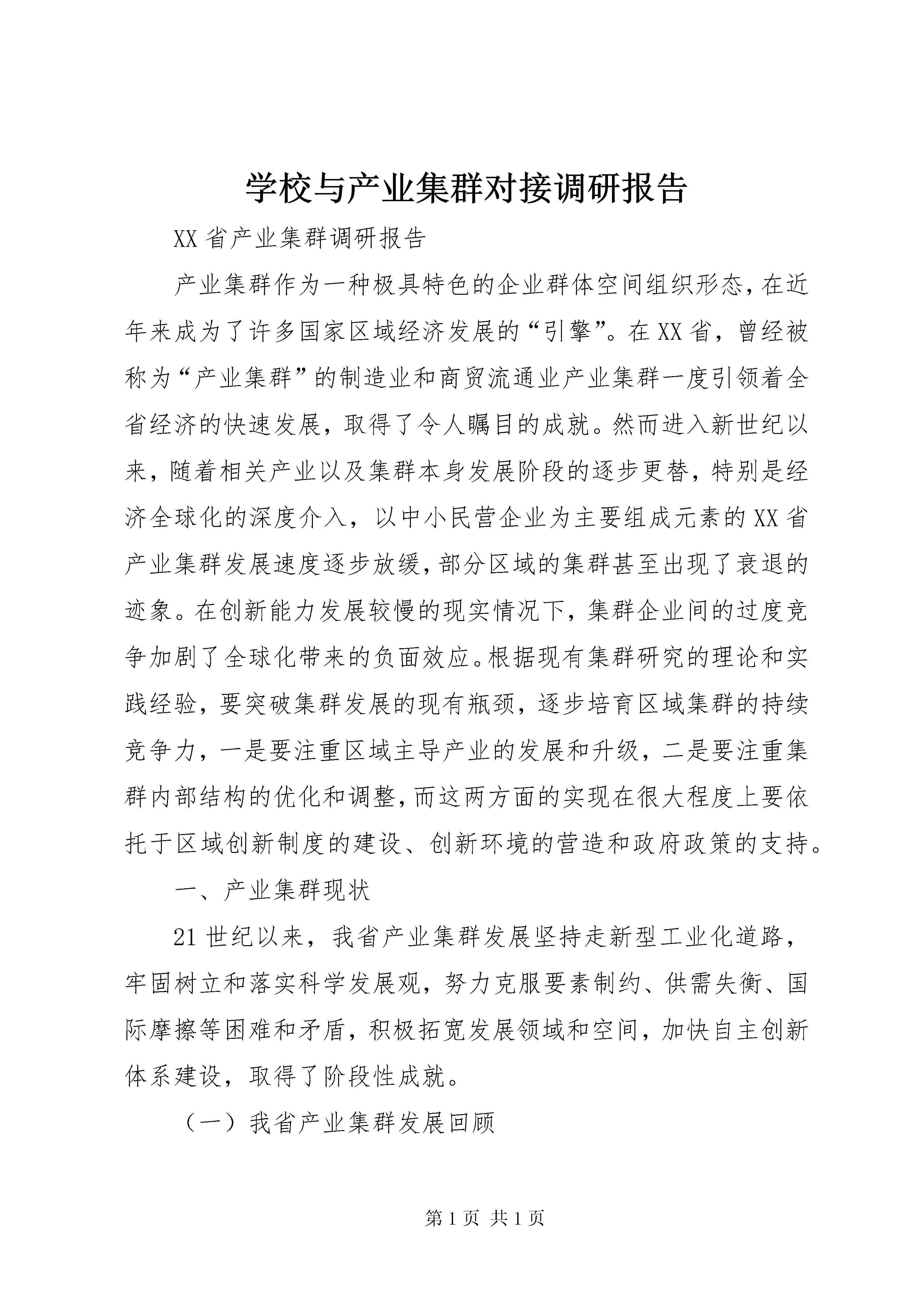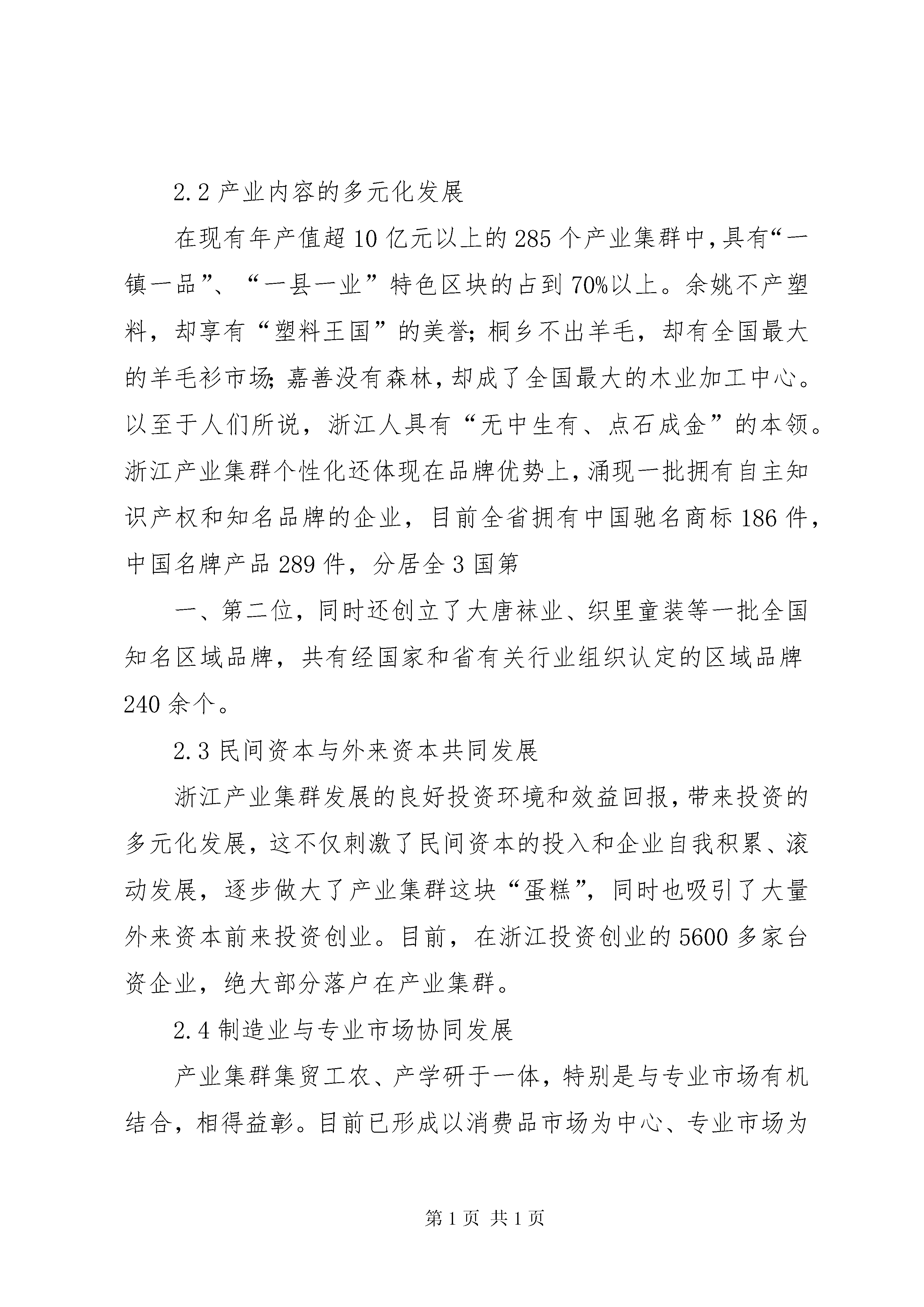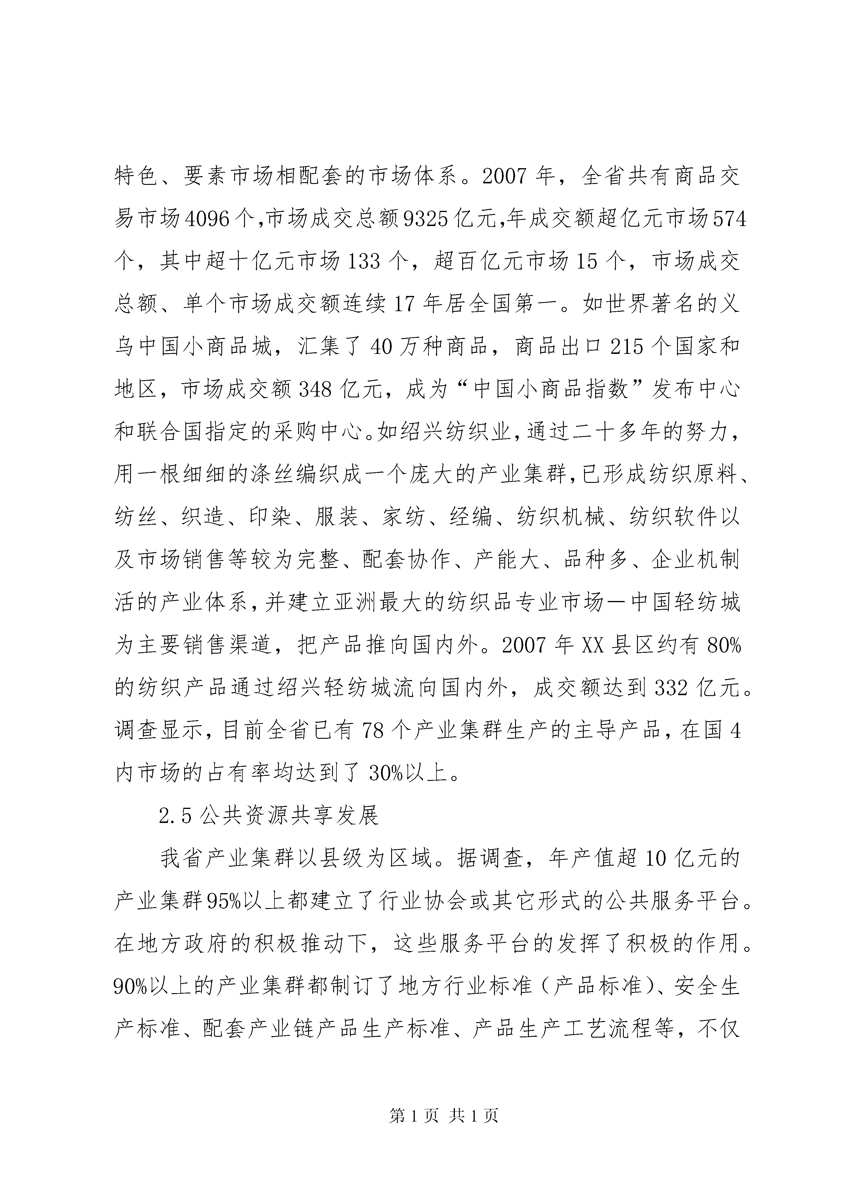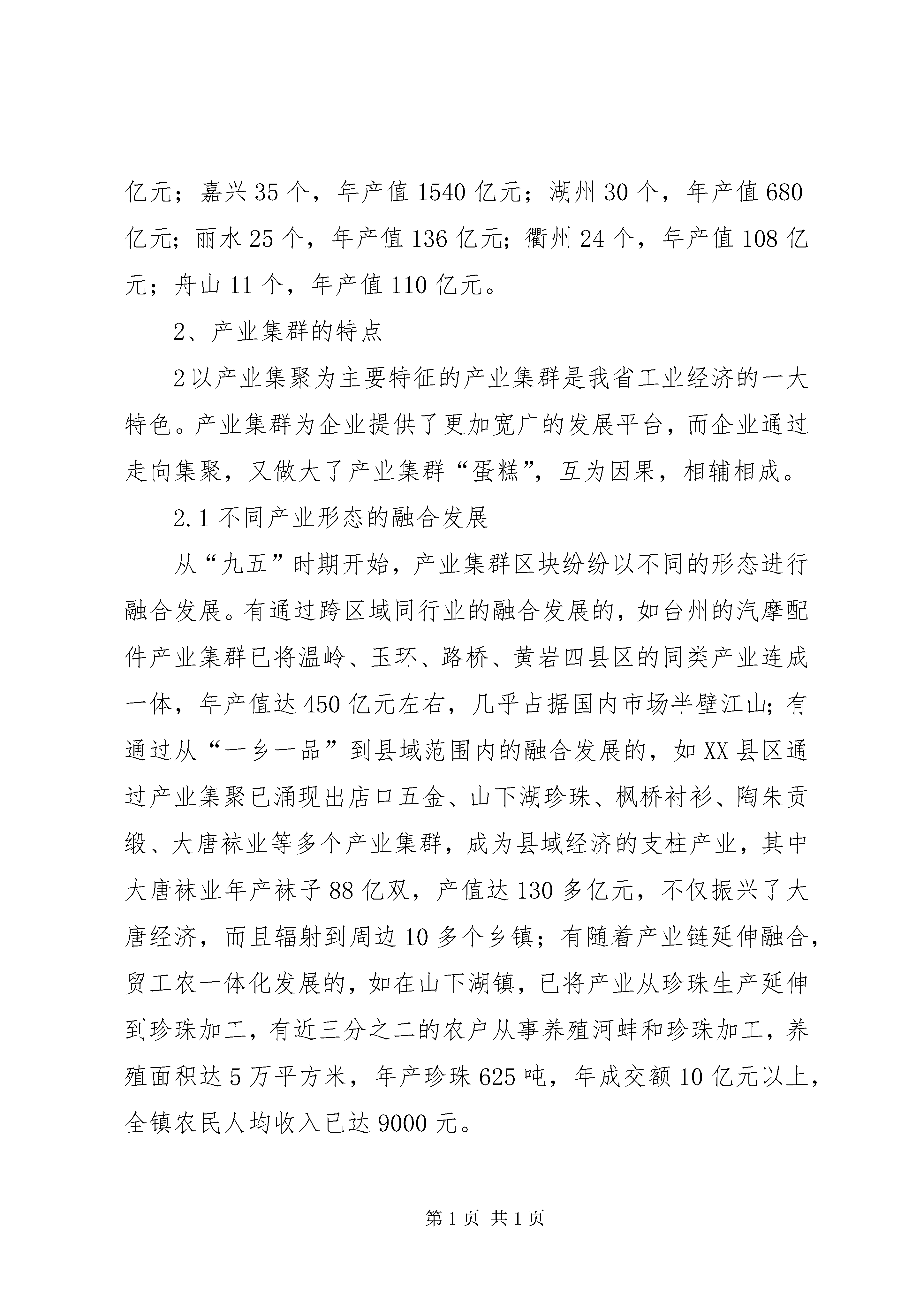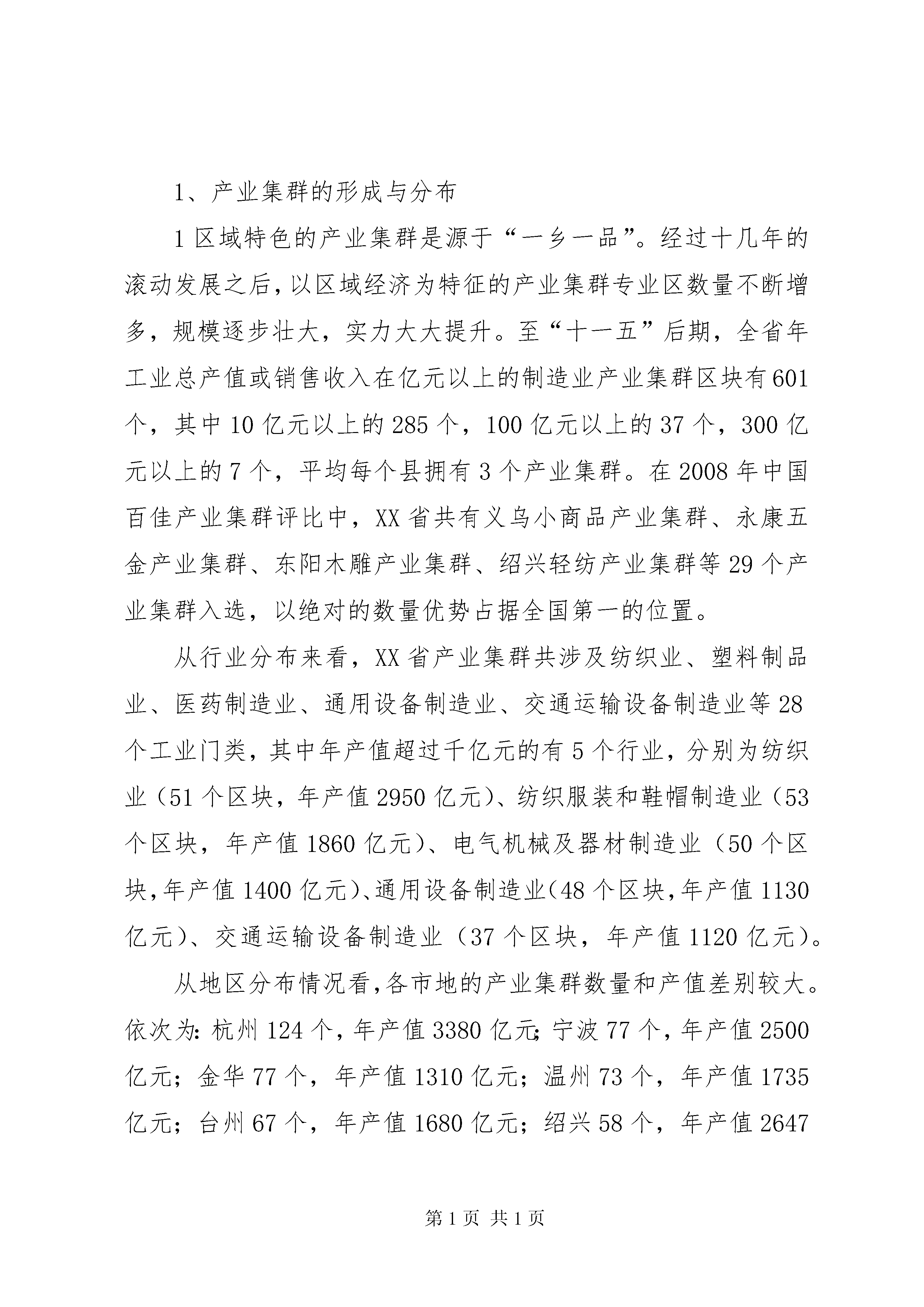 学校与产业集群对接调研报告XX省产业集群调研报告产业集群作为一种极具特色的企业群体空间组织形态,在近年来成为了许多国家区域经济发展的“引擎”。在XX省,曾经被称为“产业集群”的制造业和商贸流通业产业集群一度引领着全省经济的快速发展,取得了令人瞩目的成就。然而进入新世纪以来,随着相关产业以及集群本身发展阶段的逐步更替,特别是经济全球化的深度介入,以中小民营企业为主要组成元素的XX省产业集群发展速度逐步放缓,部分区域的集群甚至出现了衰退的迹象。在创新能力发展较慢的现实情况下,集群企业间的过度竞争加剧了全球化带来的负面效应。根据现有集群研究的理论和实践经验,要突破集群发展的现有瓶颈,逐步培育区域集群的持续竞争力,一是要注重区域主导产业的发展和升级,二是要注重集群内部结构的优化和调整,而这两方面的实现在很大程度上要依托于区域创新制度的建设、创新环境的营造和政府政策的支持。一、产业集群现状21世纪以来,我省产业集群发展坚持走新型工业化道路,牢固树立和落实科学发展观,努力克服要素制约、供需失衡、国际摩擦等困难和矛盾,积极拓宽发展领域和空间,加快自主创新体系建设,取得了阶段性成就。(一)我省产业集群发展回顾1、产业集群的形成与分布1区域特色的产业集群是源于“一乡一品”。经过十几年的滚动发展之后,以区域经济为特征的产业集群专业区数量不断增多,规模逐步壮大,实力大大提升。至“十一五”后期,全省年工业总产值或销售收入在亿元以上的制造业产业集群区块有601个,其中10亿元以上的285个,100亿元以上的37个,300亿元以上的7个,平均每个县拥有3个产业集群。在2008年中国百佳产业集群评比中,XX省共有义乌小商品产业集群、永康五金产业集群、东阳木雕产业集群、绍兴轻纺产业集群等29个产业集群入选,以绝对的数量优势占据全国第一的位置。从行业分布来看,XX省产业集群共涉及纺织业、塑料制品业、医药制造业、通用设备制造业、交通运输设备制造业等28个工业门类,其中年产值超过千亿元的有5个行业,分别为纺织业(51个区块,年产值2950亿元)、纺织服装和鞋帽制造业(53个区块,年产值1860亿元)、电气机械及器材制造业(50个区块,年产值1400亿元)、通用设备制造业(48个区块,年产值1130亿元)、交通运输设备制造业(37个区块,年产值1120亿元)。从地区分布情况看,各市地的产业集群数量和产值差别较大。依次为:杭州124个,年产值3380亿元;宁波77个,年产值2500亿元;金华77个,年产值1310亿元;温州73个,年产值1735亿元;台州67个,年产值1680亿元;绍兴58个,年产值2647亿元;嘉兴35个,年产值1540亿元;湖州30个,年产值680亿元;丽水25个,年产值136亿元;衢州24个,年产值108亿元;舟山11个,年产值110亿元。2、产业集群的特点2以产业集聚为主要特征的产业集群是我省工业经济的一大特色。产业集群为企业提供了更加宽广的发展平台,而企业通过走向集聚,又做大了产业集群“蛋糕”,互为因果,相辅相成。2.1不同产业形态的融合发展从“九五”时期开始,产业集群区块纷纷以不同的形态进行融合发展。有通过跨区域同行业的融合发展的,如台州的汽摩配件产业集群已将温岭、玉环、路桥、黄岩四县区的同类产业连成一体,年产值达450亿元左右,几乎占据国内市场半壁江山;有通过从“一乡一品”到县域范围内的融合发展的,如XX县区通过产业集聚已涌现出店口五金、山下湖珍珠、枫桥衬衫、陶朱贡缎、大唐袜业等多个产业集群,成为县域经济的支柱产业,其中大唐袜业年产袜子88亿双,产值达130多亿元,不仅振兴了大唐经济,而且辐射到周边10多个乡镇;有随着产业链延伸融合,贸工农一体化发展的,如在山下湖镇,已将产业从珍珠生产延伸到珍珠加工,有近三分之二的农户从事养殖河蚌和珍珠加工,养殖面积达5万平方米,年产珍珠625吨,年成交额10亿元以上,全镇农民人均收入已达9000元。2.2产业内容的多元化发展在现有年产值超10亿元以上的285个产业集群中,具有“一镇一品”、“一县一业”特色区块的占到70%以上。余姚不产塑料,却享有“塑料王国”的美誉;桐乡不出羊毛,却有全国最大的羊毛衫市场;嘉善没有森林,却成了全国最大的木业加工中心。以至于人们所说,浙江人具有“无中生有、点石成金”的本领。浙江产业集群个性化还体现在品牌优势上,涌现一批拥有自主知识产权和知名品牌的企业,目前全省拥有中国驰名商标186件,中国名牌产品289件,分居全3国第一、第二位,同时还创立了大唐袜业、织里童装等一批全国知名区域品牌,共有经国家和省有关行业组织认定的区域品牌240余个。2.3民间资本与外来资本共同发展浙江产业集群发展的良好投资环境和效益回报,带来投资的多元化发展,这不仅刺激了民间资本