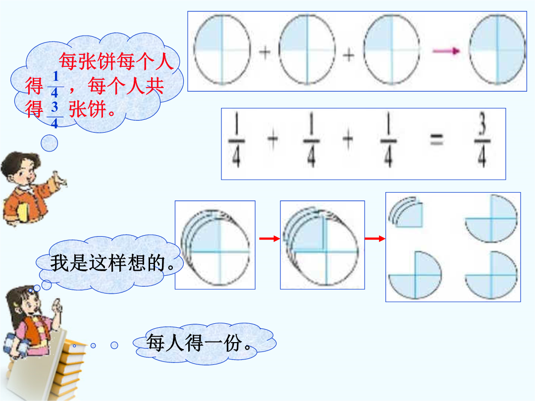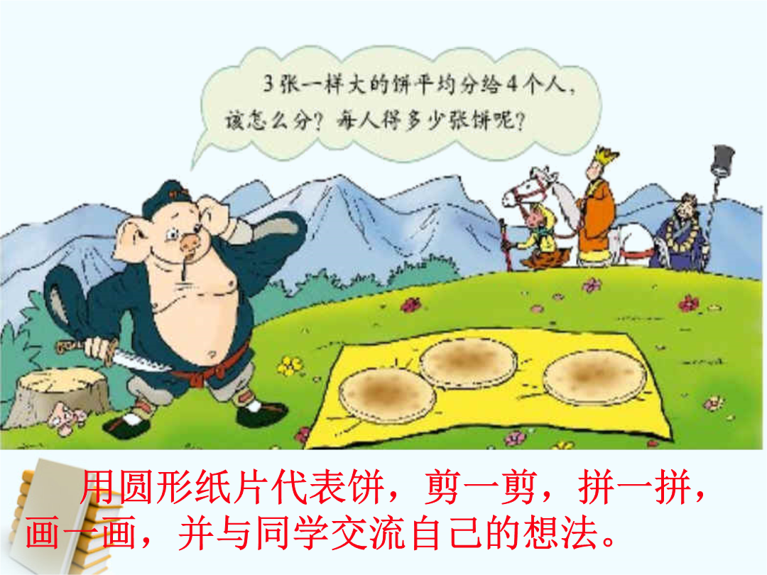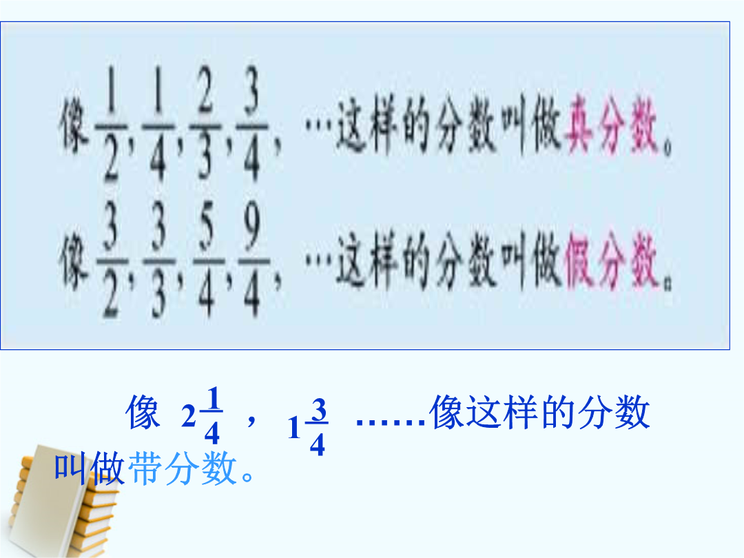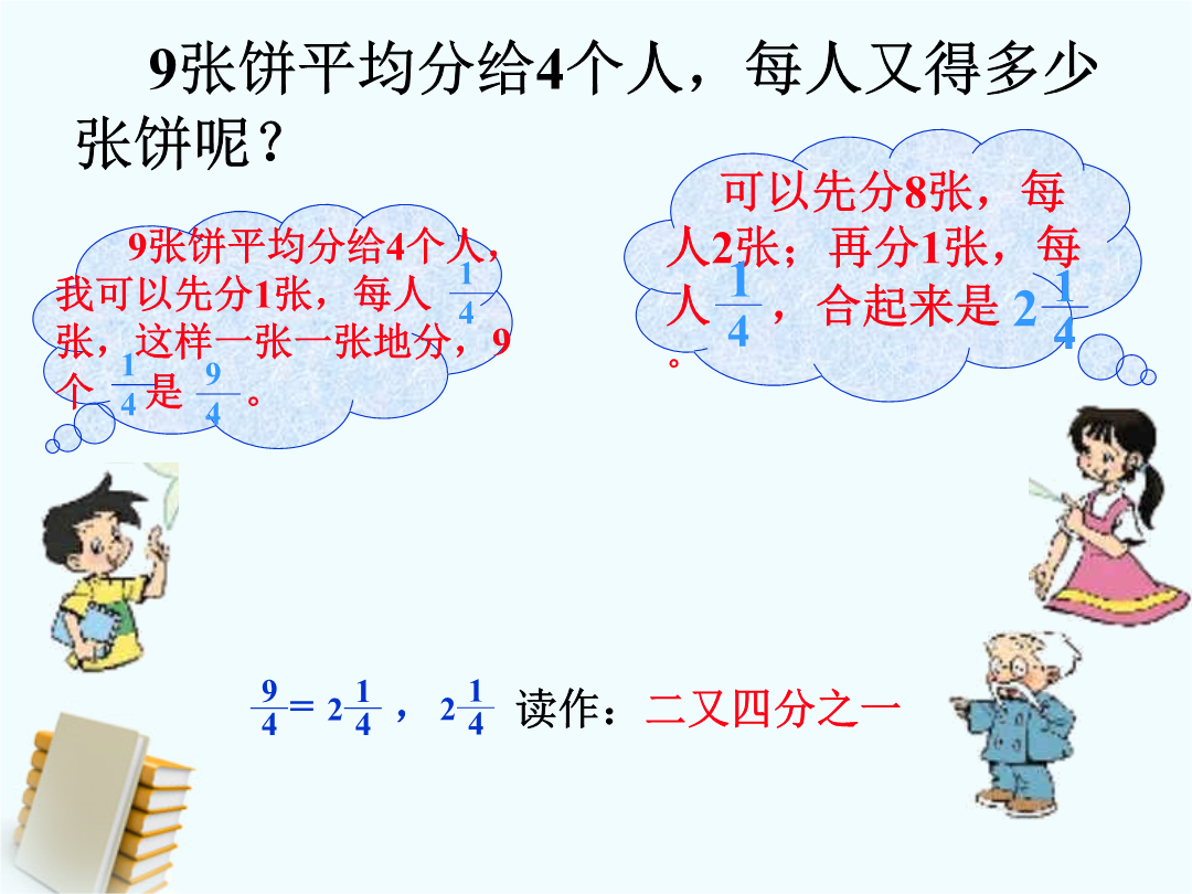 用圆形纸片代表饼,剪一剪,拼一拼,画一画,并与同学交流自己的想法。分饼9张饼平均分给4个人,每人又得多少张饼呢?像,……像这样的分数叫做带分数。在下面的括号里填上适当的数。1、用带分数和假分数分别表示下列图中的隐影部分。在直线上面的□里填上假分数,在下面的□里填上带分数。想一想总结