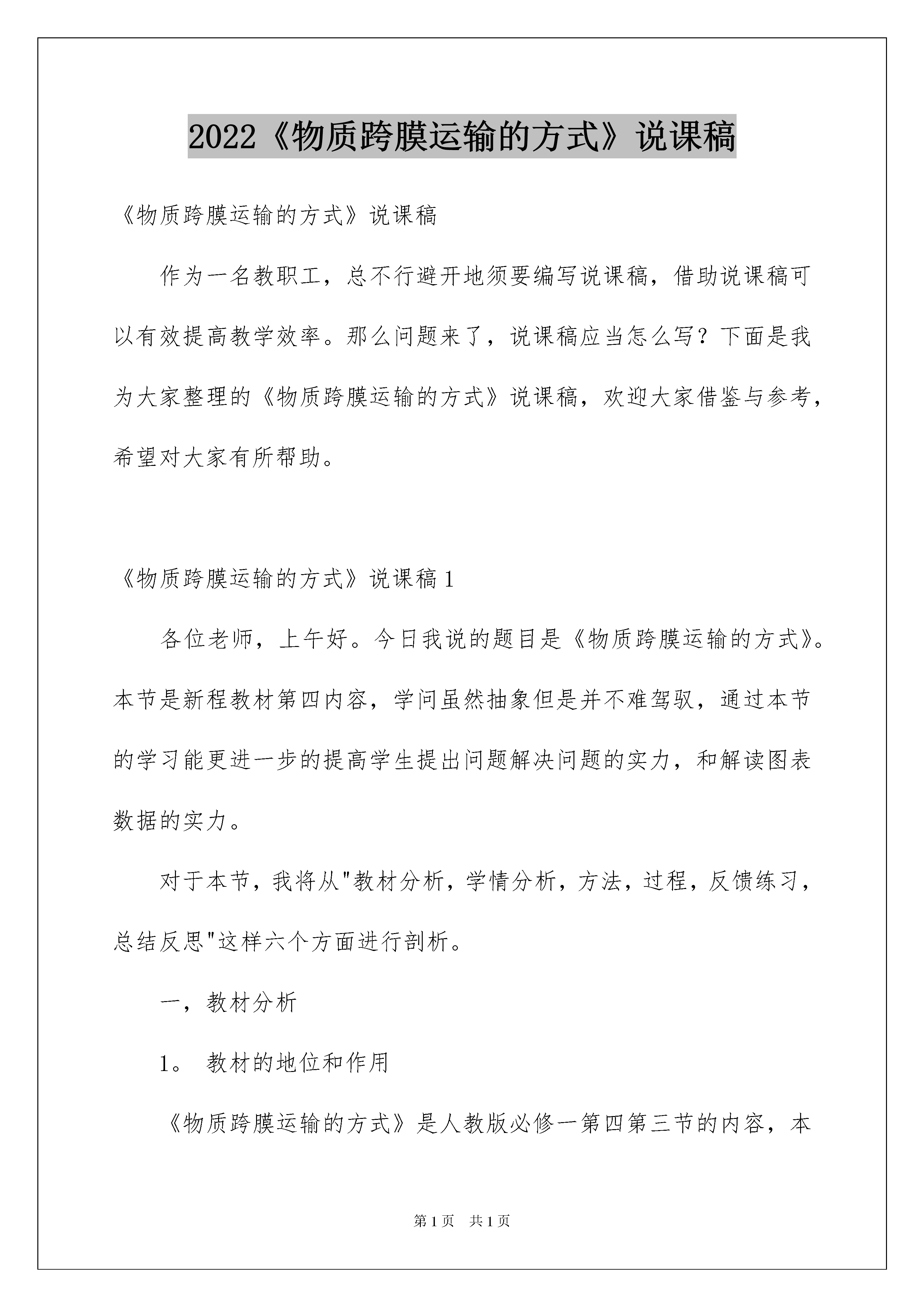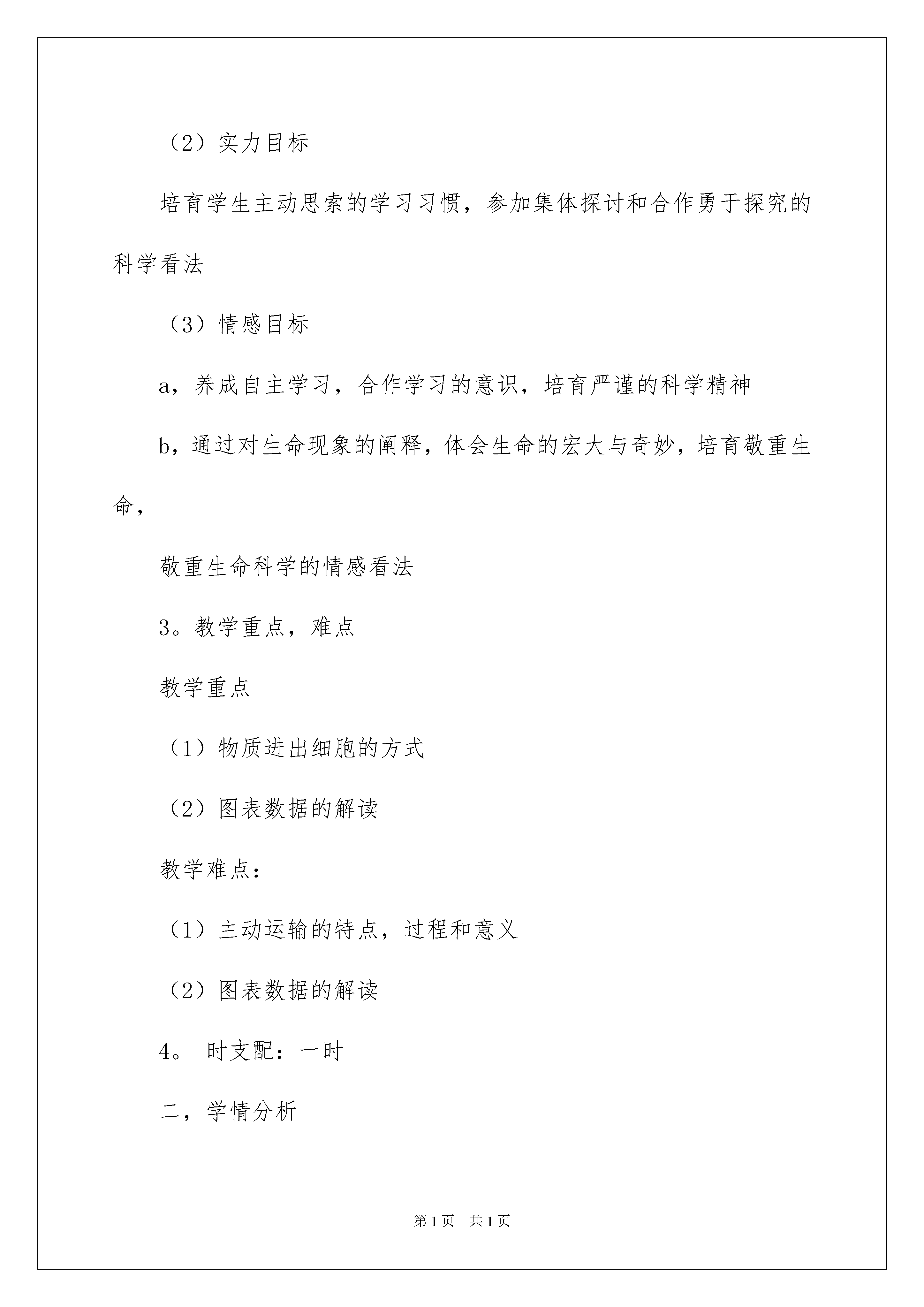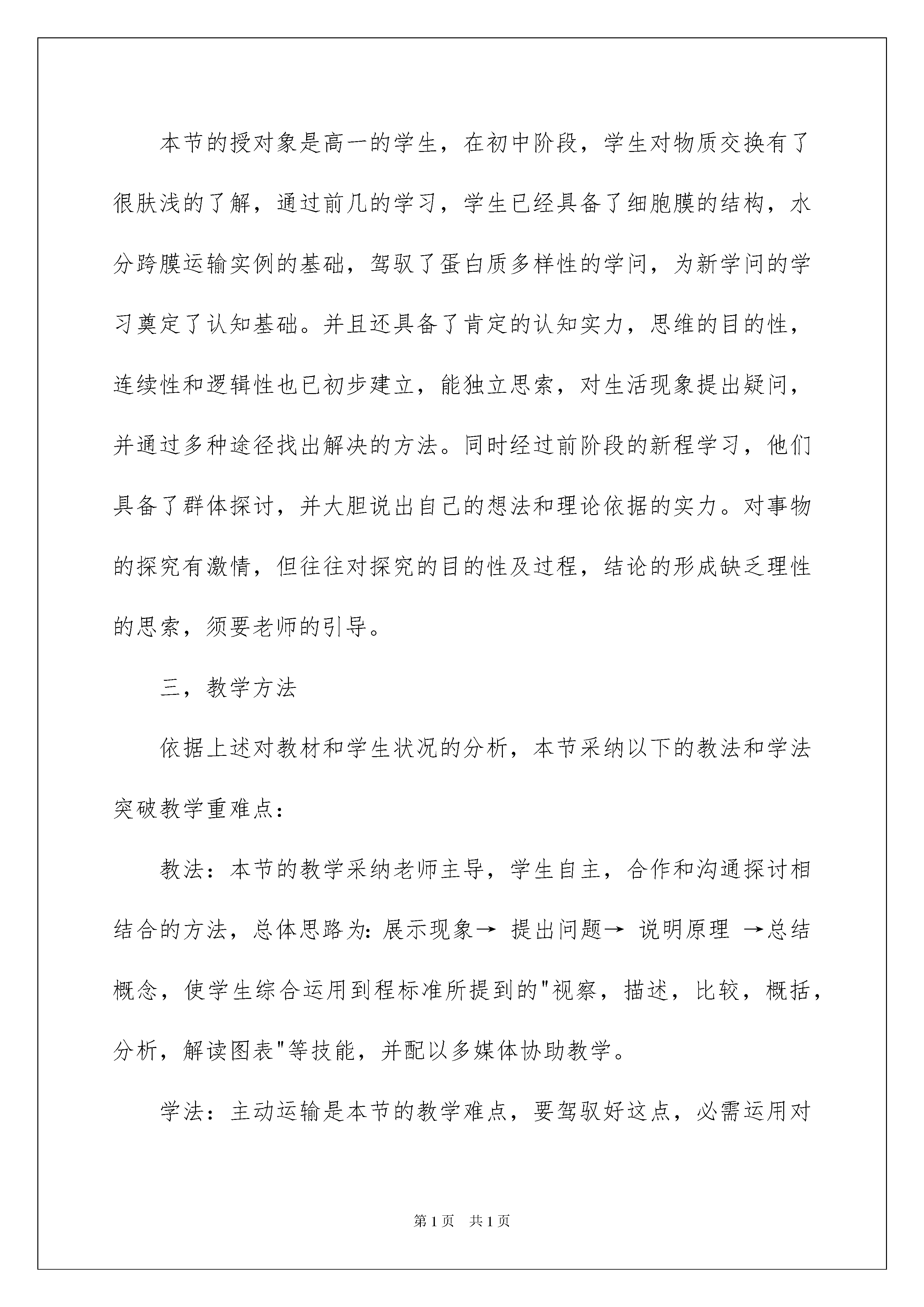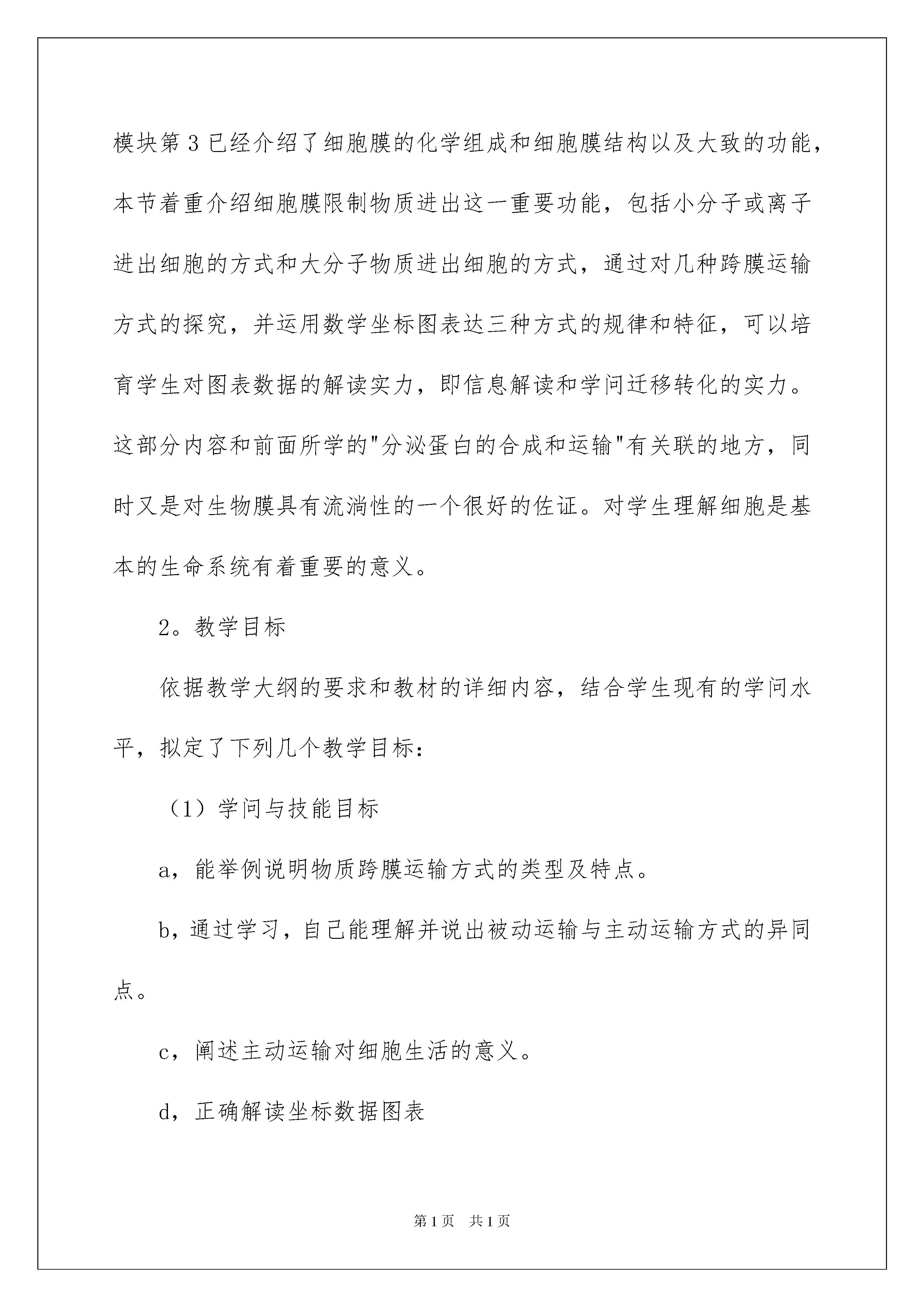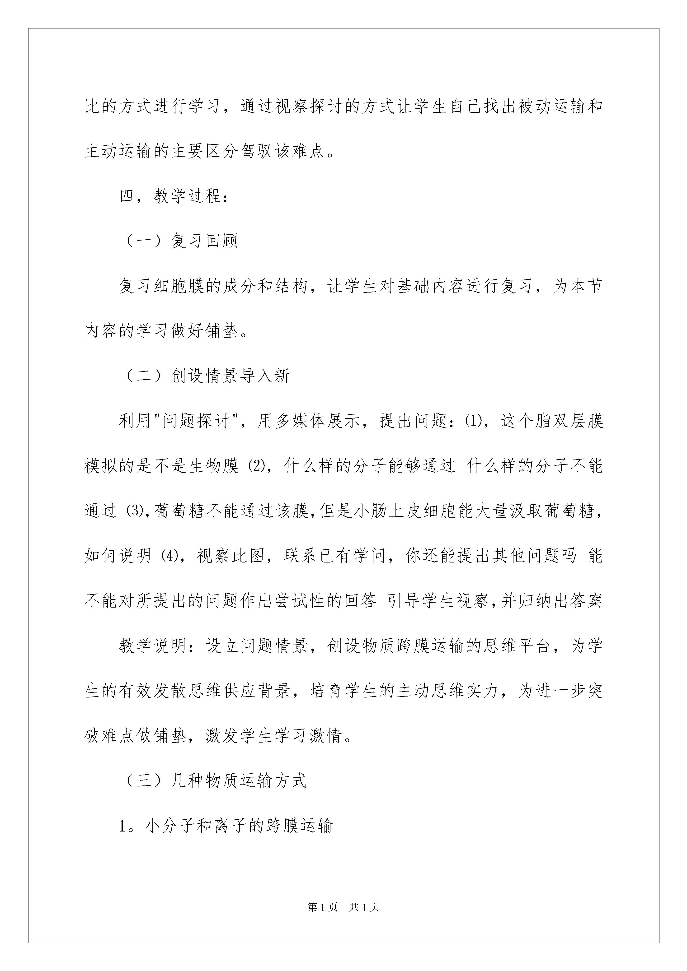 2022《物质跨膜运输的方式》说课稿《物质跨膜运输的方式》说课稿作为一名教职工,总不行避开地须要编写说课稿,借助说课稿可以有效提高教学效率。那么问题来了,说课稿应当怎么写?下面是我为大家整理的《物质跨膜运输的方式》说课稿,欢迎大家借鉴与参考,希望对大家有所帮助。《物质跨膜运输的方式》说课稿1各位老师,上午好。今日我说的题目是《物质跨膜运输的方式》。本节是新程教材第四内容,学问虽然抽象但是并不难驾驭,通过本节的学习能更进一步的提高学生提出问题解决问题的实力,和解读图表数据的实力。对于本节,我将从"教材分析,学情分析,方法,过程,反馈练习,总结反思"这样六个方面进行剖析。一,教材分析1。教材的地位和作用《物质跨膜运输的方式》是人教版必修一第四第三节的内容,本模块第3已经介绍了细胞膜的化学组成和细胞膜结构以及大致的功能,本节着重介绍细胞膜限制物质进出这一重要功能,包括小分子或离子进出细胞的方式和大分子物质进出细胞的方式,通过对几种跨膜运输方式的探究,并运用数学坐标图表达三种方式的规律和特征,可以培育学生对图表数据的解读实力,即信息解读和学问迁移转化的实力。这部分内容和前面所学的"分泌蛋白的合成和运输"有关联的地方,同时又是对生物膜具有流淌性的一个很好的佐证。对学生理解细胞是基本的生命系统有着重要的意义。2。教学目标依据教学大纲的要求和教材的详细内容,结合学生现有的学问水平,拟定了下列几个教学目标:(1)学问与技能目标a,能举例说明物质跨膜运输方式的类型及特点。b,通过学习,自己能理解并说出被动运输与主动运输方式的异同点。c,阐述主动运输对细胞生活的意义。d,正确解读坐标数据图表(2)实力目标培育学生主动思索的学习习惯,参加集体探讨和合作勇于探究的科学看法(3)情感目标a,养成自主学习,合作学习的意识,培育严谨的科学精神b,通过对生命现象的阐释,体会生命的宏大与奇妙,培育敬重生命,敬重生命科学的情感看法3。教学重点,难点教学重点(1)物质进出细胞的方式(2)图表数据的解读教学难点:(1)主动运输的特点,过程和意义(2)图表数据的解读4。时支配:一时二,学情分析本节的授对象是高一的学生,在初中阶段,学生对物质交换有了很肤浅的了解,通过前几的学习,学生已经具备了细胞膜的结构,水分跨膜运输实例的基础,驾驭了蛋白质多样性的学问,为新学问的学习奠定了认知基础。并且还具备了肯定的认知实力,思维的目的性,连续性和逻辑性也已初步建立,能独立思索,对生活现象提出疑问,并通过多种途径找出解决的方法。同时经过前阶段的新程学习,他们具备了群体探讨,并大胆说出自己的想法和理论依据的实力。对事物的探究有激情,但往往对探究的目的性及过程,结论的形成缺乏理性的思索,须要老师的引导。三,教学方法依据上述对教材和学生状况的分析,本节采纳以下的教法和学法突破教学重难点:教法:本节的教学采纳老师主导,学生自主,合作和沟通探讨相结合的方法,总体思路为:展示现象→提出问题→说明原理→总结概念,使学生综合运用到程标准所提到的"视察,描述,比较,概括,分析,解读图表"等技能,并配以多媒体协助教学。学法:主动运输是本节的教学难点,要驾驭好这点,必需运用对比的方式进行学习,通过视察探讨的方式让学生自己找出被动运输和主动运输的主要区分驾驭该难点。四,教学过程:(一)复习回顾复习细胞膜的成分和结构,让学生对基础内容进行复习,为本节内容的学习做好铺垫。(二)创设情景导入新利用"问题探讨",用多媒体展示,提出问题:⑴,这个脂双层膜模拟的是不是生物膜⑵,什么样的分子能够通过什么样的分子不能通过⑶,葡萄糖不能通过该膜,但是小肠上皮细胞能大量汲取葡萄糖,如何说明⑷,视察此图,联系已有学问,你还能提出其他问题吗能不能对所提出的问题作出尝试性的回答引导学生视察,并归纳出答案教学说明:设立问题情景,创设物质跨膜运输的思维平台,为学生的有效发散思维供应背景,培育学生的主动思维实力,为进一步突破难点做铺垫,激发学生学习激情。(三)几种物质运输方式1。小分子和离子的跨膜运输(1)多媒体展示扩散现象,引出物质运输的两种方式被动运输和主动运输的概念,让学生分析水分子进入细胞的缘由和方式,是不是和上述扩散相像,总结出自由扩散的概念,多媒体动画展示自由扩散的过程,组织学生探讨,得出自由扩散的特点。教学说明:该部分内容简洁,通过多媒体展示,使抽象内容形象化,便于学生理解(2)进一步提出问题:葡萄糖不能通过人工合成的脂质双分子层,但对于细胞说,葡萄糖又是必需的,它是怎样通过细胞膜进入细胞的激发学生的学习爱好和探究激情,让学生尝试作出说明,再指出载体蛋白的作用,总结出帮