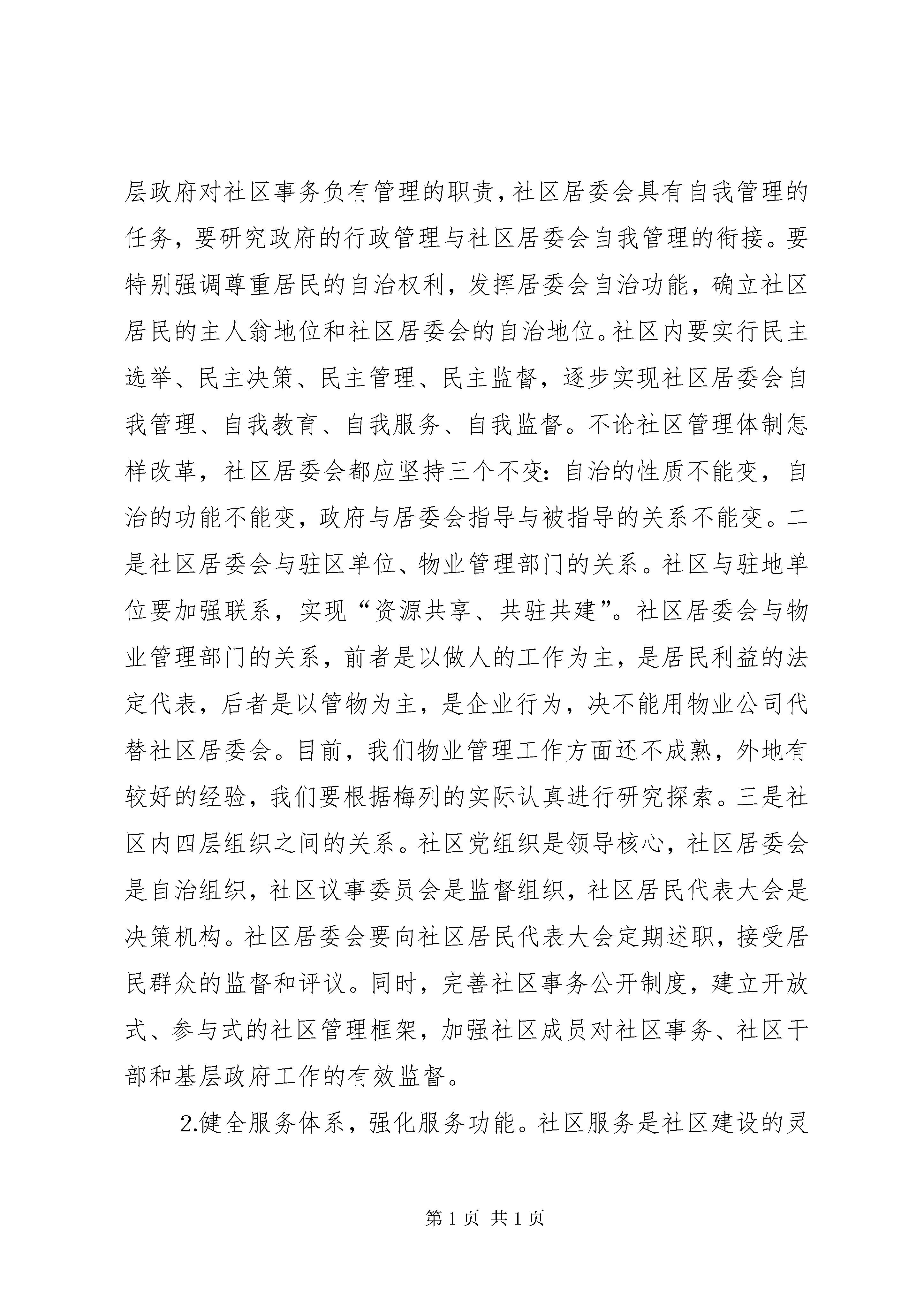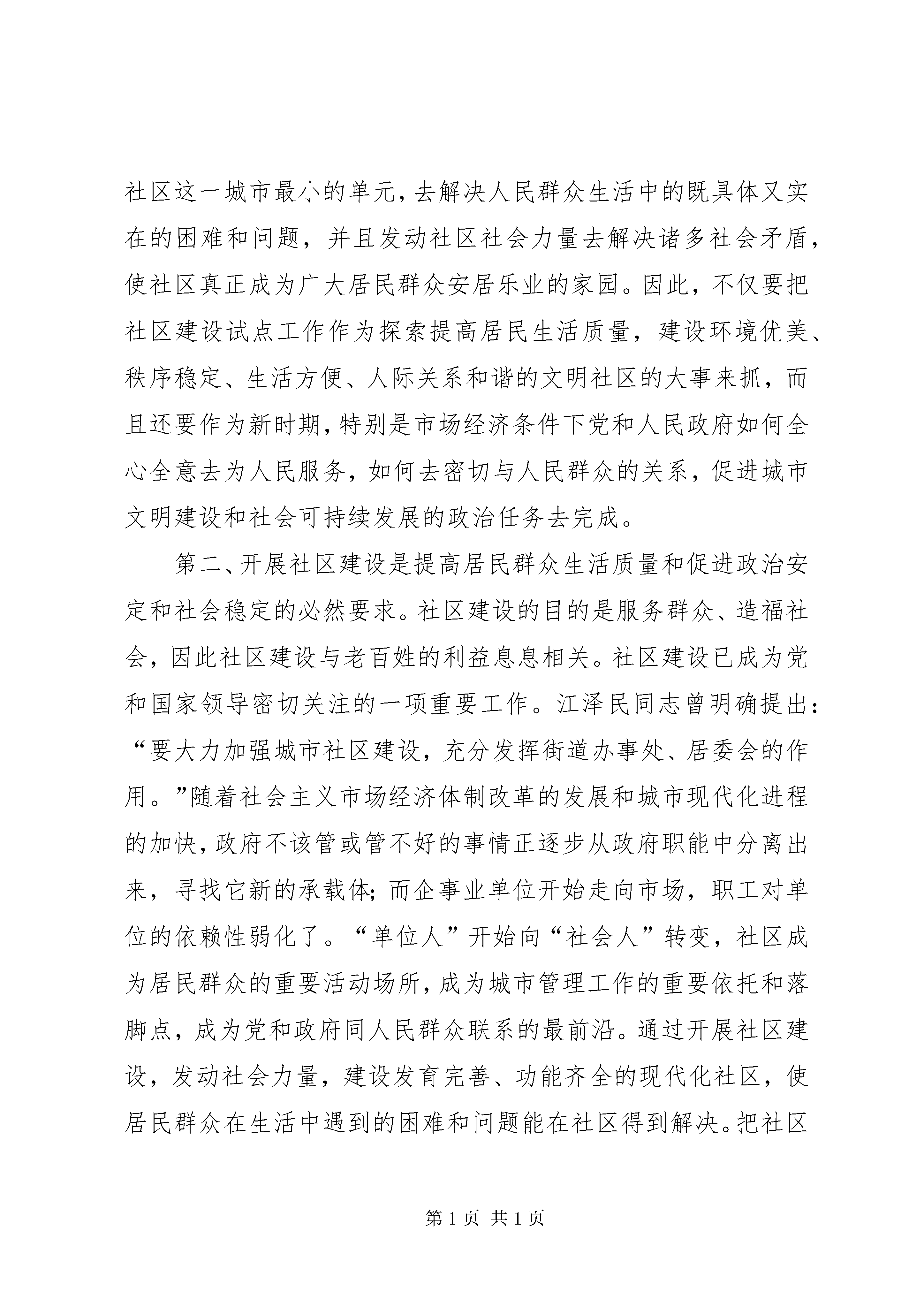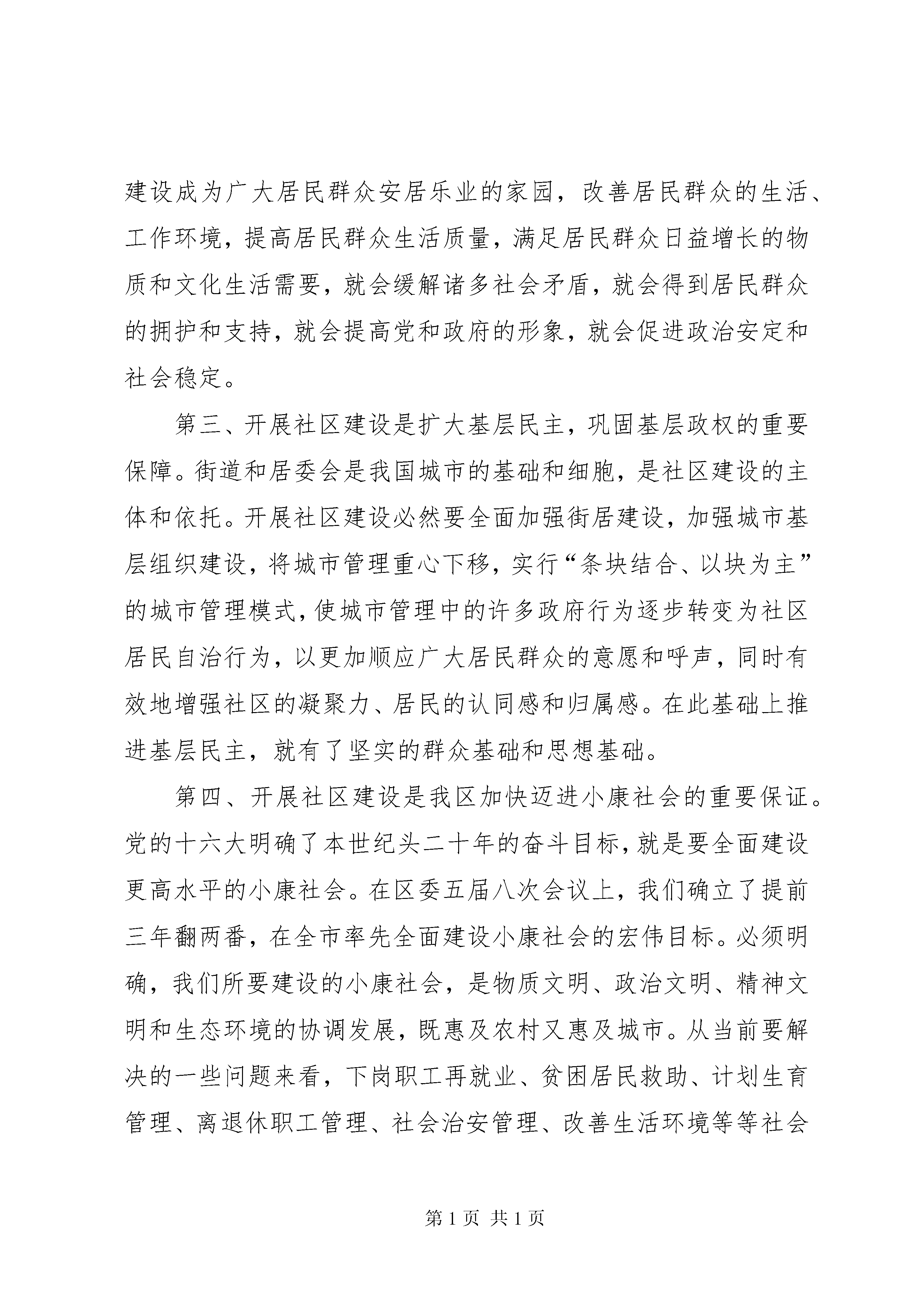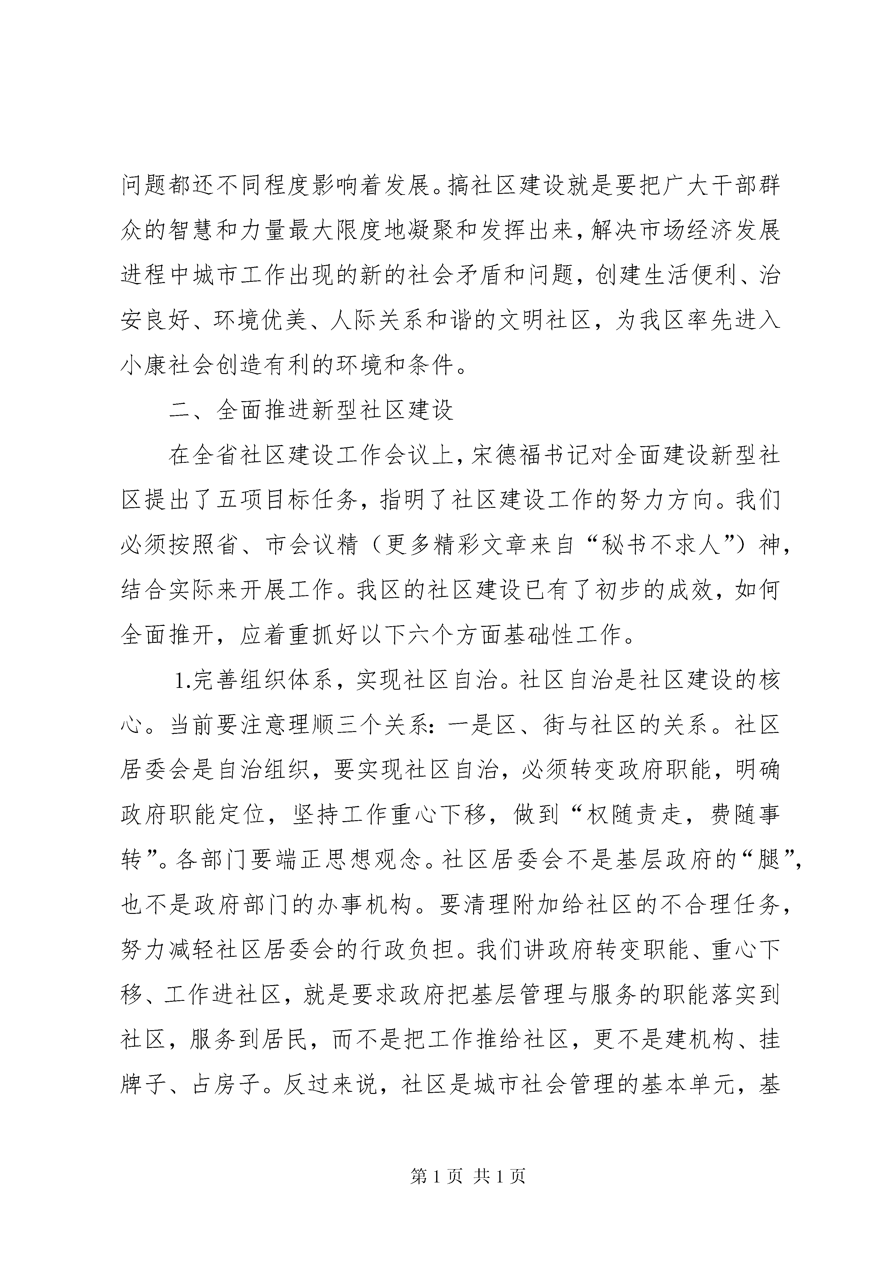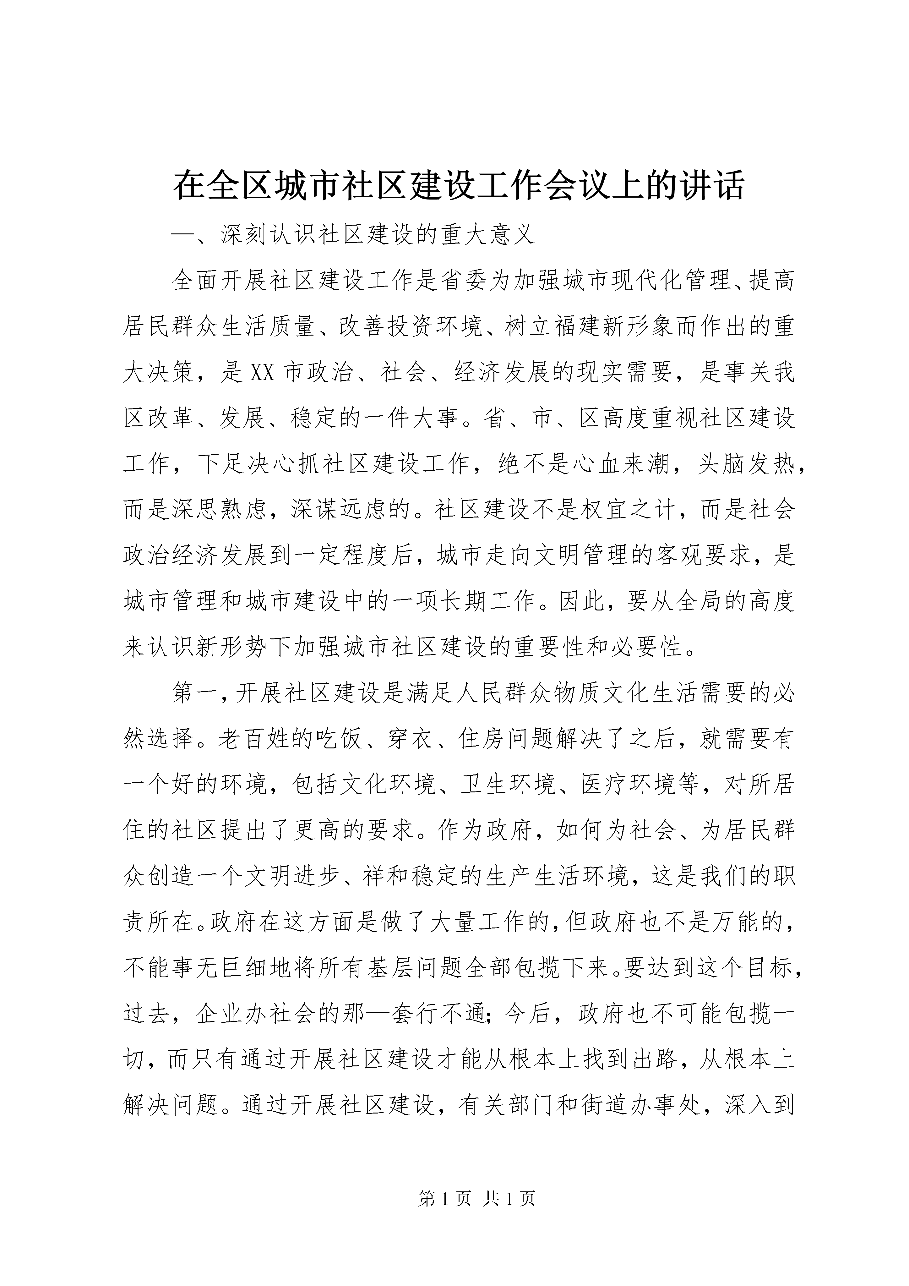 在全区城市社区建设工作会议上的讲话—、深刻认识社区建设的重大意义全面开展社区建设工作是省委为加强城市现代化管理、提高居民群众生活质量、改善投资环境、树立福建新形象而作出的重大决策,是XX市政治、社会、经济发展的现实需要,是事关我区改革、发展、稳定的一件大事。省、市、区高度重视社区建设工作,下足决心抓社区建设工作,绝不是心血来潮,头脑发热,而是深思熟虑,深谋远虑的。社区建设不是权宜之计,而是社会政治经济发展到一定程度后,城市走向文明管理的客观要求,是城市管理和城市建设中的一项长期工作。因此,要从全局的高度来认识新形势下加强城市社区建设的重要性和必要性。第一,开展社区建设是满足人民群众物质文化生活需要的必然选择。老百姓的吃饭、穿衣、住房问题解决了之后,就需要有一个好的环境,包括文化环境、卫生环境、医疗环境等,对所居住的社区提出了更高的要求。作为政府,如何为社会、为居民群众创造一个文明进步、祥和稳定的生产生活环境,这是我们的职责所在。政府在这方面是做了大量工作的,但政府也不是万能的,不能事无巨细地将所有基层问题全部包揽下来。要达到这个目标,过去,企业办社会的那—套行不通;今后,政府也不可能包揽一切,而只有通过开展社区建设才能从根本上找到出路,从根本上解决问题。通过开展社区建设,有关部门和街道办事处,深入到社区这一城市最小的单元,去解决人民群众生活中的既具体又实在的困难和问题,并且发动社区社会力量去解决诸多社会矛盾,使社区真正成为广大居民群众安居乐业的家园。因此,不仅要把社区建设试点工作作为探索提高居民生活质量,建设环境优美、秩序稳定、生活方便、人际关系和谐的文明社区的大事来抓,而且还要作为新时期,特别是市场经济条件下党和人民政府如何全心全意去为人民服务,如何去密切与人民群众的关系,促进城市文明建设和社会可持续发展的政治任务去完成。第二、开展社区建设是提高居民群众生活质量和促进政治安定和社会稳定的必然要求。社区建设的目的是服务群众、造福社会,因此社区建设与老百姓的利益息息相关。社区建设已成为党和国家领导密切关注的一项重要工作。江泽民同志曾明确提出:“要大力加强城市社区建设,充分发挥街道办事处、居委会的作用。”随着社会主义市场经济体制改革的发展和城市现代化进程的加快,政府不该管或管不好的事情正逐步从政府职能中分离出来,寻找它新的承载体;而企事业单位开始走向市场,职工对单位的依赖性弱化了。“单位人”开始向“社会人”转变,社区成为居民群众的重要活动场所,成为城市管理工作的重要依托和落脚点,成为党和政府同人民群众联系的最前沿。通过开展社区建设,发动社会力量,建设发育完善、功能齐全的现代化社区,使居民群众在生活中遇到的困难和问题能在社区得到解决。把社区建设成为广大居民群众安居乐业的家园,改善居民群众的生活、工作环境,提高居民群众生活质量,满足居民群众日益增长的物质和文化生活需要,就会缓解诸多社会矛盾,就会得到居民群众的拥护和支持,就会提高党和政府的形象,就会促进政治安定和社会稳定。第三、开展社区建设是扩大基层民主,巩固基层政权的重要保障。街道和居委会是我国城市的基础和细胞,是社区建设的主体和依托。开展社区建设必然要全面加强街居建设,加强城市基层组织建设,将城市管理重心下移,实行“条块结合、以块为主”的城市管理模式,使城市管理中的许多政府行为逐步转变为社区居民自治行为,以更加顺应广大居民群众的意愿和呼声,同时有效地增强社区的凝聚力、居民的认同感和归属感。在此基础上推进基层民主,就有了坚实的群众基础和思想基础。第四、开展社区建设是我区加快迈进小康社会的重要保证。党的十六大明确了本世纪头二十年的奋斗目标,就是要全面建设更高水平的小康社会。在区委五届八次会议上,我们确立了提前三年翻两番,在全市率先全面建设小康社会的宏伟目标。必须明确,我们所要建设的小康社会,是物质文明、政治文明、精神文明和生态环境的协调发展,既惠及农村又惠及城市。从当前要解决的一些问题来看,下岗职工再就业、贫困居民救助、计划生育管理、离退休职工管理、社会治安管理、改善生活环境等等社会问题都还不同程度影响着发展。搞社区建设就是要把广大干部群众的智慧和力量最大限度地凝聚和发挥出来,解决市场经济发展进程中城市工作出现的新的社会矛盾和问题,创建生活便利、治安良好、环境优美、人际关系和谐的文明社区,为我区率先进入小康社会创造有利的环境和条件。二、全面推进新型社区建设在全省社区建设工作会议上,宋德福书记对全面建设新型社区提出了五项目标任务,指明了社区建设工作的努力方向。我们必须按照省、市会议精(更多精彩文章来自“秘书不求人”)神,结合实际来开展工作。我区的社区建设已有了初步的成效,如何全面推开,应着重抓好以下六个方面基础性工作。⒈完善组织体系,实现社区自治。社区自治是社区