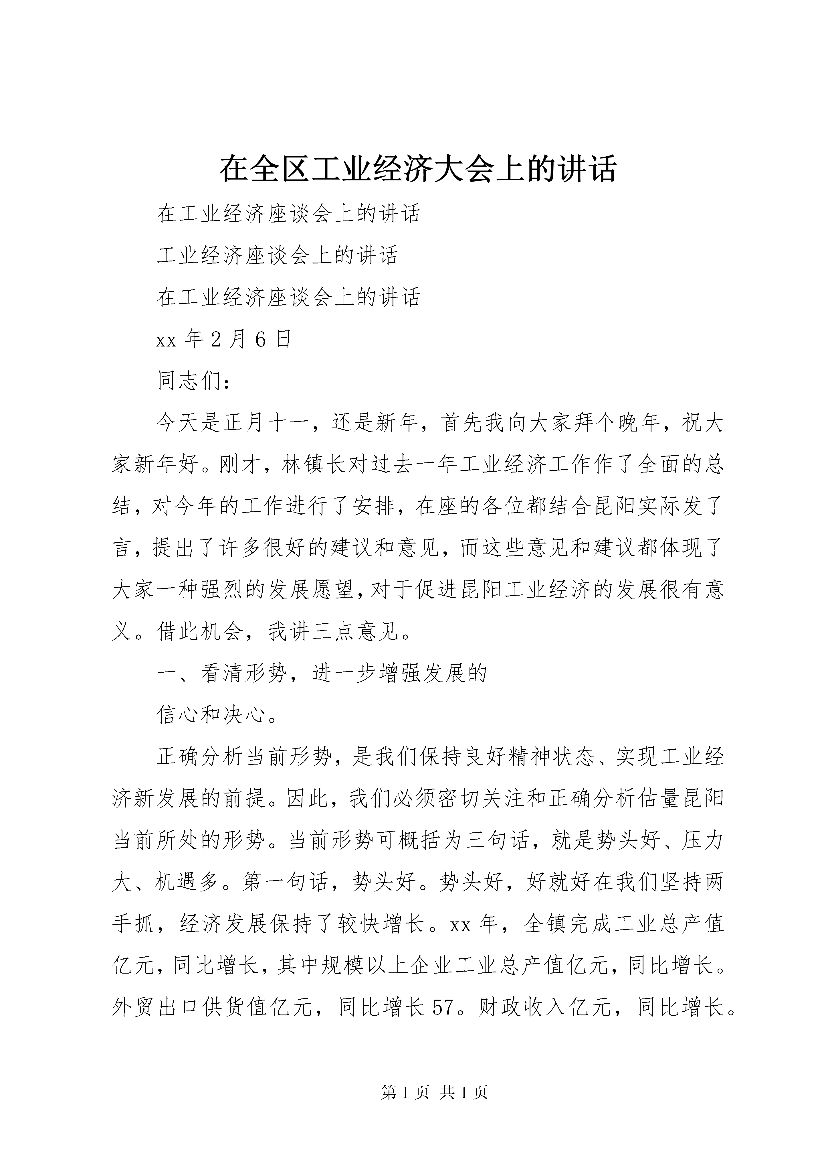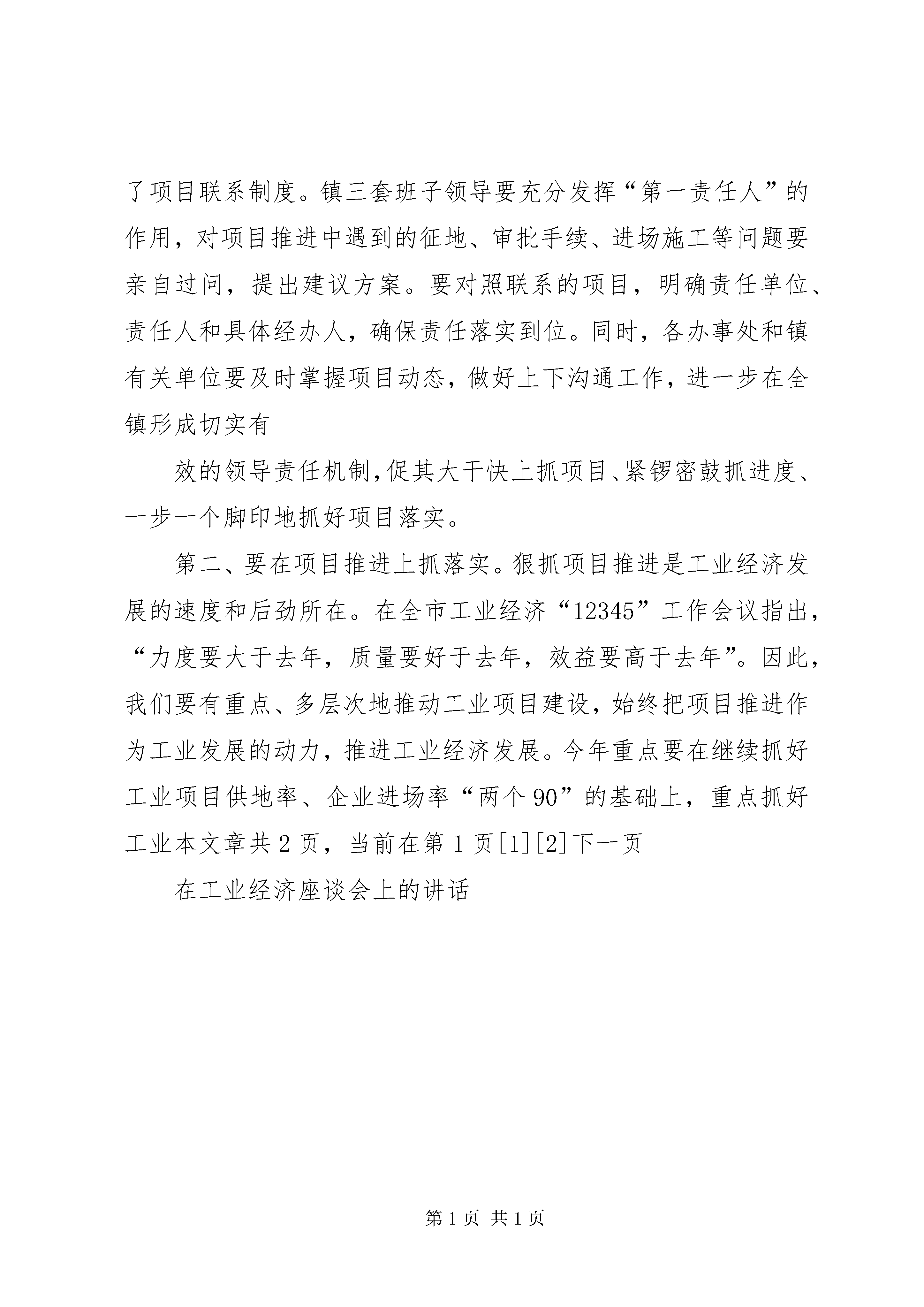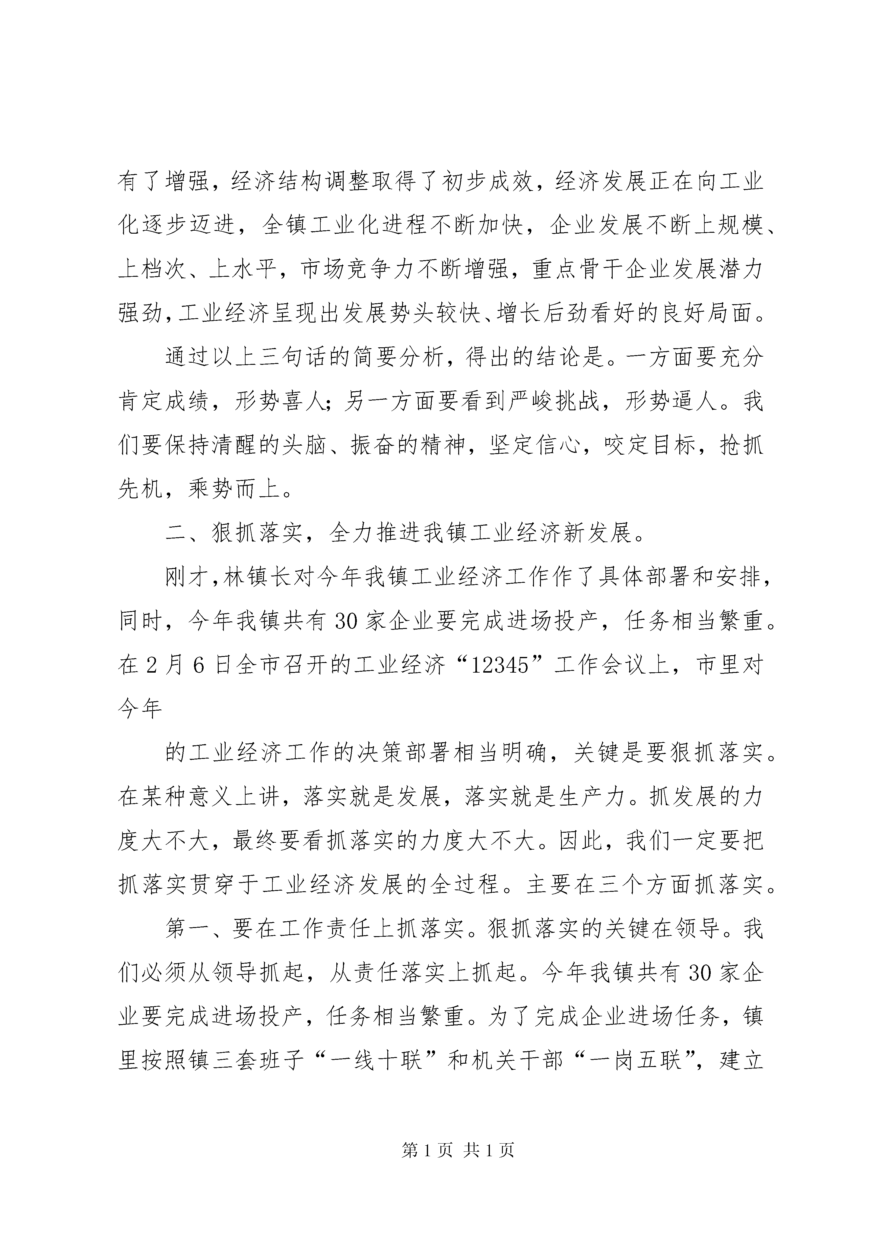 在全区工业经济大会上的讲话在工业经济座谈会上的讲话工业经济座谈会上的讲话在工业经济座谈会上的讲话xx年2月6日同志们:今天是正月十一,还是新年,首先我向大家拜个晚年,祝大家新年好。刚才,林镇长对过去一年工业经济工作作了全面的总结,对今年的工作进行了安排,在座的各位都结合昆阳实际发了言,提出了许多很好的建议和意见,而这些意见和建议都体现了大家一种强烈的发展愿望,对于促进昆阳工业经济的发展很有意义。借此机会,我讲三点意见。一、看清形势,进一步增强发展的信心和决心。正确分析当前形势,是我们保持良好精神状态、实现工业经济新发展的前提。因此,我们必须密切关注和正确分析估量昆阳当前所处的形势。当前形势可概括为三句话,就是势头好、压力大、机遇多。第一句话,势头好。势头好,好就好在我们坚持两手抓,经济发展保持了较快增长。xx年,全镇完成工业总产值亿元,同比增长,其中规模以上企业工业总产值亿元,同比增长。外贸出口供货值亿元,同比增长57。财政收入亿元,同比增长。势头好,好就好在我们突出项目推进、招商引资、园区建设等重点工作,工业经济发展后劲逐渐增强。规模企业达到48家,其中远东、金狮、金萨克、庄吉、乔治白等5家企业成为“超亿元”企业。招商引资出色,实际利用外资万美元,完成年任务数的;实际到位内资2646万元,完成年任务数的。企业进场率和供地率分别达到90以上。势头好,好就好在我们坚持统筹协调,保持了各项社会事业的健康发展,社会日益和谐稳定。所有这些成绩的取得离不开全镇广大干部的辛勤工作,更离不开在座广大企业家的共同努力。在此,我代表镇三套班子向你们表示衷心的感谢。第二句话,压力大。从我镇工业经济现状看,工业的结构性、素质性矛盾仍比较突出,低水平生产能力过剩,企业创新能力不强,产业结构升级步伐不快;土地、人才、资金以及能源等制约仍不同程度地存在,经济发展和资源、环境之间的矛盾仍比较突出;市场经济秩序不够规范,一些地方和企业的信用度不够高等。第三句话,机遇多。从外部经济环境看,随着党的十六届五中全会的胜利召开,经济增长方式有所转变,促进经济增长的内生性因素不断增强。在2月6号,全市召开了“四大工程”建设再动员会和工业经济“12345”工程会议,确定了今年全市工业经济发展目标和任务,全市必将掀起了新一轮发展热潮。从我镇的经济环境看,经过几年的深化改革和结构调整,大部分企业承受外部环境变化的能力有了增强,经济结构调整取得了初步成效,经济发展正在向工业化逐步迈进,全镇工业化进程不断加快,企业发展不断上规模、上档次、上水平,市场竞争力不断增强,重点骨干企业发展潜力强劲,工业经济呈现出发展势头较快、增长后劲看好的良好局面。通过以上三句话的简要分析,得出的结论是。一方面要充分肯定成绩,形势喜人;另一方面要看到严峻挑战,形势逼人。我们要保持清醒的头脑、振奋的精神,坚定信心,咬定目标,抢抓先机,乘势而上。二、狠抓落实,全力推进我镇工业经济新发展。刚才,林镇长对今年我镇工业经济工作作了具体部署和安排,同时,今年我镇共有30家企业要完成进场投产,任务相当繁重。在2月6日全市召开的工业经济“12345”工作会议上,市里对今年的工业经济工作的决策部署相当明确,关键是要狠抓落实。在某种意义上讲,落实就是发展,落实就是生产力。抓发展的力度大不大,最终要看抓落实的力度大不大。因此,我们一定要把抓落实贯穿于工业经济发展的全过程。主要在三个方面抓落实。第一、要在工作责任上抓落实。狠抓落实的关键在领导。我们必须从领导抓起,从责任落实上抓起。今年我镇共有30家企业要完成进场投产,任务相当繁重。为了完成企业进场任务,镇里按照镇三套班子“一线十联”和机关干部“一岗五联”,建立了项目联系制度。镇三套班子领导要充分发挥“第一责任人”的作用,对项目推进中遇到的征地、审批手续、进场施工等问题要亲自过问,提出建议方案。要对照联系的项目,明确责任单位、责任人和具体经办人,确保责任落实到位。同时,各办事处和镇有关单位要及时掌握项目动态,做好上下沟通工作,进一步在全镇形成切实有效的领导责任机制,促其大干快上抓项目、紧锣密鼓抓进度、一步一个脚印地抓好项目落实。第二、要在项目推进上抓落实。狠抓项目推进是工业经济发展的速度和后劲所在。在全市工业经济“12345”工作会议指出,“力度要大于去年,质量要好于去年,效益要高于去年”。因此,我们要有重点、多层次地推动工业项目建设,始终把项目推进作为工业发展的动力,推进工业经济发展。今年重点要在继续抓好工业项目供地率、企业进场率“两个90”的基础上,重点抓好工业本文章,当前在[1][2]下一页在工业经济座谈会上的讲话