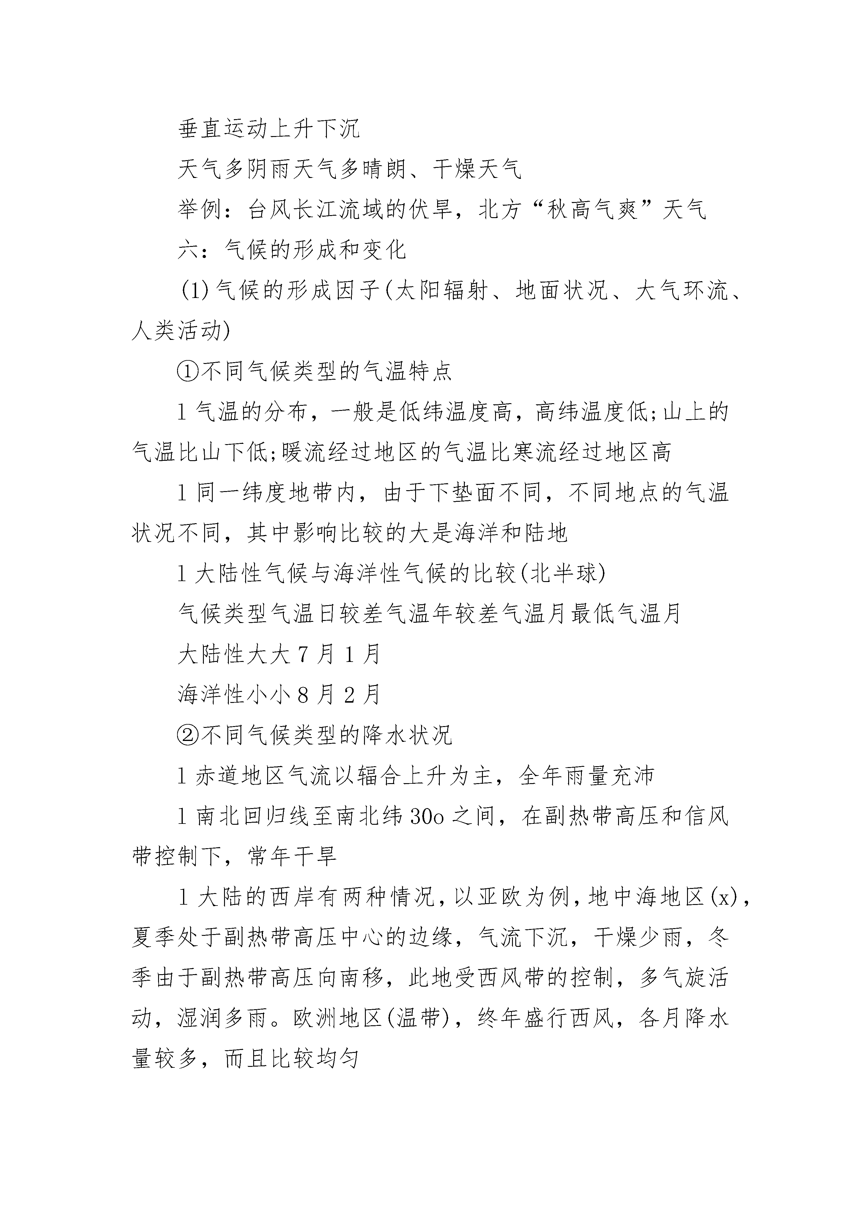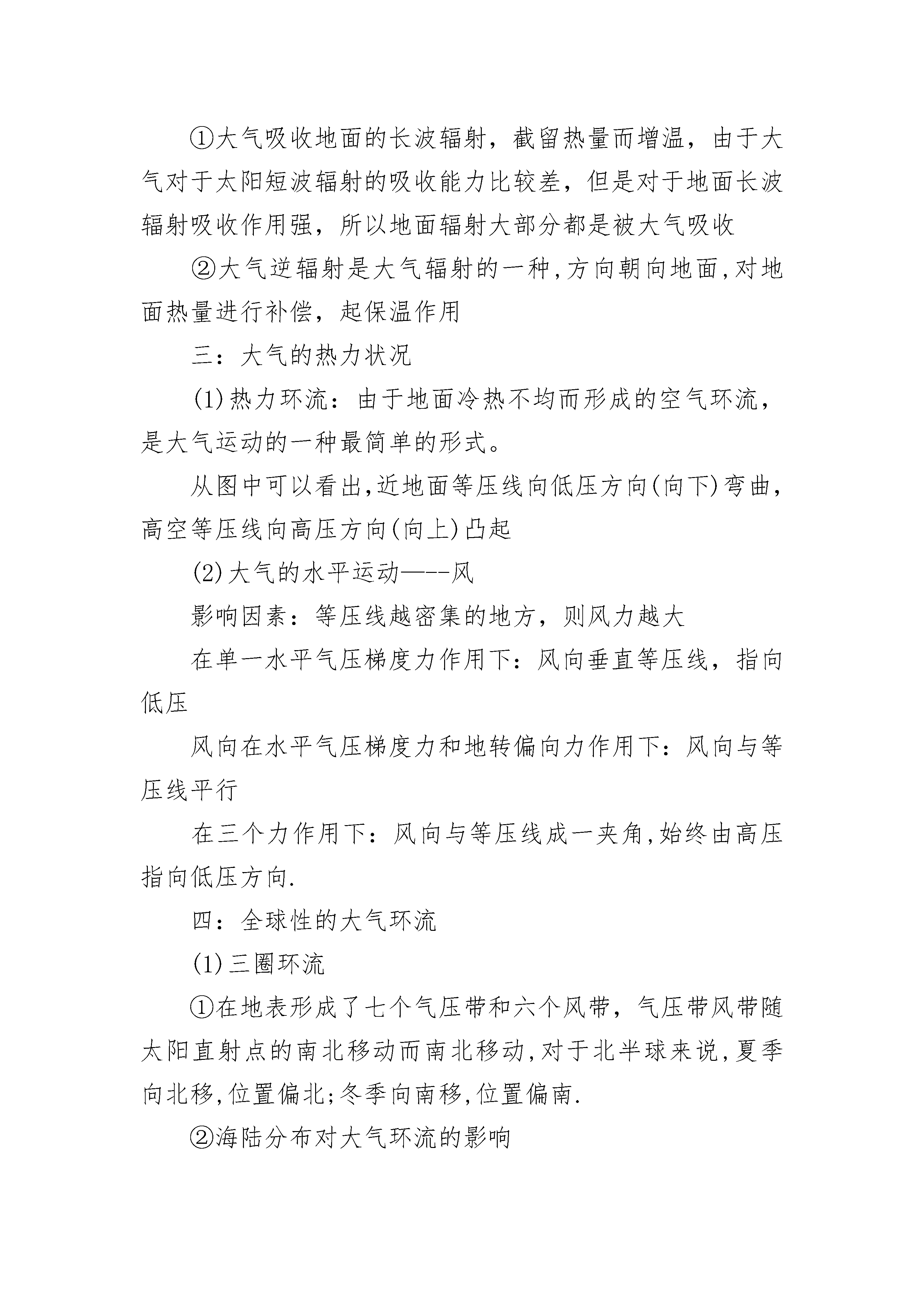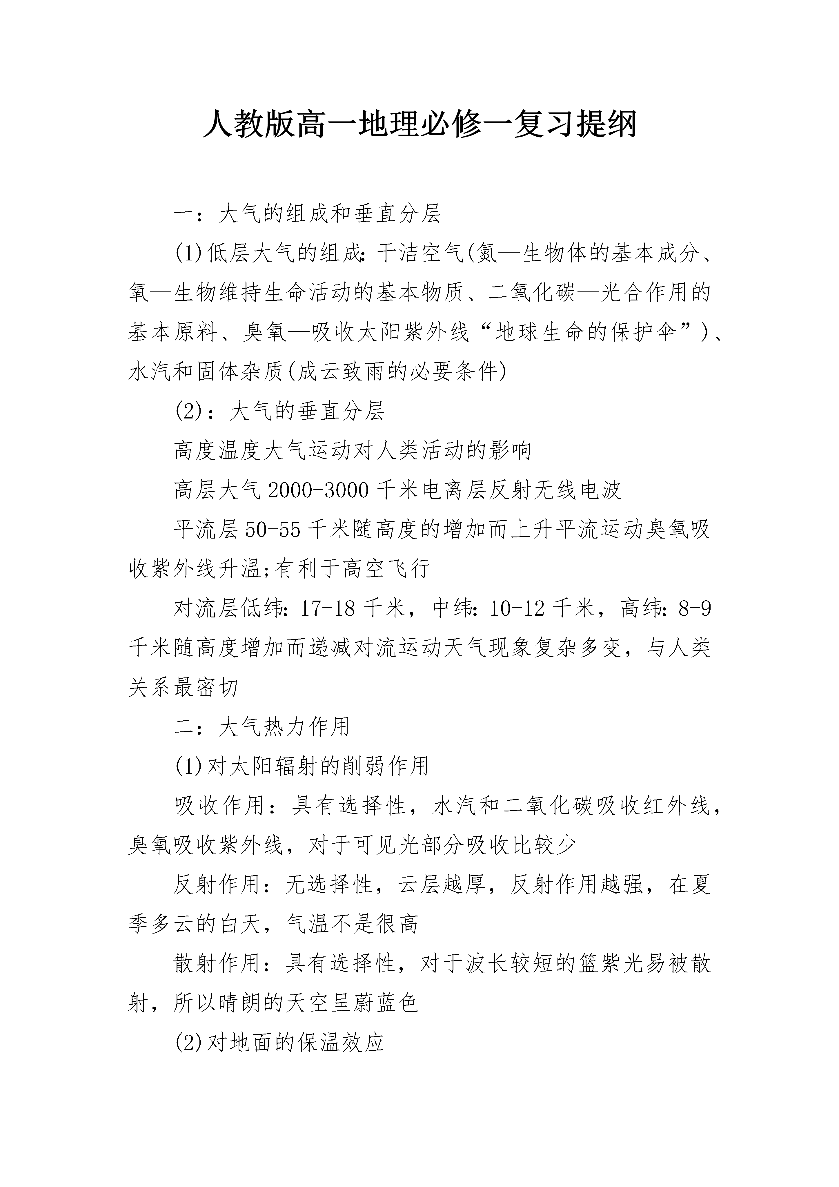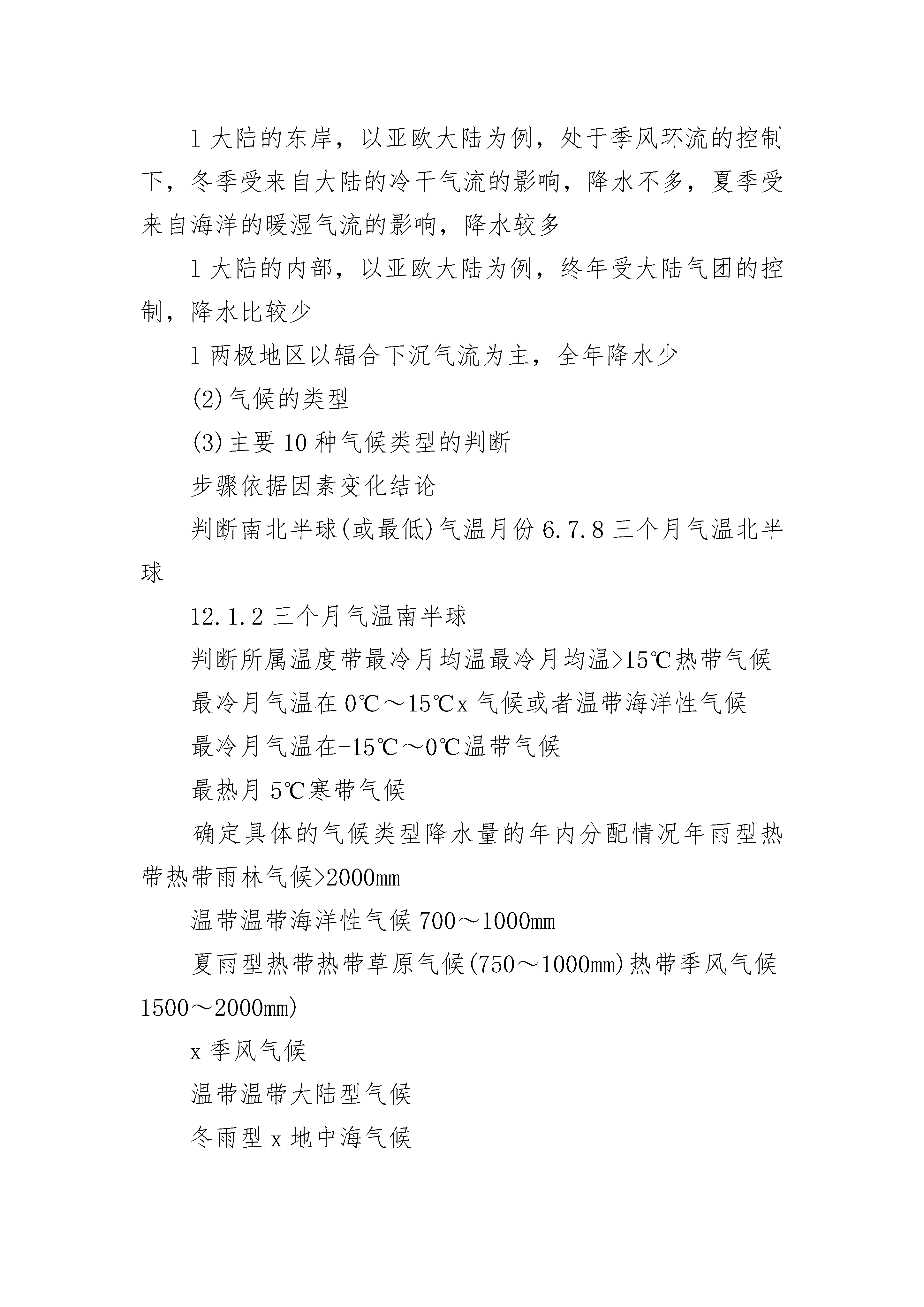 人教版高一地理必修一复习提纲一:大气的组成和垂直分层(1)低层大气的组成:干洁空气(氮—生物体的基本成分、氧—生物维持生命活动的基本物质、二氧化碳—光合作用的基本原料、臭氧—吸收太阳紫外线“地球生命的保护伞”)、水汽和固体杂质(成云致雨的必要条件)(2):大气的垂直分层高度温度大气运动对人类活动的影响高层大气2000-3000千米电离层反射无线电波平流层50-55千米随高度的增加而上升平流运动臭氧吸收紫外线升温;有利于高空飞行对流层低纬:17-18千米,中纬:10-12千米,高纬:8-9千米随高度增加而递减对流运动天气现象复杂多变,与人类关系最密切二:大气热力作用(1)对太阳辐射的削弱作用吸收作用:具有选择性,水汽和二氧化碳吸收红外线,臭氧吸收紫外线,对于可见光部分吸收比较少反射作用:无选择性,云层越厚,反射作用越强,在夏季多云的白天,气温不是很高散射作用:具有选择性,对于波长较短的篮紫光易被散射,所以晴朗的天空呈蔚蓝色(2)对地面的保温效应①大气吸收地面的长波辐射,截留热量而增温,由于大气对于太阳短波辐射的吸收能力比较差,但是对于地面长波辐射吸收作用强,所以地面辐射大部分都是被大气吸收②大气逆辐射是大气辐射的一种,方向朝向地面,对地面热量进行补偿,起保温作用三:大气的热力状况(1)热力环流:由于地面冷热不均而形成的空气环流,是大气运动的一种最简单的形式。从图中可以看出,近地面等压线向低压方向(向下)弯曲,高空等压线向高压方向(向上)凸起(2)大气的水平运动—--风影响因素:等压线越密集的地方,则风力越大在单一水平气压梯度力作用下:风向垂直等压线,指向低压风向在水平气压梯度力和地转偏向力作用下:风向与等压线平行在三个力作用下:风向与等压线成一夹角,始终由高压指向低压方向.四:全球性的大气环流(1)三圈环流①在地表形成了七个气压带和六个风带,气压带风带随太阳直射点的南北移动而南北移动,对于北半球来说,夏季向北移,位置偏北;冬季向南移,位置偏南.②海陆分布对大气环流的影响(2)季风环流地区东亚南亚,东南亚气候类型温带季风气候x季风气候热带季风气候成因海陆热力性质差异海陆热力性质差异,气压带和风带的季节移动风向冬季西北风(亚洲大陆)东北风(亚洲大陆)夏季东南风(太平洋)西南风(印度洋)五:常见的天气系统(1)锋面系统—冷锋和暖锋冷锋暖锋概念冷气团主动向暖气团移动暖气团主动向冷气团移动天气特征过境前单一气团控制,天气晴朗单一气团控制,低温晴朗过境时阴天、雨雪、刮风、降温连续性降水过境后气压升高,气温下降,天气晴朗气温上升,气压下降,天气转好降水的分布降水一般出现在锋后降水一般出现在锋前大气举例:北方夏季暴雨,冬春季大风,寒潮,沙尘暴(2)低压、高压系统—气旋和反气旋(以北半球为例)气旋反气旋气压低气压(中心低,四周高)高气压(中心高,四周低)水平运动四周向中心辐合(北逆南顺)中心向四周辐散(北顺南逆)垂直运动上升下沉天气多阴雨天气多晴朗、干燥天气举例:台风长江流域的伏旱,北方“秋高气爽”天气六:气候的形成和变化(1)气候的形成因子(太阳辐射、地面状况、大气环流、人类活动)①不同气候类型的气温特点l气温的分布,一般是低纬温度高,高纬温度低;山上的气温比山下低;暖流经过地区的气温比寒流经过地区高l同一纬度地带内,由于下垫面不同,不同地点的气温状况不同,其中影响比较的大是海洋和陆地l大陆性气候与海洋性气候的比较(北半球)气候类型气温日较差气温年较差气温月最低气温月大陆性大大7月1月海洋性小小8月2月②不同气候类型的降水状况l赤道地区气流以辐合上升为主,全年雨量充沛l南北回归线至南北纬30o之间,在副热带高压和信风带控制下,常年干旱l大陆的西岸有两种情况,以亚欧为例,地中海地区(x),夏季处于副热带高压中心的边缘,气流下沉,干燥少雨,冬季由于副热带高压向南移,此地受西风带的控制,多气旋活动,湿润多雨。欧洲地区(温带),终年盛行西风,各月降水量较多,而且比较均匀l大陆的东岸,以亚欧大陆为例,处于季风环流的控制下,冬季受来自大陆的冷干气流的影响,降水不多,夏季受来自海洋的暖湿气流的影响,降水较多l大陆的内部,以亚欧大陆为例,终年受大陆气团的控制,降水比较少l两极地区以辐合下沉气流为主,全年降水少(2)气候的类型(3)主要10种气候类型的判断步骤依据因素变化结论判断南北半球(或最低)气温月份6.7.8三个月气温北半球12.1.2三个月气温南半球判断所属温度带最冷月均温最冷月均温>15℃热带气候最冷月气温在0℃~15℃x气候或者温带海洋性气候最冷月气温在-15℃~0℃温带气候最热月5℃寒带气候确定具体的气候类型降水量的年内分配情况年雨型热带热带雨林气候>2000mm温带温带海洋性气候700~1000mm夏雨型热带热带草原气候(750~1000mm