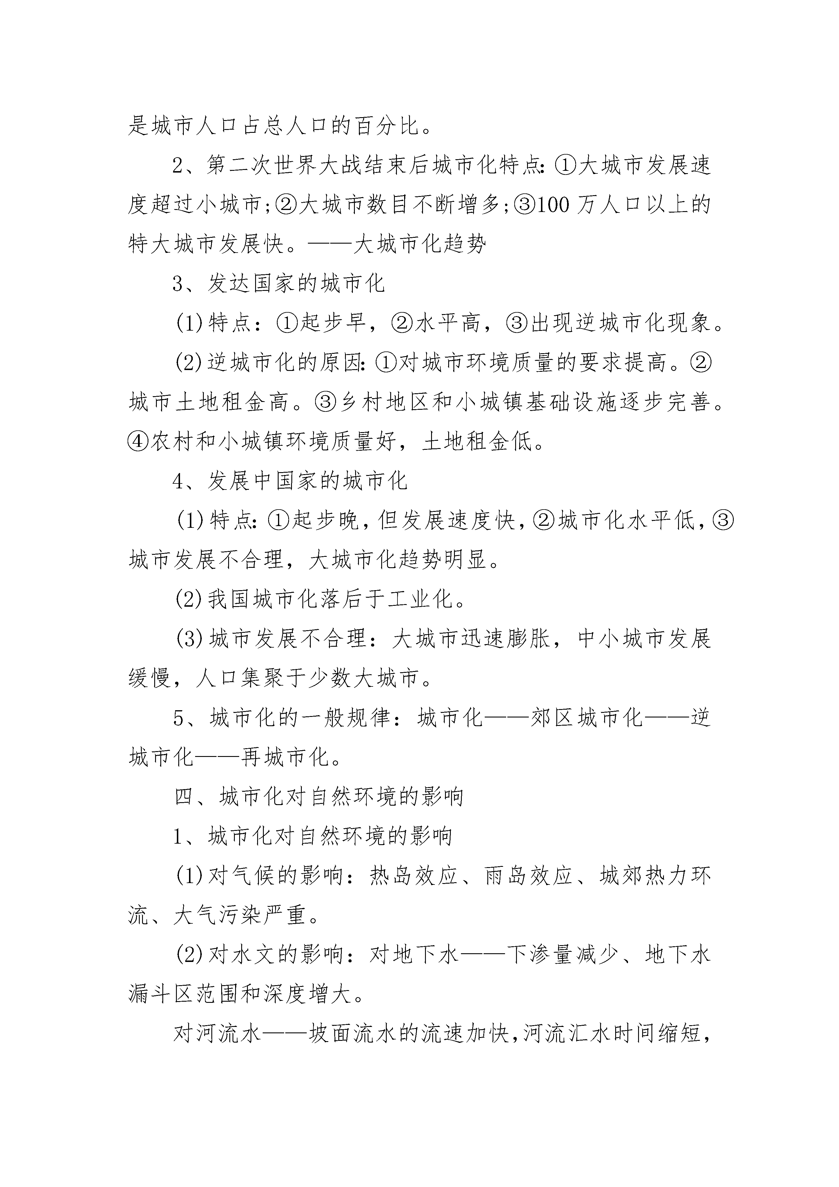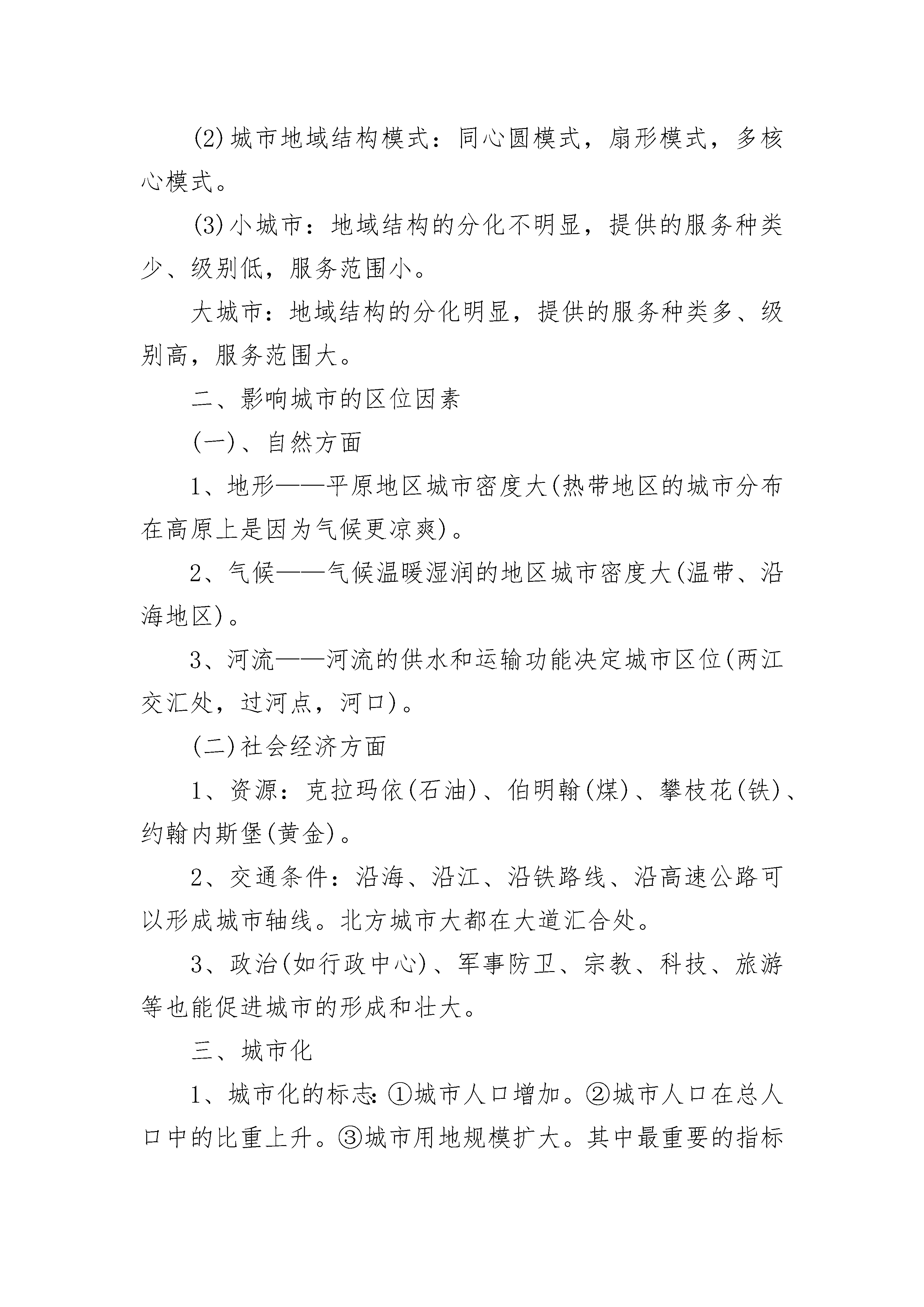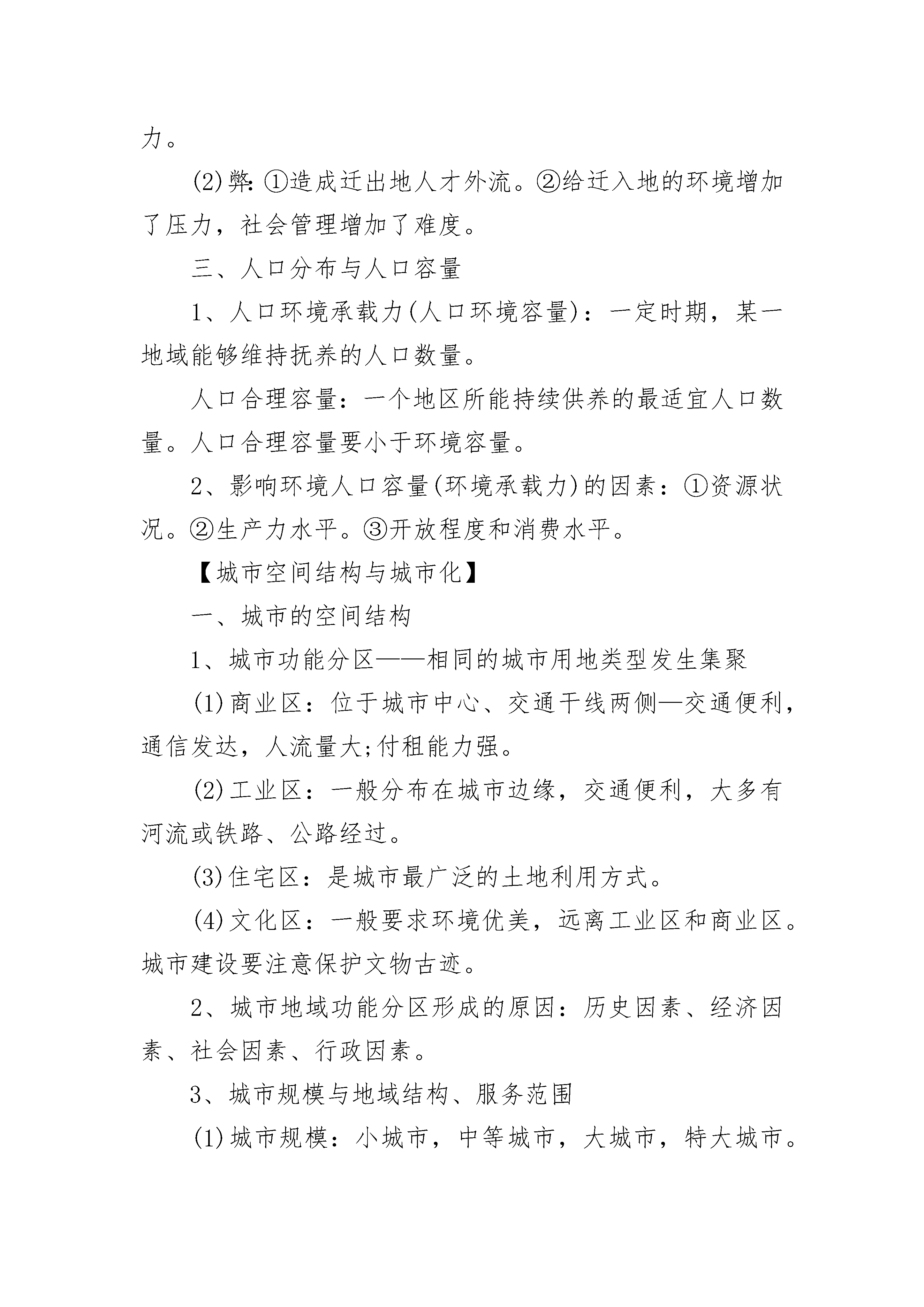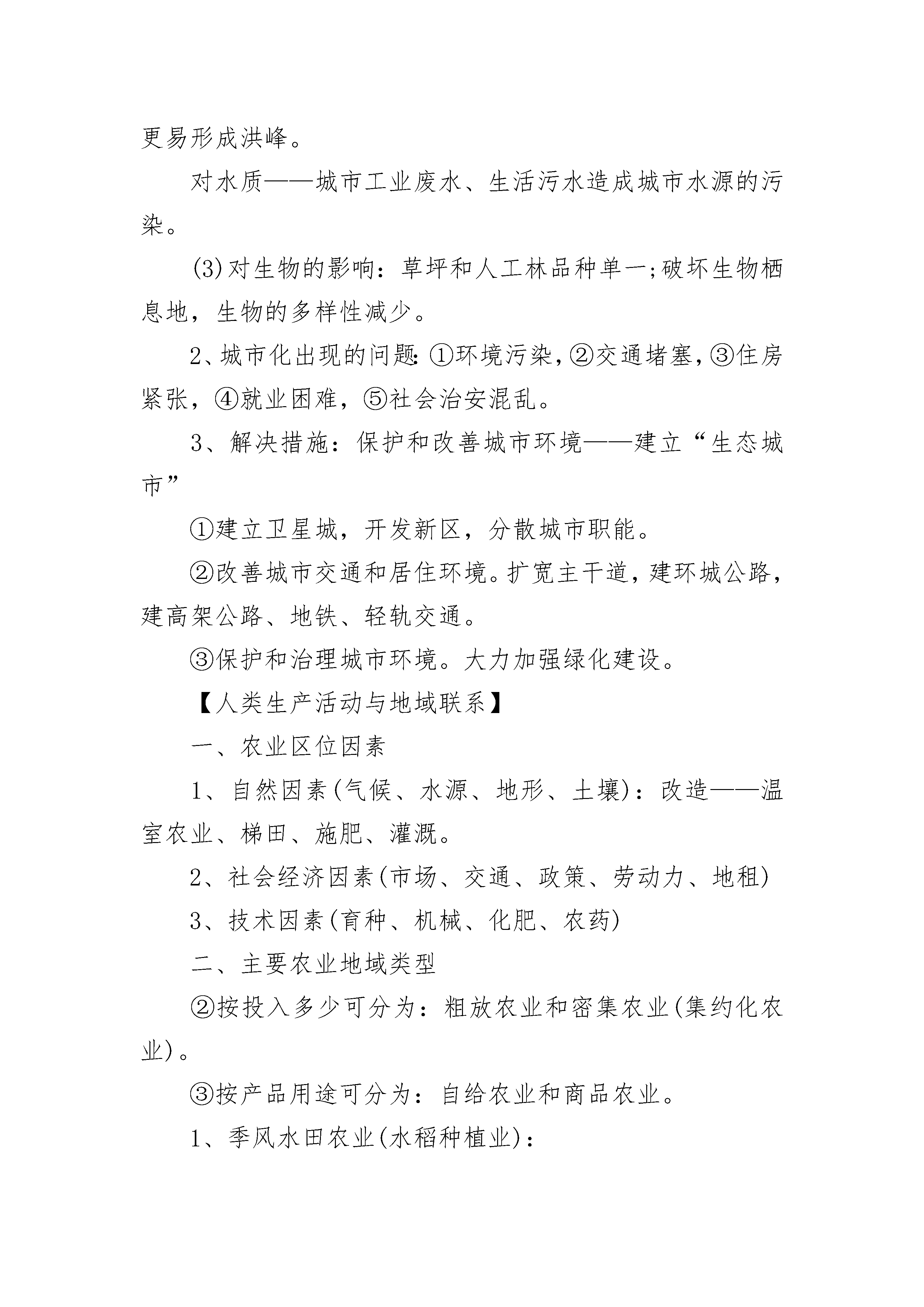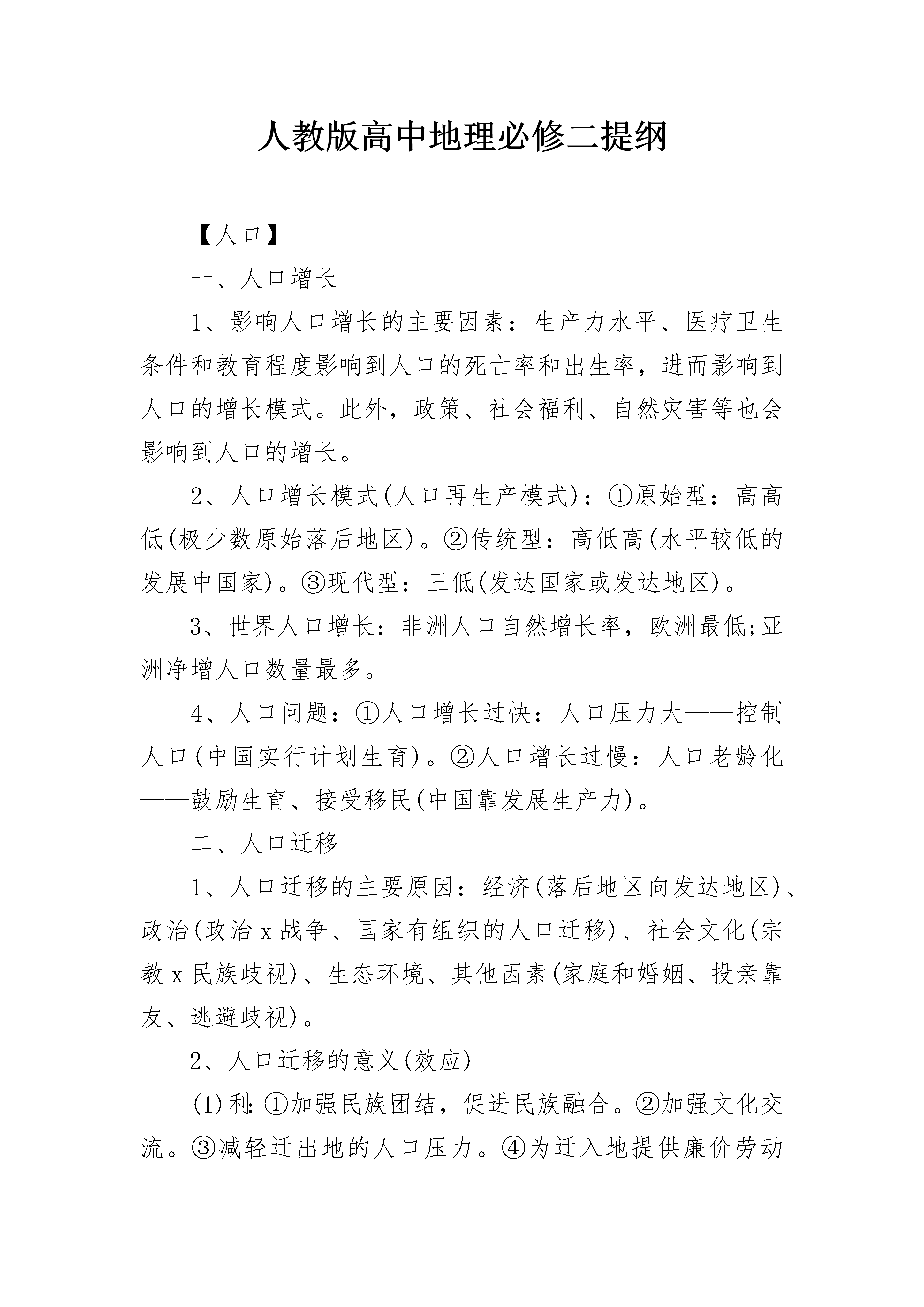 人教版高中地理必修二提纲【人口】一、人口增长1、影响人口增长的主要因素:生产力水平、医疗卫生条件和教育程度影响到人口的死亡率和出生率,进而影响到人口的增长模式。此外,政策、社会福利、自然灾害等也会影响到人口的增长。2、人口增长模式(人口再生产模式):①原始型:高高低(极少数原始落后地区)。②传统型:高低高(水平较低的发展中国家)。③现代型:三低(发达国家或发达地区)。3、世界人口增长:非洲人口自然增长率,欧洲最低;亚洲净增人口数量最多。4、人口问题:①人口增长过快:人口压力大——控制人口(中国实行计划生育)。②人口增长过慢:人口老龄化——鼓励生育、接受移民(中国靠发展生产力)。二、人口迁移1、人口迁移的主要原因:经济(落后地区向发达地区)、政治(政治x战争、国家有组织的人口迁移)、社会文化(宗教x民族歧视)、生态环境、其他因素(家庭和婚姻、投亲靠友、逃避歧视)。2、人口迁移的意义(效应)(1)利:①加强民族团结,促进民族融合。②加强文化交流。③减轻迁出地的人口压力。④为迁入地提供廉价劳动力。(2)弊:①造成迁出地人才外流。②给迁入地的环境增加了压力,社会管理增加了难度。三、人口分布与人口容量1、人口环境承载力(人口环境容量):一定时期,某一地域能够维持抚养的人口数量。人口合理容量:一个地区所能持续供养的最适宜人口数量。人口合理容量要小于环境容量。2、影响环境人口容量(环境承载力)的因素:①资源状况。②生产力水平。③开放程度和消费水平。【城市空间结构与城市化】一、城市的空间结构1、城市功能分区——相同的城市用地类型发生集聚(1)商业区:位于城市中心、交通干线两侧—交通便利,通信发达,人流量大;付租能力强。(2)工业区:一般分布在城市边缘,交通便利,大多有河流或铁路、公路经过。(3)住宅区:是城市最广泛的土地利用方式。(4)文化区:一般要求环境优美,远离工业区和商业区。城市建设要注意保护文物古迹。2、城市地域功能分区形成的原因:历史因素、经济因素、社会因素、行政因素。3、城市规模与地域结构、服务范围(1)城市规模:小城市,中等城市,大城市,特大城市。(2)城市地域结构模式:同心圆模式,扇形模式,多核心模式。(3)小城市:地域结构的分化不明显,提供的服务种类少、级别低,服务范围小。大城市:地域结构的分化明显,提供的服务种类多、级别高,服务范围大。二、影响城市的区位因素(一)、自然方面1、地形——平原地区城市密度大(热带地区的城市分布在高原上是因为气候更凉爽)。2、气候——气候温暖湿润的地区城市密度大(温带、沿海地区)。3、河流——河流的供水和运输功能决定城市区位(两江交汇处,过河点,河口)。(二)社会经济方面1、资源:克拉玛依(石油)、伯明翰(煤)、攀枝花(铁)、约翰内斯堡(黄金)。2、交通条件:沿海、沿江、沿铁路线、沿高速公路可以形成城市轴线。北方城市大都在大道汇合处。3、政治(如行政中心)、军事防卫、宗教、科技、旅游等也能促进城市的形成和壮大。三、城市化1、城市化的标志:①城市人口增加。②城市人口在总人口中的比重上升。③城市用地规模扩大。其中最重要的指标是城市人口占总人口的百分比。2、第二次世界大战结束后城市化特点:①大城市发展速度超过小城市;②大城市数目不断增多;③100万人口以上的特大城市发展快。——大城市化趋势3、发达国家的城市化(1)特点:①起步早,②水平高,③出现逆城市化现象。(2)逆城市化的原因:①对城市环境质量的要求提高。②城市土地租金高。③乡村地区和小城镇基础设施逐步完善。④农村和小城镇环境质量好,土地租金低。4、发展中国家的城市化(1)特点:①起步晚,但发展速度快,②城市化水平低,③城市发展不合理,大城市化趋势明显。(2)我国城市化落后于工业化。(3)城市发展不合理:大城市迅速膨胀,中小城市发展缓慢,人口集聚于少数大城市。5、城市化的一般规律:城市化——郊区城市化——逆城市化——再城市化。四、城市化对自然环境的影响1、城市化对自然环境的影响(1)对气候的影响:热岛效应、雨岛效应、城郊热力环流、大气污染严重。(2)对水文的影响:对地下水——下渗量减少、地下水漏斗区范围和深度增大。对河流水——坡面流水的流速加快,河流汇水时间缩短,更易形成洪峰。对水质——城市工业废水、生活污水造成城市水源的污染。(3)对生物的影响:草坪和人工林品种单一;破坏生物栖息地,生物的多样性减少。2、城市化出现的问题:①环境污染,②交通堵塞,③住房紧张,④就业困难,⑤社会治安混乱。3、解决措施:保护和改善城市环境——建立“生态城市”①建立卫星城,开发新区,分散城市职能。②改善城市交通和居住环境。扩宽主干道,建环城公路,建高架公路、地铁、轻轨交通。③保护和治理城市环境。大力加强绿化建设。【人类生产活动与地域联系】一、农业区位因素1、自然因素