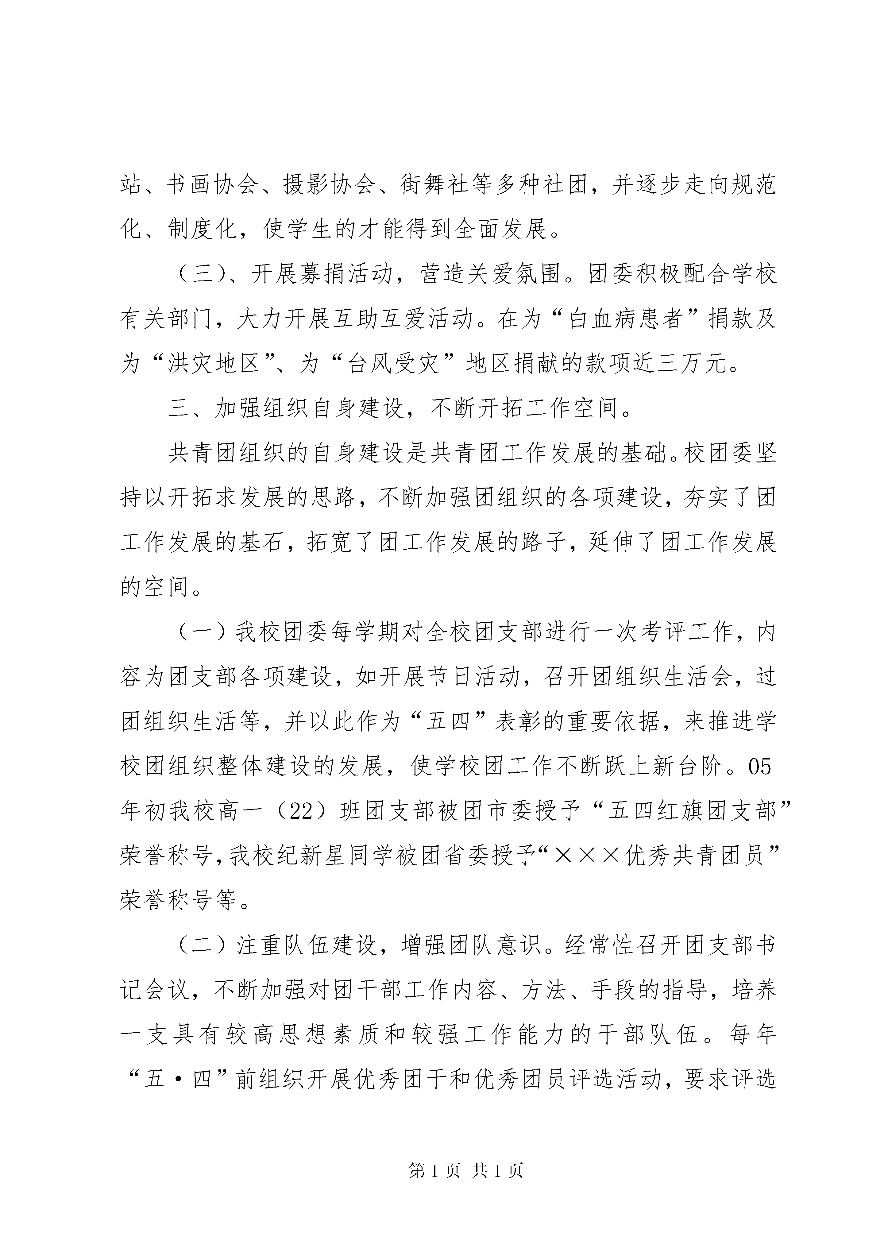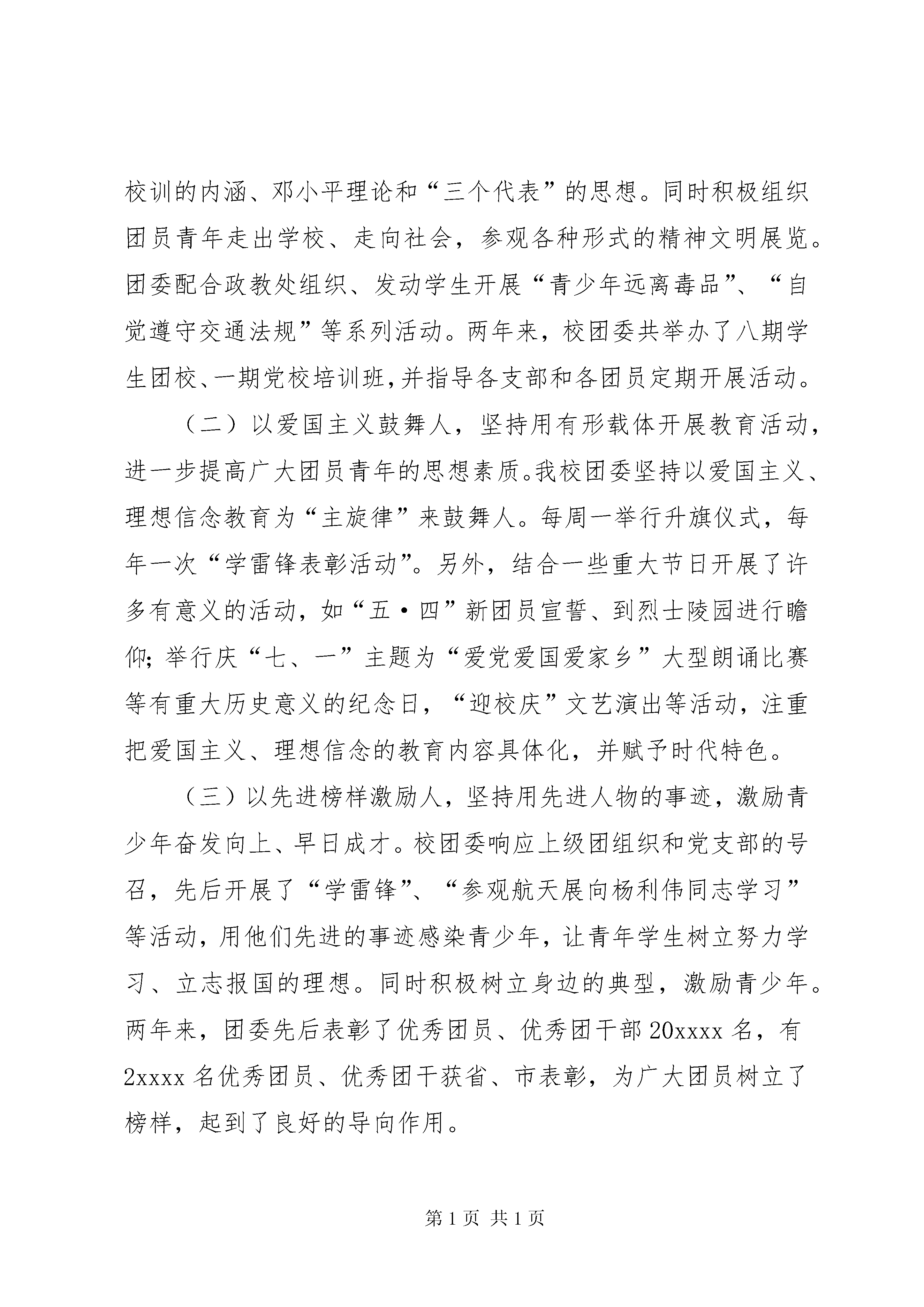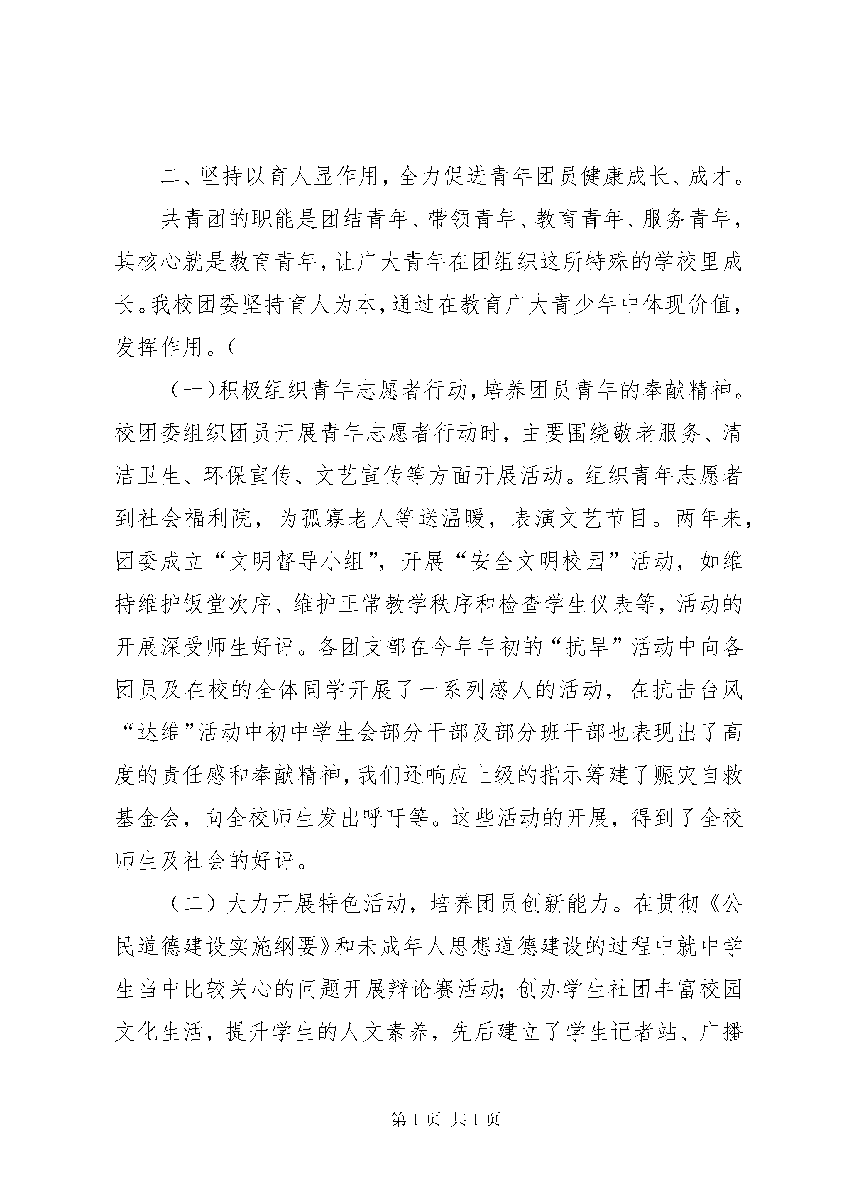 学校共青团团委工作报告与时俱进,团结进取,不断开创我校团工作新局面尊敬的领导、来宾、代表们:大家好。今天,共青团嘉积中学海桂学校第二次团员代表大会胜利召开了,我受学校团委委托向本次大会做工作报告,请代表们审议,并预祝大会取得圆满成功。两年来,我校团委在嘉积中学党总支的直接领导下,在上级团委的关心和指导下,在全体团干、团员及广大师生的支持和努力下,我校团工作不断开拓新局面。我校团委坚持以邓小平理论和“三个代表”重要思想为指导,以党的十六大和团的十四大、十五大精神为指针,紧密围绕当前形势和学校中心工作,深化爱国主义教育,积极推进团的思想建设,组织建设和活动建设,不断加强团员意识教育,着力培养广大团员青年的创新精神和社会实践能力,努力使我校青年团员在学校精神文明建设中充分发挥生力军作用,在争创“一流学校”的过程中发挥了重要作用。这次大会的主要任务是。听取和审议我校共青团第一届委员会的工作报告;讨论和决定我校共青团今后的奋斗目标、工作任务;选举产生第二届团委委员会。第一部分工作回顾与体会两年来,我校团委在校党支部的领导下,在共青团×××委的关心和指导下,以邓小平理论和“三个代表”重要思想为指针,以推进共青团工作现代化为抓手,以培养“四有”新人为目标,大力提倡科学精神和创新精神,团结、带领广大团员青年紧紧围绕学校工作大局,深化思想教育和社会实践活动,不断加强自身建设,积极推进素质教育,我校共青团工作实现了新发展、新超越。一、坚持以作为求地位,着力推进思想建设的发展。人的素质,最重要的是思想道德素质。我校团委对团员进行思想道德教育的过程中,坚持以邓小平理论和“三个”代表重要思想为指针,以校训“厚德、自强、博学、创新”为主要内容,结合《公民道德建设实施纲要》和《关于进一步加强和改进未成年人思想道德建设的若干意见》,组织丰富多彩的活动吸引青年、凝聚青年、教育青年,初步形成了以科学理论武装人、以爱国主义鼓舞人、以仪式教育提高人、以特色活动培养人、以先进榜样激励人的教育模式。通过团组织的努力作为,一方面推进了思想建设的发展,同时也赢得了党组织的重视和支持,从而赢得了团组织应有的地位。(一)以科学理论武装人,坚持用邓小平理论和“三个代表”重要思想武装青年,构筑青年一代的精神支柱。思想素质的提高,科学理论的指导是关键。我校团委主要通过学生团校和学生干校开展活动,通过开展讨论会和小型知识竞赛等形式学习团的知识、校训的内涵、邓小平理论和“三个代表”的思想。同时积极组织团员青年走出学校、走向社会,参观各种形式的精神文明展览。团委配合政教处组织、发动学生开展“青少年远离毒品”、“自觉遵守交通法规”等系列活动。两年来,校团委共举办了八期学生团校、一期党校培训班,并指导各支部和各团员定期开展活动。(二)以爱国主义鼓舞人,坚持用有形载体开展教育活动,进一步提高广大团员青年的思想素质。我校团委坚持以爱国主义、理想信念教育为“主旋律”来鼓舞人。每周一举行升旗仪式,每年一次“学雷锋表彰活动”。另外,结合一些重大节日开展了许多有意义的活动,如“五·四”新团员宣誓、到烈士陵园进行瞻仰;举行庆“七、一”主题为“爱党爱国爱家乡”大型朗诵比赛等有重大历史意义的纪念日,“迎校庆”文艺演出等活动,注重把爱国主义、理想信念的教育内容具体化,并赋予时代特色。(三)以先进榜样激励人,坚持用先进人物的事迹,激励青少年奋发向上、早日成才。校团委响应上级团组织和党支部的号召,先后开展了“学雷锋”、“参观航天展向杨利伟同志学习”等活动,用他们先进的事迹感染青少年,让青年学生树立努力学习、立志报国的理想。同时积极树立身边的典型,激励青少年。两年来,团委先后表彰了优秀团员、优秀团干部20xxxx名,有2xxxx名优秀团员、优秀团干获省、市表彰,为广大团员树立了榜样,起到了良好的导向作用。二、坚持以育人显作用,全力促进青年团员健康成长、成才。共青团的职能是团结青年、带领青年、教育青年、服务青年,其核心就是教育青年,让广大青年在团组织这所特殊的学校里成长。我校团委坚持育人为本,通过在教育广大青少年中体现价值,发挥作用。((一)积极组织青年志愿者行动,培养团员青年的奉献精神。校团委组织团员开展青年志愿者行动时,主要围绕敬老服务、清洁卫生、环保宣传、文艺宣传等方面开展活动。组织青年志愿者到社会福利院,为孤寡老人等送温暖,表演文艺节目。两年来,团委成立“文明督导小组”,开展“安全文明校园”活动,如维持维护饭堂次序、维护正常教学秩序和检查学生仪表等,活动的开展深受师生好评。各团支部在今年年初的“抗旱”活动中向各团员及在校的全体同学开展了一系列感人的活动,在抗击台风“达维”活动中初中学生会部分干部及部分班干部也表现出了高度的责任感和奉献精神,我们还响应上级的指示筹建了赈灾自救基金会,向全校