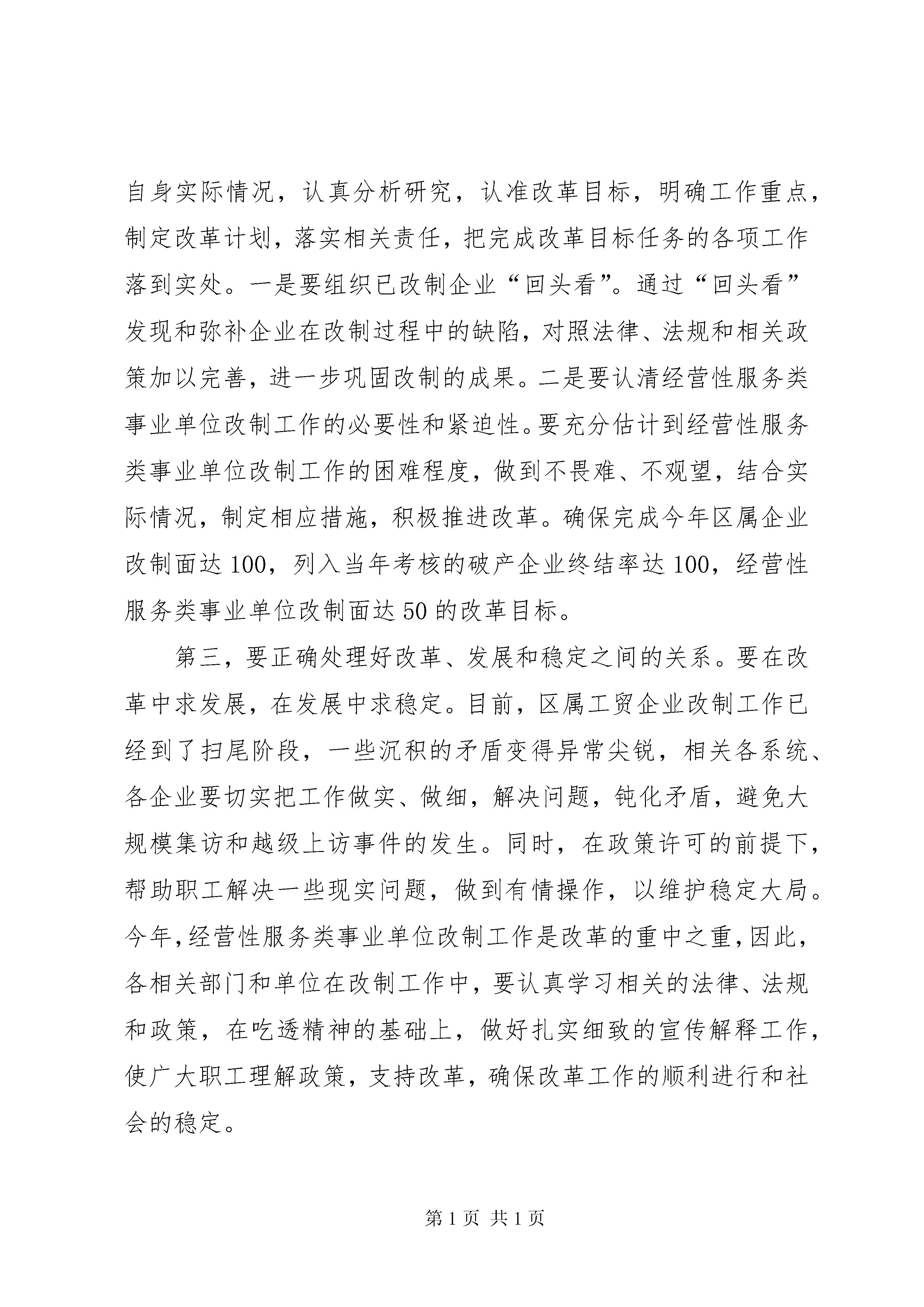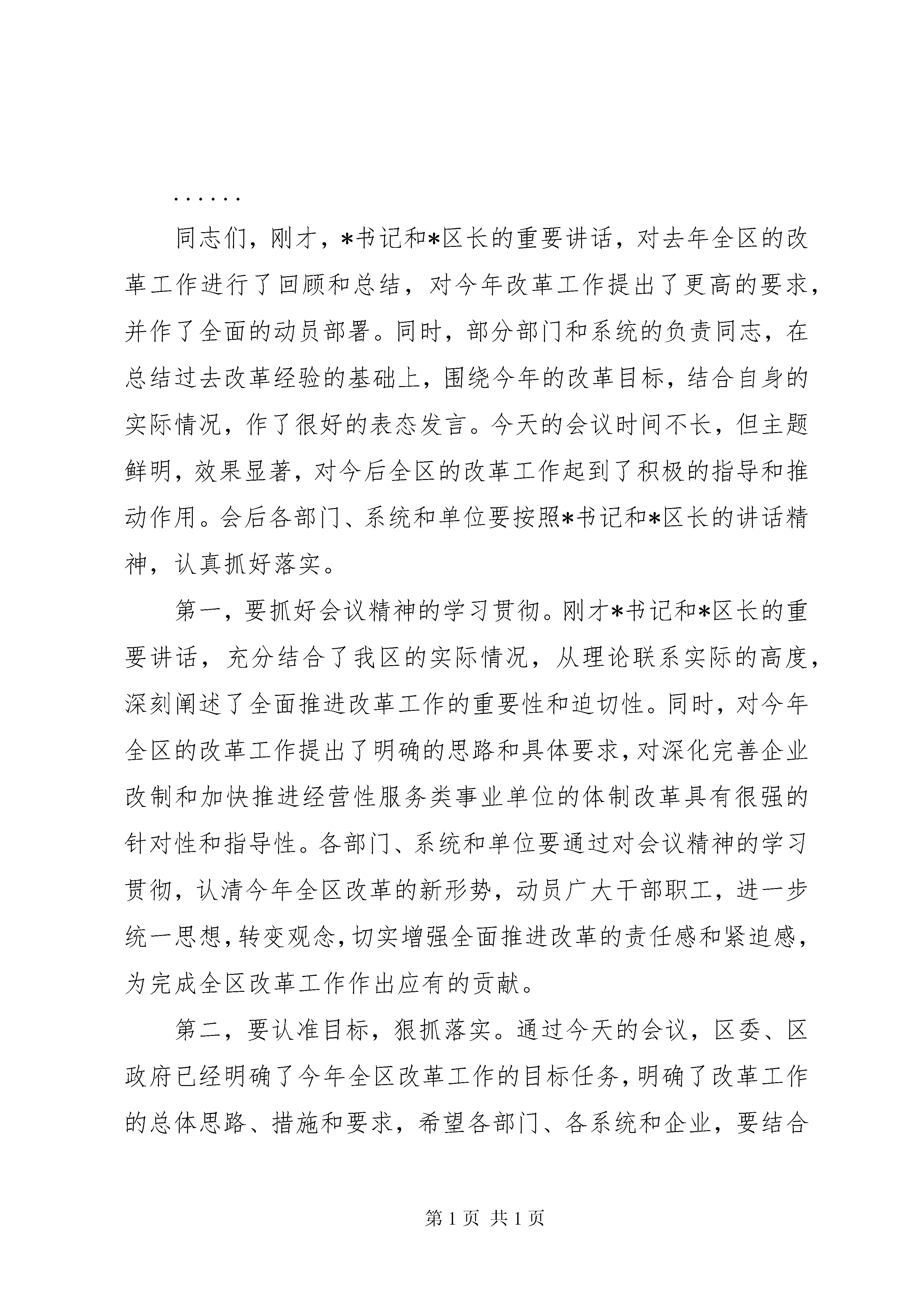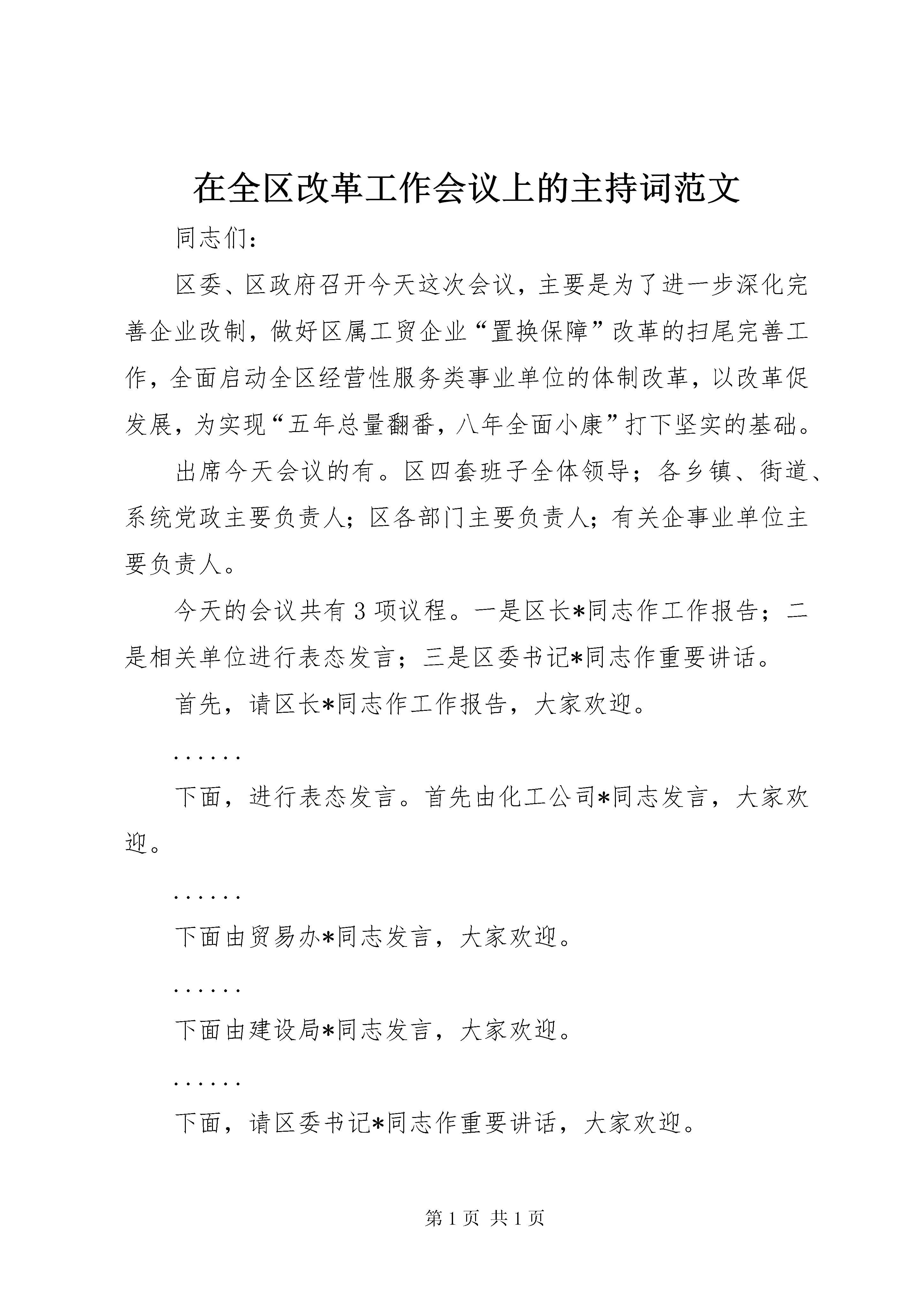 在全区改革工作会议上的主持词范文同志们:区委、区政府召开今天这次会议,主要是为了进一步深化完善企业改制,做好区属工贸企业“置换保障”改革的扫尾完善工作,全面启动全区经营性服务类事业单位的体制改革,以改革促发展,为实现“五年总量翻番,八年全面小康”打下坚实的基础。出席今天会议的有。区四套班子全体领导;各乡镇、街道、系统党政主要负责人;区各部门主要负责人;有关企事业单位主要负责人。今天的会议共有3项议程。一是区长*同志作工作报告;二是相关单位进行表态发言;三是区委书记*同志作重要讲话。首先,请区长*同志作工作报告,大家欢迎。......下面,进行表态发言。首先由化工公司*同志发言,大家欢迎。......下面由贸易办*同志发言,大家欢迎。......下面由建设局*同志发言,大家欢迎。......下面,请区委书记*同志作重要讲话,大家欢迎。......同志们,刚才,*书记和*区长的重要讲话,对去年全区的改革工作进行了回顾和总结,对今年改革工作提出了更高的要求,并作了全面的动员部署。同时,部分部门和系统的负责同志,在总结过去改革经验的基础上,围绕今年的改革目标,结合自身的实际情况,作了很好的表态发言。今天的会议时间不长,但主题鲜明,效果显著,对今后全区的改革工作起到了积极的指导和推动作用。会后各部门、系统和单位要按照*书记和*区长的讲话精神,认真抓好落实。第一,要抓好会议精神的学习贯彻。刚才*书记和*区长的重要讲话,充分结合了我区的实际情况,从理论联系实际的高度,深刻阐述了全面推进改革工作的重要性和迫切性。同时,对今年全区的改革工作提出了明确的思路和具体要求,对深化完善企业改制和加快推进经营性服务类事业单位的体制改革具有很强的针对性和指导性。各部门、系统和单位要通过对会议精神的学习贯彻,认清今年全区改革的新形势,动员广大干部职工,进一步统一思想,转变观念,切实增强全面推进改革的责任感和紧迫感,为完成全区改革工作作出应有的贡献。第二,要认准目标,狠抓落实。通过今天的会议,区委、区政府已经明确了今年全区改革工作的目标任务,明确了改革工作的总体思路、措施和要求,希望各部门、各系统和企业,要结合自身实际情况,认真分析研究,认准改革目标,明确工作重点,制定改革计划,落实相关责任,把完成改革目标任务的各项工作落到实处。一是要组织已改制企业“回头看”。通过“回头看”发现和弥补企业在改制过程中的缺陷,对照法律、法规和相关政策加以完善,进一步巩固改制的成果。二是要认清经营性服务类事业单位改制工作的必要性和紧迫性。要充分估计到经营性服务类事业单位改制工作的困难程度,做到不畏难、不观望,结合实际情况,制定相应措施,积极推进改革。确保完成今年区属企业改制面达100,列入当年考核的破产企业终结率达100,经营性服务类事业单位改制面达50的改革目标。第三,要正确处理好改革、发展和稳定之间的关系。要在改革中求发展,在发展中求稳定。目前,区属工贸企业改制工作已经到了扫尾阶段,一些沉积的矛盾变得异常尖锐,相关各系统、各企业要切实把工作做实、做细,解决问题,钝化矛盾,避免大规模集访和越级上访事件的发生。同时,在政策许可的前提下,帮助职工解决一些现实问题,做到有情操作,以维护稳定大局。今年,经营性服务类事业单位改制工作是改革的重中之重,因此,各相关部门和单位在改制工作中,要认真学习相关的法律、法规和政策,在吃透精神的基础上,做好扎实细致的宣传解释工作,使广大职工理解政策,支持改革,确保改革工作的顺利进行和社会的稳定。同志们,今年全区改革工作又迎来了新的挑战,让我们在区委、区政府的领导下,进一步解放思想,与时俱进,不畏困难,扎实工作,为进一步深化完善企业改制贡献自己的力量。