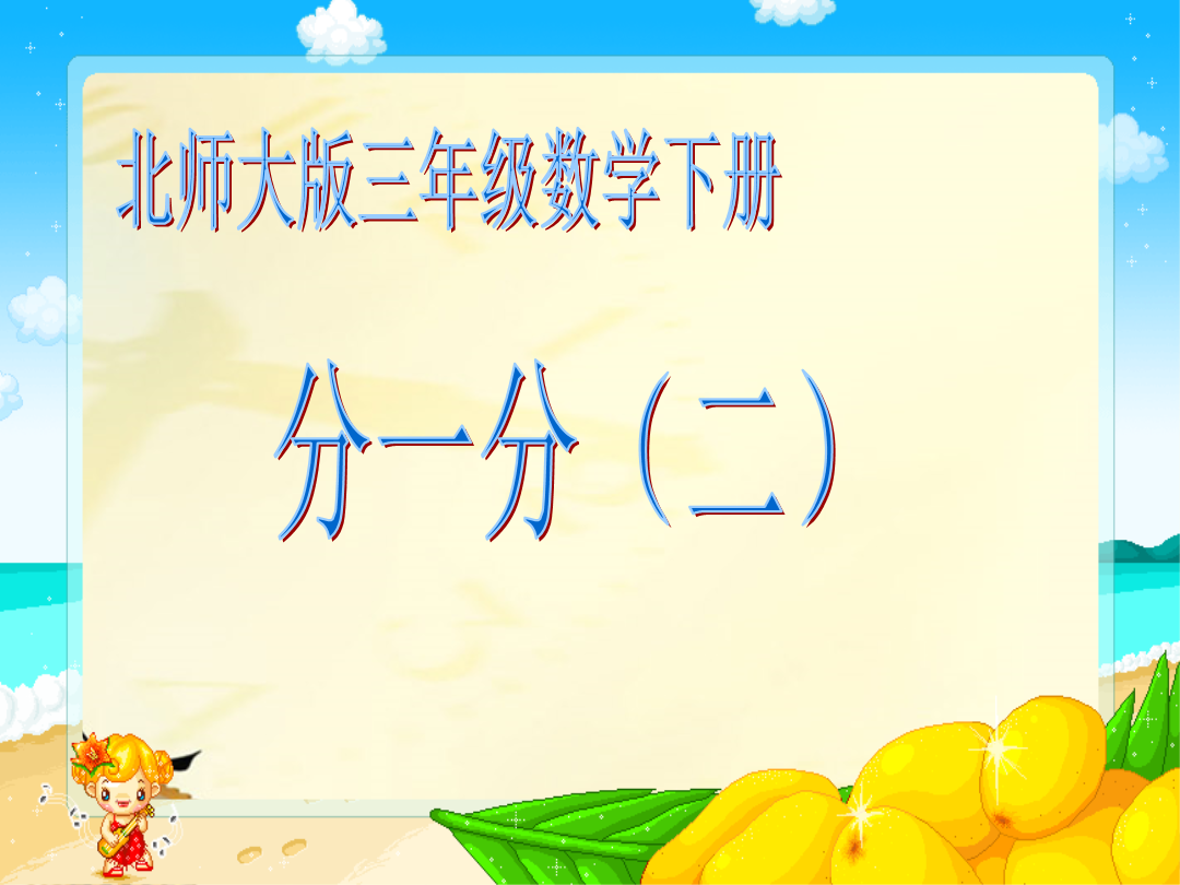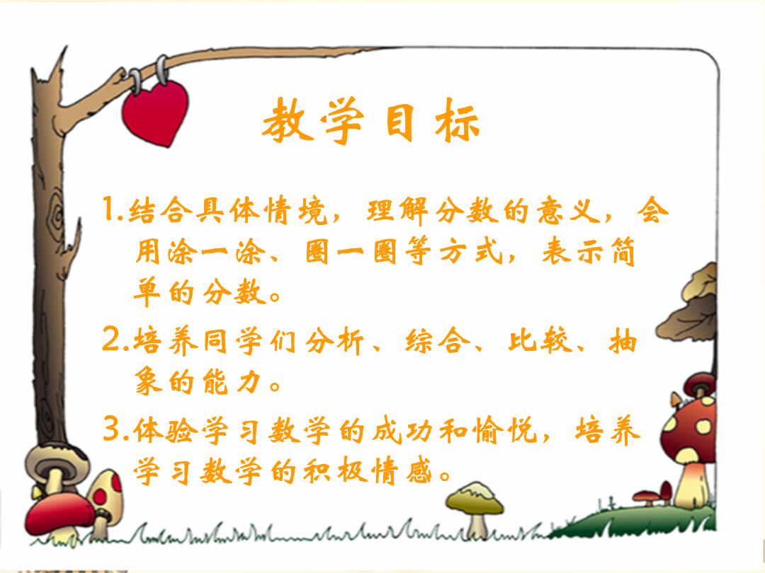分一分(二)教学目标想一想这里的涂色部分都是整个图形的。折一折(将正方形平均分成4份)。折一折(将正方形平均分成4份)。折一折(将正方形平均分成4份)。折一折(将正方形平均分成4份)。折一折(将正方形平均分成4份)。折一折(将正方形平均分成4份)。说一说:将一个五角星平均分成5份,其中的三份,就叫五分之三。将一个图形平均分成6份,其中的5份,就叫六分之五。试着用分数表示下面各图的涂色部分,并读一读。2.按分数把下面各图形涂上颜色。3.用下面的分数表示阴影对吗?对的画“”,错的画“”。4.下图中有,,,。本课总结