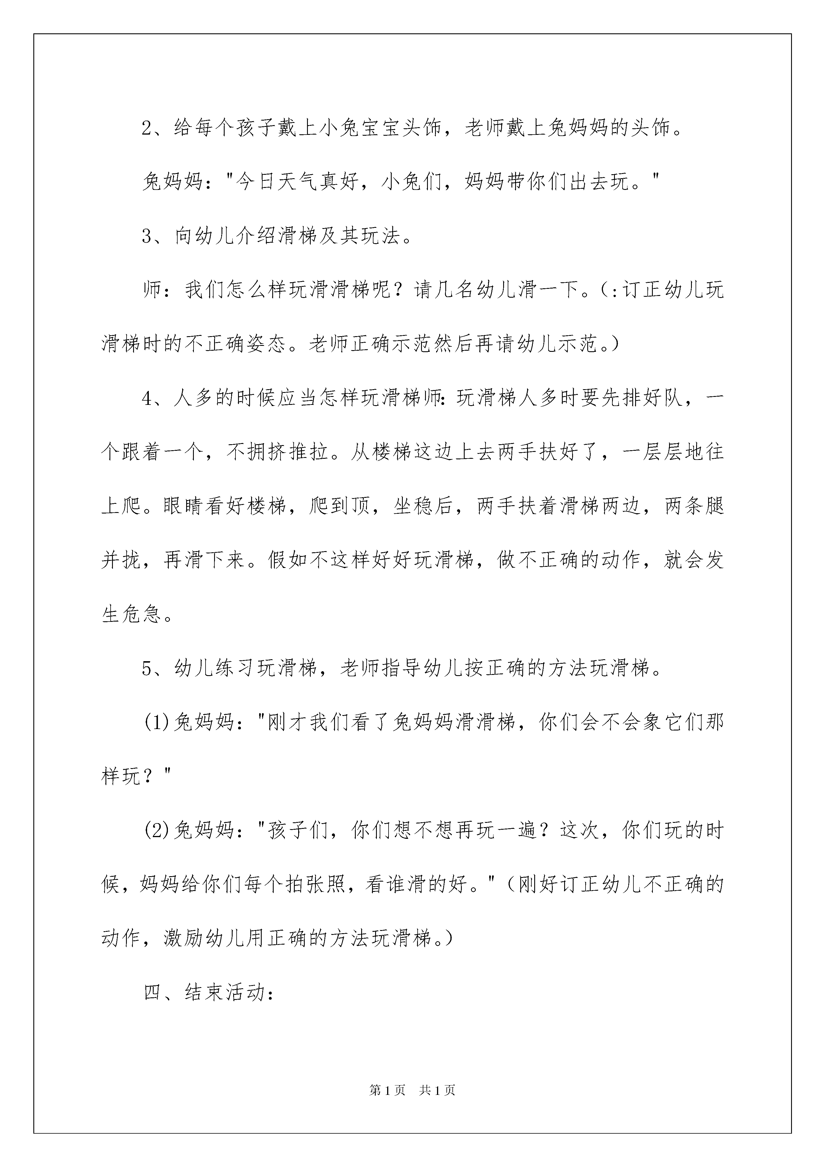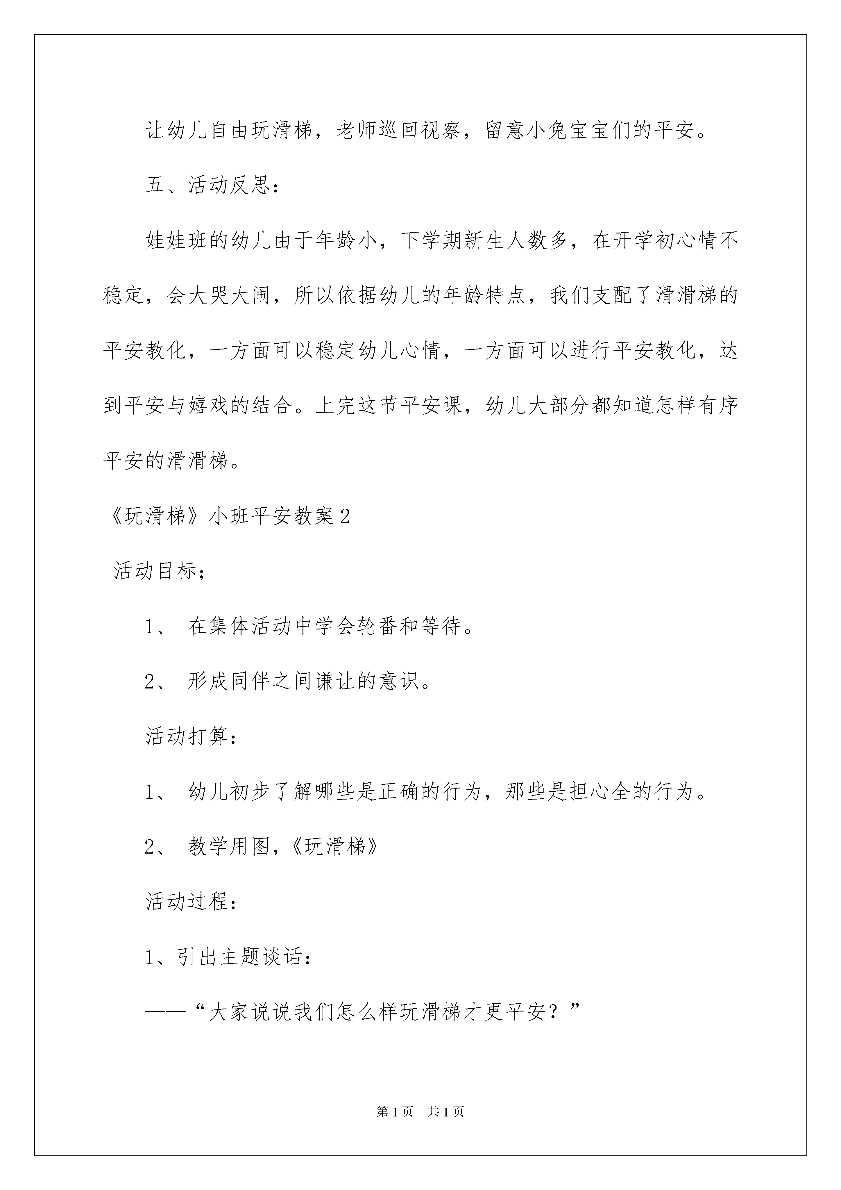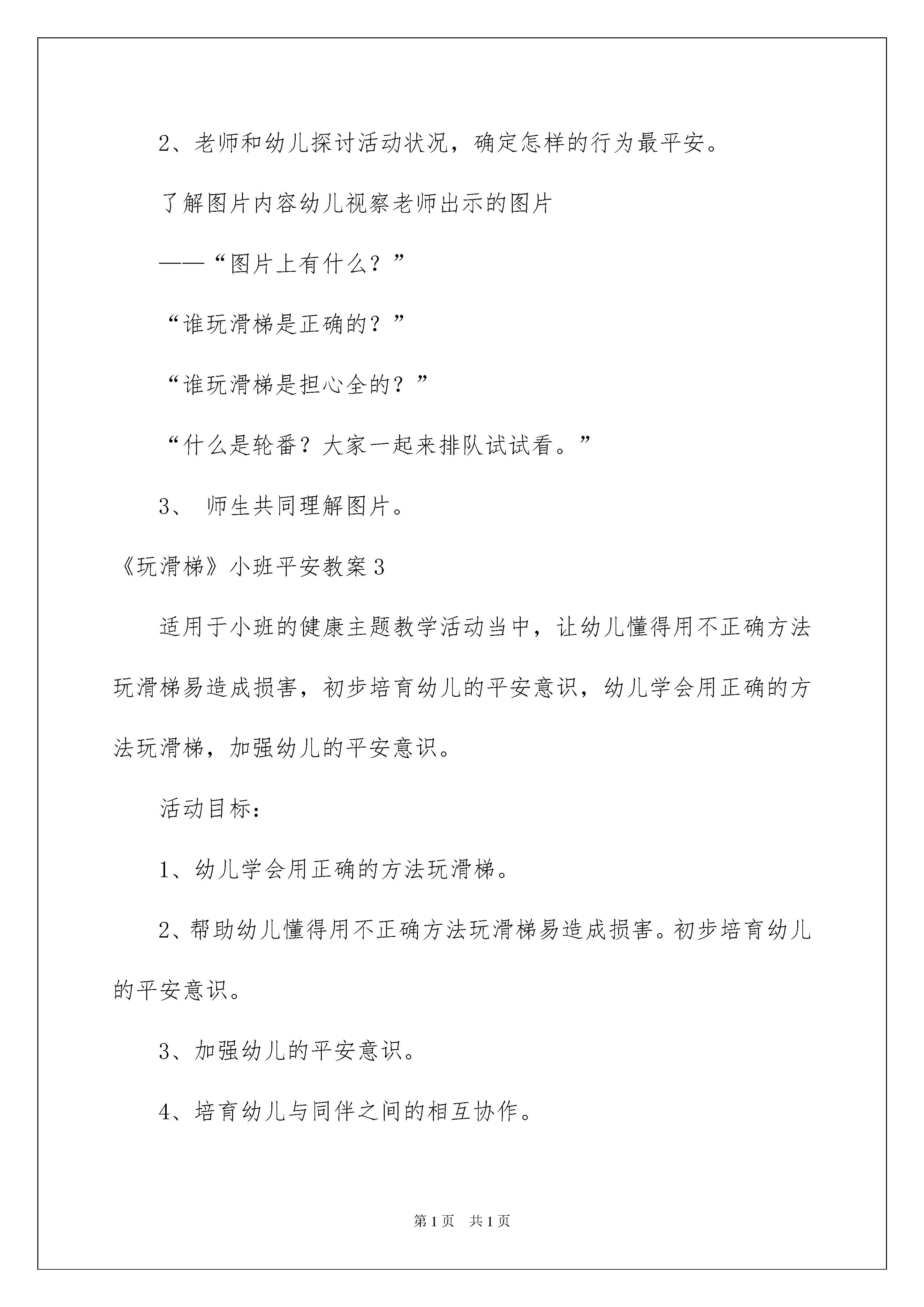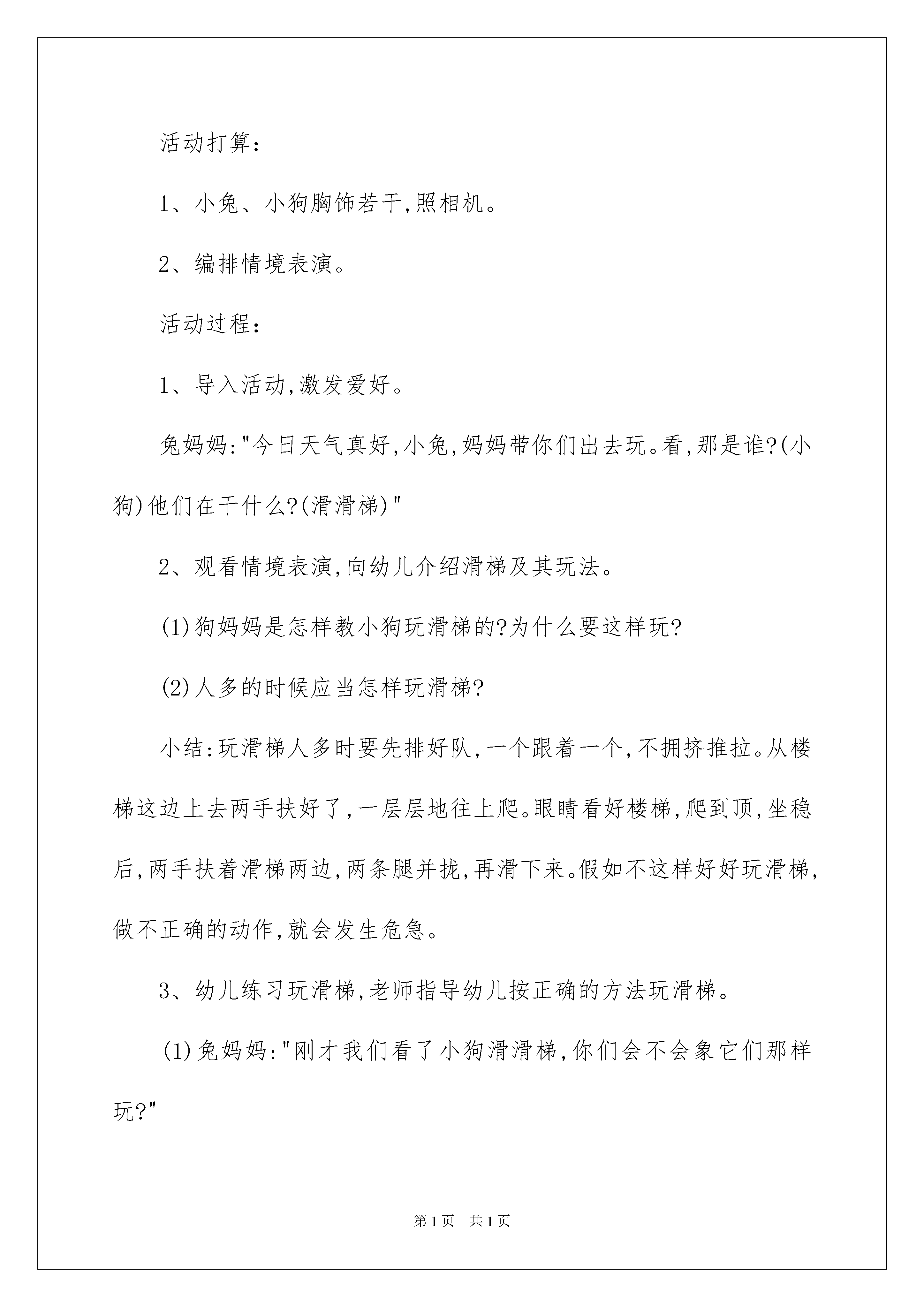 2022《玩滑梯》小班安全教案《玩滑梯》小班平安教案作为一名无私奉献的老师,就有可能用到教案,编写教案助于积累教学阅历,不断提高教学质量。教案应当怎么写才好呢?下面是我帮大家整理的《玩滑梯》小班平安教案,供大家参考借鉴,希望可以帮助到有须要的挚友。《玩滑梯》小班平安教案1一、活动目标:1.幼儿学会用正确的方法玩滑梯。2.帮助幼儿懂得用不正确方法玩滑梯易造成损害。初步培育幼儿的平安意识。活动重难点:幼儿学会正确的玩滑滑梯,培育幼儿的平安意识。二、活动打算:1.小兔头饰若干,照相机。三、活动过程:1、谈话方式引出主题师:宝宝们都喜爱滑滑梯吧!2、给每个孩子戴上小兔宝宝头饰,老师戴上兔妈妈的头饰。兔妈妈:"今日天气真好,小兔们,妈妈带你们出去玩。"3、向幼儿介绍滑梯及其玩法。师:我们怎么样玩滑滑梯呢?请几名幼儿滑一下。(:订正幼儿玩滑梯时的不正确姿态。老师正确示范然后再请幼儿示范。)4、人多的时候应当怎样玩滑梯师:玩滑梯人多时要先排好队,一个跟着一个,不拥挤推拉。从楼梯这边上去两手扶好了,一层层地往上爬。眼睛看好楼梯,爬到顶,坐稳后,两手扶着滑梯两边,两条腿并拢,再滑下来。假如不这样好好玩滑梯,做不正确的动作,就会发生危急。5、幼儿练习玩滑梯,老师指导幼儿按正确的方法玩滑梯。(1)兔妈妈:"刚才我们看了兔妈妈滑滑梯,你们会不会象它们那样玩?"(2)兔妈妈:"孩子们,你们想不想再玩一遍?这次,你们玩的时候,妈妈给你们每个拍张照,看谁滑的好。"(刚好订正幼儿不正确的动作,激励幼儿用正确的方法玩滑梯。)四、结束活动:让幼儿自由玩滑梯,老师巡回视察,留意小兔宝宝们的平安。五、活动反思:娃娃班的幼儿由于年龄小,下学期新生人数多,在开学初心情不稳定,会大哭大闹,所以依据幼儿的年龄特点,我们支配了滑滑梯的平安教化,一方面可以稳定幼儿心情,一方面可以进行平安教化,达到平安与嬉戏的结合。上完这节平安课,幼儿大部分都知道怎样有序平安的滑滑梯。《玩滑梯》小班平安教案2活动目标;1、在集体活动中学会轮番和等待。2、形成同伴之间谦让的意识。活动打算:1、幼儿初步了解哪些是正确的行为,那些是担心全的行为。2、教学用图,《玩滑梯》活动过程:1、引出主题谈话:——“大家说说我们怎么样玩滑梯才更平安?”2、老师和幼儿探讨活动状况,确定怎样的行为最平安。了解图片内容幼儿视察老师出示的图片——“图片上有什么?”“谁玩滑梯是正确的?”“谁玩滑梯是担心全的?”“什么是轮番?大家一起来排队试试看。”3、师生共同理解图片。《玩滑梯》小班平安教案3适用于小班的健康主题教学活动当中,让幼儿懂得用不正确方法玩滑梯易造成损害,初步培育幼儿的平安意识,幼儿学会用正确的方法玩滑梯,加强幼儿的平安意识。活动目标:1、幼儿学会用正确的方法玩滑梯。2、帮助幼儿懂得用不正确方法玩滑梯易造成损害。初步培育幼儿的平安意识。3、加强幼儿的平安意识。4、培育幼儿与同伴之间的相互协作。活动打算:1、小兔、小狗胸饰若干,照相机。2、编排情境表演。活动过程:1、导入活动,激发爱好。兔妈妈:"今日天气真好,小兔,妈妈带你们出去玩。看,那是谁?(小狗)他们在干什么?(滑滑梯)"2、观看情境表演,向幼儿介绍滑梯及其玩法。(1)狗妈妈是怎样教小狗玩滑梯的?为什么要这样玩?(2)人多的时候应当怎样玩滑梯?小结:玩滑梯人多时要先排好队,一个跟着一个,不拥挤推拉。从楼梯这边上去两手扶好了,一层层地往上爬。眼睛看好楼梯,爬到顶,坐稳后,两手扶着滑梯两边,两条腿并拢,再滑下来。假如不这样好好玩滑梯,做不正确的动作,就会发生危急。3、幼儿练习玩滑梯,老师指导幼儿按正确的方法玩滑梯。(1)兔妈妈:"刚才我们看了小狗滑滑梯,你们会不会象它们那样玩?"(2)兔妈妈:"孩子们,你们想不想再玩一遍?这次,你们玩的时候,妈妈给你们每个拍张照,看谁滑的好。"(刚好订正幼儿不正确的动作,激励幼儿用正确的方法玩滑梯。)教学反思:鉴于幼儿园小班幼儿以直觉形象思维占优势,所以在现场边玩边学是最好的方法。今日的平安教化活动,我和孩子们围坐在滑滑梯旁边的草坪上。我有意找了平常较顽皮的XX和XX分别示范走楼梯和坐着往下滑的动作。孩子们在同伴的示范下,知道了正确的玩滑梯的方法:从楼梯上走上去,人多的时候不推也不挤,一个一个来,然后坐下双手扶住,才能往下滑。在活动的过程中,我们还用照相机有针对性的拍了一些行为,有对的、也错的。在活动小结的时候,用照片直观的再现活动,先请孩子们进行辨别,然后告知孩子们那些行为是正确的、平安的,要学习;那些是错误的、有危急的,不能学习。较好的完成了教学目标,通过今日的活动,信任