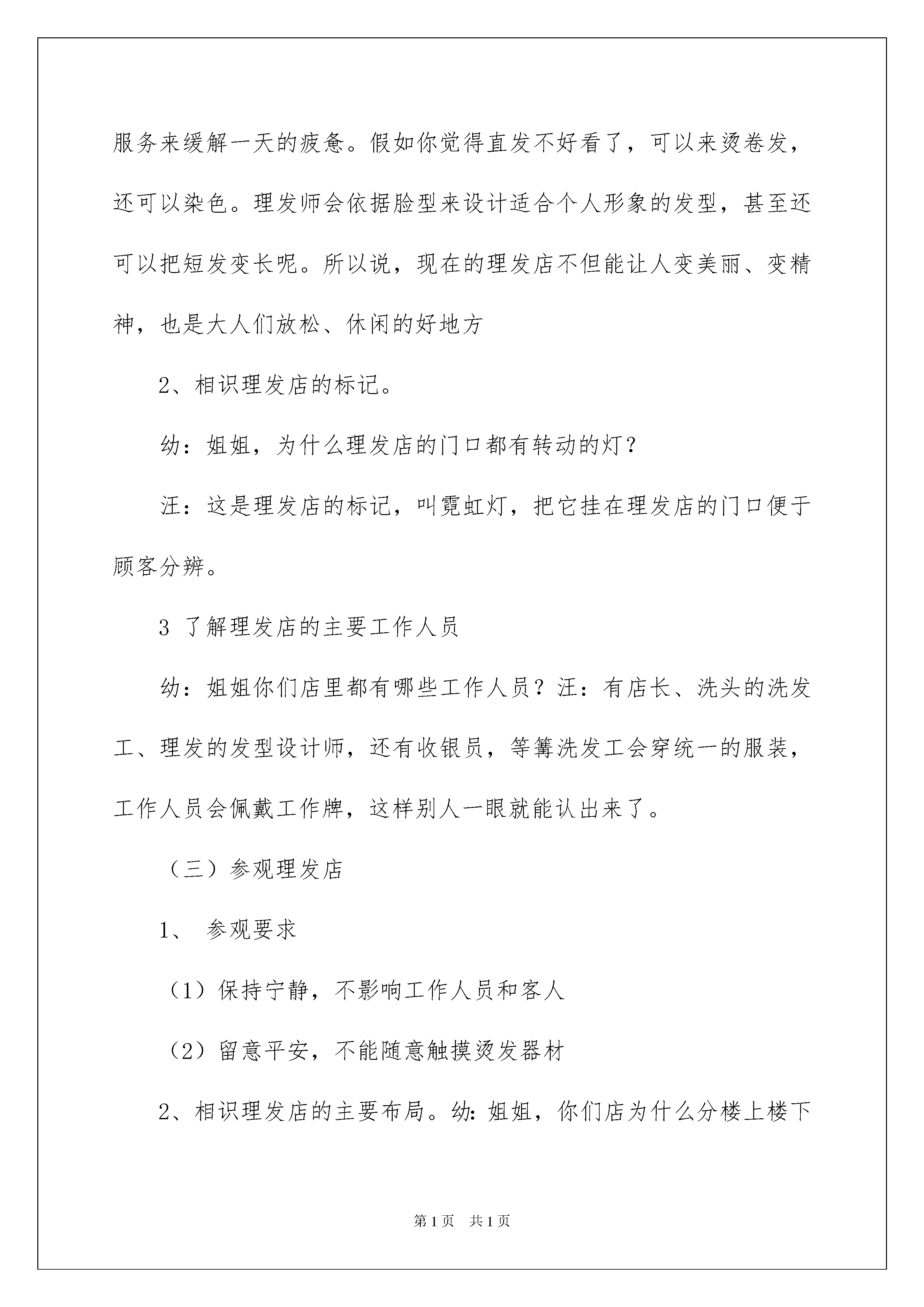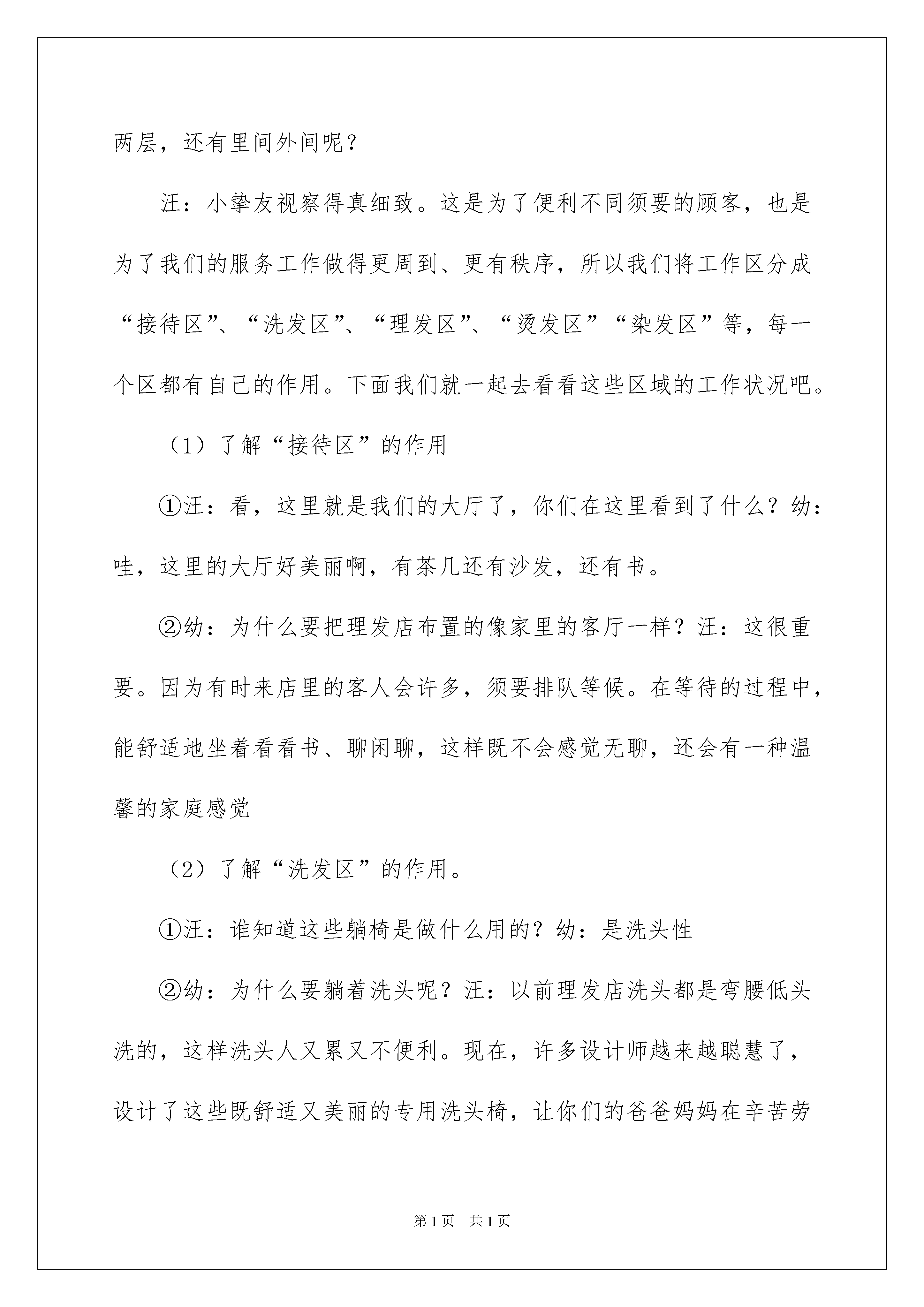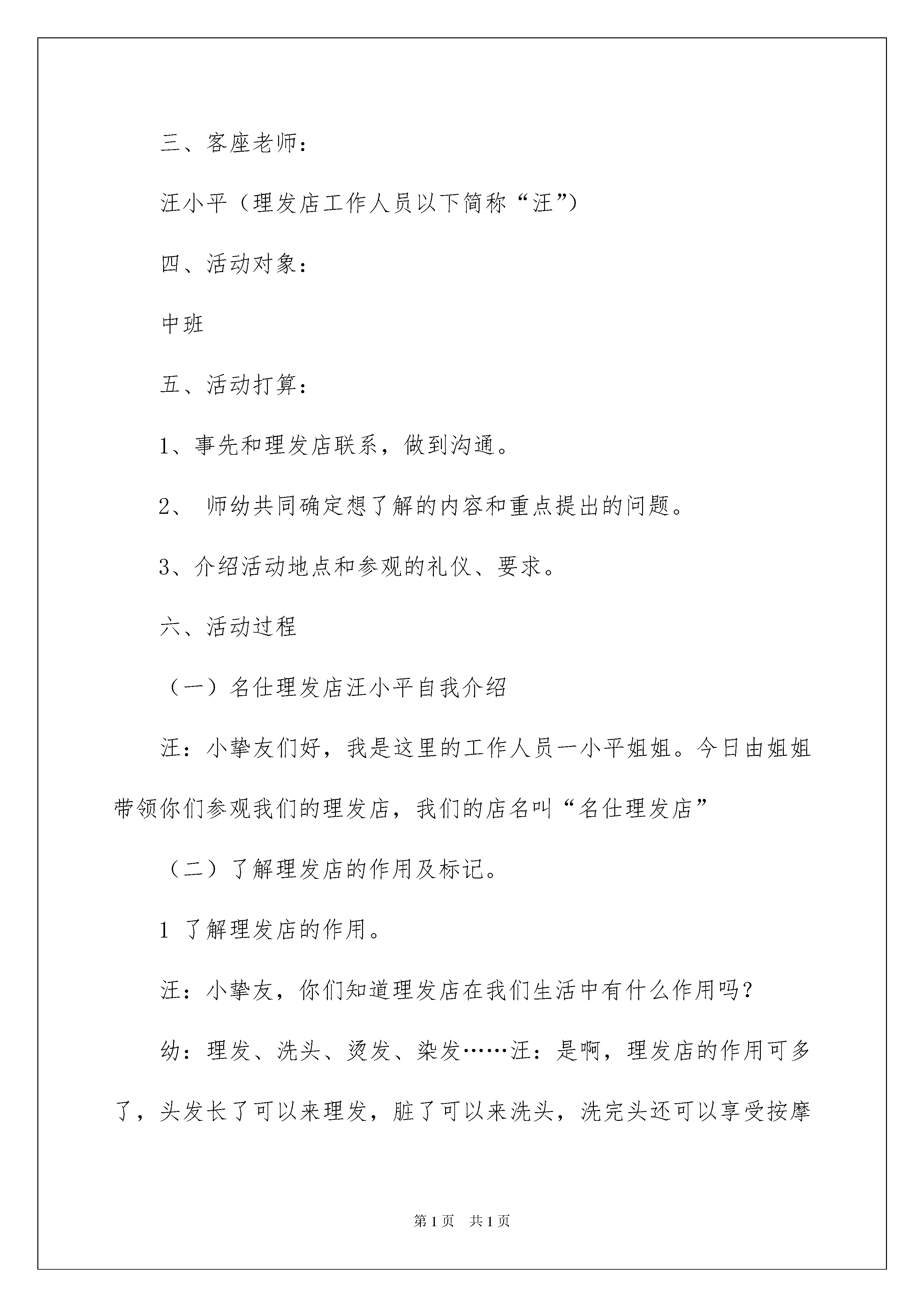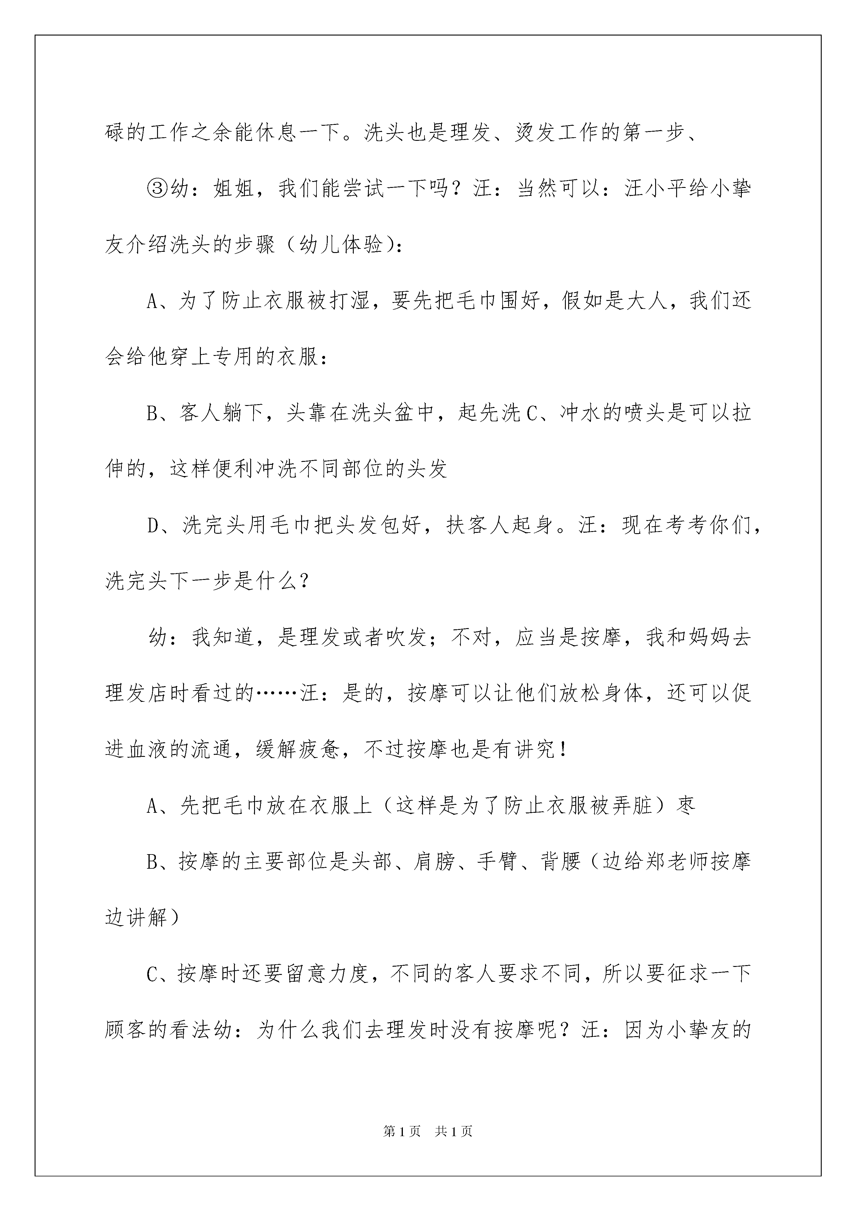 2022《理发》中班教案《理发》中班教案在教学工作者实际的教学活动中,有必要进行细致的教案打算工作,借助教案可以更好地组织教学活动。快来参考教案是怎么写的吧!下面是我收集整理的《理发》中班教案,希望能够帮助到大家。《理发》中班教案1一、设计初衷孩子是在嬉戏中学习学问、积累阅历、欢乐成长的。孩子们最喜爱玩区角嬉戏,在那里他们可以仿照成人的行为,学做“小大人”。我们班的“理发店”是最受孩子们欢迎的地方,每次看着孩子们像模像样的做“理发师”,真实地感受到了孩子们的童真童趣。为了让孩子们了解现实生活中的理发店,接着保持对“理发店”的爱好。于是,我们带领小挚友一同走进了名仕理发店。二活动目标:1、视察理发店的布局和设施,了解部分理发工具的名称及用途。2、能大胆、主动地与人沟通,懂得基本礼仪。三、客座老师:汪小平(理发店工作人员以下简称“汪”)四、活动对象:中班五、活动打算:1、事先和理发店联系,做到沟通。2、师幼共同确定想了解的内容和重点提出的问题。3、介绍活动地点和参观的礼仪、要求。六、活动过程(一)名仕理发店汪小平自我介绍汪:小挚友们好,我是这里的工作人员一小平姐姐。今日由姐姐带领你们参观我们的理发店,我们的店名叫“名仕理发店”(二)了解理发店的作用及标记。1了解理发店的作用。汪:小挚友,你们知道理发店在我们生活中有什么作用吗?幼:理发、洗头、烫发、染发……汪:是啊,理发店的作用可多了,头发长了可以来理发,脏了可以来洗头,洗完头还可以享受按摩服务来缓解一天的疲惫。假如你觉得直发不好看了,可以来烫卷发,还可以染色。理发师会依据脸型来设计适合个人形象的发型,甚至还可以把短发变长呢。所以说,现在的理发店不但能让人变美丽、变精神,也是大人们放松、休闲的好地方2、相识理发店的标记。幼:姐姐,为什么理发店的门口都有转动的灯?汪:这是理发店的标记,叫霓虹灯,把它挂在理发店的门口便于顾客分辨。3了解理发店的主要工作人员幼:姐姐你们店里都有哪些工作人员?汪:有店长、洗头的洗发工、理发的发型设计师,还有收银员,等篝洗发工会穿统一的服装,工作人员会佩戴工作牌,这样别人一眼就能认出来了。(三)参观理发店1、参观要求(1)保持宁静,不影响工作人员和客人(2)留意平安,不能随意触摸烫发器材2、相识理发店的主要布局。幼:姐姐,你们店为什么分楼上楼下两层,还有里间外间呢?汪:小挚友视察得真细致。这是为了便利不同须要的顾客,也是为了我们的服务工作做得更周到、更有秩序,所以我们将工作区分成“接待区”、“洗发区”、“理发区”、“烫发区”“染发区”等,每一个区都有自己的作用。下面我们就一起去看看这些区域的工作状况吧。(1)了解“接待区”的作用①汪:看,这里就是我们的大厅了,你们在这里看到了什么?幼:哇,这里的大厅好美丽啊,有茶几还有沙发,还有书。②幼:为什么要把理发店布置的像家里的客厅一样?汪:这很重要。因为有时来店里的客人会许多,须要排队等候。在等待的过程中,能舒适地坐着看看书、聊闲聊,这样既不会感觉无聊,还会有一种温馨的家庭感觉(2)了解“洗发区”的作用。①汪:谁知道这些躺椅是做什么用的?幼:是洗头性②幼:为什么要躺着洗头呢?汪:以前理发店洗头都是弯腰低头洗的,这样洗头人又累又不便利。现在,许多设计师越来越聪慧了,设计了这些既舒适又美丽的专用洗头椅,让你们的爸爸妈妈在辛苦劳碌的工作之余能休息一下。洗头也是理发、烫发工作的第一步、③幼:姐姐,我们能尝试一下吗?汪:当然可以:汪小平给小挚友介绍洗头的步骤(幼儿体验):A、为了防止衣服被打湿,要先把毛巾围好,假如是大人,我们还会给他穿上专用的衣服:B、客人躺下,头靠在洗头盆中,起先洗C、冲水的喷头是可以拉伸的,这样便利冲洗不同部位的头发D、洗完头用毛巾把头发包好,扶客人起身。汪:现在考考你们,洗完头下一步是什么?幼:我知道,是理发或者吹发;不对,应当是按摩,我和妈妈去理发店时看过的……汪:是的,按摩可以让他们放松身体,还可以促进血液的流通,缓解疲惫,不过按摩也是有讲究!A、先把毛巾放在衣服上(这样是为了防止衣服被弄脏)枣B、按摩的主要部位是头部、肩膀、手臂、背腰(边给郑老师按摩边讲解)C、按摩时还要留意力度,不同的客人要求不同,所以要征求一下顾客的看法幼:为什么我们去理发时没有按摩呢?汪:因为小挚友的身体还在发育期,身体各部位还不成熟,不能随意给你们按摩。汪:放松好了,该去吹剪或烫染(3)了解“理发区”的作用和各种工具的名称及用途。汪:这里就是我们剪发、理发的地方了。下面我给你们介绍一些理发用的工具:①围布的作用:为了不让剪下的头发掉在身上、衣服上,所以之前我们要先围上