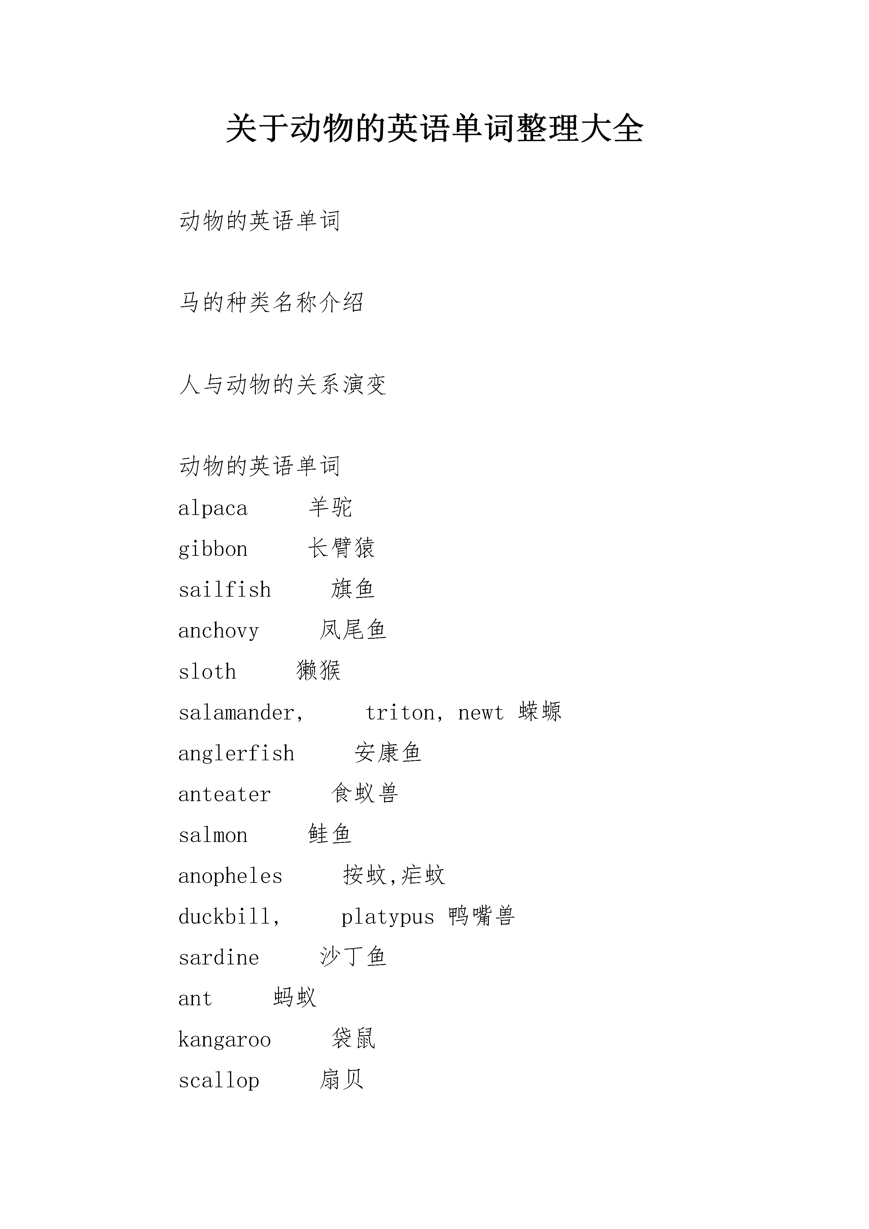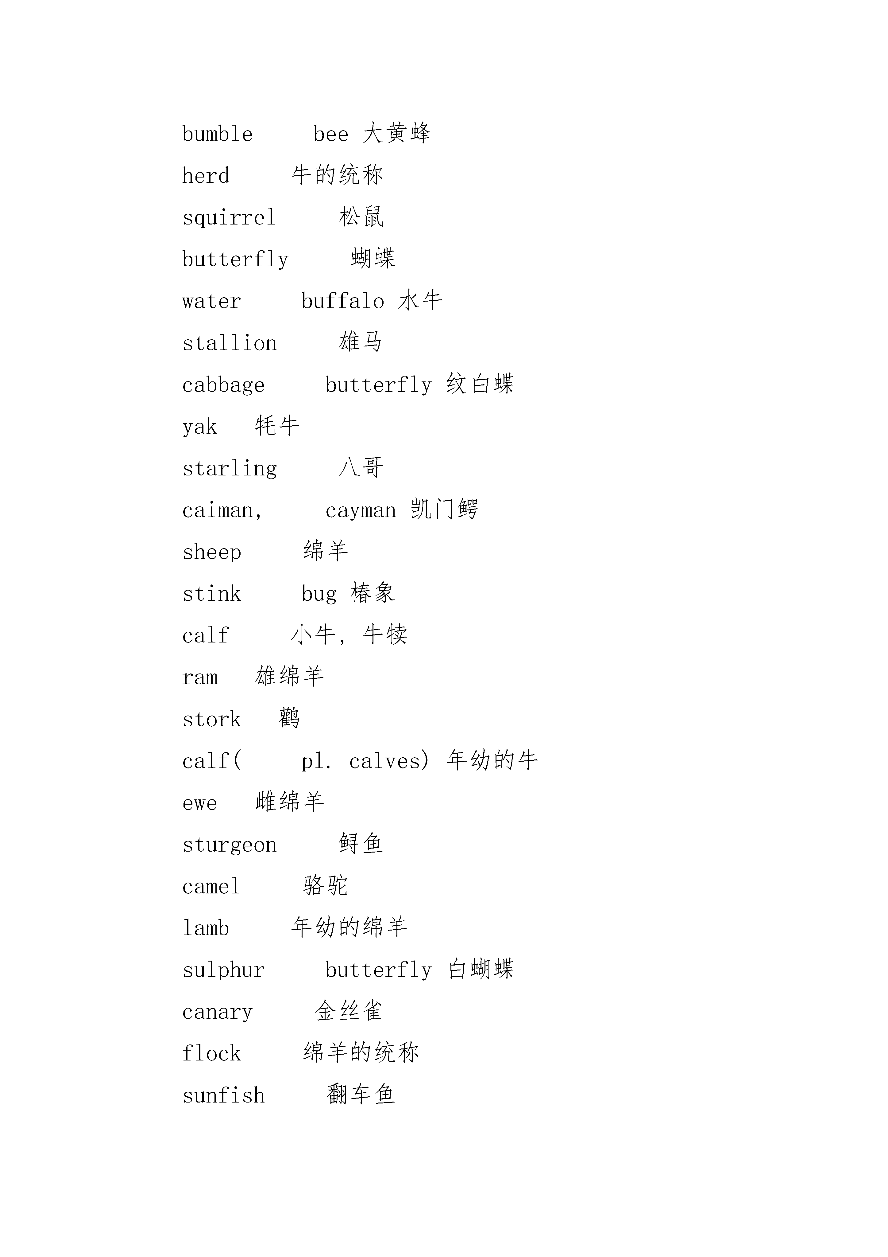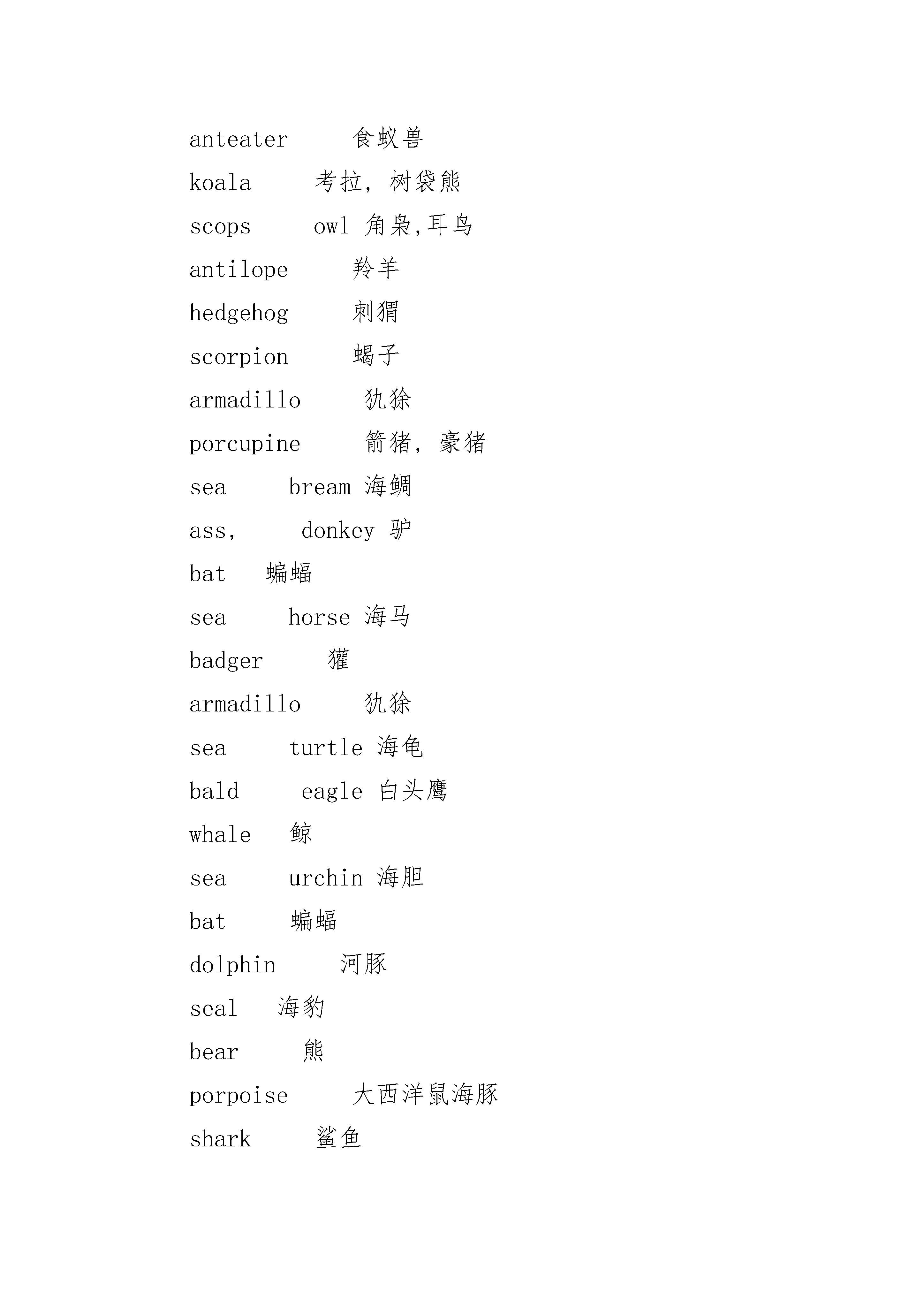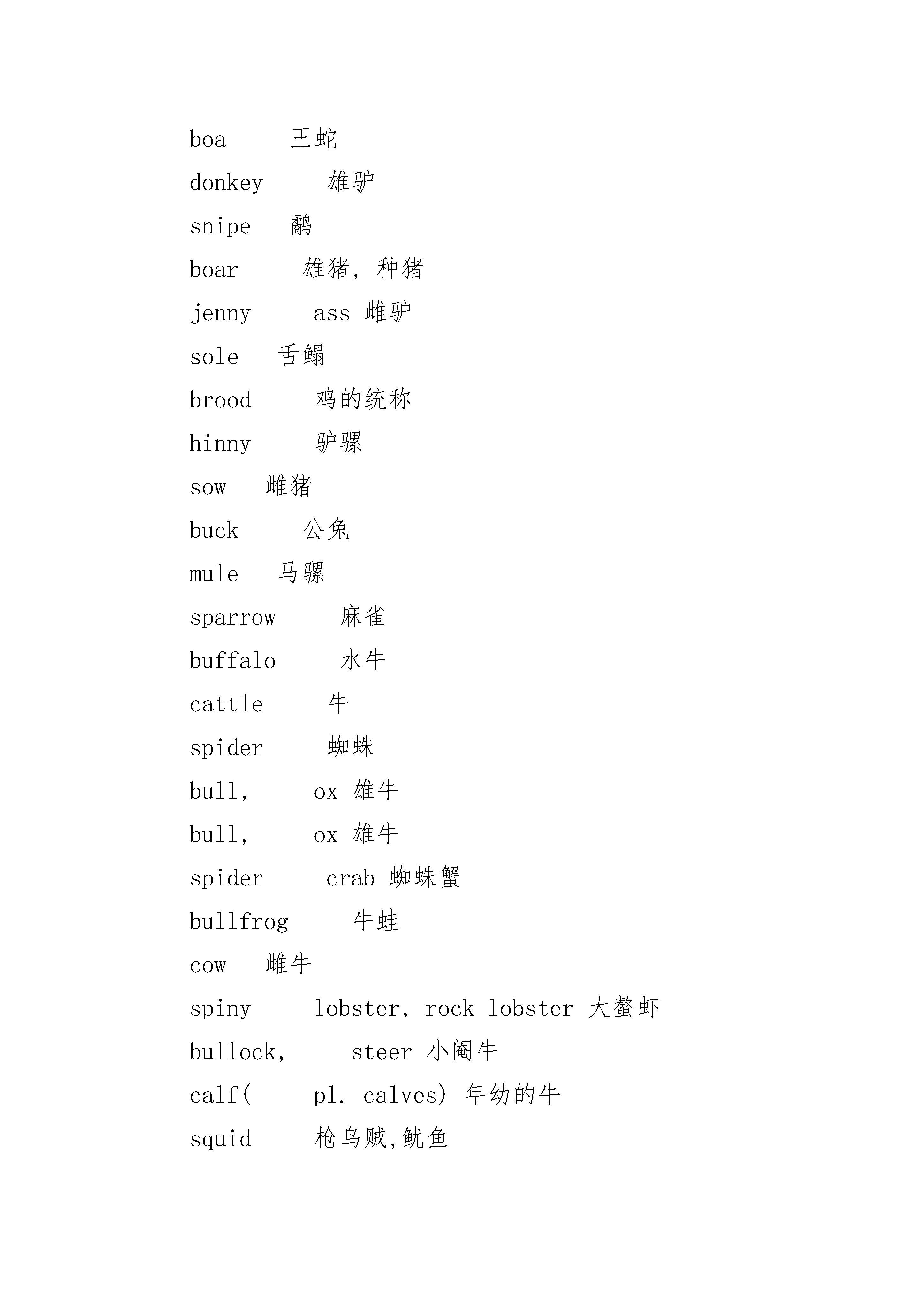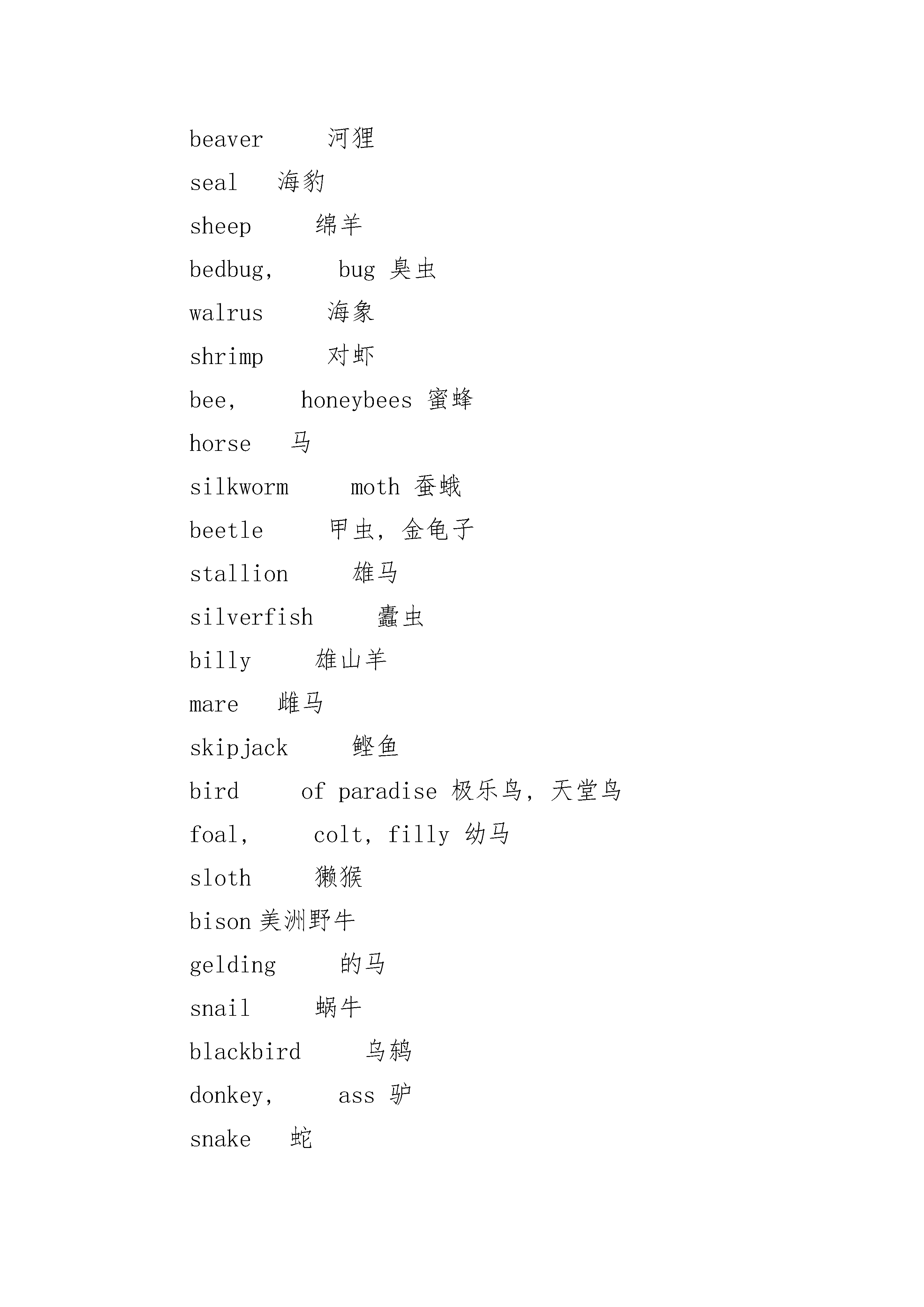 关于动物的英语单词整理大全动物的英语单词马的种类名称介绍人与动物的关系演变动物的英语单词alpaca羊驼gibbon长臂猿sailfish旗鱼anchovy凤尾鱼sloth獭猴salamander,triton,newt蝾螈anglerfish安康鱼anteater食蚁兽salmon鲑鱼anopheles按蚊,疟蚊duckbill,platypus鸭嘴兽sardine沙丁鱼ant蚂蚁kangaroo袋鼠scallop扇贝anteater食蚁兽koala考拉,树袋熊scopsowl角枭,耳鸟antilope羚羊hedgehog刺猬scorpion蝎子armadillo犰狳porcupine箭猪,豪猪seabream海鲷ass,donkey驴bat蝙蝠seahorse海马badger獾armadillo犰狳seaturtle海龟baldeagle白头鹰whale鲸seaurchin海胆bat蝙蝠dolphin河豚seal海豹bear熊porpoise大西洋鼠海豚shark鲨鱼beaver河狸seal海豹sheep绵羊bedbug,bug臭虫walrus海象shrimp对虾bee,honeybees蜜蜂horse马silkwormmoth蚕蛾beetle甲虫,金龟子stallion雄马silverfish蠹虫billy雄山羊mare雌马skipjack鲣鱼birdofparadise极乐鸟,天堂鸟foal,colt,filly幼马sloth獭猴bison美洲野牛gelding的马snail蜗牛blackbird乌鸫donkey,ass驴snake蛇boa王蛇donkey雄驴snipe鹬boar雄猪,种猪jennyass雌驴sole舌鳎brood鸡的统称hinny驴骡sow雌猪buck公兔mule马骡sparrow麻雀buffalo水牛cattle牛spider蜘蛛bull,ox雄牛bull,ox雄牛spidercrab蜘蛛蟹bullfrog牛蛙cow雌牛spinylobster,rocklobster大螯虾bullock,steer小阉牛calf(pl.calves)年幼的牛squid枪乌贼,鱿鱼bumblebee大黄蜂herd牛的统称squirrel松鼠butterfly蝴蝶waterbuffalo水牛stallion雄马cabbagebutterfly纹白蝶yak牦牛starling八哥caiman,cayman凯门鳄sheep绵羊stinkbug椿象calf小牛,牛犊ram雄绵羊stork鹳calf(pl.calves)年幼的牛ewe雌绵羊sturgeon鲟鱼camel骆驼lamb年幼的绵羊sulphurbutterfly白蝴蝶canary金丝雀flock绵羊的统称sunfish翻车鱼carp鲤鱼mutton羊肉swallow燕子cat猫goat山羊swallowtail凤尾蝶caterpillar毛虫billy雄山羊swan天鹅catta雌猫nanny雌山羊swift褐雨燕cattle牛kid年幼的山羊swordfish剑鱼centipede蜈蚣pig猪tabby,she-cat,grimalkin雌猫chaffinch苍头燕雀boar雄猪tarantula多毛毒蜘蛛chameleon变色龙,避役sow雌猪tarpon大海鲢chick小鸡piglet,shoat年幼的猪teal小野鸭chicken鸡,雏鸡herd猪的统称termite蚁chimpanzee黑猩猩dog狗thoroughbred纯种马chinchilla南美栗鼠dog雄狗thrush画眉chub鲢鱼bitch雌狗tiger虎cicada蝉pup年幼的狗toad蟾蜍clam蚌rabbit兔tom雄火鸡cob雄天鹅buck公兔tomcat雄猫cobra眼镜蛇goose鹅tomcat雄猫,公猫cod鳕鱼gander雄鹅tortoise玳瑁colt,foal马驹,小马goose雌鹅trout鳟鱼condor秃鹰gosling幼鹅tuatara古蜥蜴cop