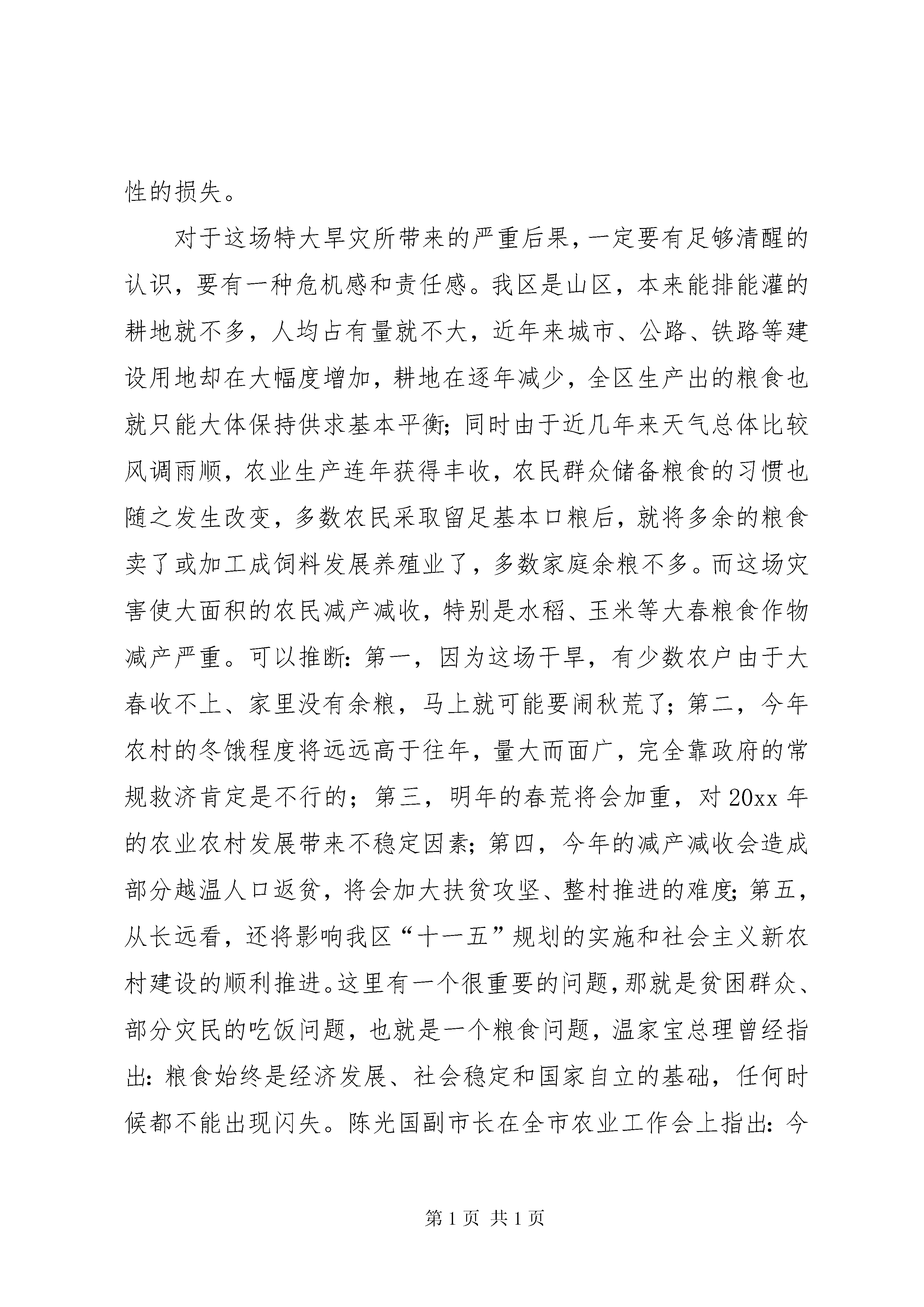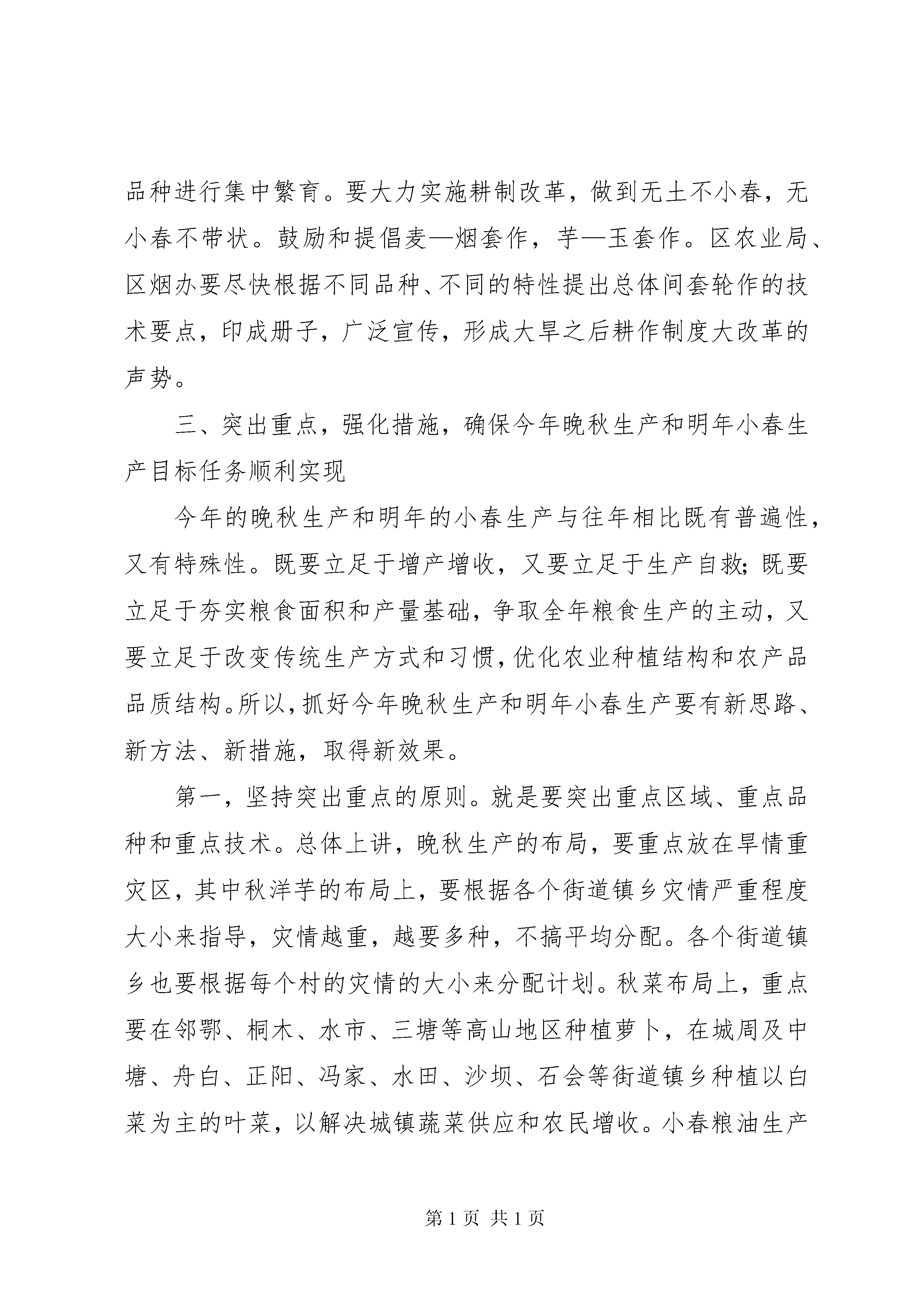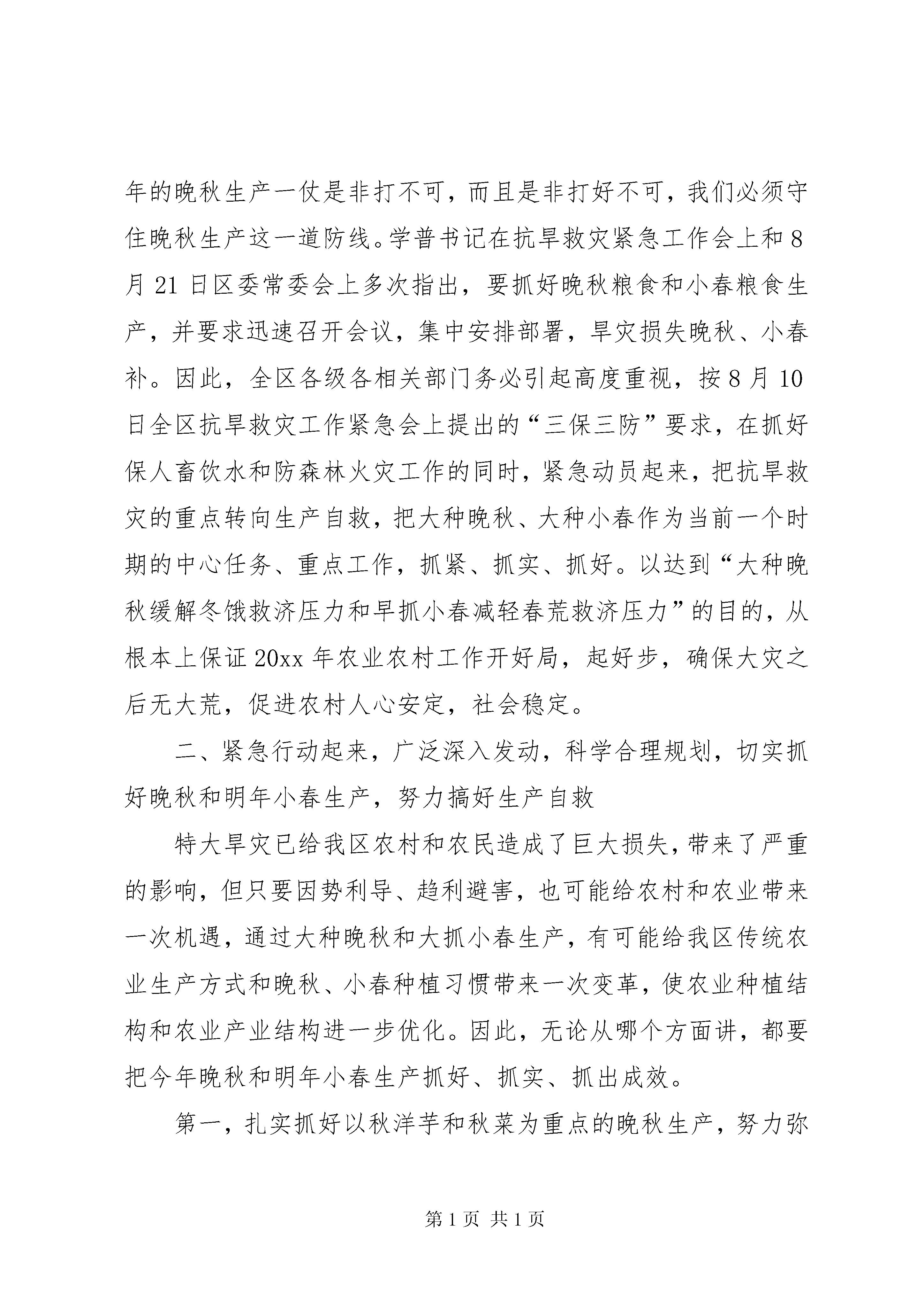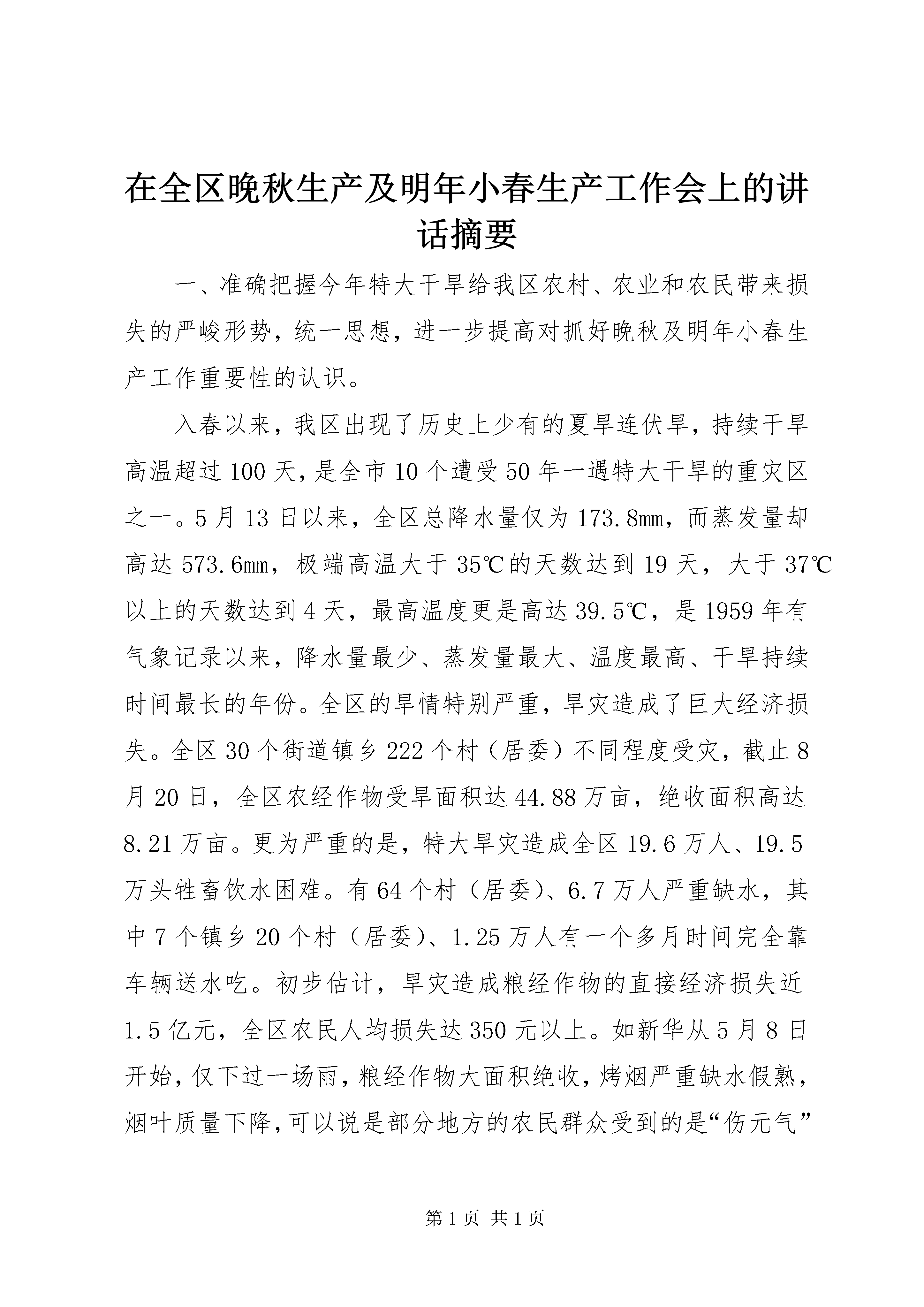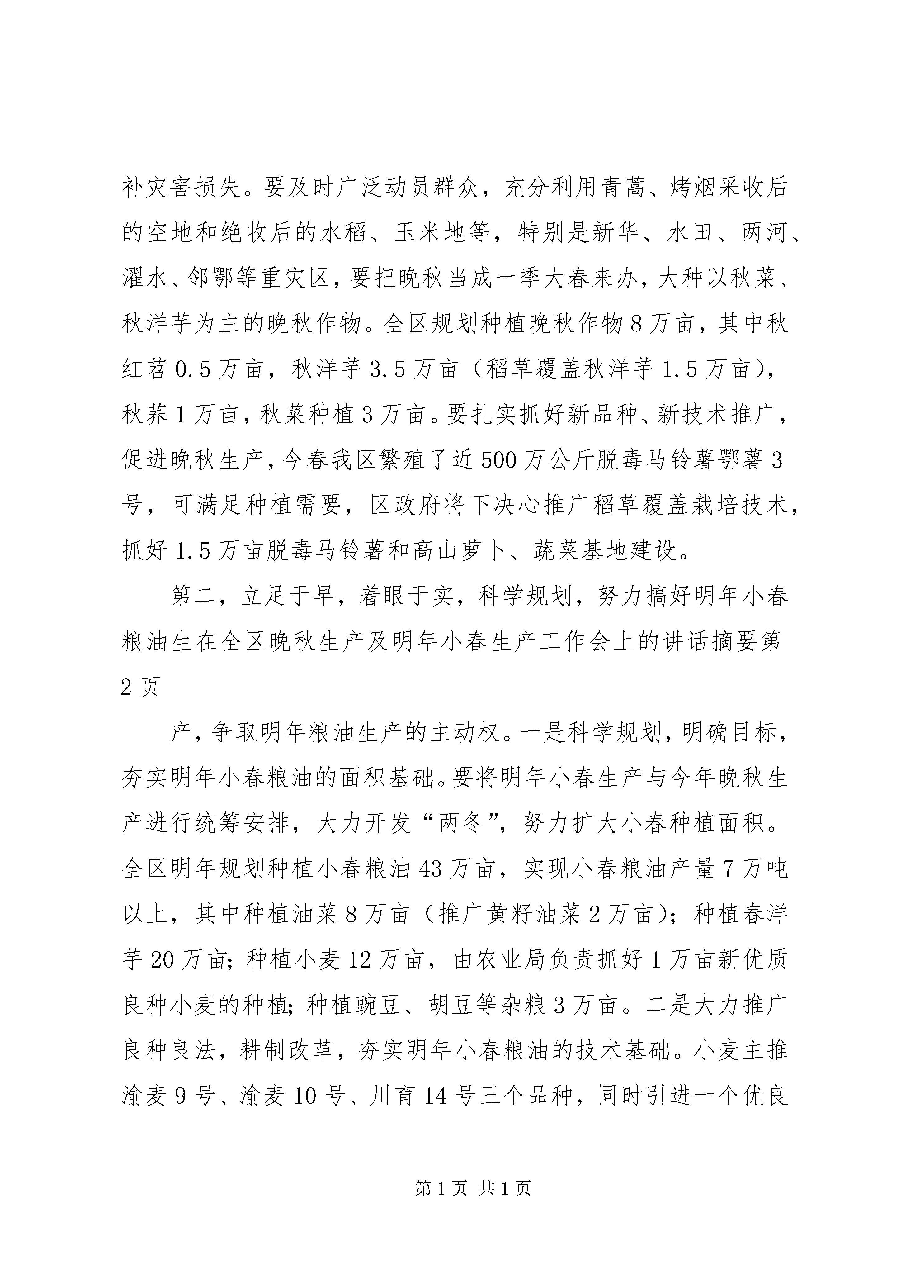 在全区晚秋生产及明年小春生产工作会上的讲话摘要一、准确把握今年特大干旱给我区农村、农业和农民带来损失的严峻形势,统一思想,进一步提高对抓好晚秋及明年小春生产工作重要性的认识。入春以来,我区出现了历史上少有的夏旱连伏旱,持续干旱高温超过100天,是全市10个遭受50年一遇特大干旱的重灾区之一。5月13日以来,全区总降水量仅为173.8mm,而蒸发量却高达573.6mm,极端高温大于35℃的天数达到19天,大于37℃以上的天数达到4天,最高温度更是高达39.5℃,是1959年有气象记录以来,降水量最少、蒸发量最大、温度最高、干旱持续时间最长的年份。全区的旱情特别严重,旱灾造成了巨大经济损失。全区30个街道镇乡222个村(居委)不同程度受灾,截止8月20日,全区农经作物受旱面积达44.88万亩,绝收面积高达8.21万亩。更为严重的是,特大旱灾造成全区19.6万人、19.5万头牲畜饮水困难。有64个村(居委)、6.7万人严重缺水,其中7个镇乡20个村(居委)、1.25万人有一个多月时间完全靠车辆送水吃。初步估计,旱灾造成粮经作物的直接经济损失近1.5亿元,全区农民人均损失达350元以上。如新华从5月8日开始,仅下过一场雨,粮经作物大面积绝收,烤烟严重缺水假熟,烟叶质量下降,可以说是部分地方的农民群众受到的是“伤元气”性的损失。对于这场特大旱灾所带来的严重后果,一定要有足够清醒的认识,要有一种危机感和责任感。我区是山区,本来能排能灌的耕地就不多,人均占有量就不大,近年来城市、公路、铁路等建设用地却在大幅度增加,耕地在逐年减少,全区生产出的粮食也就只能大体保持供求基本平衡;同时由于近几年来天气总体比较风调雨顺,农业生产连年获得丰收,农民群众储备粮食的习惯也随之发生改变,多数农民采取留足基本口粮后,就将多余的粮食卖了或加工成饲料发展养殖业了,多数家庭余粮不多。而这场灾害使大面积的农民减产减收,特别是水稻、玉米等大春粮食作物减产严重。可以推断:第一,因为这场干旱,有少数农户由于大春收不上、家里没有余粮,马上就可能要闹秋荒了;第二,今年农村的冬饿程度将远远高于往年,量大而面广,完全靠政府的常规救济肯定是不行的;第三,明年的春荒将会加重,对20xx年的农业农村发展带来不稳定因素;第四,今年的减产减收会造成部分越温人口返贫,将会加大扶贫攻坚、整村推进的难度;第五,从长远看,还将影响我区“十一五”规划的实施和社会主义新农村建设的顺利推进。这里有一个很重要的问题,那就是贫困群众、部分灾民的吃饭问题,也就是一个粮食问题,温家宝总理曾经指出:粮食始终是经济发展、社会稳定和国家自立的基础,任何时候都不能出现闪失。陈光国副市长在全市农业工作会上指出:今年的晚秋生产一仗是非打不可,而且是非打好不可,我们必须守住晚秋生产这一道防线。学普书记在抗旱救灾紧急工作会上和8月21日区委常委会上多次指出,要抓好晚秋粮食和小春粮食生产,并要求迅速召开会议,集中安排部署,旱灾损失晚秋、小春补。因此,全区各级各相关部门务必引起高度重视,按8月10日全区抗旱救灾工作紧急会上提出的“三保三防”要求,在抓好保人畜饮水和防森林火灾工作的同时,紧急动员起来,把抗旱救灾的重点转向生产自救,把大种晚秋、大种小春作为当前一个时期的中心任务、重点工作,抓紧、抓实、抓好。以达到“大种晚秋缓解冬饿救济压力和早抓小春减轻春荒救济压力”的目的,从根本上保证20xx年农业农村工作开好局,起好步,确保大灾之后无大荒,促进农村人心安定,社会稳定。二、紧急行动起来,广泛深入发动,科学合理规划,切实抓好晚秋和明年小春生产,努力搞好生产自救特大旱灾已给我区农村和农民造成了巨大损失,带来了严重的影响,但只要因势利导、趋利避害,也可能给农村和农业带来一次机遇,通过大种晚秋和大抓小春生产,有可能给我区传统农业生产方式和晚秋、小春种植习惯带来一次变革,使农业种植结构和农业产业结构进一步优化。因此,无论从哪个方面讲,都要把今年晚秋和明年小春生产抓好、抓实、抓出成效。第一,扎实抓好以秋洋芋和秋菜为重点的晚秋生产,努力弥补灾害损失。要及时广泛动员群众,充分利用青蒿、烤烟采收后的空地和绝收后的水稻、玉米地等,特别是新华、水田、两河、濯水、邻鄂等重灾区,要把晚秋当成一季大春来办,大种以秋菜、秋洋芋为主的晚秋作物。全区规划种植晚秋作物8万亩,其中秋红苕0.5万亩,秋洋芋3.5万亩(稻草覆盖秋洋芋1.5万亩),秋荞1万亩,秋菜种植3万亩。要扎实抓好新品种、新技术推广,促进晚秋生产,今春我区繁殖了近500万公斤脱毒马铃薯鄂薯3号,可满足种植需要,区政府将下决心推广稻草覆盖栽培技术,抓好1.5万亩脱毒马铃薯和高山萝卜、蔬菜基地建设。第二,立足于早,着眼于实,科学规划,努力搞好明年小春粮油生在全区晚秋生产及明年小春生产
