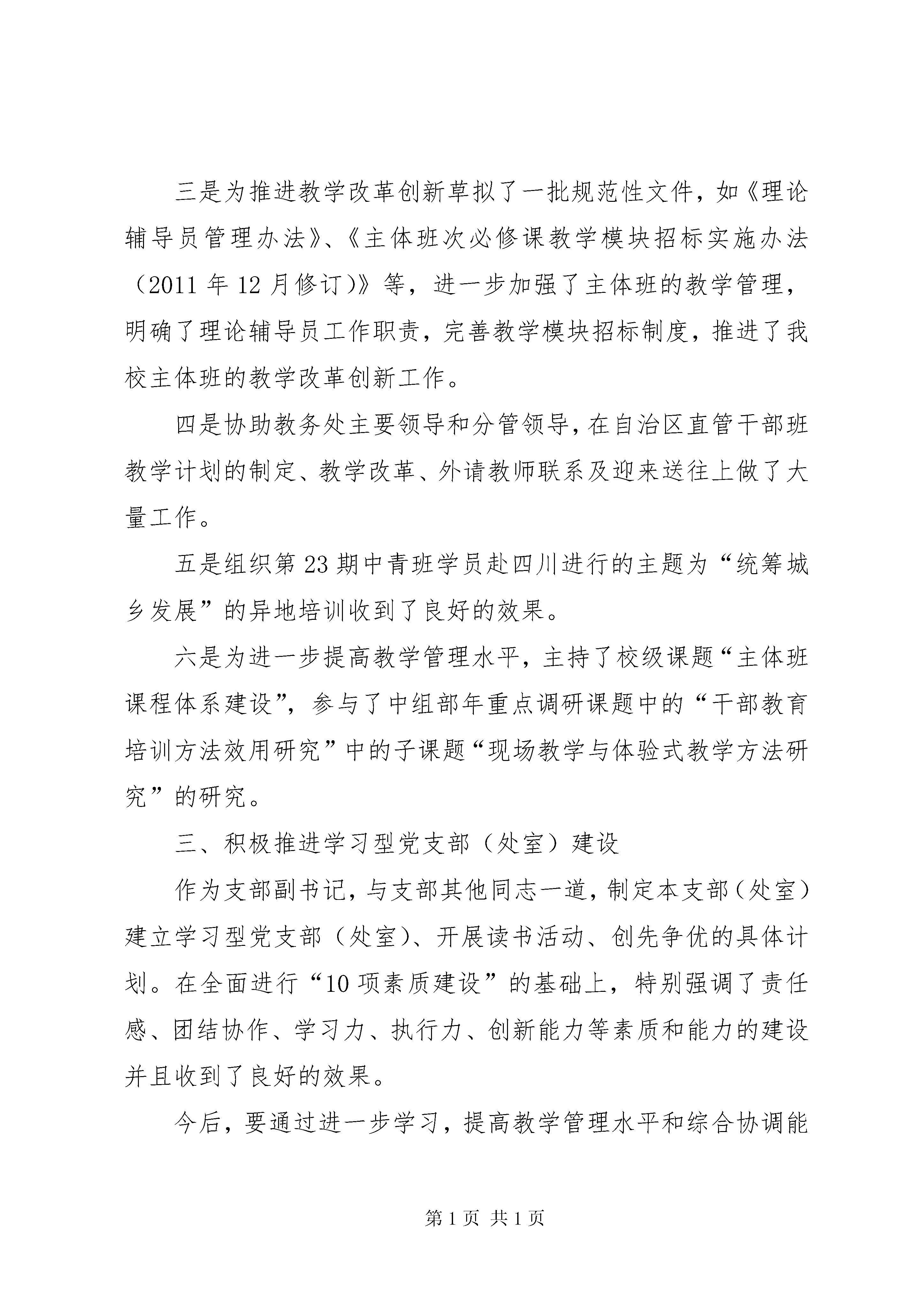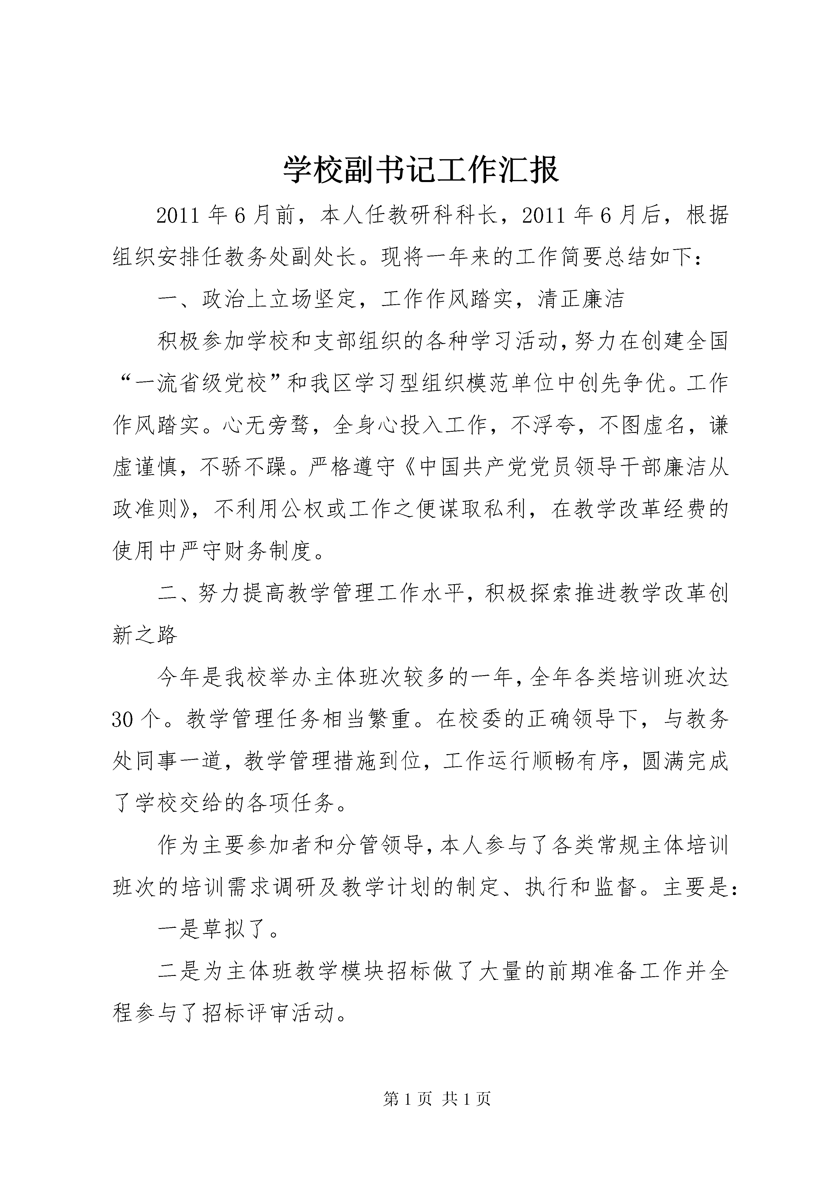 学校副书记工作汇报2011年6月前,本人任教研科科长,2011年6月后,根据组织安排任教务处副处长。现将一年来的工作简要总结如下:一、政治上立场坚定,工作作风踏实,清正廉洁积极参加学校和支部组织的各种学习活动,努力在创建全国“一流省级党校”和我区学习型组织模范单位中创先争优。工作作风踏实。心无旁骛,全身心投入工作,不浮夸,不图虚名,谦虚谨慎,不骄不躁。严格遵守《中国共产党党员领导干部廉洁从政准则》,不利用公权或工作之便谋取私利,在教学改革经费的使用中严守财务制度。二、努力提高教学管理工作水平,积极探索推进教学改革创新之路今年是我校举办主体班次较多的一年,全年各类培训班次达30个。教学管理任务相当繁重。在校委的正确领导下,与教务处同事一道,教学管理措施到位,工作运行顺畅有序,圆满完成了学校交给的各项任务。作为主要参加者和分管领导,本人参与了各类常规主体培训班次的培训需求调研及教学计划的制定、执行和监督。主要是:一是草拟了。二是为主体班教学模块招标做了大量的前期准备工作并全程参与了招标评审活动。三是为推进教学改革创新草拟了一批规范性文件,如《理论辅导员管理办法》、《主体班次必修课教学模块招标实施办法(2011年12月修订)》等,进一步加强了主体班的教学管理,明确了理论辅导员工作职责,完善教学模块招标制度,推进了我校主体班的教学改革创新工作。四是协助教务处主要领导和分管领导,在自治区直管干部班教学计划的制定、教学改革、外请教师联系及迎来送往上做了大量工作。五是组织第23期中青班学员赴四川进行的主题为“统筹城乡发展”的异地培训收到了良好的效果。六是为进一步提高教学管理水平,主持了校级课题“主体班课程体系建设”,参与了中组部年重点调研课题中的“干部教育培训方法效用研究”中的子课题“现场教学与体验式教学方法研究”的研究。三、积极推进学习型党支部(处室)建设作为支部副书记,与支部其他同志一道,制定本支部(处室)建立学习型党支部(处室)、开展读书活动、创先争优的具体计划。在全面进行“10项素质建设”的基础上,特别强调了责任感、团结协作、学习力、执行力、创新能力等素质和能力的建设并且收到了良好的效果。今后,要通过进一步学习,提高教学管理水平和综合协调能力,以更好地履行岗位职责,完成校委交给的工作任务。