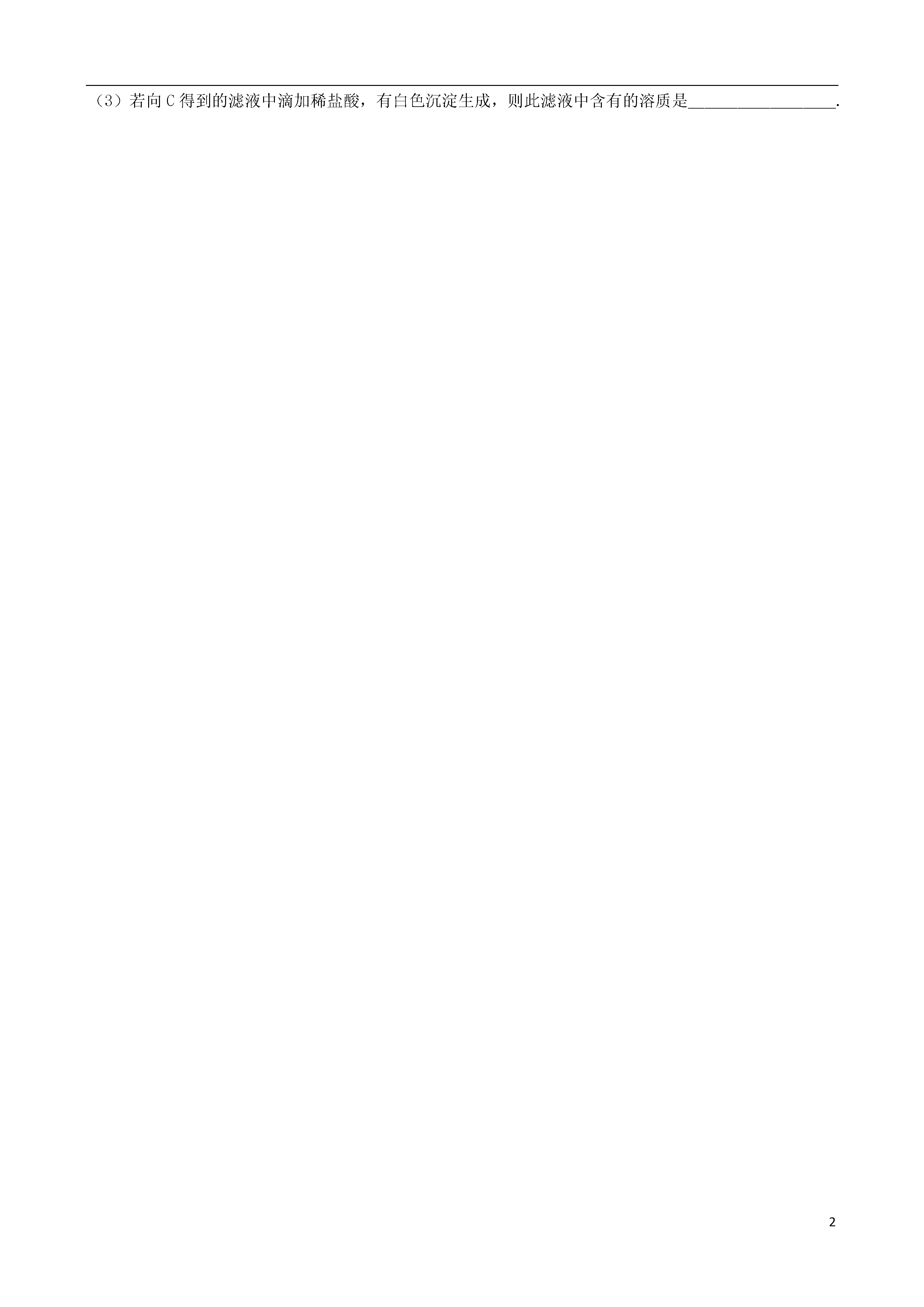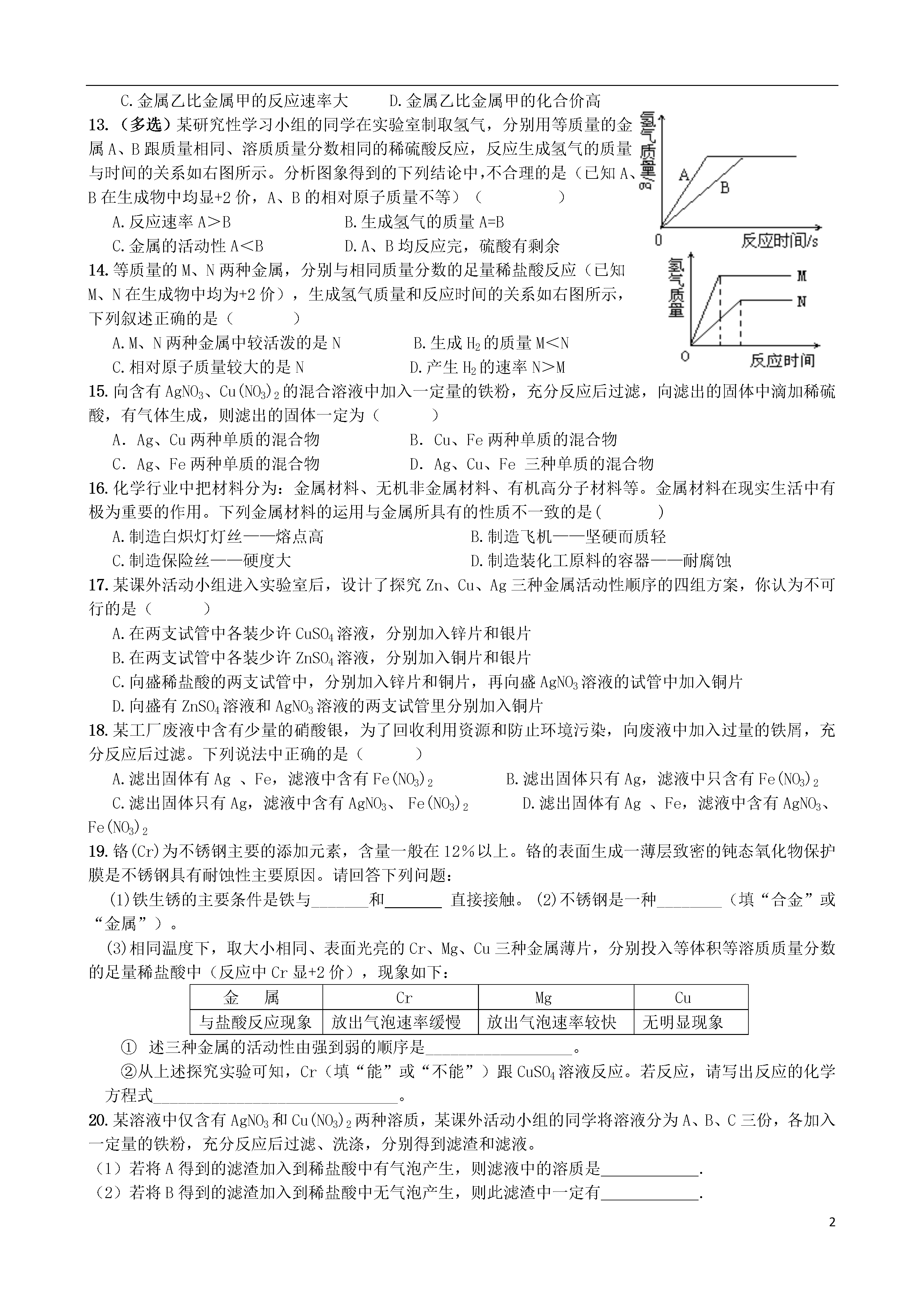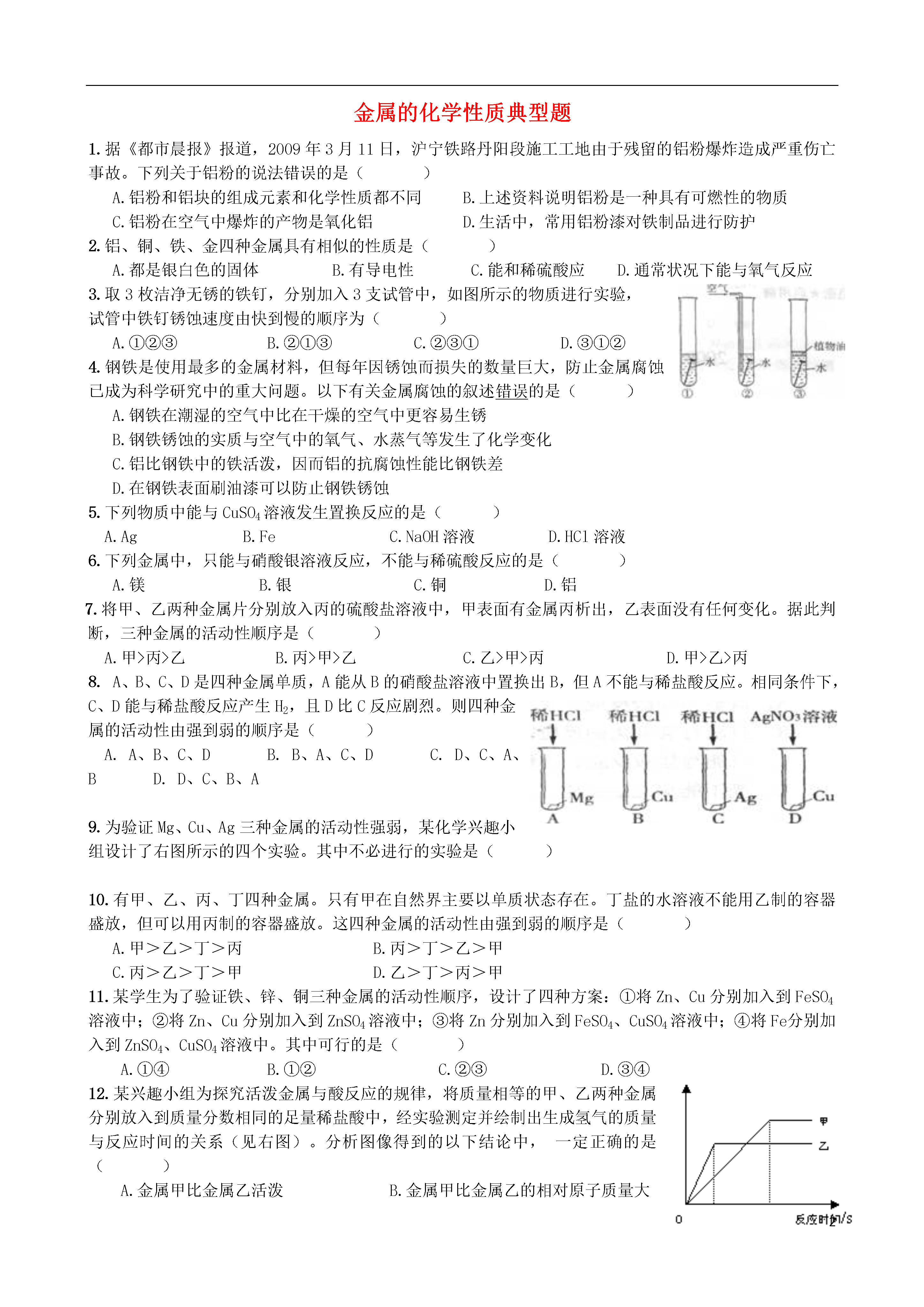 2金属的化学性质典型题1.据《都市晨报》报道,2009年3月11日,沪宁铁路丹阳段施工工地由于残留的铝粉爆炸造成严重伤亡事故。下列关于铝粉的说法错误的是()A.铝粉和铝块的组成元素和化学性质都不同B.上述资料说明铝粉是一种具有可燃性的物质C.铝粉在空气中爆炸的产物是氧化铝D.生活中,常用铝粉漆对铁制品进行防护2.铝、铜、铁、金四种金属具有相似的性质是()A.都是银白色的固体B.有导电性C.能和稀硫酸应D.通常状况下能与氧气反应3.取3枚洁净无锈的铁钉,分别加入3支试管中,如图所示的物质进行实验,试管中铁钉锈蚀速度由快到慢的顺序为()A.①②③B.②①③C.②③①D.③①②4.钢铁是使用最多的金属材料,但每年因锈蚀而损失的数量巨大,防止金属腐蚀已成为科学研究中的重大问题。以下有关金属腐蚀的叙述错误的是()A.钢铁在潮湿的空气中比在干燥的空气中更容易生锈B.钢铁锈蚀的实质与空气中的氧气、水蒸气等发生了化学变化C.铝比钢铁中的铁活泼,因而铝的抗腐蚀性能比钢铁差D.在钢铁表面刷油漆可以防止钢铁锈蚀5.下列物质中能与CuSO4溶液发生置换反应的是()A.AgB.FeC.NaOH溶液D.HCl溶液6.下列金属中,只能与硝酸银溶液反应,不能与稀硫酸反应的是()A.镁B.银C.铜D.铝7.将甲、乙两种金属片分别放入丙的硫酸盐溶液中,甲表面有金属丙析出,乙表面没有任何变化。据此判断,三种金属的活动性顺序是()A.甲>丙>乙B.丙>甲>乙C.乙>甲>丙D.甲>乙>丙8.A、B、C、D是四种金属单质,A能从B的硝酸盐溶液中置换出B,但A不能与稀盐酸反应。相同条件下,C、D能与稀盐酸反应产生H2,且D比C反应剧烈。则四种金属的活动性由强到弱的顺序是()A.A、B、C、DB.B、A、C、DC.D、C、A、BD.D、C、B、A9.为验证Mg、Cu、Ag三种金属的活动性强弱,某化学兴趣小组设计了右图所示的四个实验。其中不必进行的实验是()10.有甲、乙、丙、丁四种金属。只有甲在自然界主要以单质状态存在。丁盐的水溶液不能用乙制的容器盛放,但可以用丙制的容器盛放。这四种金属的活动性由强到弱的顺序是()A.甲>乙>丁>丙B.丙>丁>乙>甲C.丙>乙>丁>甲D.乙>丁>丙>甲11.某学生为了验证铁、锌、铜三种金属的活动性顺序,设计了四种方案:①将Zn、Cu分别加入到FeSO4溶液中;②将Zn、Cu分别加入到ZnSO4溶液中;③将Zn分别加入到FeSO4、CuSO4溶液中;④将Fe分别加入到ZnSO4、CuSO4溶液中。其中可行的是()A.①④B.①②C.②③D.③④12.某兴趣小组为探究活泼金属与酸反应的规律,将质量相等的甲、乙两种金属分别放入到质量分数相同的足量稀盐酸中,经实验测定并绘制出生成氢气的质量与反应时间的关系(见右图)。分析图像得到的以下结论中,一定正确的是()A.金属甲比金属乙活泼B.金属甲比金属乙的相对原子质量大C.金属乙比金属甲的反应速率大D.金属乙比金属甲的化合价高13.(多选)某研究性学习小组的同学在实验室制取氢气,分别用等质量的金属A、B跟质量相同、溶质质量分数相同的稀硫酸反应,反应生成氢气的质量与时间的关系如右图所示。分析图象得到的下列结论中,不合理的是(已知A、B在生成物中均显+2价,A、B的相对原子质量不等)()A.反应速率A>BB.生成氢气的质量A=BC.金属的活动性A<BD.A、B均反应完,硫酸有剩余14.等质量的M、N两种金属,分别与相同质量分数的足量稀盐酸反应(已知M、N在生成物中均为+2价),生成氢气质量和反应时间的关系如右图所示,下列叙述正确的是()A.M、N两种金属中较活泼的是NB.生成H2的质量M<NC.相对原子质量较大的是ND.产生H2的速率N>M15.向含有AgNO3、Cu(NO3)2的混合溶液中加入一定量的铁粉,充分反应后过滤,向滤出的固体中滴加稀硫酸,有气体生成,则滤出的固体一定为()A.Ag、Cu两种单质的混合物B.Cu、Fe两种单质的混合物C.Ag、Fe两种单质的混合物D.Ag、Cu、Fe三种单质的混合物16.化学行业中把材料分为:金属材料、无机非金属材料、有机高分子材料等。金属材料在现实生活中有极为重要的作用。下列金属材料的运用与金属所具有的性质不一致的是()A.制造白炽灯灯丝——熔点高B.制造飞机——坚硬而