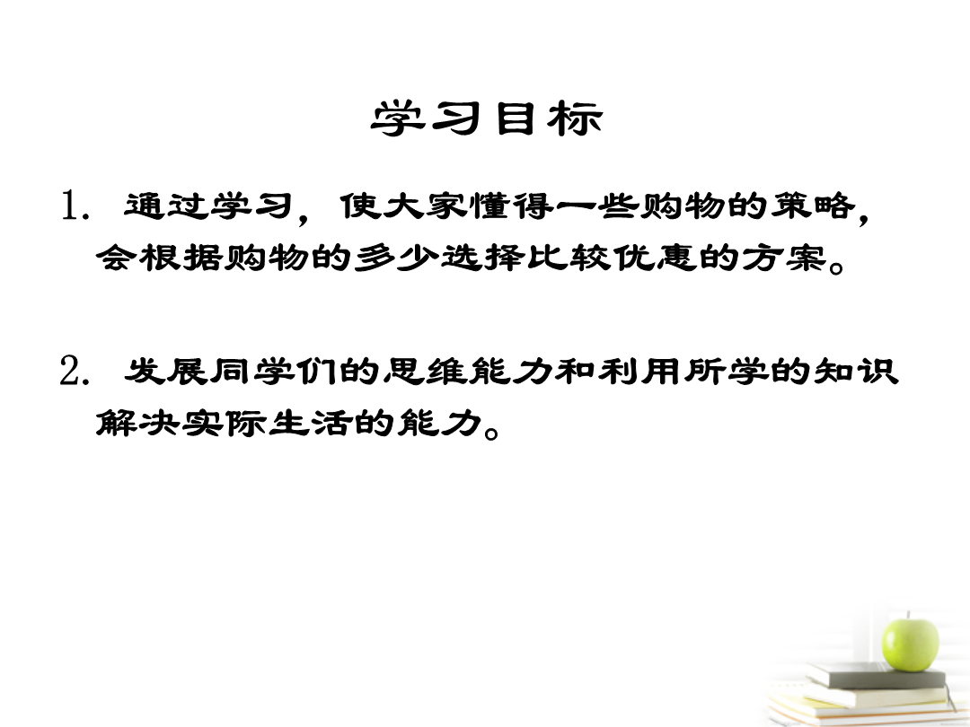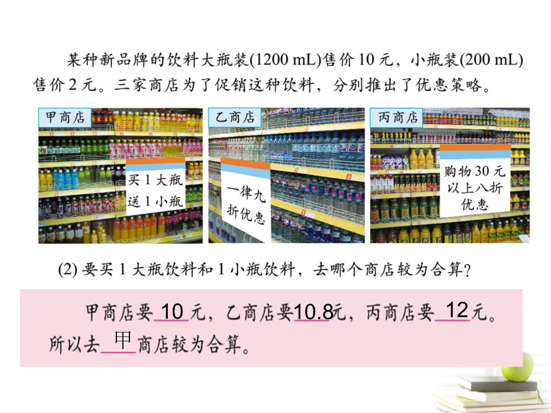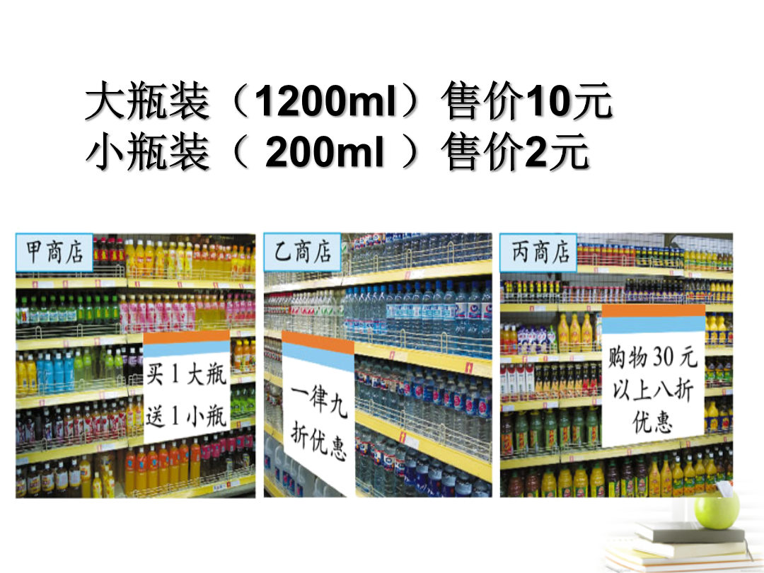 北师大版五年级数学下册学习目标(3)要买2.4升酸牛奶,怎么买合算?(1)3种。①1大盒。②2中盒。③5小盒。(2)3种。①1大盒1中盒。②3中盒。③5小盒1中盒。(3)很多种。①12小盒,花2.6×12=31.2(元)。②7小盒2中盒,花2.6×7+5×2=28.2(元)。③7小盒1大盒,花2.6×7+9.7×1=27.9(元)……方案套餐:18.00元