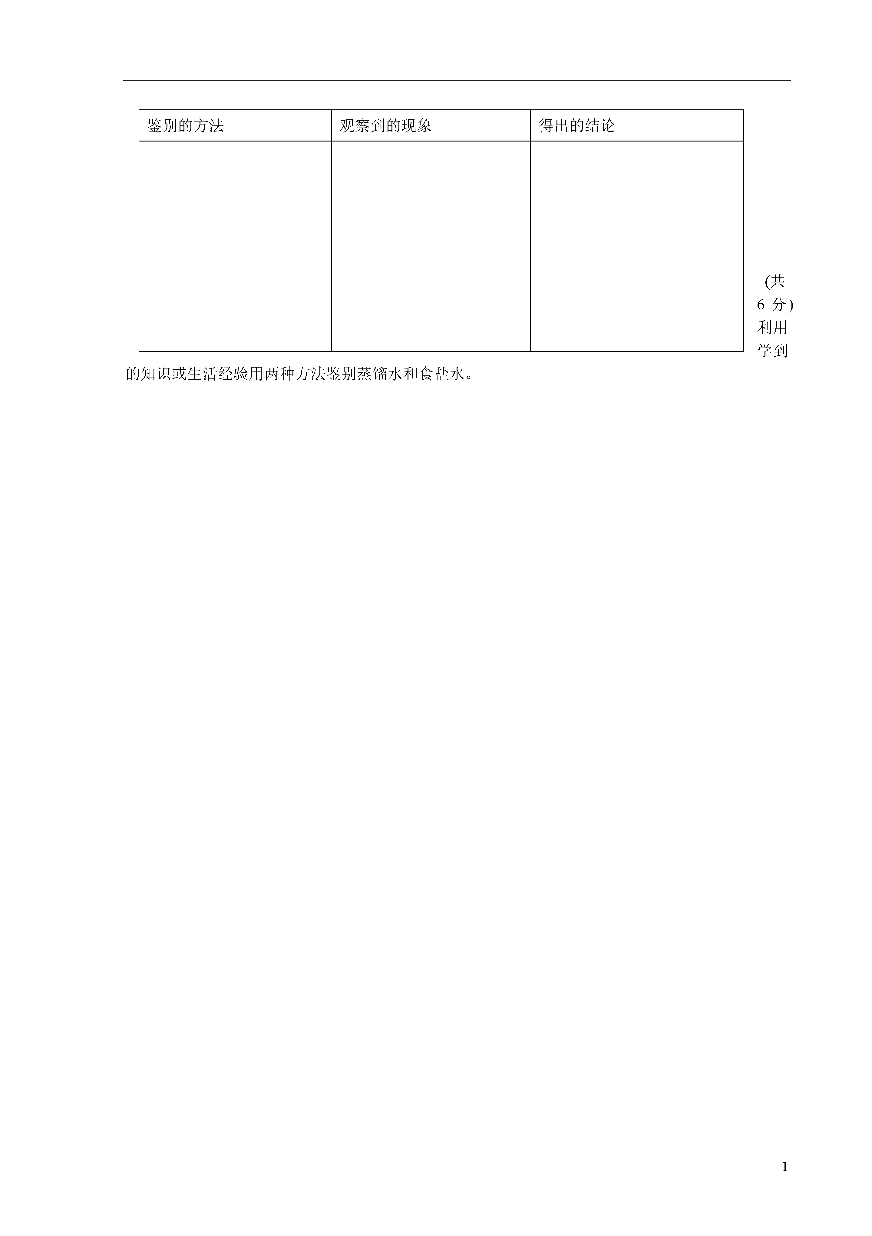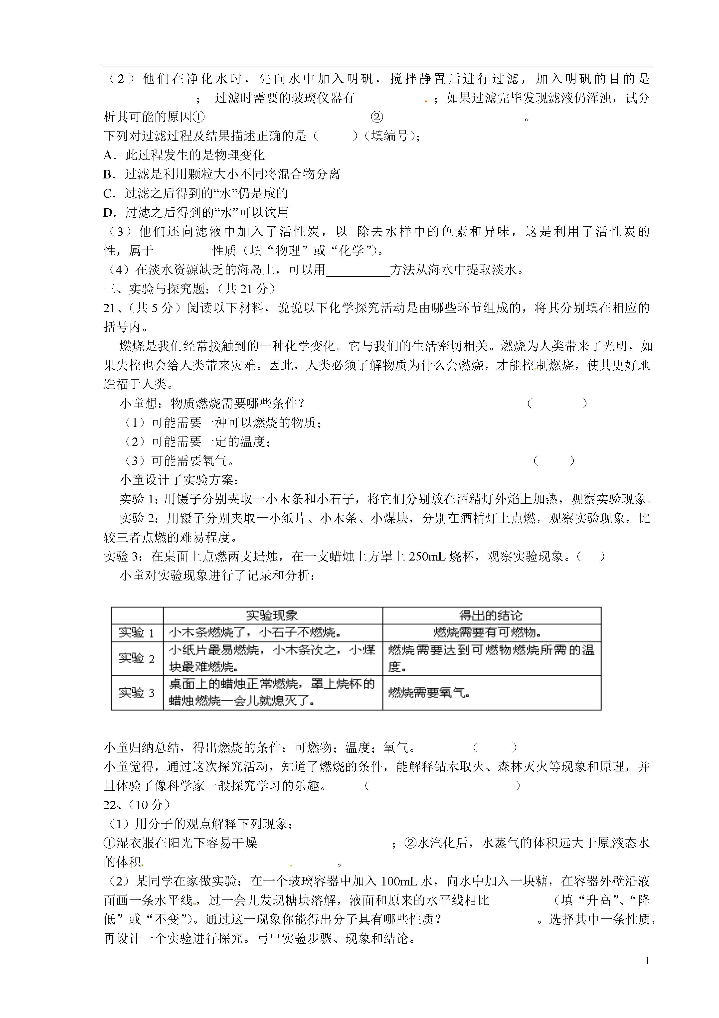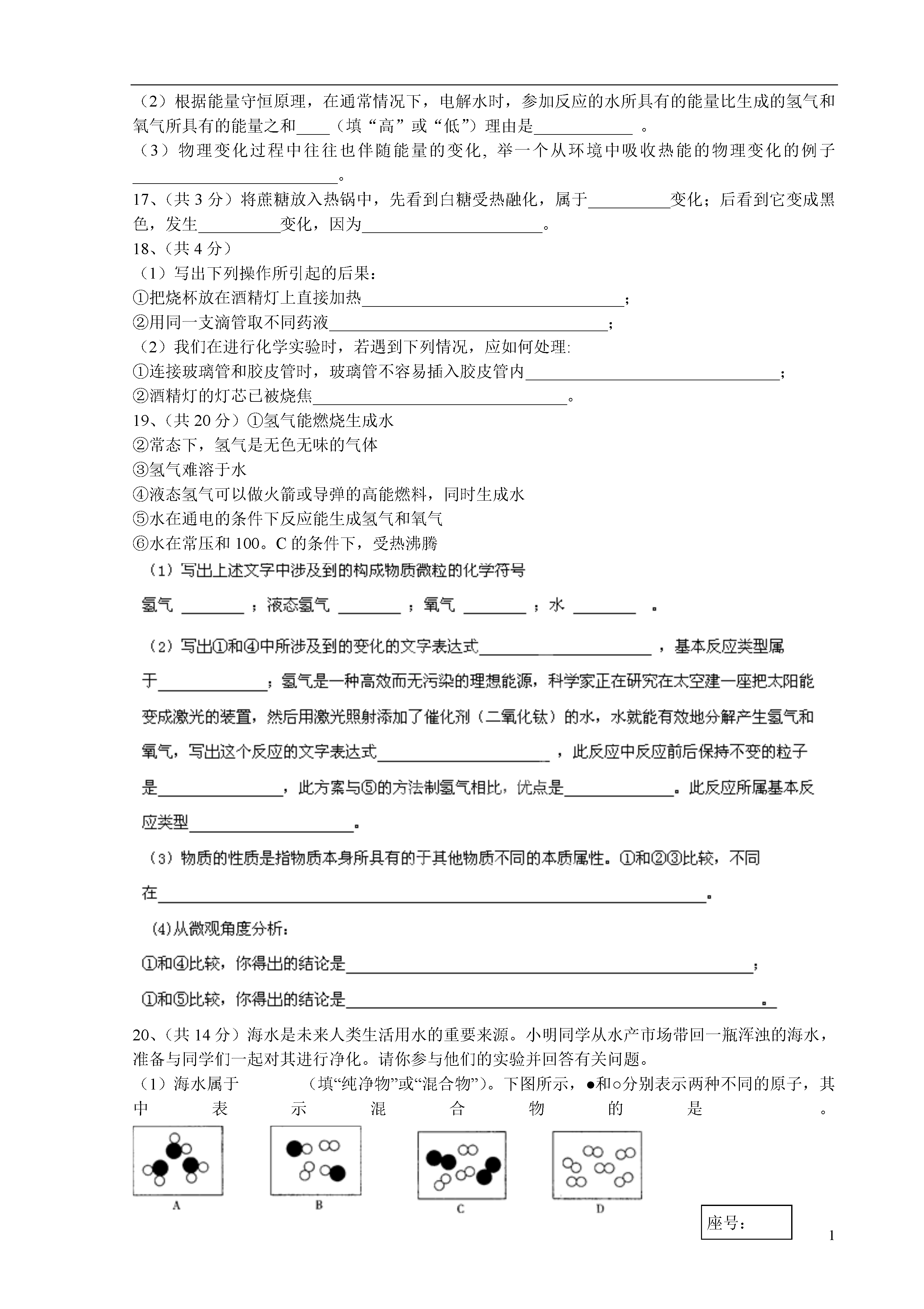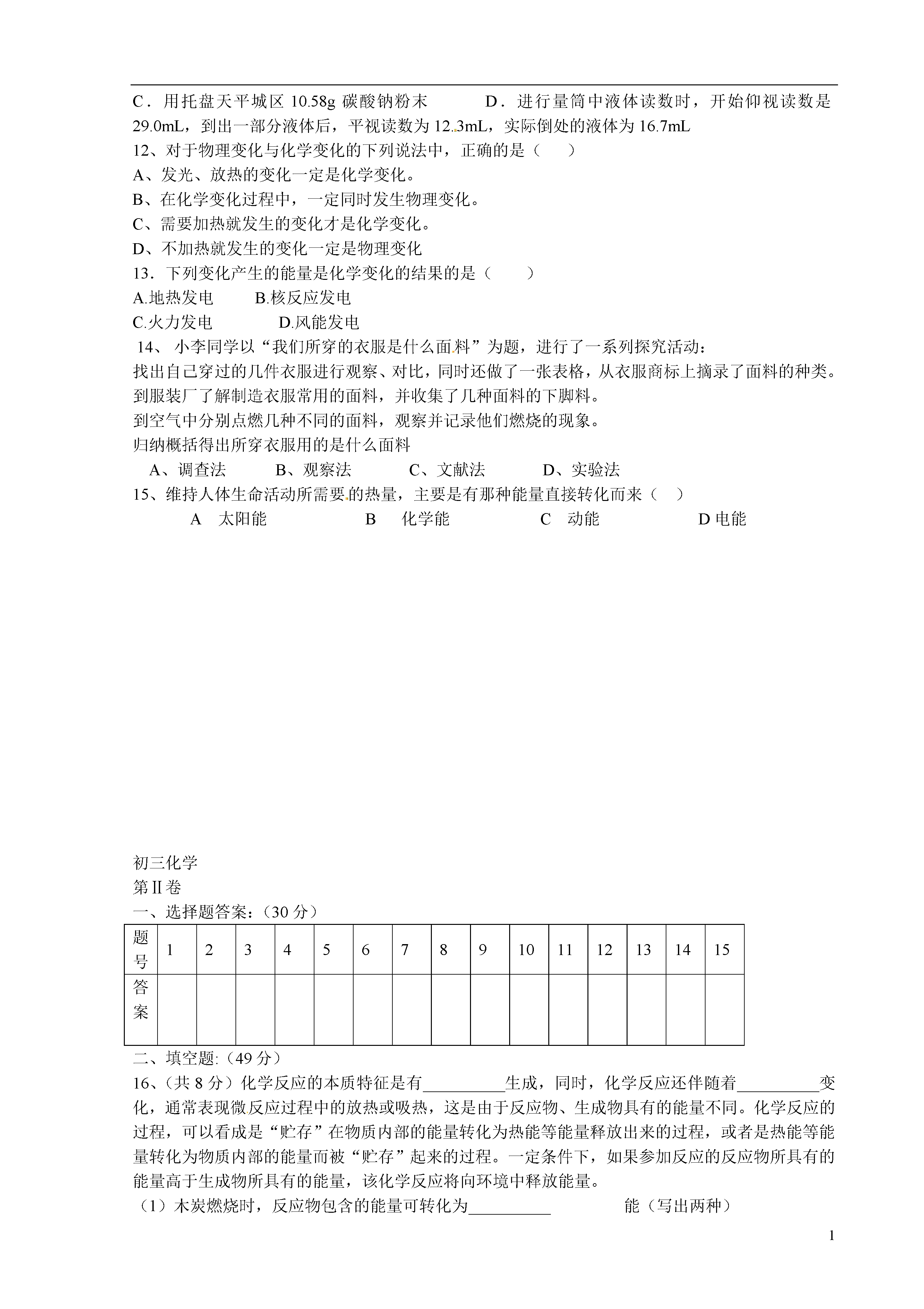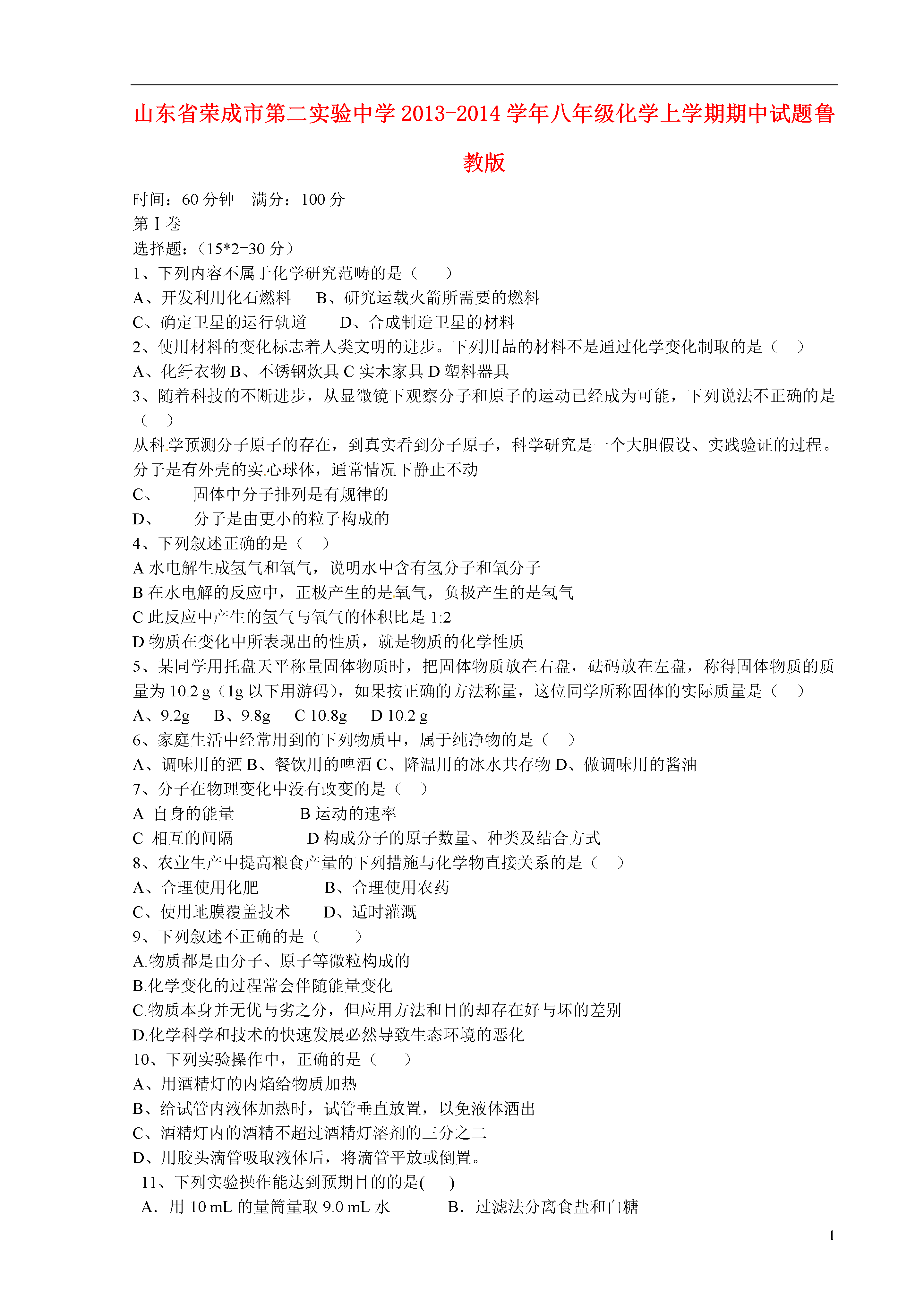 1山东省荣成市第二实验中学2013-2014学年八年级化学上学期期中试题鲁教版时间:60分钟满分:100分第Ⅰ卷选择题:(15*2=30分)1、下列内容不属于化学研究范畴的是()A、开发利用化石燃料B、研究运载火箭所需要的燃料C、确定卫星的运行轨道D、合成制造卫星的材料2、使用材料的变化标志着人类文明的进步。下列用品的材料不是通过化学变化制取的是()A、化纤衣物B、不锈钢炊具C实木家具D塑料器具3、随着科技的不断进步,从显微镜下观察分子和原子的运动已经成为可能,下列说法不正确的是()从科学预测分子原子的存在,到真实看到分子原子,科学研究是一个大胆假设、实践验证的过程。分子是有外壳的实心球体,通常情况下静止不动C、固体中分子排列是有规律的D、分子是由更小的粒子构成的4、下列叙述正确的是()A水电解生成氢气和氧气,说明水中含有氢分子和氧分子B在水电解的反应中,正极产生的是氧气,负极产生的是氢气C此反应中产生的氢气与氧气的体积比是1:2D物质在变化中所表现出的性质,就是物质的化学性质5、某同学用托盘天平称量固体物质时,把固体物质放在右盘,砝码放在左盘,称得固体物质的质量为10.2g(1g以下用游码),如果按正确的方法称量,这位同学所称固体的实际质量是()A、9.2gB、9.8gC10.8gD10.2g6、家庭生活中经常用到的下列物质中,属于纯净物的是()A、调味用的酒B、餐饮用的啤酒C、降温用的冰水共存物D、做调味用的酱油7、分子在物理变化中没有改变的是()A自身的能量B运动的速率C相互的间隔D构成分子的原子数量、种类及结合方式8、农业生产中提高粮食产量的下列措施与化学物直接关系的是()A、合理使用化肥B、合理使用农药C、使用地膜覆盖技术D、适时灌溉9、下列叙述不正确的是()A.物质都是由分子、原子等微粒构成的B.化学变化的过程常会伴随能量变化C.物质本身并无优与劣之分,但应用方法和目的却存在好与坏的差别D.化学科学和技术的快速发展必然导致生态环境的恶化10、下列实验操作中,正确的是()A、用酒精灯的内焰给物质加热B、给试管内液体加热时,试管垂直放置,以免液体洒出C、酒精灯内的酒精不超过酒精灯溶剂的三分之二D、用胶头滴管吸取液体后,将滴管平放或倒置。11、下列实验操作能达到预期目的的是()A.用10mL的量筒量取9.0mL水B.过滤法分离食盐和白糖C.用托盘天平城区10.58g碳酸钠粉末D.进行量筒中液体读数时,开始仰视读数是29.0mL,到出一部分液体后,平视读数为12.3mL,实际倒处的液体为16.7mL12、对于物理变化与化学变化的下列说法中,正确的是()A、发光、放热的变化一定是化学变化。B、在化学变化过程中,一定同时发生物理变化。C、需要加热就发生的变化才是化学变化。D、不加热就发生的变化一定是物理变化13.下列变化产生的能量是化学变化的结果的是()A.地热发电B.核反应发电C.火力发电D.风能发电14、小李同学以“我们所穿的衣服是什么面料”为题,进行了一系列探究活动:找出自己穿过的几件衣服进行观察、对比,同时还做了一张表格,从衣服商标上摘录了面料的种类。到服装厂了解制造衣服常用的面料,并收集了几种面料的下脚料。到空气中分别点燃几种不同的面料,观察并记录他们燃烧的现象。归纳概括得出所穿衣服用的是什么面料A、调查法B、观察法C、文献法D、实验法15、维持人体生命活动所需要的热量,主要是有那种能量直接转化而来()A太阳能B化学能C动能D电能初三化学第Ⅱ卷一、选择题答案:(30分)题号123456789101112131415答案二、填空题:(49分)16、(共8分)化学反应的本质特征是有__________生成,同时,化学反应还伴随着__________变化,通常表现微反应过程中的放热或吸热,这是由于反应物、生成物具有的能量不同。化学反应的过程,可以看成是“贮存”在物质内部的能量转化为热能等能量释放出来的过程,或者是热能等能量转化为物质内部的能量而被“贮存”起来的过程。一定条件下,如果参加反应的反应物所具有的能量高于生成物所具有的能量,该化学反应将向环境中释放能量。(1)木炭燃烧时,反应物包含的能量可转化为__________能(写出两种)(2)根据能量守恒原理,在通常情况下,电解水时,参加反应的水所具有的能量比生成的氢气和氧气所具有的能量之和____(填“高”或“低”)理由是____________。(3)物理变化过程中往往也伴随能量的变化,举一个从环境中吸收热能的物理变化的例子_________________________。17、(共3分)