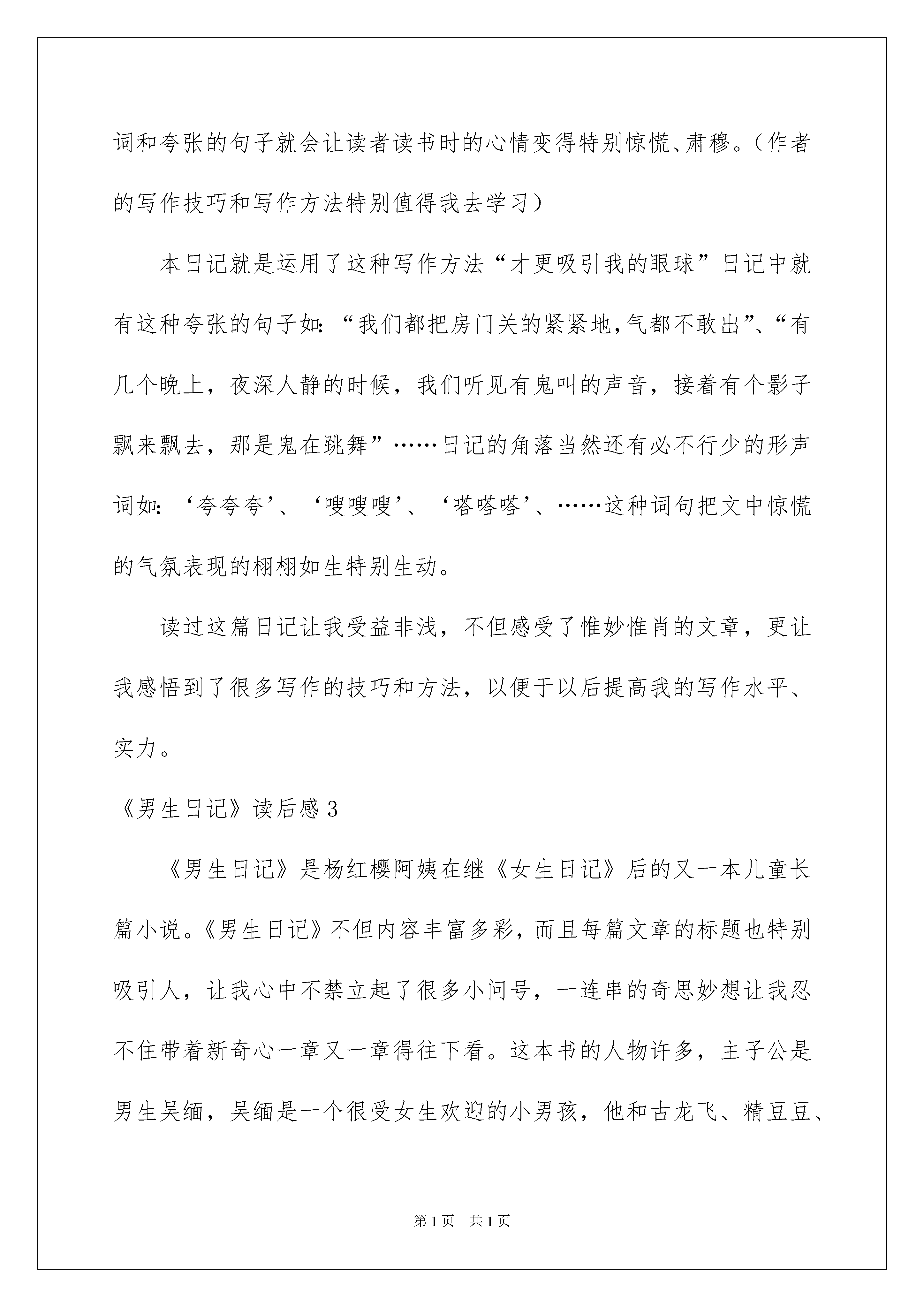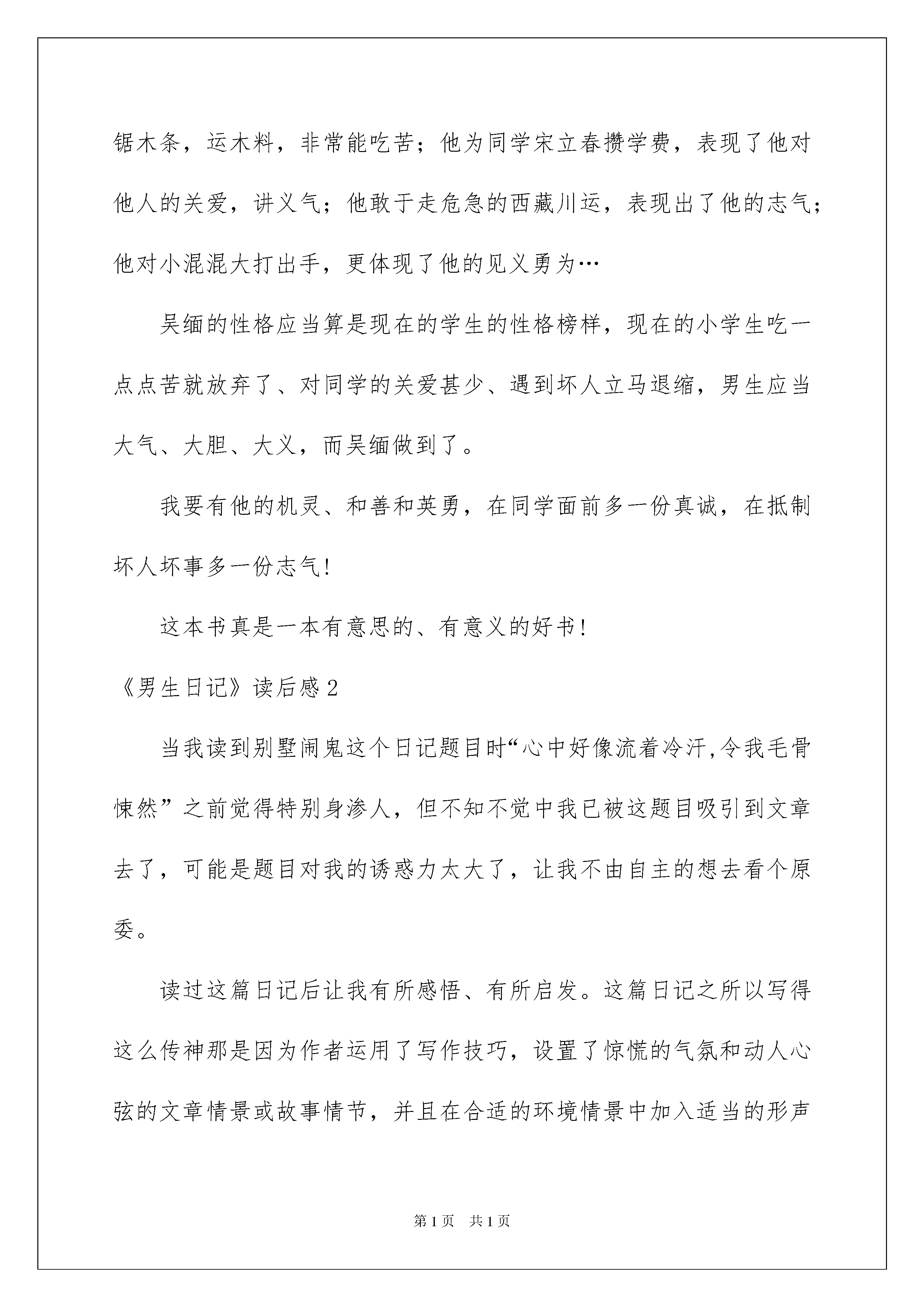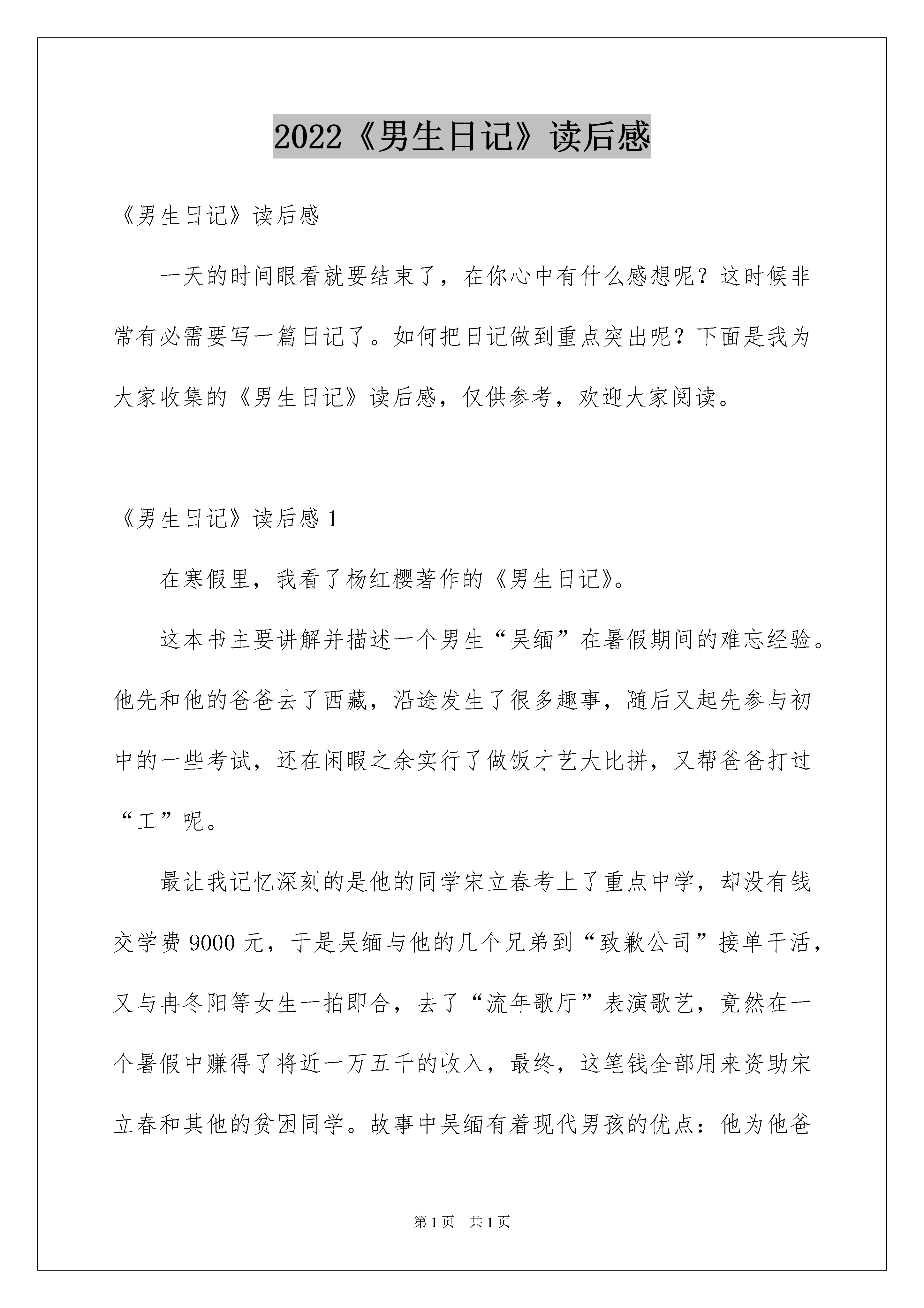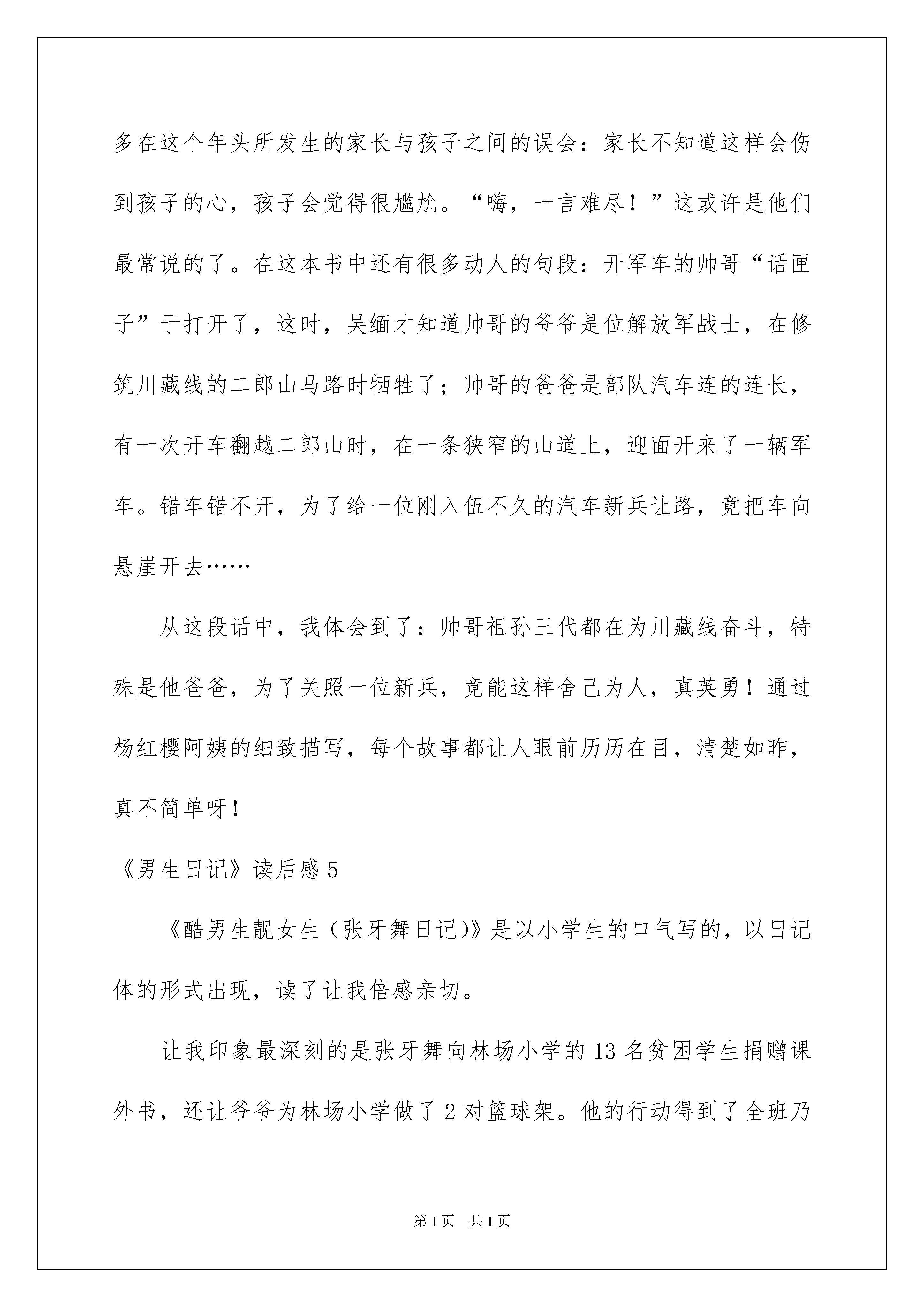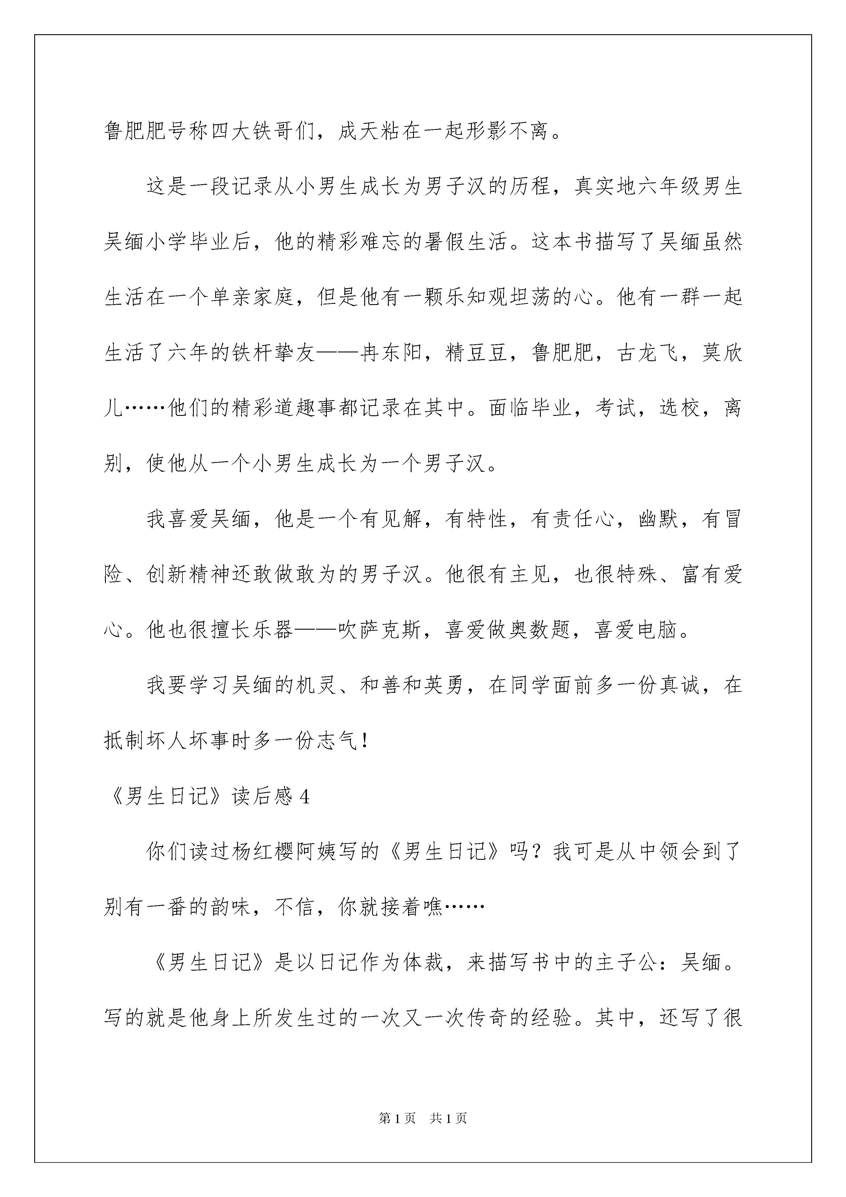 2022《男生日记》读后感《男生日记》读后感一天的时间眼看就要结束了,在你心中有什么感想呢?这时候非常有必需要写一篇日记了。如何把日记做到重点突出呢?下面是我为大家收集的《男生日记》读后感,仅供参考,欢迎大家阅读。《男生日记》读后感1在寒假里,我看了杨红樱著作的《男生日记》。这本书主要讲解并描述一个男生“吴缅”在暑假期间的难忘经验。他先和他的爸爸去了西藏,沿途发生了很多趣事,随后又起先参与初中的一些考试,还在闲暇之余实行了做饭才艺大比拼,又帮爸爸打过“工”呢。最让我记忆深刻的是他的同学宋立春考上了重点中学,却没有钱交学费9000元,于是吴缅与他的几个兄弟到“致歉公司”接单干活,又与冉冬阳等女生一拍即合,去了“流年歌厅”表演歌艺,竟然在一个暑假中赚得了将近一万五千的收入,最终,这笔钱全部用来资助宋立春和其他的贫困同学。故事中吴缅有着现代男孩的优点:他为他爸锯木条,运木料,非常能吃苦;他为同学宋立春攒学费,表现了他对他人的关爱,讲义气;他敢于走危急的西藏川运,表现出了他的志气;他对小混混大打出手,更体现了他的见义勇为…吴缅的性格应当算是现在的学生的性格榜样,现在的小学生吃一点点苦就放弃了、对同学的关爱甚少、遇到坏人立马退缩,男生应当大气、大胆、大义,而吴缅做到了。我要有他的机灵、和善和英勇,在同学面前多一份真诚,在抵制坏人坏事多一份志气!这本书真是一本有意思的、有意义的好书!《男生日记》读后感2当我读到别墅闹鬼这个日记题目时“心中好像流着冷汗,令我毛骨悚然”之前觉得特别身渗人,但不知不觉中我已被这题目吸引到文章去了,可能是题目对我的诱惑力太大了,让我不由自主的想去看个原委。读过这篇日记后让我有所感悟、有所启发。这篇日记之所以写得这么传神那是因为作者运用了写作技巧,设置了惊慌的气氛和动人心弦的文章情景或故事情节,并且在合适的环境情景中加入适当的形声词和夸张的句子就会让读者读书时的心情变得特别惊慌、肃穆。(作者的写作技巧和写作方法特别值得我去学习)本日记就是运用了这种写作方法“才更吸引我的眼球”日记中就有这种夸张的句子如:“我们都把房门关的紧紧地,气都不敢出”、“有几个晚上,夜深人静的时候,我们听见有鬼叫的声音,接着有个影子飘来飘去,那是鬼在跳舞”……日记的角落当然还有必不行少的形声词如:‘夸夸夸’、‘嗖嗖嗖’、‘嗒嗒嗒’、……这种词句把文中惊慌的气氛表现的栩栩如生特别生动。读过这篇日记让我受益非浅,不但感受了惟妙惟肖的文章,更让我感悟到了很多写作的技巧和方法,以便于以后提高我的写作水平、实力。《男生日记》读后感3《男生日记》是杨红樱阿姨在继《女生日记》后的又一本儿童长篇小说。《男生日记》不但内容丰富多彩,而且每篇文章的标题也特别吸引人,让我心中不禁立起了很多小问号,一连串的奇思妙想让我忍不住带着新奇心一章又一章得往下看。这本书的人物许多,主子公是男生吴缅,吴缅是一个很受女生欢迎的小男孩,他和古龙飞、精豆豆、鲁肥肥号称四大铁哥们,成天粘在一起形影不离。这是一段记录从小男生成长为男子汉的历程,真实地六年级男生吴缅小学毕业后,他的精彩难忘的暑假生活。这本书描写了吴缅虽然生活在一个单亲家庭,但是他有一颗乐知观坦荡的心。他有一群一起生活了六年的铁杆挚友——冉东阳,精豆豆,鲁肥肥,古龙飞,莫欣儿……他们的精彩道趣事都记录在其中。面临毕业,考试,选校,离别,使他从一个小男生成长为一个男子汉。我喜爱吴缅,他是一个有见解,有特性,有责任心,幽默,有冒险、创新精神还敢做敢为的男子汉。他很有主见,也很特殊、富有爱心。他也很擅长乐器——吹萨克斯,喜爱做奥数题,喜爱电脑。我要学习吴缅的机灵、和善和英勇,在同学面前多一份真诚,在抵制坏人坏事时多一份志气!《男生日记》读后感4你们读过杨红樱阿姨写的《男生日记》吗?我可是从中领会到了别有一番的韵味,不信,你就接着噍……《男生日记》是以日记作为体裁,来描写书中的主子公:吴缅。写的就是他身上所发生过的一次又一次传奇的经验。其中,还写了很多在这个年头所发生的家长与孩子之间的误会:家长不知道这样会伤到孩子的心,孩子会觉得很尴尬。“嗨,一言难尽!”这或许是他们最常说的了。在这本书中还有很多动人的句段:开军车的帅哥“话匣子”于打开了,这时,吴缅才知道帅哥的爷爷是位解放军战士,在修筑川藏线的二郎山马路时牺牲了;帅哥的爸爸是部队汽车连的连长,有一次开车翻越二郎山时,在一条狭窄的山道上,迎面开来了一辆军车。错车错不开,为了给一位刚入伍不久的汽车新兵让路,竟把车向悬崖开去……从这段话中,我体会到了:帅哥祖孙三代都在为川藏线奋斗,特殊是他爸爸,为了关照一位新兵,竟能这样舍己为人,真