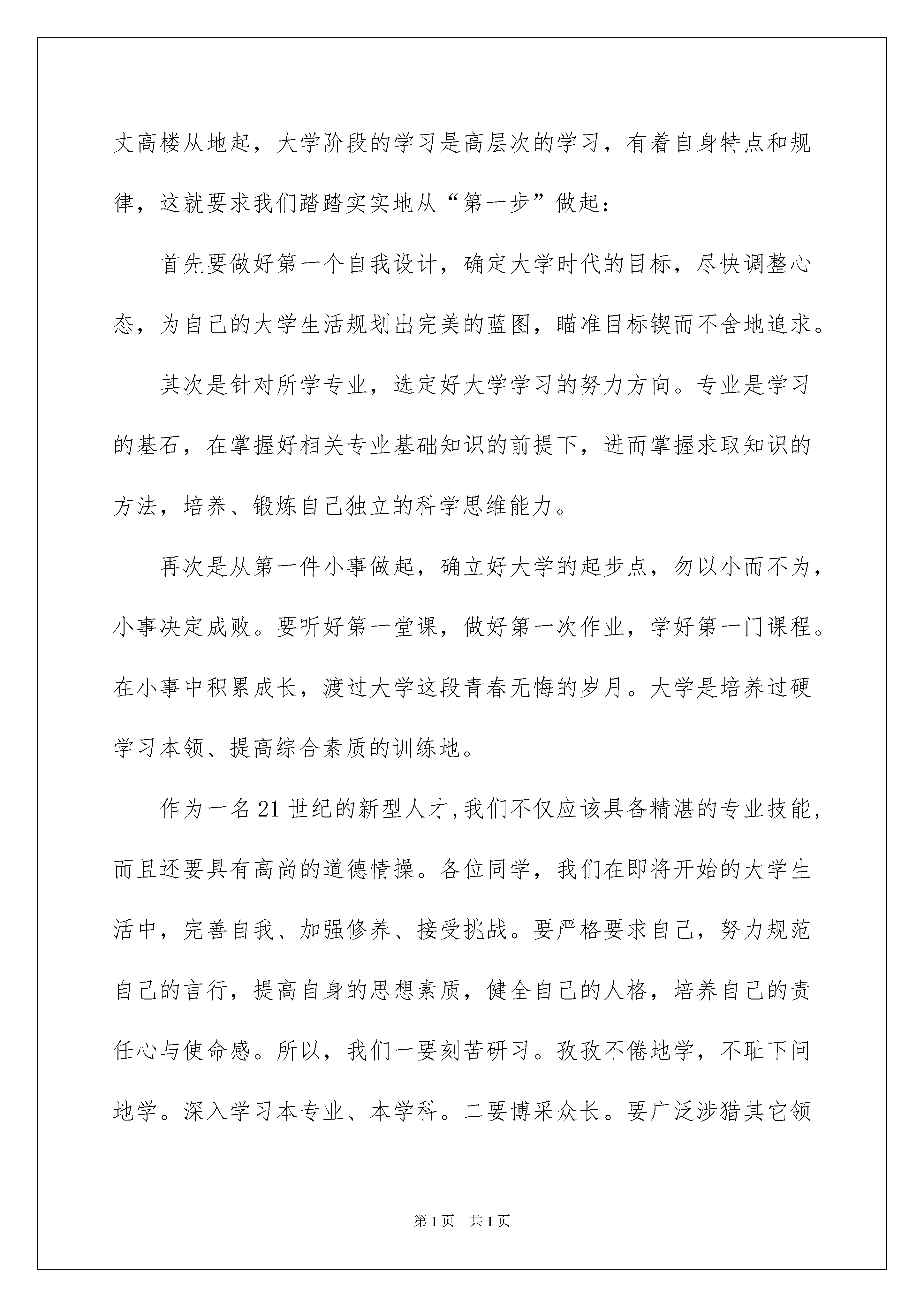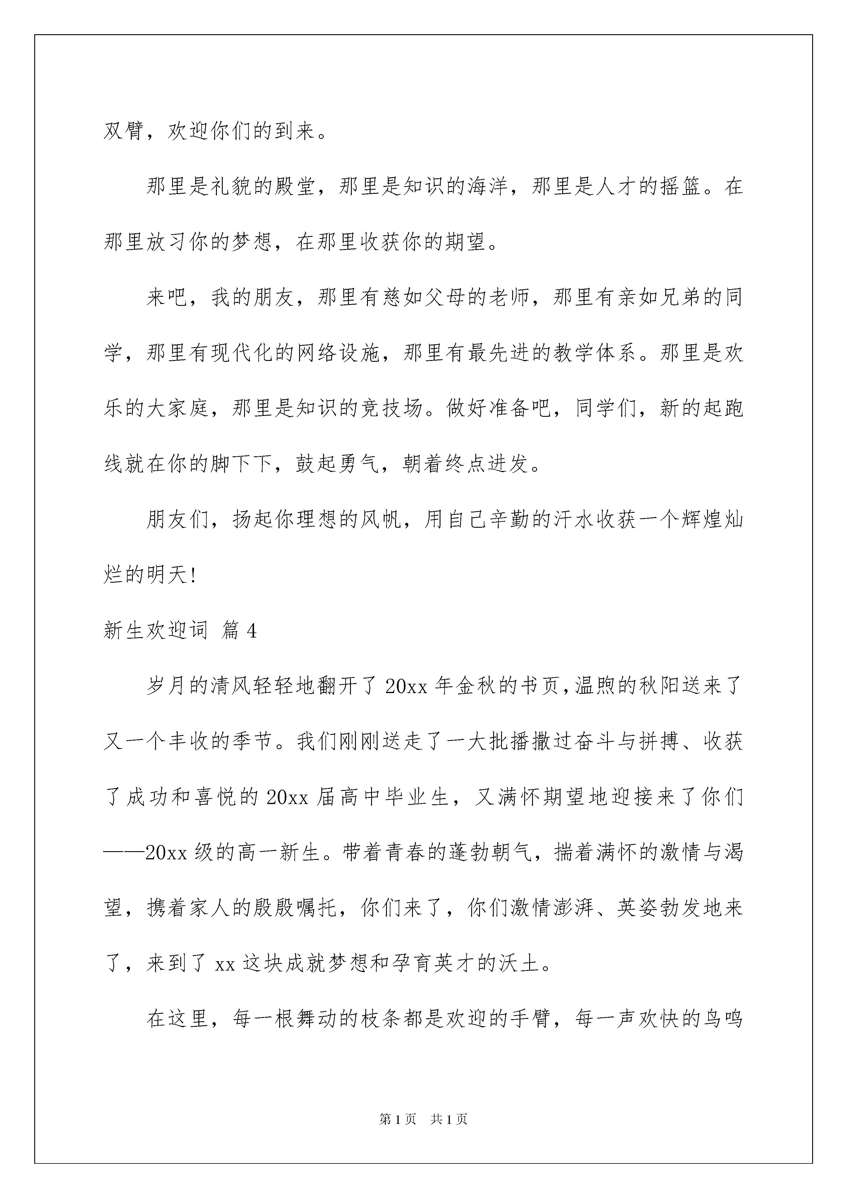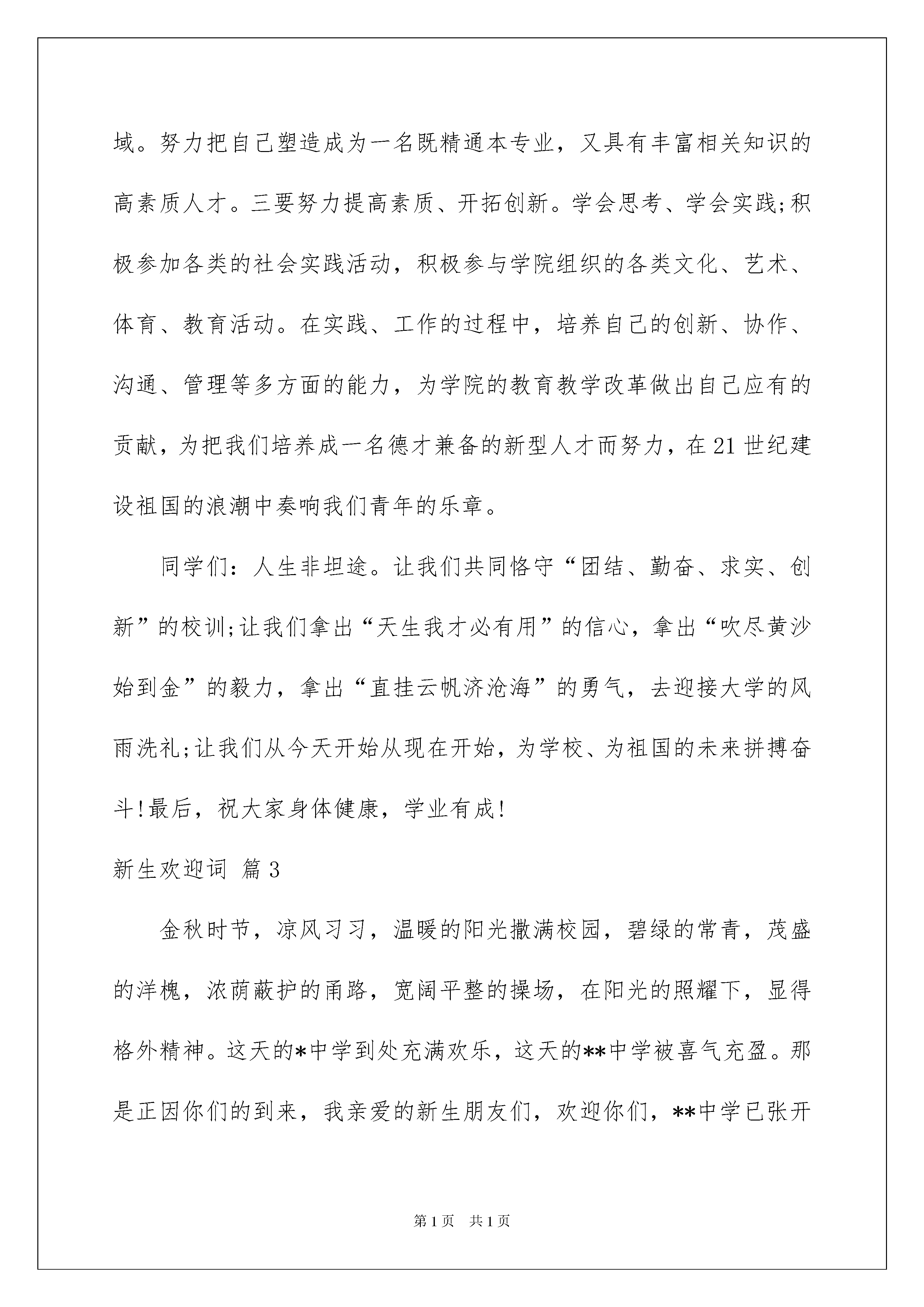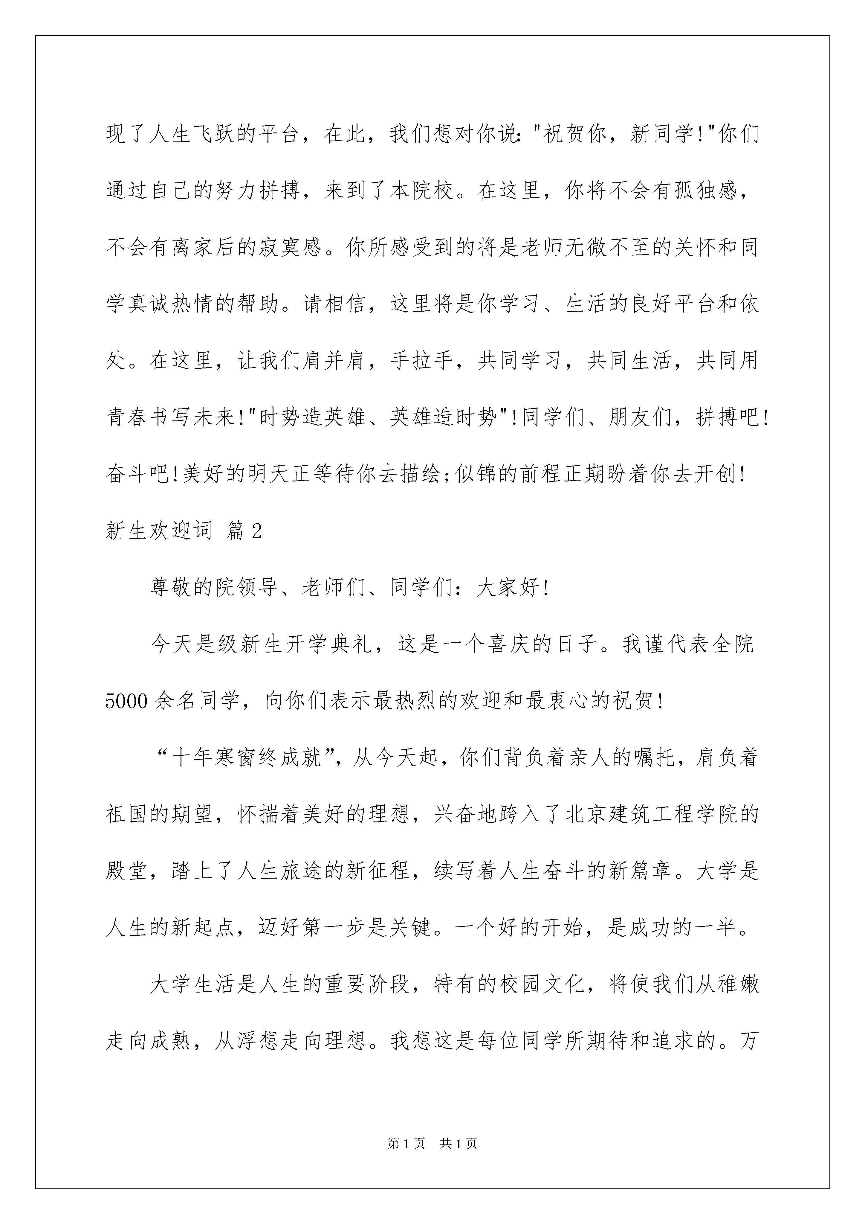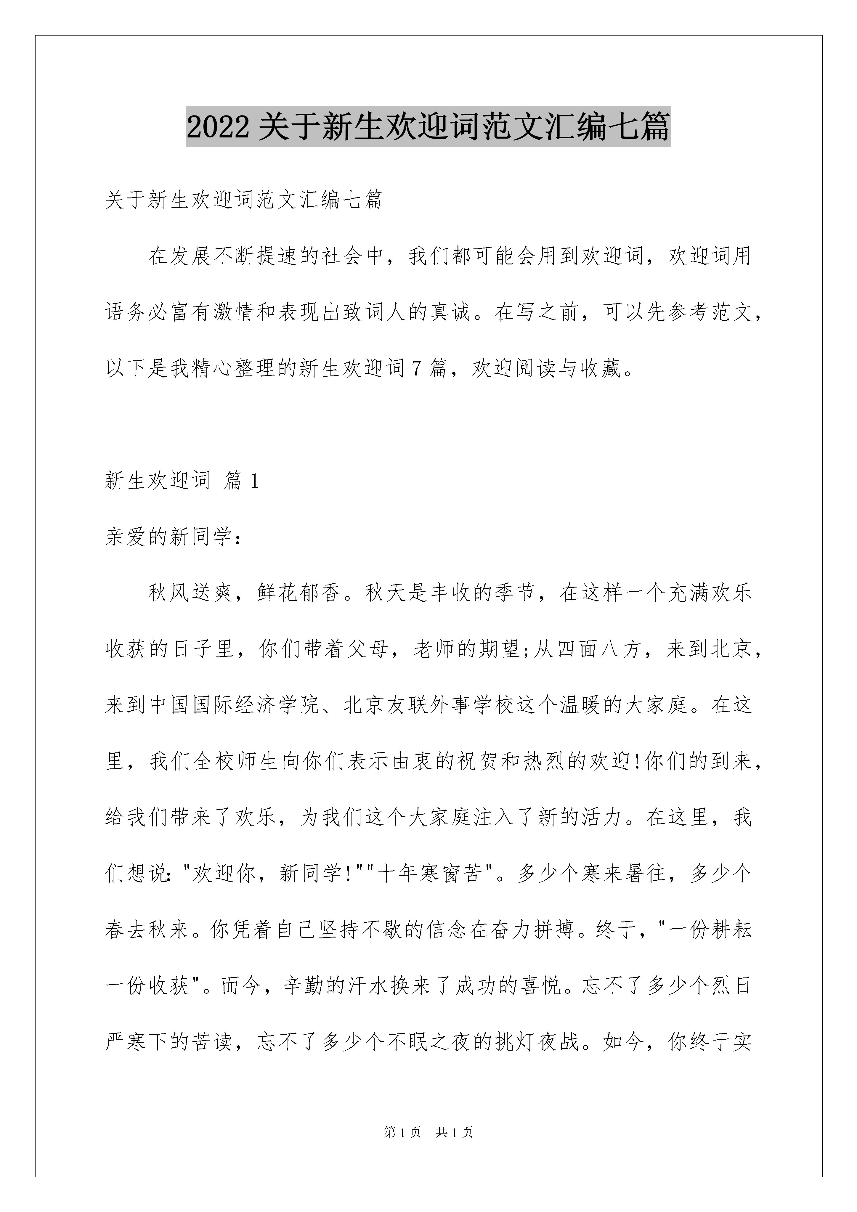 2022关于新生欢迎词范文汇编七篇关于新生欢迎词范文汇编七篇在发展不断提速的社会中,我们都可能会用到欢迎词,欢迎词用语务必富有激情和表现出致词人的真诚。在写之前,可以先参考范文,以下是我精心整理的新生欢迎词7篇,欢迎阅读与收藏。新生欢迎词篇1亲爱的新同学:秋风送爽,鲜花郁香。秋天是丰收的季节,在这样一个充满欢乐收获的日子里,你们带着父母,老师的期望;从四面八方,来到北京,来到中国国际经济学院、北京友联外事学校这个温暖的大家庭。在这里,我们全校师生向你们表示由衷的祝贺和热烈的欢迎!你们的到来,给我们带来了欢乐,为我们这个大家庭注入了新的活力。在这里,我们想说:"欢迎你,新同学!""十年寒窗苦"。多少个寒来暑往,多少个春去秋来。你凭着自己坚持不歇的信念在奋力拼搏。终于,"一份耕耘一份收获"。而今,辛勤的汗水换来了成功的喜悦。忘不了多少个烈日严寒下的苦读,忘不了多少个不眠之夜的挑灯夜战。如今,你终于实现了人生飞跃的平台,在此,我们想对你说:"祝贺你,新同学!"你们通过自己的努力拼搏,来到了本院校。在这里,你将不会有孤独感,不会有离家后的寂寞感。你所感受到的将是老师无微不至的关怀和同学真诚热情的帮助。请相信,这里将是你学习、生活的良好平台和依处。在这里,让我们肩并肩,手拉手,共同学习,共同生活,共同用青春书写未来!"时势造英雄、英雄造时势"!同学们、朋友们,拼搏吧!奋斗吧!美好的明天正等待你去描绘;似锦的前程正期盼着你去开创!新生欢迎词篇2尊敬的院领导、老师们、同学们:大家好!今天是级新生开学典礼,这是一个喜庆的日子。我谨代表全院5000余名同学,向你们表示最热烈的欢迎和最衷心的祝贺!“十年寒窗终成就”,从今天起,你们背负着亲人的嘱托,肩负着祖国的期望,怀揣着美好的理想,兴奋地跨入了北京建筑工程学院的殿堂,踏上了人生旅途的新征程,续写着人生奋斗的新篇章。大学是人生的新起点,迈好第一步是关键。一个好的开始,是成功的一半。大学生活是人生的重要阶段,特有的校园文化,将使我们从稚嫩走向成熟,从浮想走向理想。我想这是每位同学所期待和追求的。万丈高楼从地起,大学阶段的学习是高层次的学习,有着自身特点和规律,这就要求我们踏踏实实地从“第一步”做起:首先要做好第一个自我设计,确定大学时代的目标,尽快调整心态,为自己的大学生活规划出完美的蓝图,瞄准目标锲而不舍地追求。其次是针对所学专业,选定好大学学习的努力方向。专业是学习的基石,在掌握好相关专业基础知识的前提下,进而掌握求取知识的方法,培养、锻炼自己独立的科学思维能力。再次是从第一件小事做起,确立好大学的起步点,勿以小而不为,小事决定成败。要听好第一堂课,做好第一次作业,学好第一门课程。在小事中积累成长,渡过大学这段青春无悔的岁月。大学是培养过硬学习本领、提高综合素质的训练地。作为一名21世纪的新型人才,我们不仅应该具备精湛的专业技能,而且还要具有高尚的道德情操。各位同学,我们在即将开始的大学生活中,完善自我、加强修养、接受挑战。要严格要求自己,努力规范自己的言行,提高自身的思想素质,健全自己的人格,培养自己的责任心与使命感。所以,我们一要刻苦研习。孜孜不倦地学,不耻下问地学。深入学习本专业、本学科。二要博采众长。要广泛涉猎其它领域。努力把自己塑造成为一名既精通本专业,又具有丰富相关知识的高素质人才。三要努力提高素质、开拓创新。学会思考、学会实践;积极参加各类的社会实践活动,积极参与学院组织的各类文化、艺术、体育、教育活动。在实践、工作的过程中,培养自己的创新、协作、沟通、管理等多方面的能力,为学院的教育教学改革做出自己应有的贡献,为把我们培养成一名德才兼备的新型人才而努力,在21世纪建设祖国的浪潮中奏响我们青年的乐章。同学们:人生非坦途。让我们共同恪守“团结、勤奋、求实、创新”的校训;让我们拿出“天生我才必有用”的信心,拿出“吹尽黄沙始到金”的毅力,拿出“直挂云帆济沧海”的勇气,去迎接大学的风雨洗礼;让我们从今天开始从现在开始,为学校、为祖国的未来拼搏奋斗!最后,祝大家身体健康,学业有成!新生欢迎词篇3金秋时节,凉风习习,温暖的阳光撒满校园,碧绿的常青,茂盛的洋槐,浓荫蔽护的甬路,宽阔平整的操场,在阳光的照耀下,显得格外精神。这天的*中学到处充满欢乐,这天的**中学被喜气充盈。那是正因你们的到来,我亲爱的新生朋友们,欢迎你们,**中学已张开双臂,欢迎你们的到来。那里是礼貌的殿堂,那里是知识的海洋,那里是人才的摇篮。在那里放习你的梦想,在那里收获你的期望。来吧,我的朋友,那里有慈如父母的老师,那里有亲如兄弟的同学,那里有现代化的网络设施,那里有最