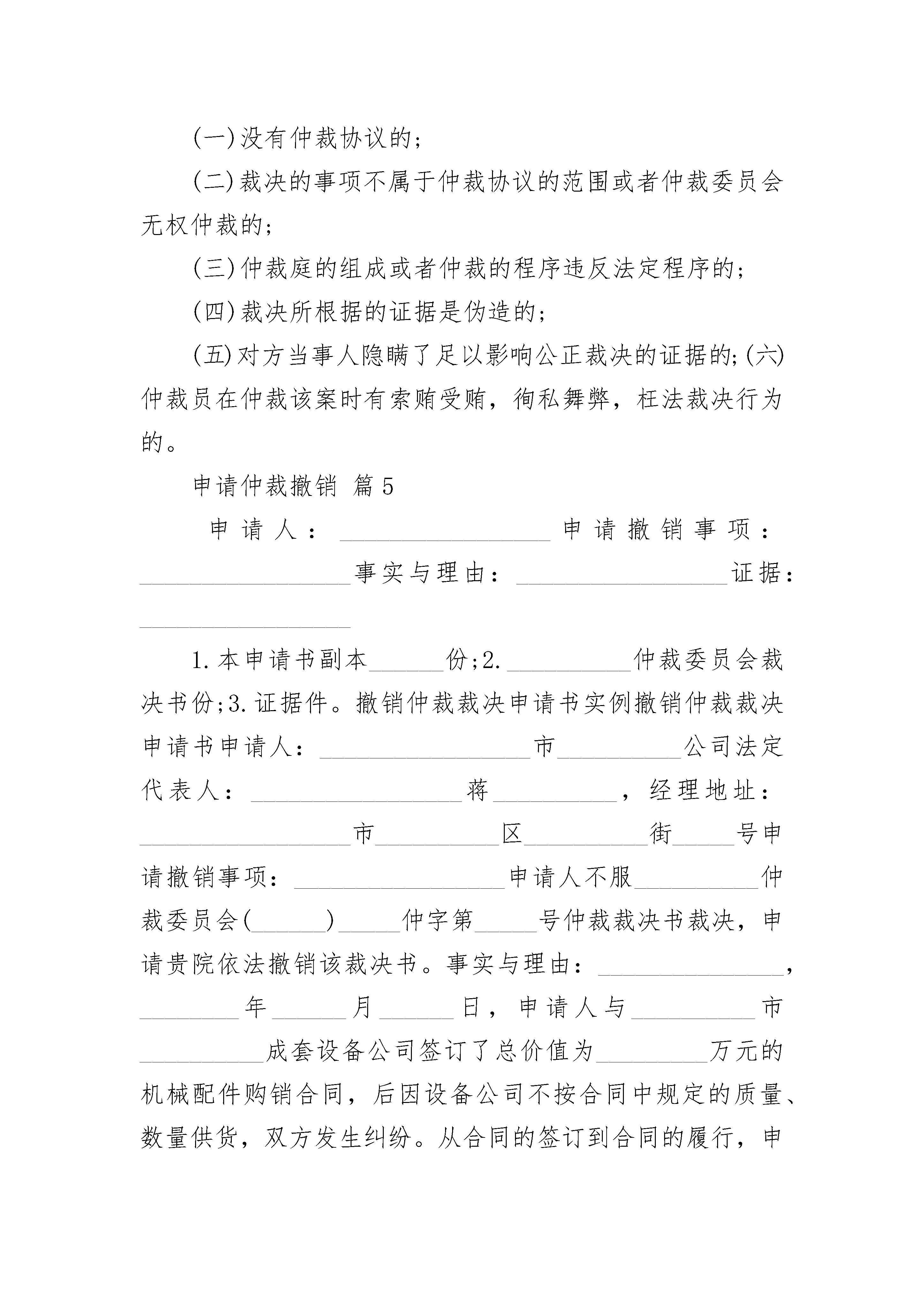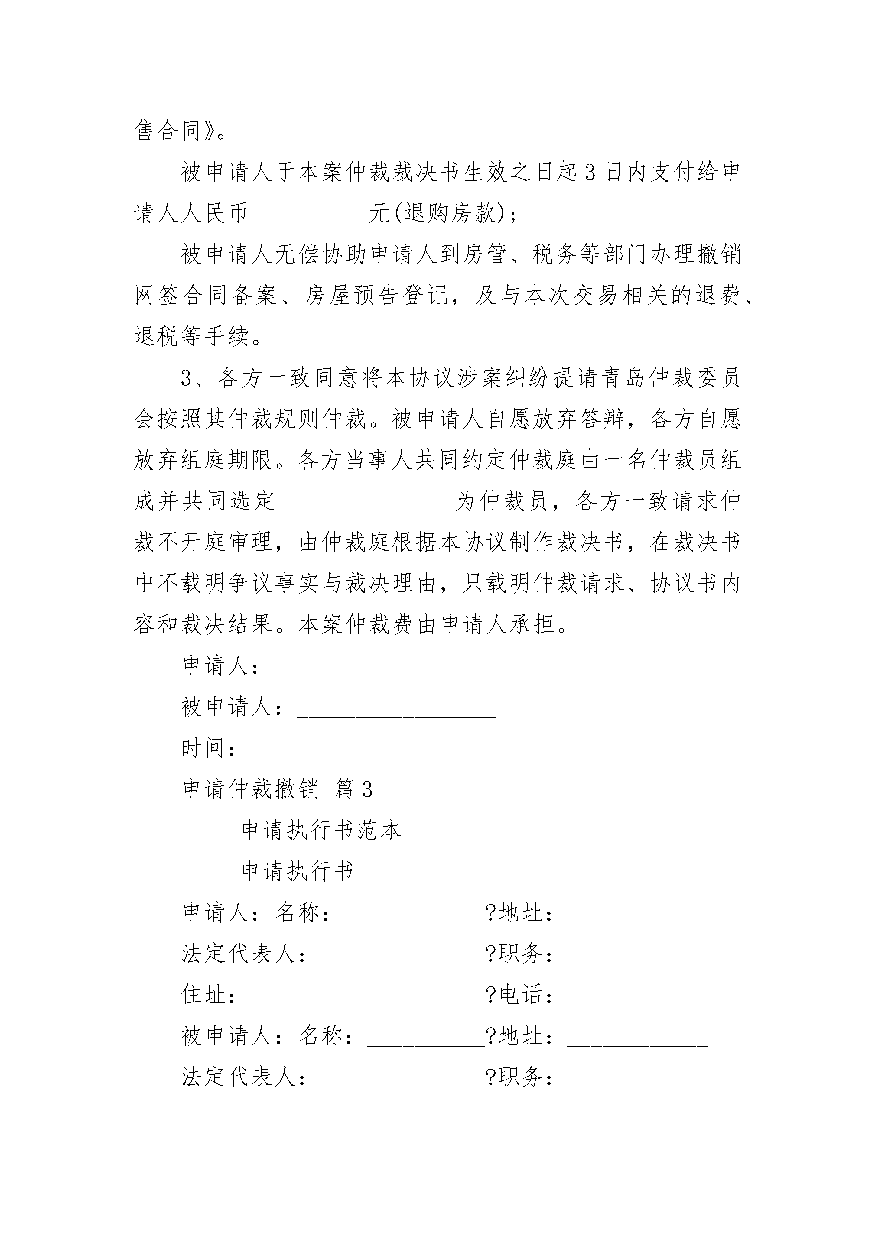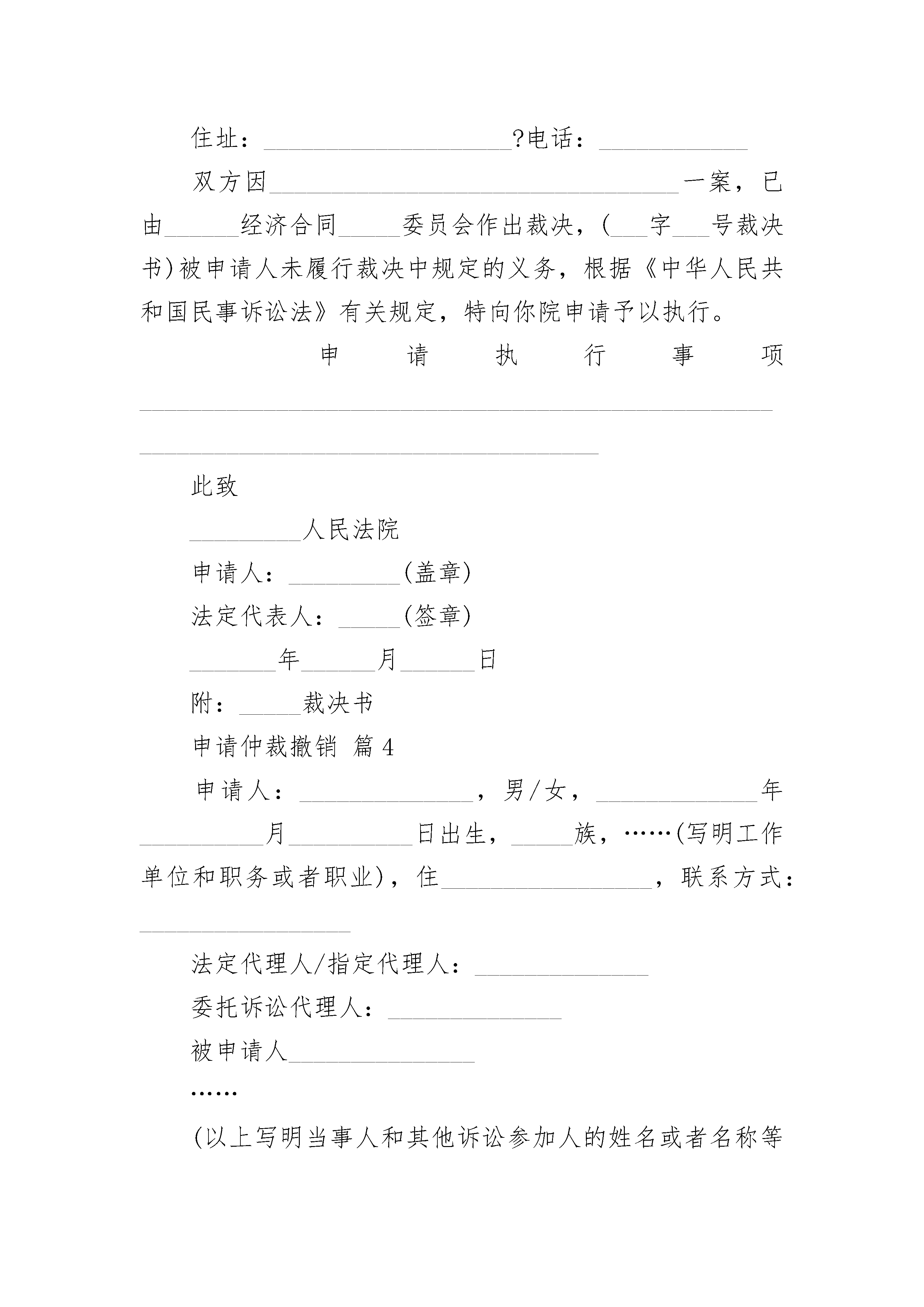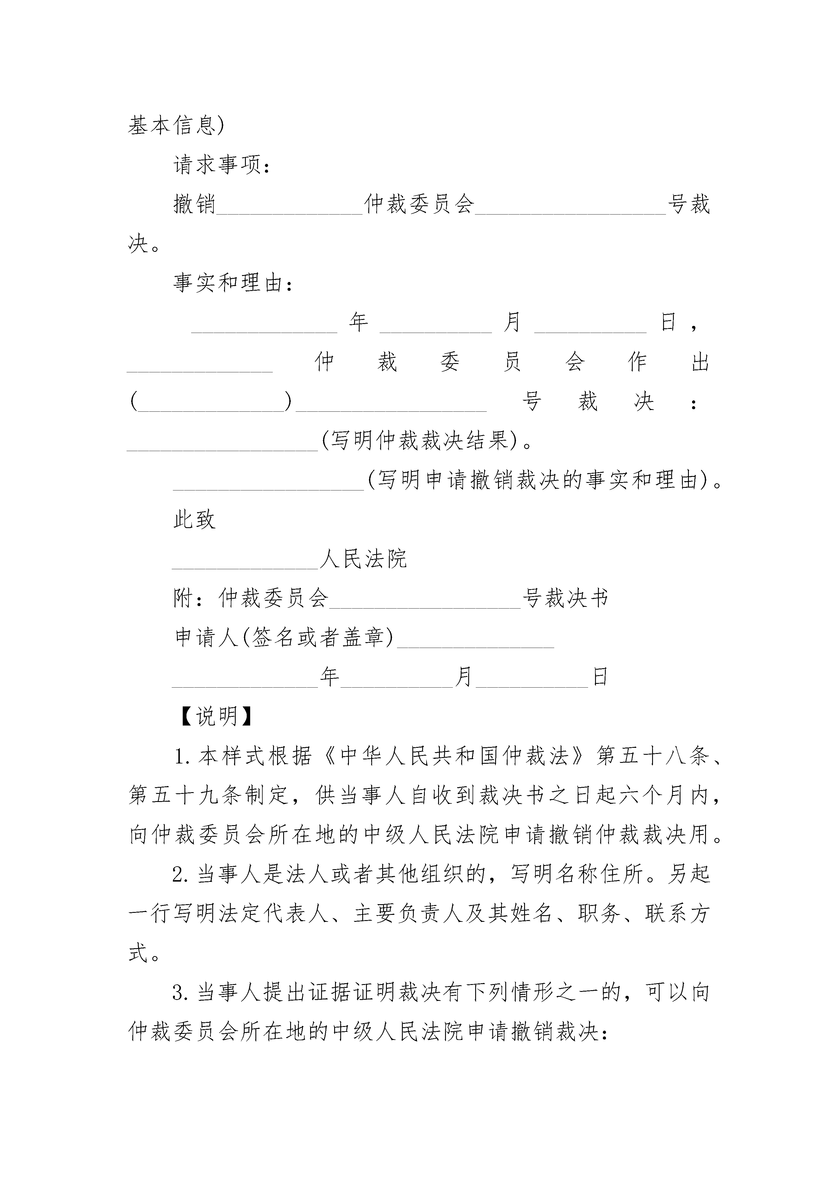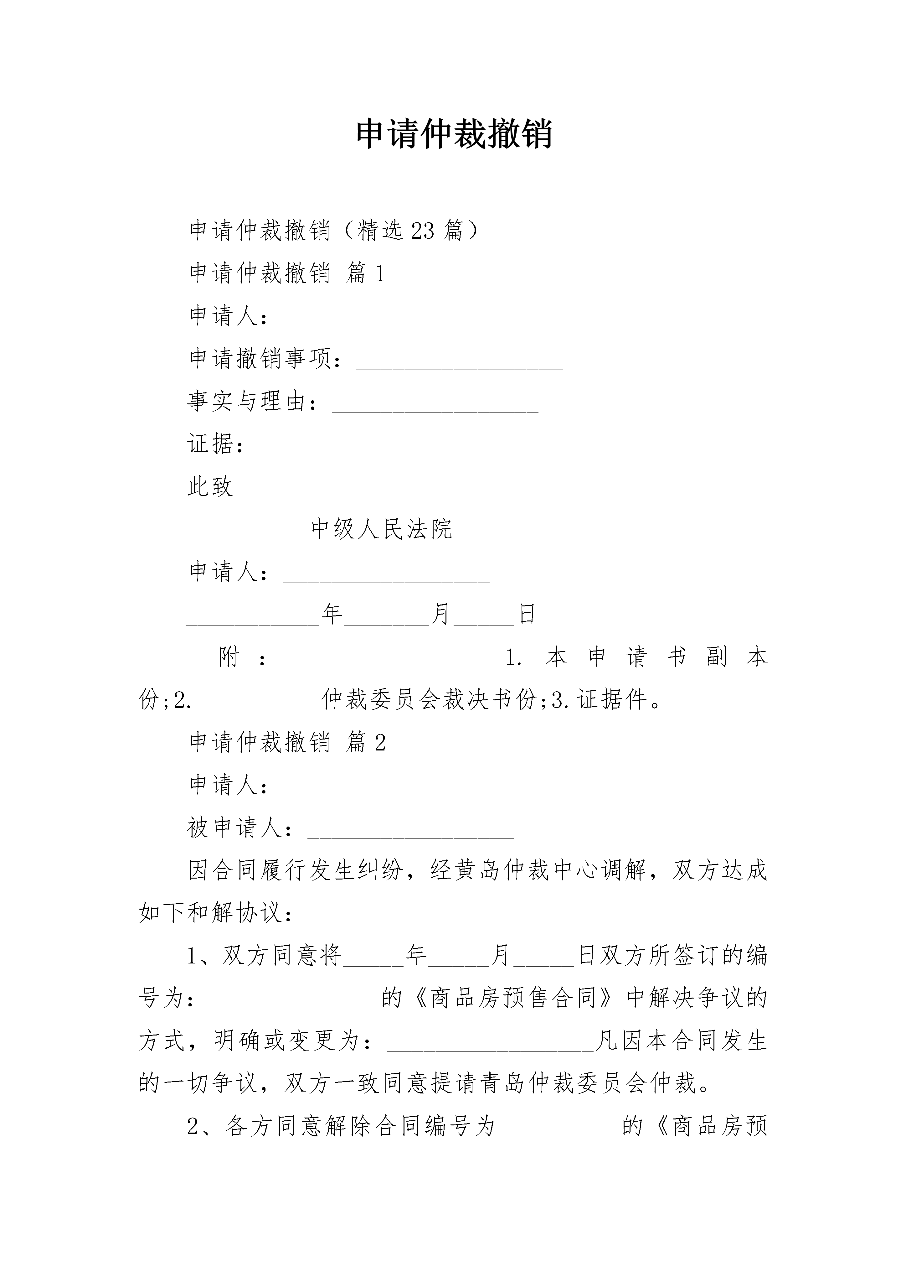 申请仲裁撤销申请仲裁撤销(精选23篇)申请仲裁撤销篇1申请人:_________________申请撤销事项:_________________事实与理由:_________________证据:_________________此致__________中级人民法院申请人:____________________________年_______月_____日附:_________________1.本申请书副本份;2.__________仲裁委员会裁决书份;3.证据件。申请仲裁撤销篇2申请人:_________________被申请人:_________________因合同履行发生纠纷,经黄岛仲裁中心调解,双方达成如下和解协议:_________________1、双方同意将_____年_____月_____日双方所签订的编号为:______________的《商品房预售合同》中解决争议的方式,明确或变更为:_________________凡因本合同发生的一切争议,双方一致同意提请青岛仲裁委员会仲裁。2、各方同意解除合同编号为__________的《商品房预售合同》。被申请人于本案仲裁裁决书生效之日起3日内支付给申请人人民币__________元(退购房款);被申请人无偿协助申请人到房管、税务等部门办理撤销网签合同备案、房屋预告登记,及与本次交易相关的退费、退税等手续。3、各方一致同意将本协议涉案纠纷提请青岛仲裁委员会按照其仲裁规则仲裁。被申请人自愿放弃答辩,各方自愿放弃组庭期限。各方当事人共同约定仲裁庭由一名仲裁员组成并共同选定_______________为仲裁员,各方一致请求仲裁不开庭审理,由仲裁庭根据本协议制作裁决书,在裁决书中不载明争议事实与裁决理由,只载明仲裁请求、协议书内容和裁决结果。本案仲裁费由申请人承担。申请人:_________________被申请人:_________________时间:_________________申请仲裁撤销篇3_____申请执行书范本_____申请执行书申请人:名称:____________?地址:____________法定代表人:______________?职务:____________住址:____________________?电话:____________被申请人:名称:__________?地址:____________法定代表人:______________?职务:____________住址:____________________?电话:____________双方因_________________________________一案,已由______经济合同_____委员会作出裁决,(___字___号裁决书)被申请人未履行裁决中规定的义务,根据《中华人民共和国民事诉讼法》有关规定,特向你院申请予以执行。申请执行事项________________________________________________________________________________________此致_________人民法院申请人:_________(盖章)法定代表人:_____(签章)_______年______月______日附:_____裁决书申请仲裁撤销篇4申请人:______________,男/女,_____________年__________月__________日出生,_____族,……(写明工作单位和职务或者职业),住_________________,联系方式:_________________法定代理人/指定代理人:______________委托诉讼代理人:______________被申请人_______________……(以上写明当事人和其他诉讼参加人的姓名或者名称等基本信息)请求事项:撤销_____________仲裁委员会_________________号裁决。事实和理由:_____________年__________月__________日,_____________仲裁委员会作出(_____________)_________________号裁决:_________________(写明仲裁裁决结果)。_________________(写明申请撤销裁决的事实和理由)。此致_____________人民法院附:仲裁委员会_________________号裁决书申请人(签名或者盖章)___________________________年__________月__________日【说明】1.本样式根据《中华人民共和国仲裁法》第五十八条、第五十九条制定,供当事人自收到裁决书之日起六个月内,向仲裁委员会所在