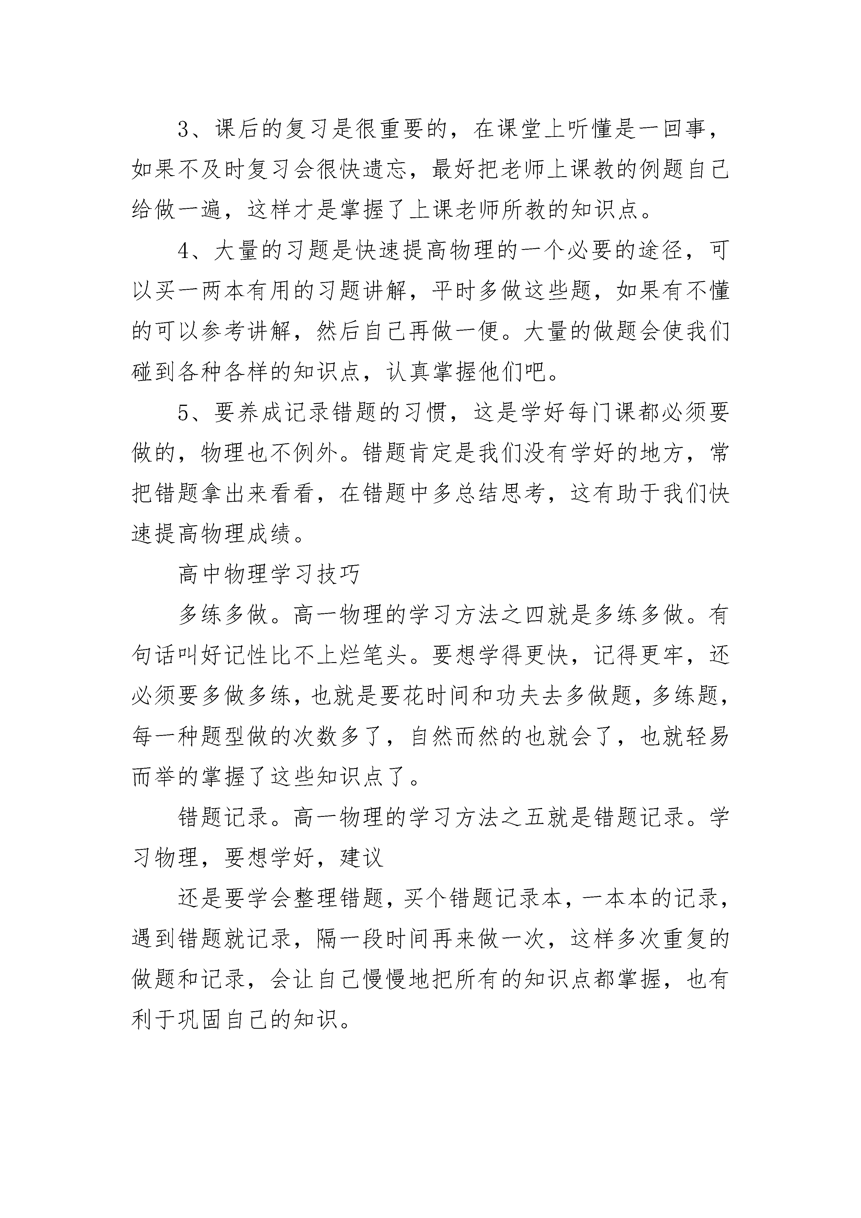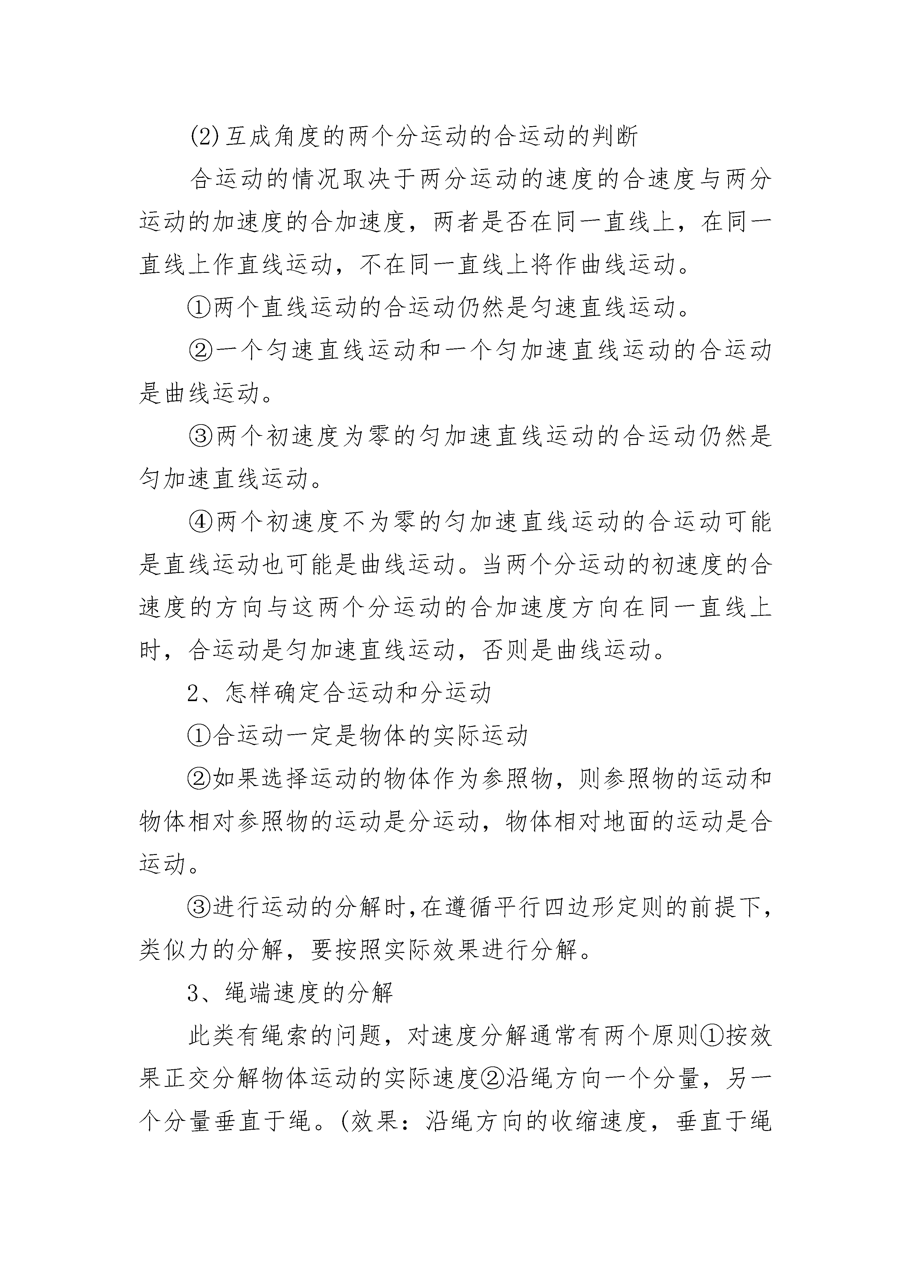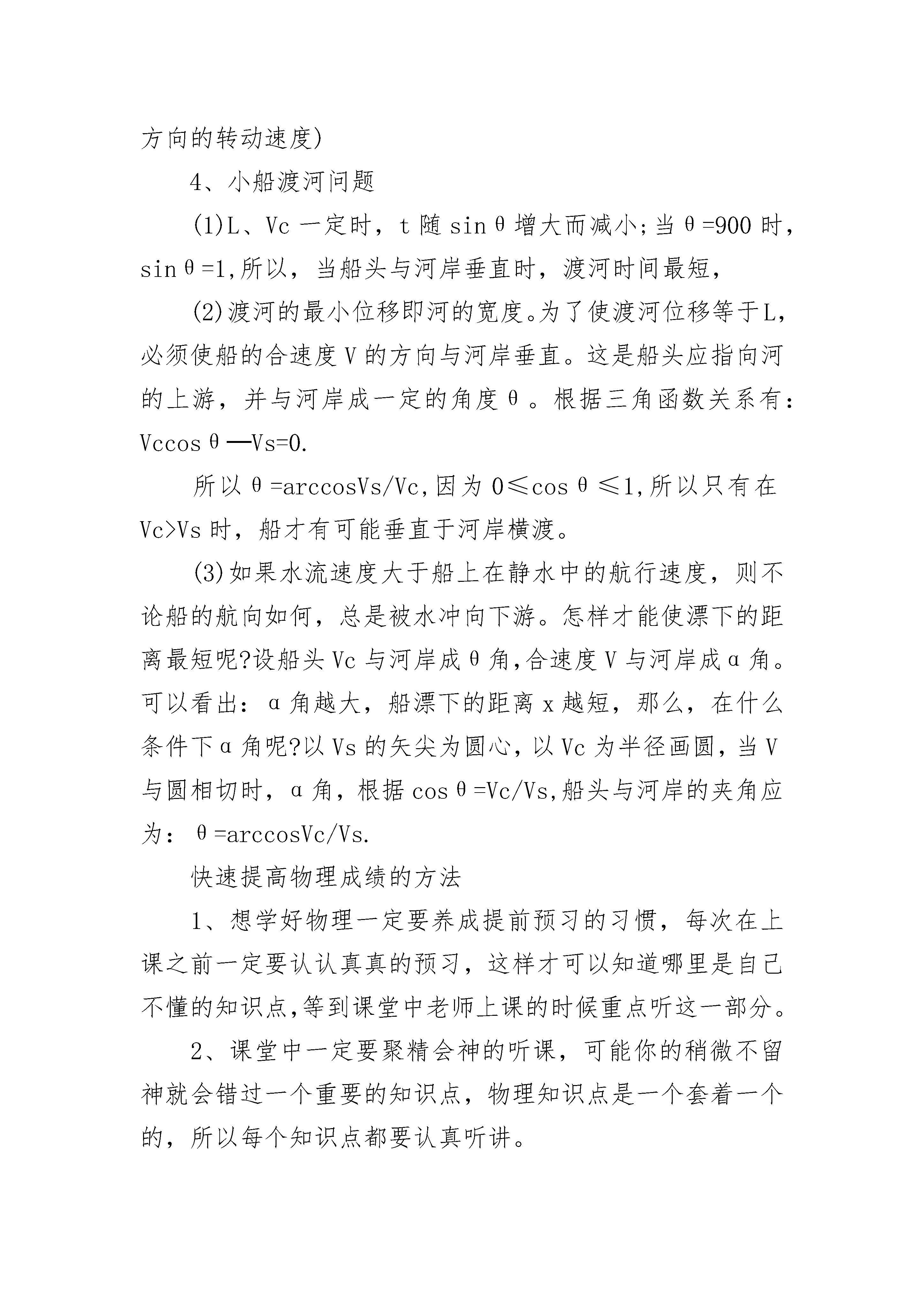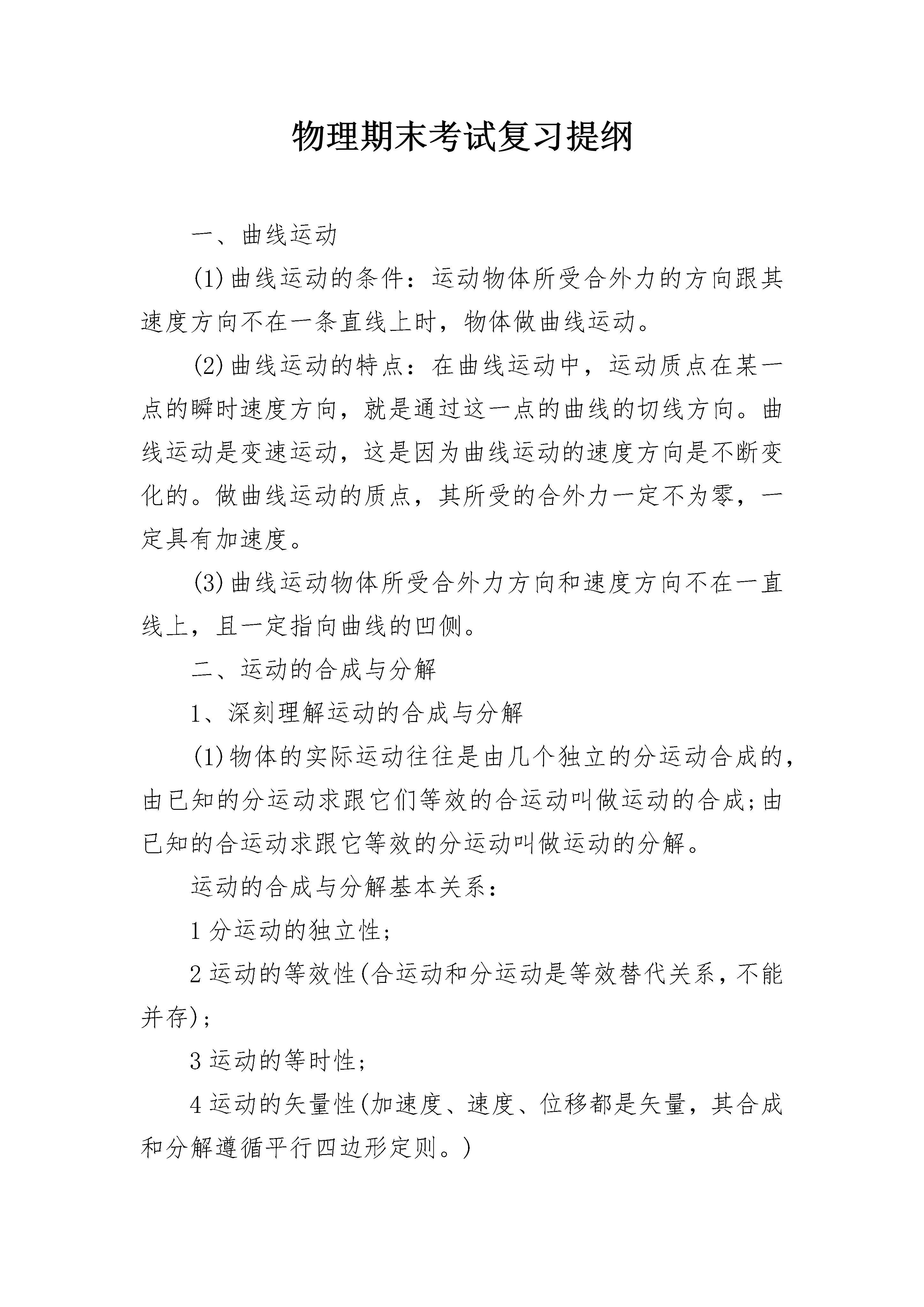 物理期末考试复习提纲一、曲线运动(1)曲线运动的条件:运动物体所受合外力的方向跟其速度方向不在一条直线上时,物体做曲线运动。(2)曲线运动的特点:在曲线运动中,运动质点在某一点的瞬时速度方向,就是通过这一点的曲线的切线方向。曲线运动是变速运动,这是因为曲线运动的速度方向是不断变化的。做曲线运动的质点,其所受的合外力一定不为零,一定具有加速度。(3)曲线运动物体所受合外力方向和速度方向不在一直线上,且一定指向曲线的凹侧。二、运动的合成与分解1、深刻理解运动的合成与分解(1)物体的实际运动往往是由几个独立的分运动合成的,由已知的分运动求跟它们等效的合运动叫做运动的合成;由已知的合运动求跟它等效的分运动叫做运动的分解。运动的合成与分解基本关系:1分运动的独立性;2运动的等效性(合运动和分运动是等效替代关系,不能并存);3运动的等时性;4运动的矢量性(加速度、速度、位移都是矢量,其合成和分解遵循平行四边形定则。)(2)互成角度的两个分运动的合运动的判断合运动的情况取决于两分运动的速度的合速度与两分运动的加速度的合加速度,两者是否在同一直线上,在同一直线上作直线运动,不在同一直线上将作曲线运动。①两个直线运动的合运动仍然是匀速直线运动。②一个匀速直线运动和一个匀加速直线运动的合运动是曲线运动。③两个初速度为零的匀加速直线运动的合运动仍然是匀加速直线运动。④两个初速度不为零的匀加速直线运动的合运动可能是直线运动也可能是曲线运动。当两个分运动的初速度的合速度的方向与这两个分运动的合加速度方向在同一直线上时,合运动是匀加速直线运动,否则是曲线运动。2、怎样确定合运动和分运动①合运动一定是物体的实际运动②如果选择运动的物体作为参照物,则参照物的运动和物体相对参照物的运动是分运动,物体相对地面的运动是合运动。③进行运动的分解时,在遵循平行四边形定则的前提下,类似力的分解,要按照实际效果进行分解。3、绳端速度的分解此类有绳索的问题,对速度分解通常有两个原则①按效果正交分解物体运动的实际速度②沿绳方向一个分量,另一个分量垂直于绳。(效果:沿绳方向的收缩速度,垂直于绳方向的转动速度)4、小船渡河问题(1)L、Vc一定时,t随sinθ增大而减小;当θ=900时,sinθ=1,所以,当船头与河岸垂直时,渡河时间最短,(2)渡河的最小位移即河的宽度。为了使渡河位移等于L,必须使船的合速度V的方向与河岸垂直。这是船头应指向河的上游,并与河岸成一定的角度θ。根据三角函数关系有:Vccosθ─Vs=0.所以θ=arccosVs/Vc,因为0≤cosθ≤1,所以只有在Vc>Vs时,船才有可能垂直于河岸横渡。(3)如果水流速度大于船上在静水中的航行速度,则不论船的航向如何,总是被水冲向下游。怎样才能使漂下的距离最短呢?设船头Vc与河岸成θ角,合速度V与河岸成α角。可以看出:α角越大,船漂下的距离x越短,那么,在什么条件下α角呢?以Vs的矢尖为圆心,以Vc为半径画圆,当V与圆相切时,α角,根据cosθ=Vc/Vs,船头与河岸的夹角应为:θ=arccosVc/Vs.快速提高物理成绩的方法1、想学好物理一定要养成提前预习的习惯,每次在上课之前一定要认认真真的预习,这样才可以知道哪里是自己不懂的知识点,等到课堂中老师上课的时候重点听这一部分。2、课堂中一定要聚精会神的听课,可能你的稍微不留神就会错过一个重要的知识点,物理知识点是一个套着一个的,所以每个知识点都要认真听讲。3、课后的复习是很重要的,在课堂上听懂是一回事,如果不及时复习会很快遗忘,最好把老师上课教的例题自己给做一遍,这样才是掌握了上课老师所教的知识点。4、大量的习题是快速提高物理的一个必要的途径,可以买一两本有用的习题讲解,平时多做这些题,如果有不懂的可以参考讲解,然后自己再做一便。大量的做题会使我们碰到各种各样的知识点,认真掌握他们吧。5、要养成记录错题的习惯,这是学好每门课都必须要做的,物理也不例外。错题肯定是我们没有学好的地方,常把错题拿出来看看,在错题中多总结思考,这有助于我们快速提高物理成绩。高中物理学习技巧多练多做。高一物理的学习方法之四就是多练多做。有句话叫好记性比不上烂笔头。要想学得更快,记得更牢,还必须要多做多练,也就是要花时间和功夫去多做题,多练题,每一种题型做的次数多了,自然而然的也就会了,也就轻易而举的掌握了这些知识点了。错题记录。高一物理的学习方法之五就是错题记录。学习物理,要想学好,建议还是要学会整理错题,买个错题记录本,一本本的记录,遇到错题就记录,隔一段时间再来做一次,这样多次重复的做题和记录,会让自己慢慢地把所有的知识点都掌握,也有利于巩固自己的知识。
