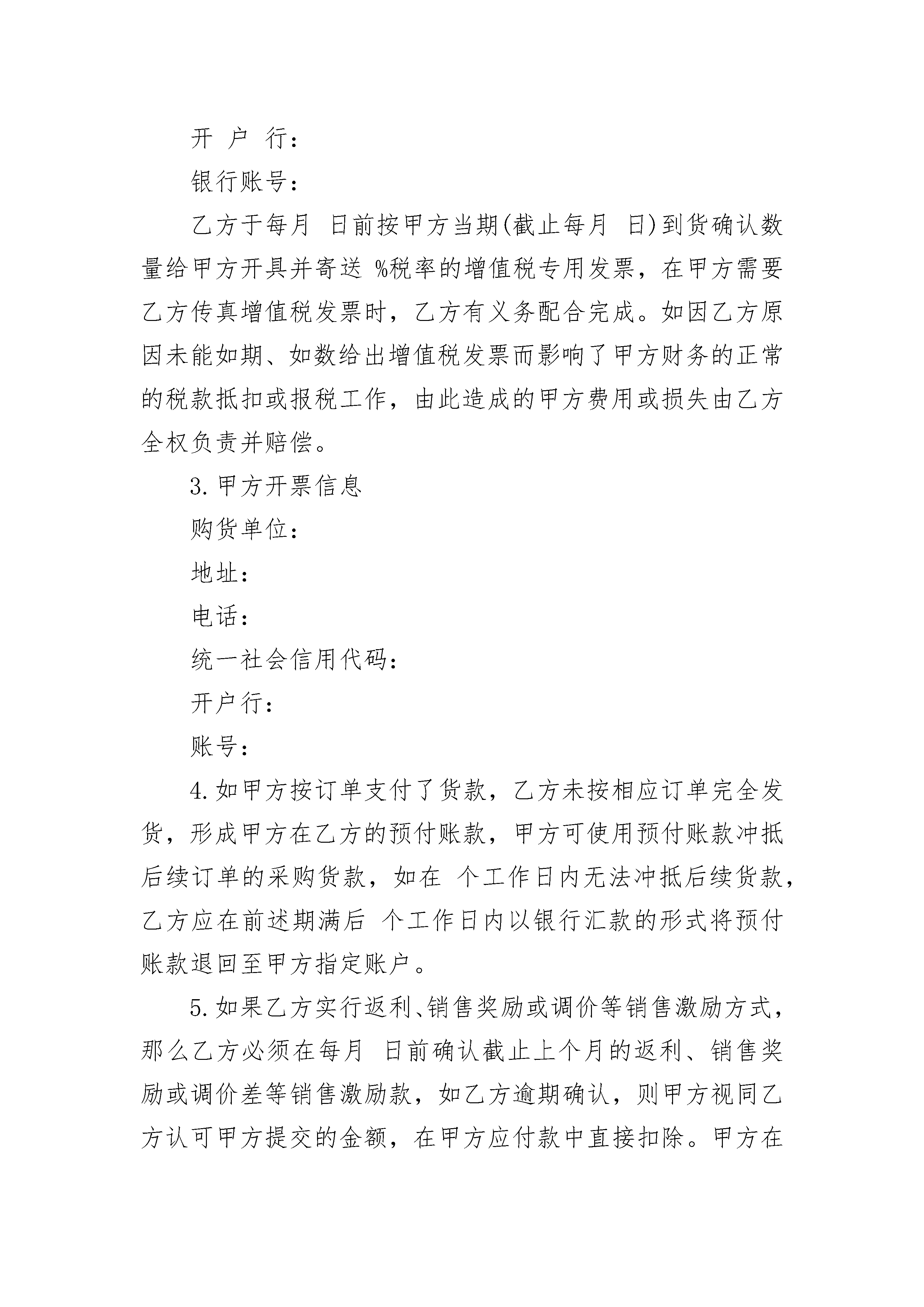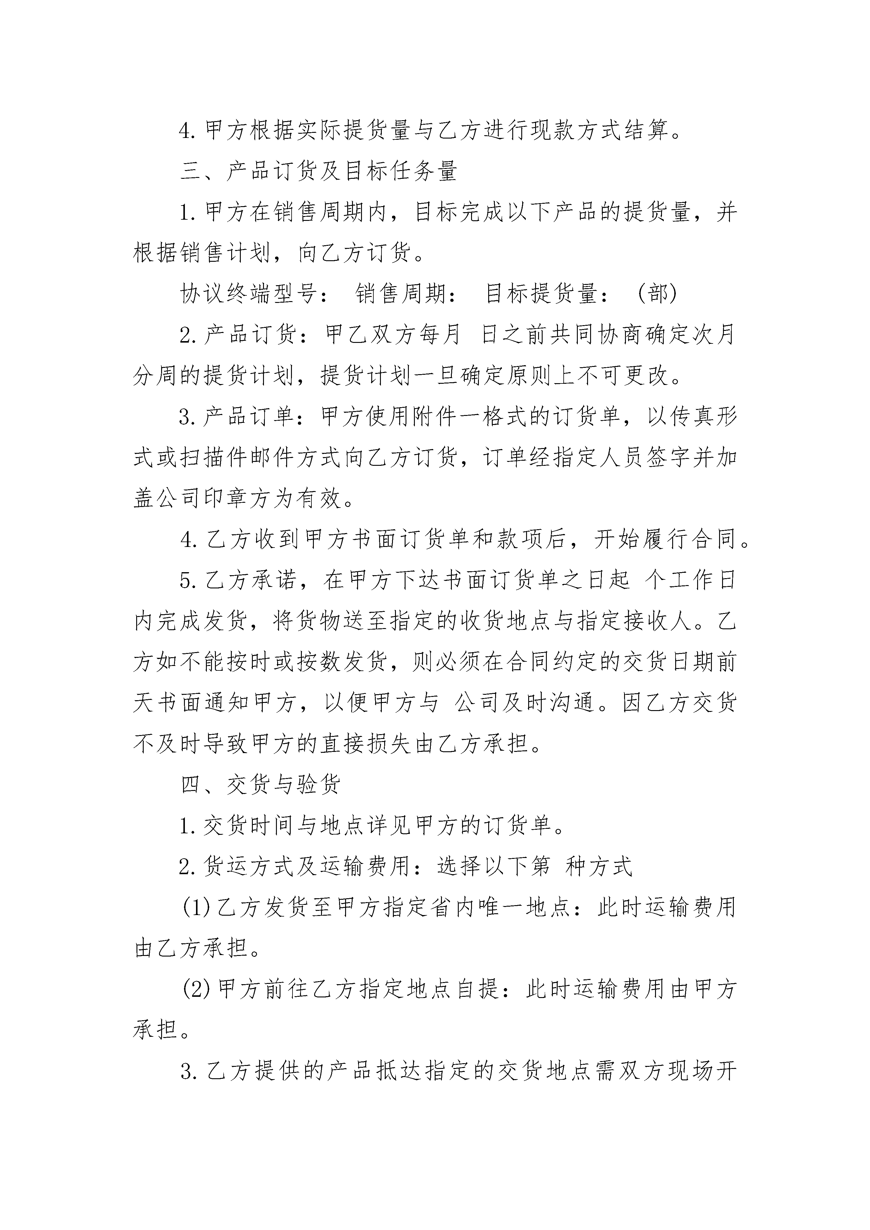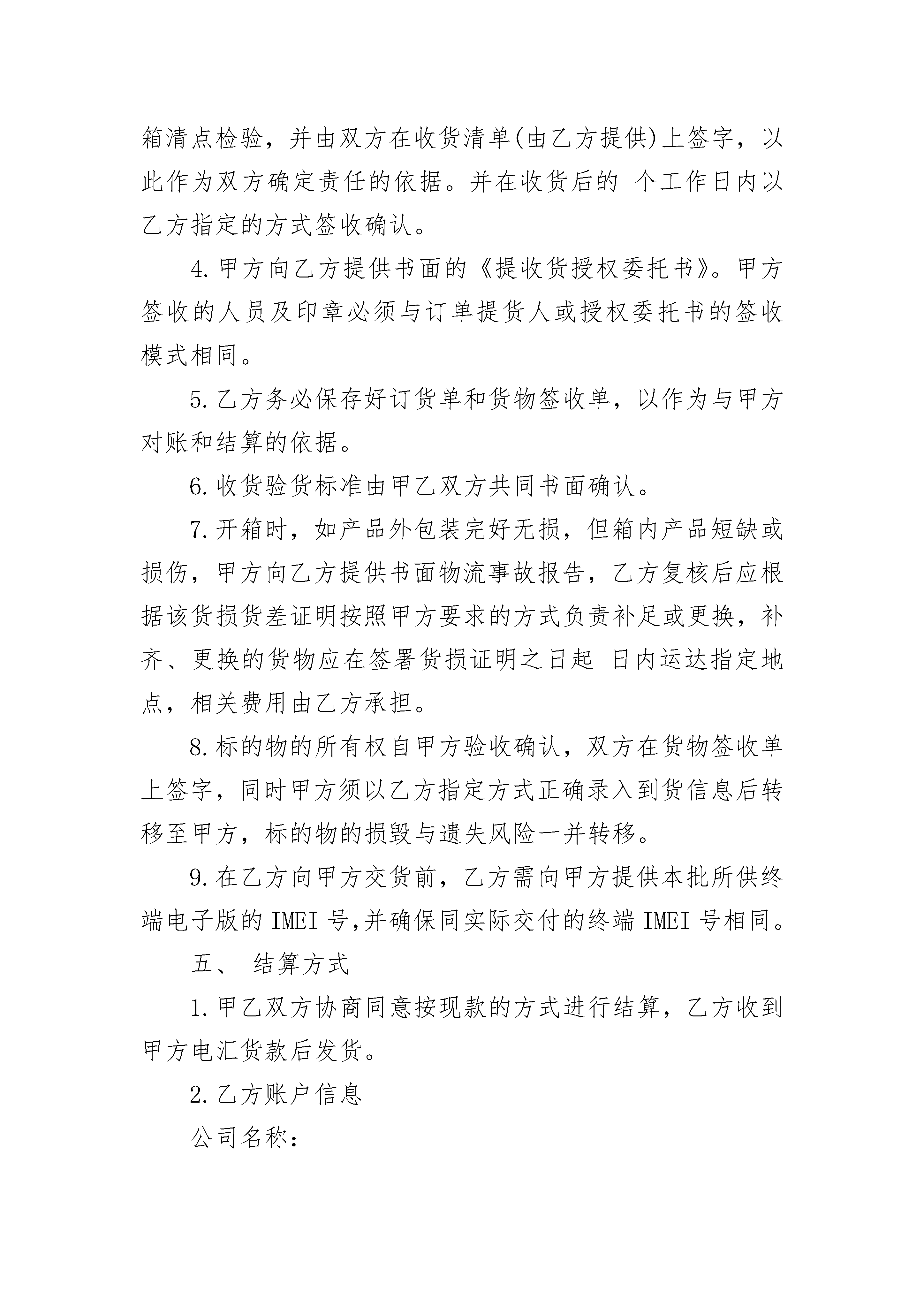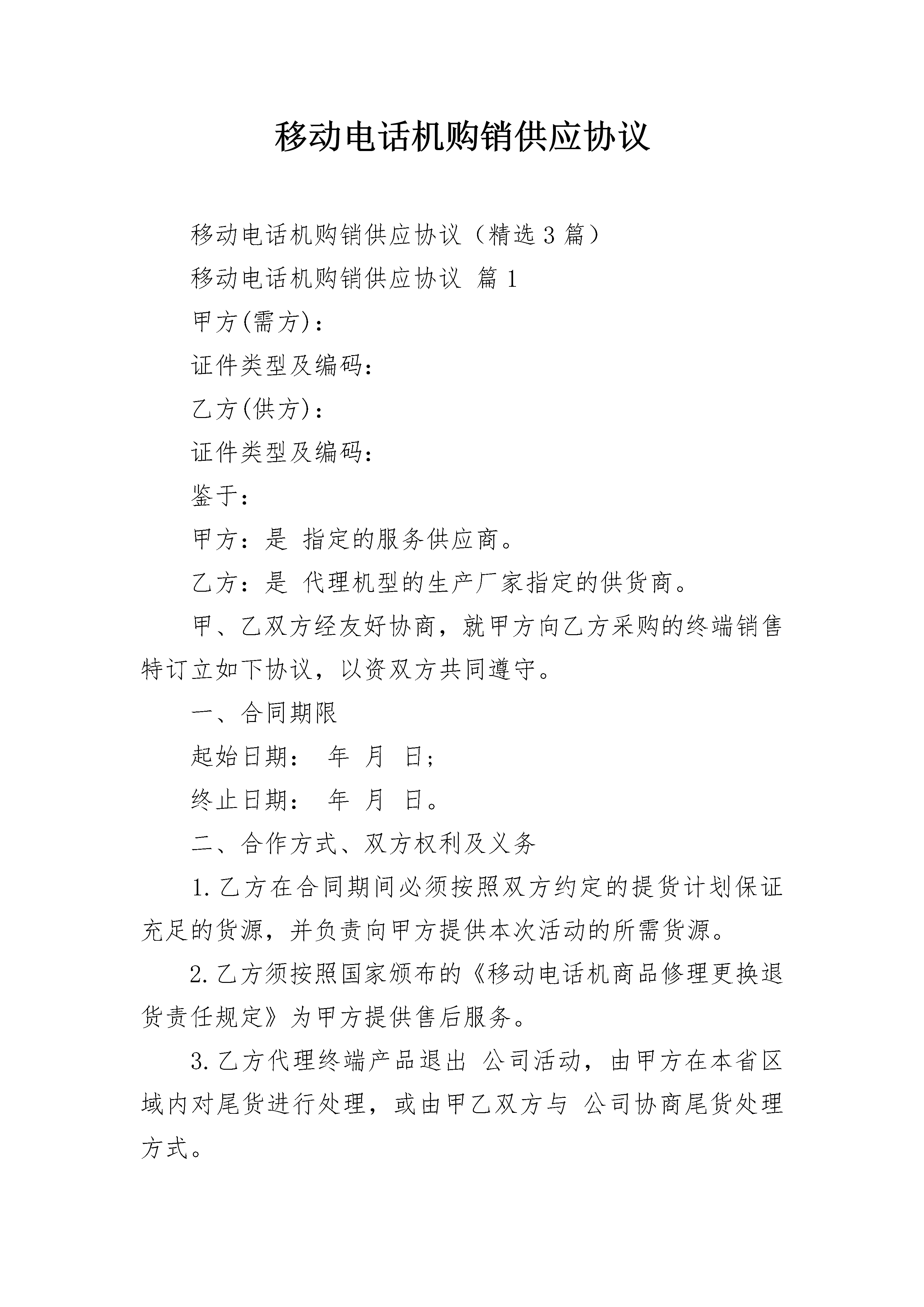 移动电话机购销供应协议移动电话机购销供应协议(精选3篇)移动电话机购销供应协议篇1甲方(需方):证件类型及编码:乙方(供方):证件类型及编码:鉴于:甲方:是指定的服务供应商。乙方:是代理机型的生产厂家指定的供货商。甲、乙双方经友好协商,就甲方向乙方采购的终端销售特订立如下协议,以资双方共同遵守。一、合同期限起始日期:年月日;终止日期:年月日。二、合作方式、双方权利及义务1.乙方在合同期间必须按照双方约定的提货计划保证充足的货源,并负责向甲方提供本次活动的所需货源。2.乙方须按照国家颁布的《移动电话机商品修理更换退货责任规定》为甲方提供售后服务。3.乙方代理终端产品退出公司活动,由甲方在本省区域内对尾货进行处理,或由甲乙双方与公司协商尾货处理方式。4.甲方根据实际提货量与乙方进行现款方式结算。三、产品订货及目标任务量1.甲方在销售周期内,目标完成以下产品的提货量,并根据销售计划,向乙方订货。协议终端型号:销售周期:目标提货量:(部)2.产品订货:甲乙双方每月日之前共同协商确定次月分周的提货计划,提货计划一旦确定原则上不可更改。3.产品订单:甲方使用附件一格式的订货单,以传真形式或扫描件邮件方式向乙方订货,订单经指定人员签字并加盖公司印章方为有效。4.乙方收到甲方书面订货单和款项后,开始履行合同。5.乙方承诺,在甲方下达书面订货单之日起个工作日内完成发货,将货物送至指定的收货地点与指定接收人。乙方如不能按时或按数发货,则必须在合同约定的交货日期前天书面通知甲方,以便甲方与公司及时沟通。因乙方交货不及时导致甲方的直接损失由乙方承担。四、交货与验货1.交货时间与地点详见甲方的订货单。2.货运方式及运输费用:选择以下第种方式(1)乙方发货至甲方指定省内唯一地点:此时运输费用由乙方承担。(2)甲方前往乙方指定地点自提:此时运输费用由甲方承担。3.乙方提供的产品抵达指定的交货地点需双方现场开箱清点检验,并由双方在收货清单(由乙方提供)上签字,以此作为双方确定责任的依据。并在收货后的个工作日内以乙方指定的方式签收确认。4.甲方向乙方提供书面的《提收货授权委托书》。甲方签收的人员及印章必须与订单提货人或授权委托书的签收模式相同。5.乙方务必保存好订货单和货物签收单,以作为与甲方对账和结算的依据。6.收货验货标准由甲乙双方共同书面确认。7.开箱时,如产品外包装完好无损,但箱内产品短缺或损伤,甲方向乙方提供书面物流事故报告,乙方复核后应根据该货损货差证明按照甲方要求的方式负责补足或更换,补齐、更换的货物应在签署货损证明之日起日内运达指定地点,相关费用由乙方承担。8.标的物的所有权自甲方验收确认,双方在货物签收单上签字,同时甲方须以乙方指定方式正确录入到货信息后转移至甲方,标的物的损毁与遗失风险一并转移。9.在乙方向甲方交货前,乙方需向甲方提供本批所供终端电子版的IMEI号,并确保同实际交付的终端IMEI号相同。五、结算方式1.甲乙双方协商同意按现款的方式进行结算,乙方收到甲方电汇货款后发货。2.乙方账户信息公司名称:开户行:银行账号:乙方于每月日前按甲方当期(截止每月日)到货确认数量给甲方开具并寄送%税率的增值税专用发票,在甲方需要乙方传真增值税发票时,乙方有义务配合完成。如因乙方原因未能如期、如数给出增值税发票而影响了甲方财务的正常的税款抵扣或报税工作,由此造成的甲方费用或损失由乙方全权负责并赔偿。3.甲方开票信息购货单位:地址:电话:统一社会信用代码:开户行:账号:4.如甲方按订单支付了货款,乙方未按相应订单完全发货,形成甲方在乙方的预付账款,甲方可使用预付账款冲抵后续订单的采购货款,如在个工作日内无法冲抵后续货款,乙方应在前述期满后个工作日内以银行汇款的形式将预付账款退回至甲方指定账户。5.如果乙方实行返利、销售奖励或调价等销售激励方式,那么乙方必须在每月日前确认截止上个月的返利、销售奖励或调价差等销售激励款,如乙方逾期确认,则甲方视同乙方认可甲方提交的金额,在甲方应付款中直接扣除。甲方在收到乙方提供的返利、销售奖励或调价差等销售激励款的书面确认单后,应及时向主管税务机关申请开具《开具红字增值税专用发票通知单》,寄送乙方。乙方在收到通知单后个工作日内开出红字增值税专用发票寄送甲方。6.甲、乙双方有义务相互配合在每月日之前完成上月的账目核对,甲方首先发起对账,乙方及时核对,对账内容包括但不限于采购、保价、返利、退货、结算等内容,对账单须经双方签章确认。如因甲方原因未在规定期限内完成对账,乙方有权拒绝继续供货,由此造成的移动处罚和其他后果均由甲方承担,如因乙方原因未在规定期限内完成对账,甲方有权拒绝后续提货,直到乙方配合完成对账,由此造成的处罚和其他后果均由乙方承担。财务对账,由乙方财务部门负责并签字确认加盖财务专用章;业务对账,由乙方市场营