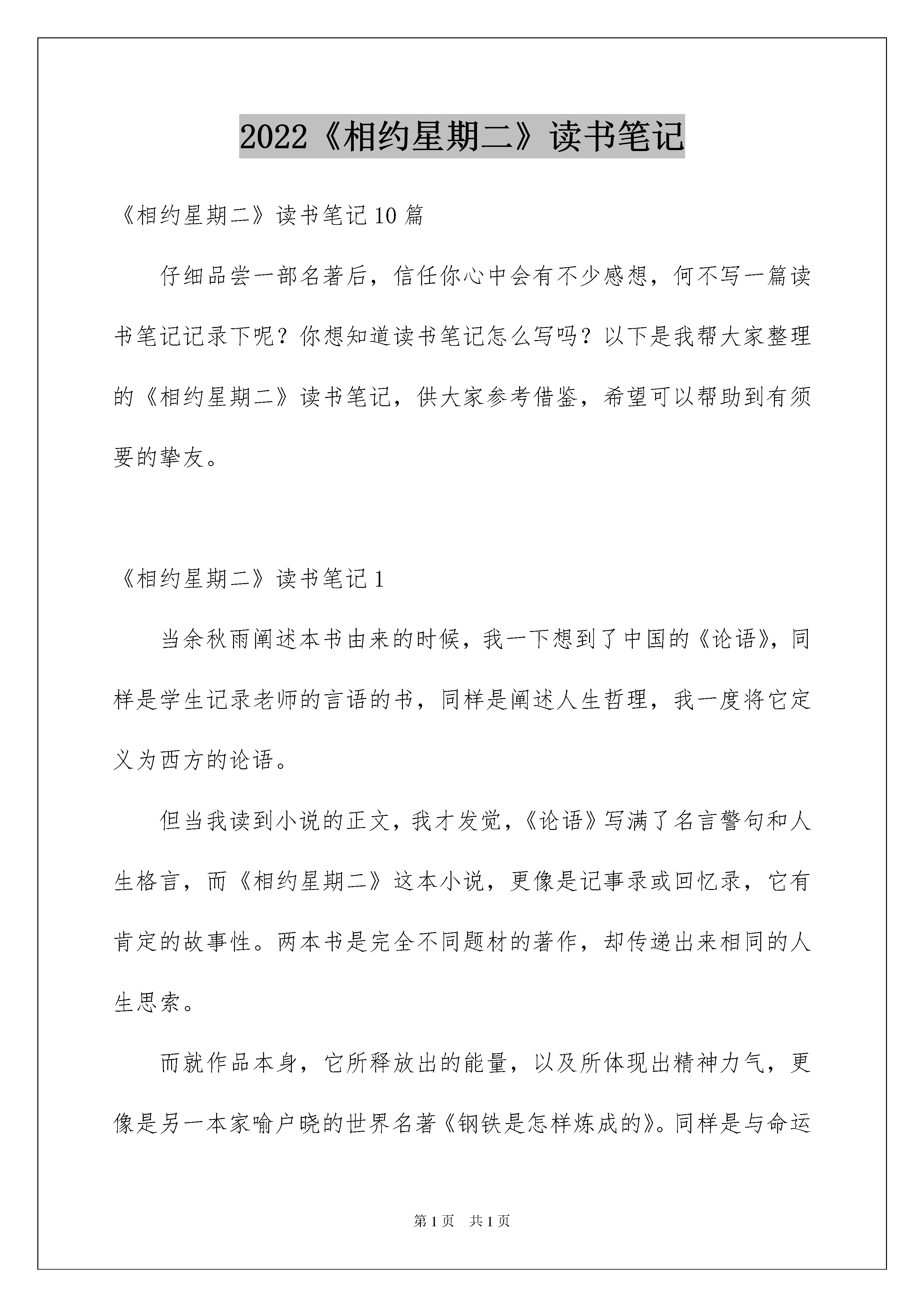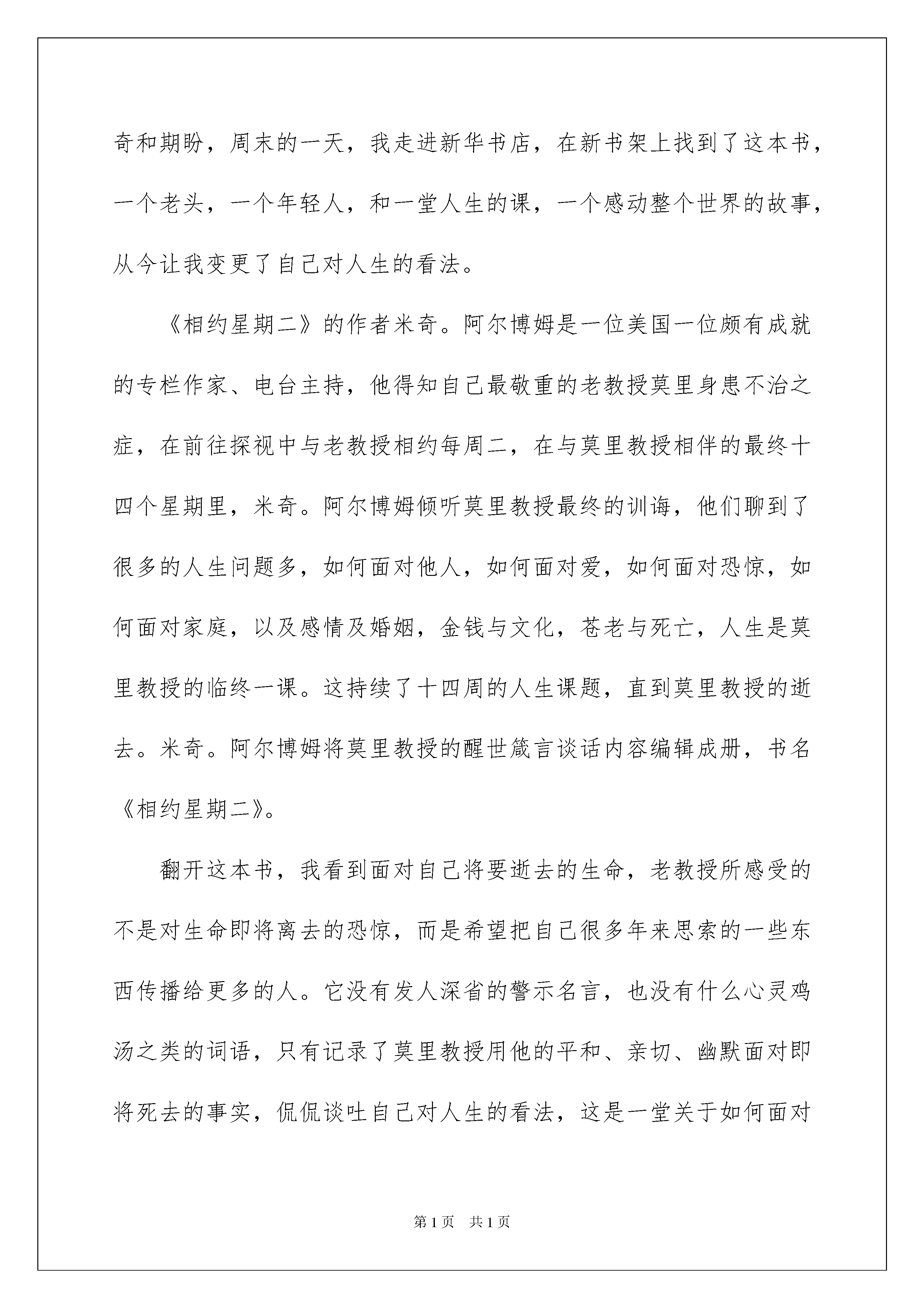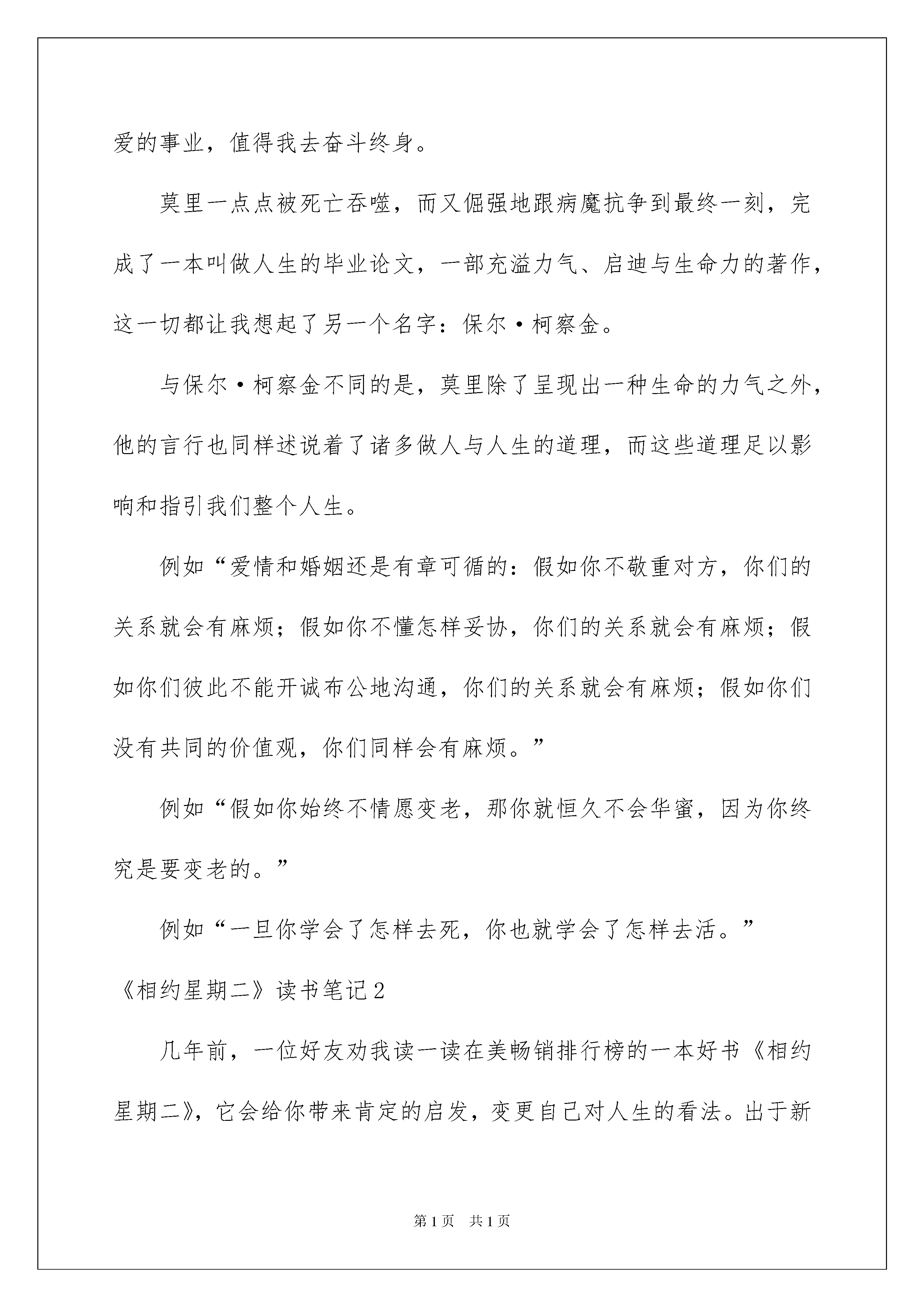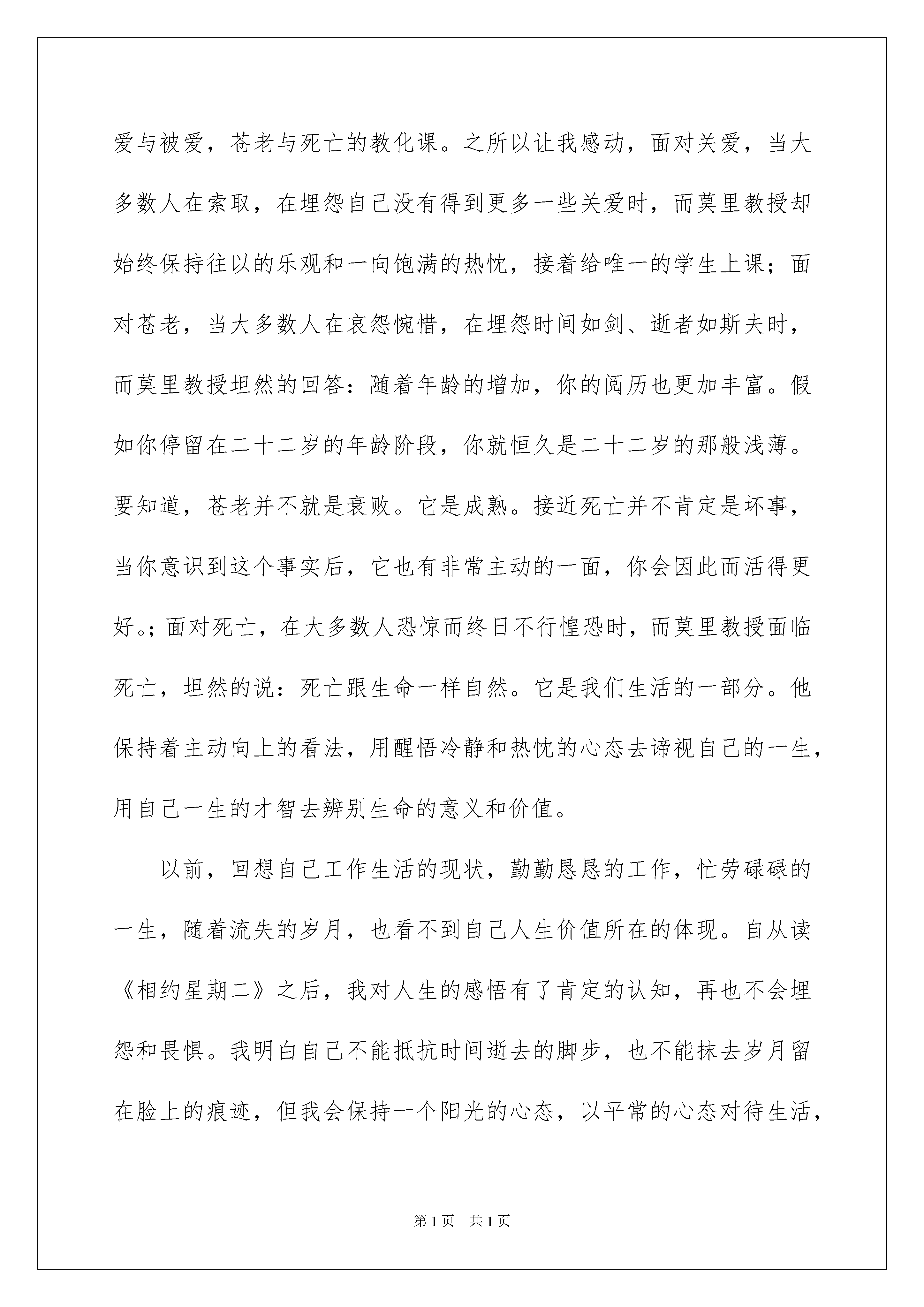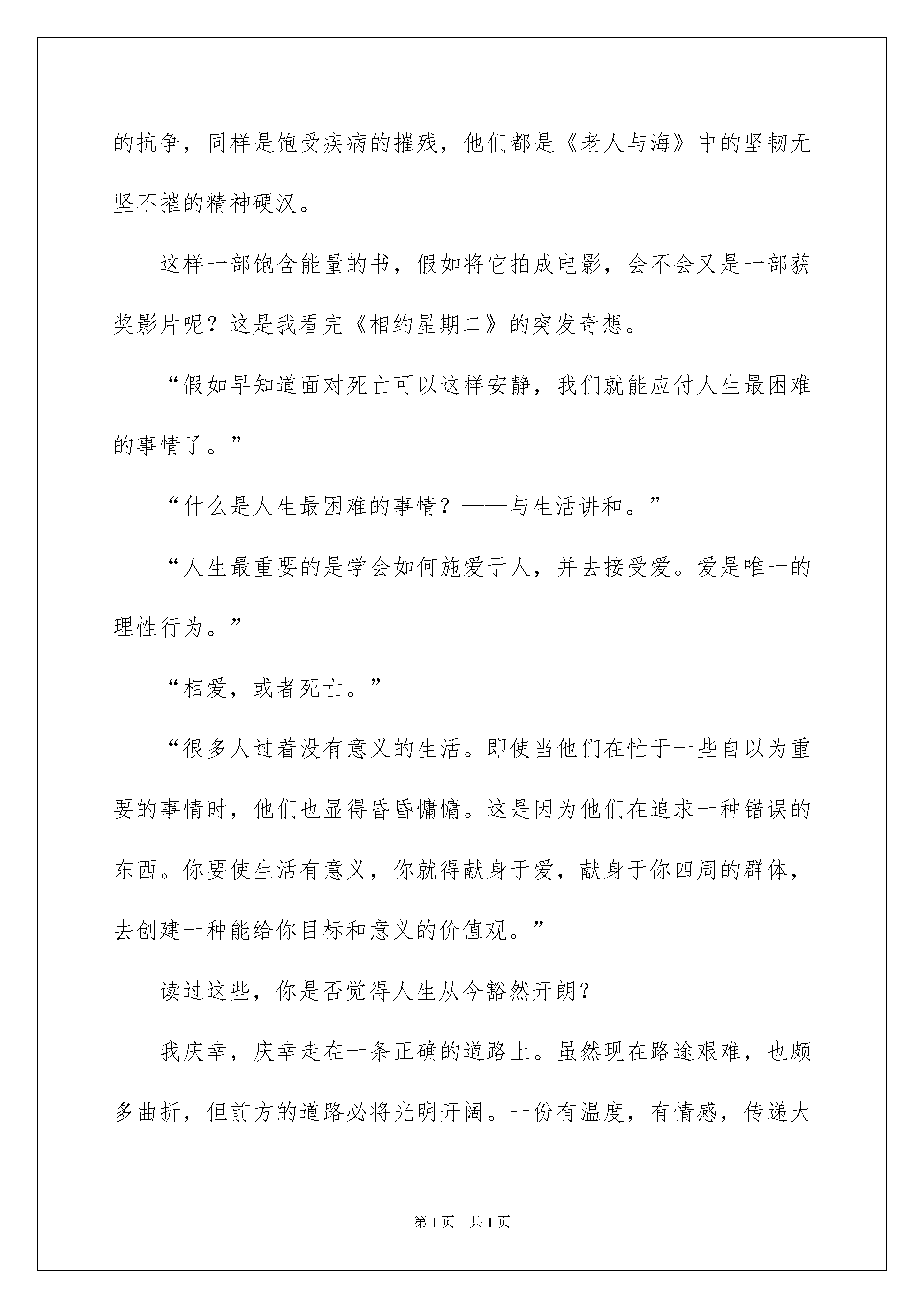2022《相约星期二》读书笔记《相约星期二》读书笔记10篇仔细品尝一部名著后,信任你心中会有不少感想,何不写一篇读书笔记记录下呢?你想知道读书笔记怎么写吗?以下是我帮大家整理的《相约星期二》读书笔记,供大家参考借鉴,希望可以帮助到有须要的挚友。《相约星期二》读书笔记1当余秋雨阐述本书由来的时候,我一下想到了中国的《论语》,同样是学生记录老师的言语的书,同样是阐述人生哲理,我一度将它定义为西方的论语。但当我读到小说的正文,我才发觉,《论语》写满了名言警句和人生格言,而《相约星期二》这本小说,更像是记事录或回忆录,它有肯定的故事性。两本书是完全不同题材的著作,却传递出来相同的人生思索。而就作品本身,它所释放出的能量,以及所体现出精神力气,更像是另一本家喻户晓的世界名著《钢铁是怎样炼成的》。同样是与命运的抗争,同样是饱受疾病的摧残,他们都是《老人与海》中的坚韧无坚不摧的精神硬汉。这样一部饱含能量的书,假如将它拍成电影,会不会又是一部获奖影片呢?这是我看完《相约星期二》的突发奇想。“假如早知道面对死亡可以这样安静,我们就能应付人生最困难的事情了。”“什么是人生最困难的事情?——与生活讲和。”“人生最重要的是学会如何施爱于人,并去接受爱。爱是唯一的理性行为。”“相爱,或者死亡。”“很多人过着没有意义的生活。即使当他们在忙于一些自以为重要的事情时,他们也显得昏昏慵慵。这是因为他们在追求一种错误的东西。你要使生活有意义,你就得献身于爱,献身于你四周的群体,去创建一种能给你目标和意义的价值观。”读过这些,你是否觉得人生从今豁然开朗?我庆幸,庆幸走在一条正确的道路上。虽然现在路途艰难,也颇多曲折,但前方的道路必将光明开阔。一份有温度,有情感,传递大爱的事业,值得我去奋斗终身。莫里一点点被死亡吞噬,而又倔强地跟病魔抗争到最终一刻,完成了一本叫做人生的毕业论文,一部充溢力气、启迪与生命力的著作,这一切都让我想起了另一个名字:保尔·柯察金。与保尔·柯察金不同的是,莫里除了呈现出一种生命的力气之外,他的言行也同样述说着了诸多做人与人生的道理,而这些道理足以影响和指引我们整个人生。例如“爱情和婚姻还是有章可循的:假如你不敬重对方,你们的关系就会有麻烦;假如你不懂怎样妥协,你们的关系就会有麻烦;假如你们彼此不能开诚布公地沟通,你们的关系就会有麻烦;假如你们没有共同的价值观,你们同样会有麻烦。”例如“假如你始终不情愿变老,那你就恒久不会华蜜,因为你终究是要变老的。”例如“一旦你学会了怎样去死,你也就学会了怎样去活。”《相约星期二》读书笔记2几年前,一位好友劝我读一读在美畅销排行榜的一本好书《相约星期二》,它会给你带来肯定的启发,变更自己对人生的看法。出于新奇和期盼,周末的一天,我走进新华书店,在新书架上找到了这本书,一个老头,一个年轻人,和一堂人生的课,一个感动整个世界的故事,从今让我变更了自己对人生的看法。《相约星期二》的作者米奇。阿尔博姆是一位美国一位颇有成就的专栏作家、电台主持,他得知自己最敬重的老教授莫里身患不治之症,在前往探视中与老教授相约每周二,在与莫里教授相伴的最终十四个星期里,米奇。阿尔博姆倾听莫里教授最终的训诲,他们聊到了很多的人生问题多,如何面对他人,如何面对爱,如何面对恐惊,如何面对家庭,以及感情及婚姻,金钱与文化,苍老与死亡,人生是莫里教授的临终一课。这持续了十四周的人生课题,直到莫里教授的逝去。米奇。阿尔博姆将莫里教授的醒世箴言谈话内容编辑成册,书名《相约星期二》。翻开这本书,我看到面对自己将要逝去的生命,老教授所感受的不是对生命即将离去的恐惊,而是希望把自己很多年来思索的一些东西传播给更多的人。它没有发人深省的警示名言,也没有什么心灵鸡汤之类的词语,只有记录了莫里教授用他的平和、亲切、幽默面对即将死去的事实,侃侃谈吐自己对人生的看法,这是一堂关于如何面对爱与被爱,苍老与死亡的教化课。之所以让我感动,面对关爱,当大多数人在索取,在埋怨自己没有得到更多一些关爱时,而莫里教授却始终保持往以的乐观和一向饱满的热忱,接着给唯一的学生上课;面对苍老,当大多数人在哀怨惋惜,在埋怨时间如剑、逝者如斯夫时,而莫里教授坦然的回答:随着年龄的增加,你的阅历也更加丰富。假如你停留在二十二岁的年龄阶段,你就恒久是二十二岁的那般浅薄。要知道,苍老并不就是衰败。它是成熟。接近死亡并不肯定是坏事,当你意识到这个事实后,它也有非常主动的一面,你会因此而活得更好。;面对死亡,在大多数人恐惊而终日不行惶恐时,而莫里教授面临死亡,坦然的说:死亡跟生命一样自然。它是我们生活的一部分。他保持着主动向上的看法,用醒悟冷静