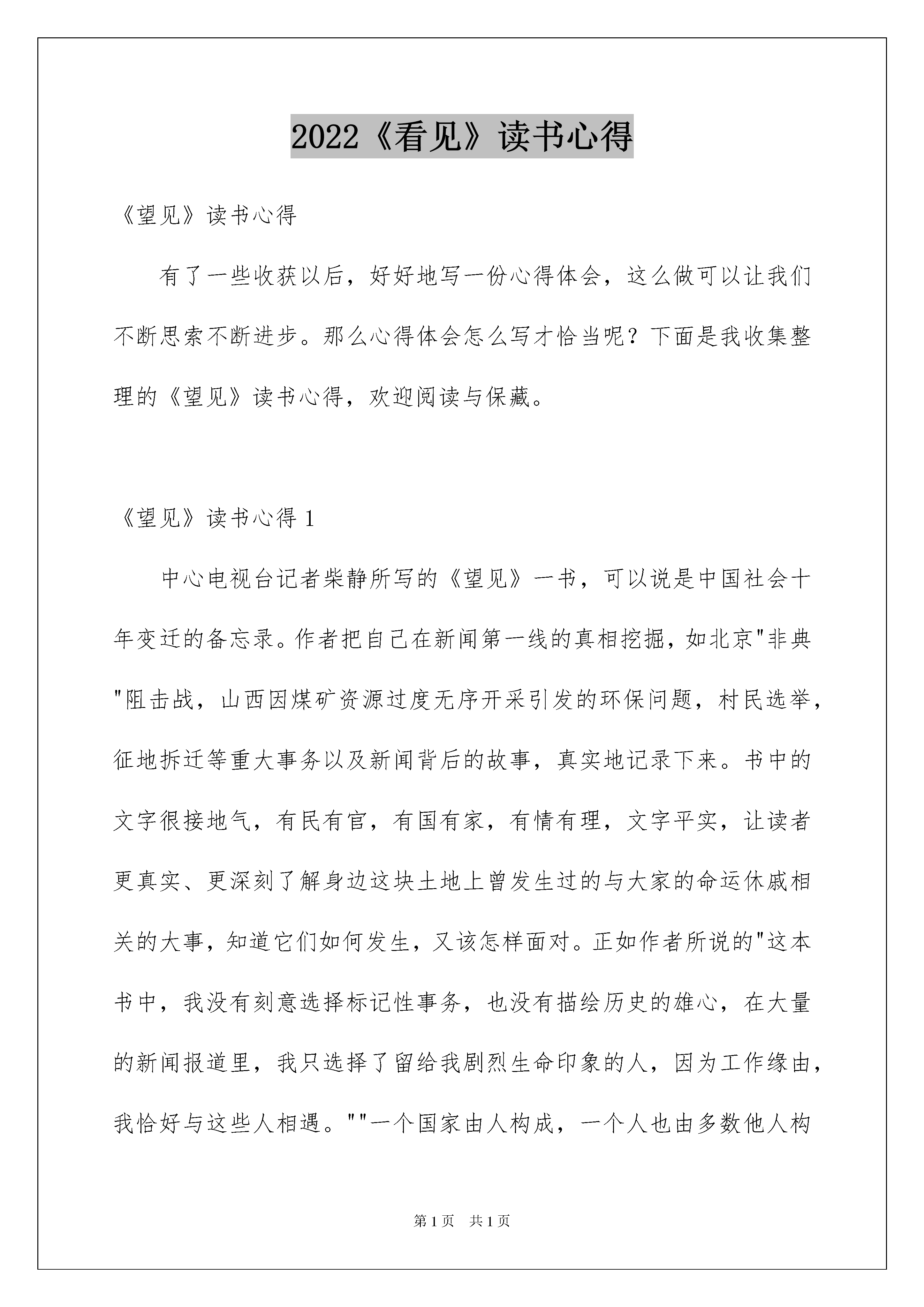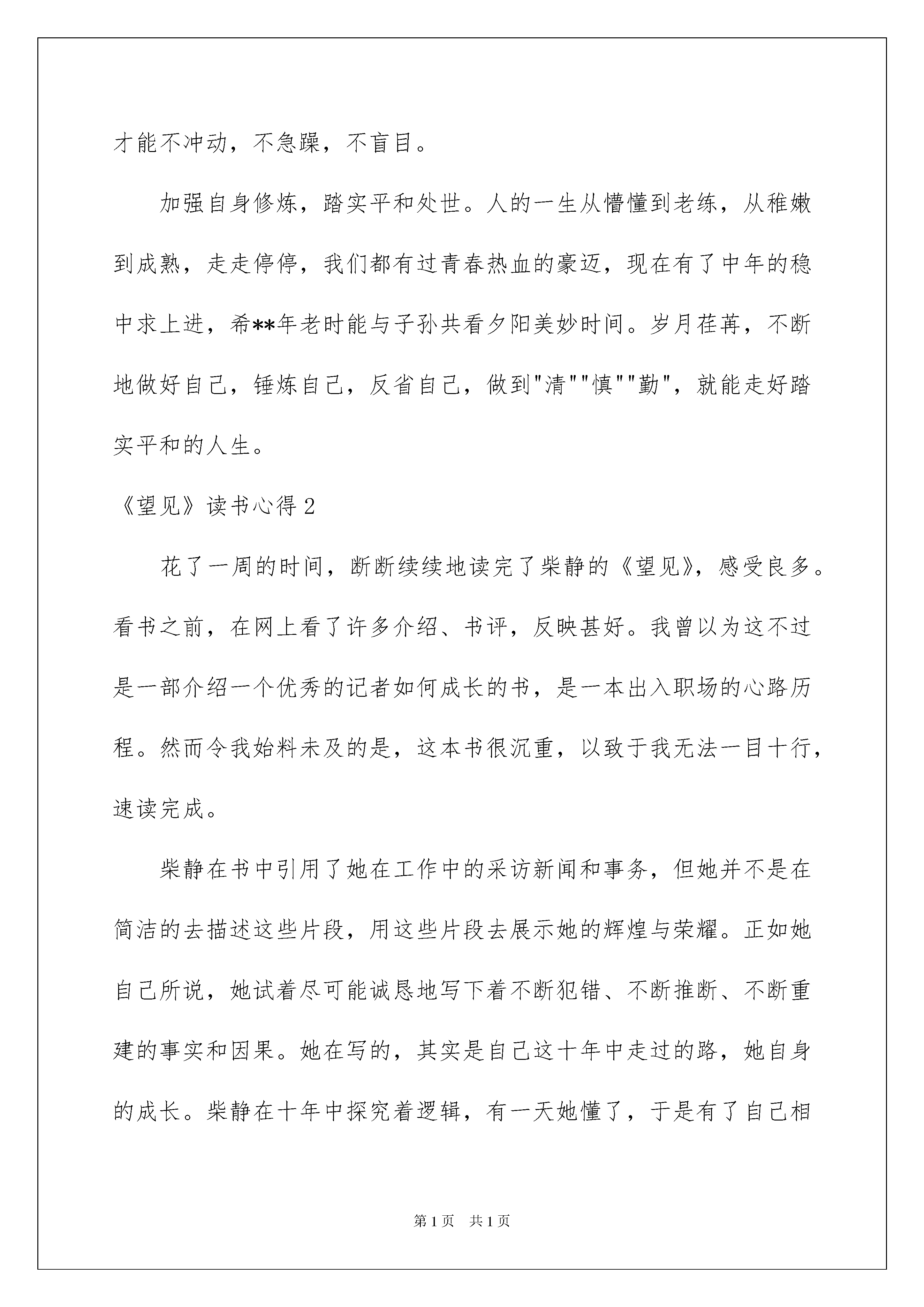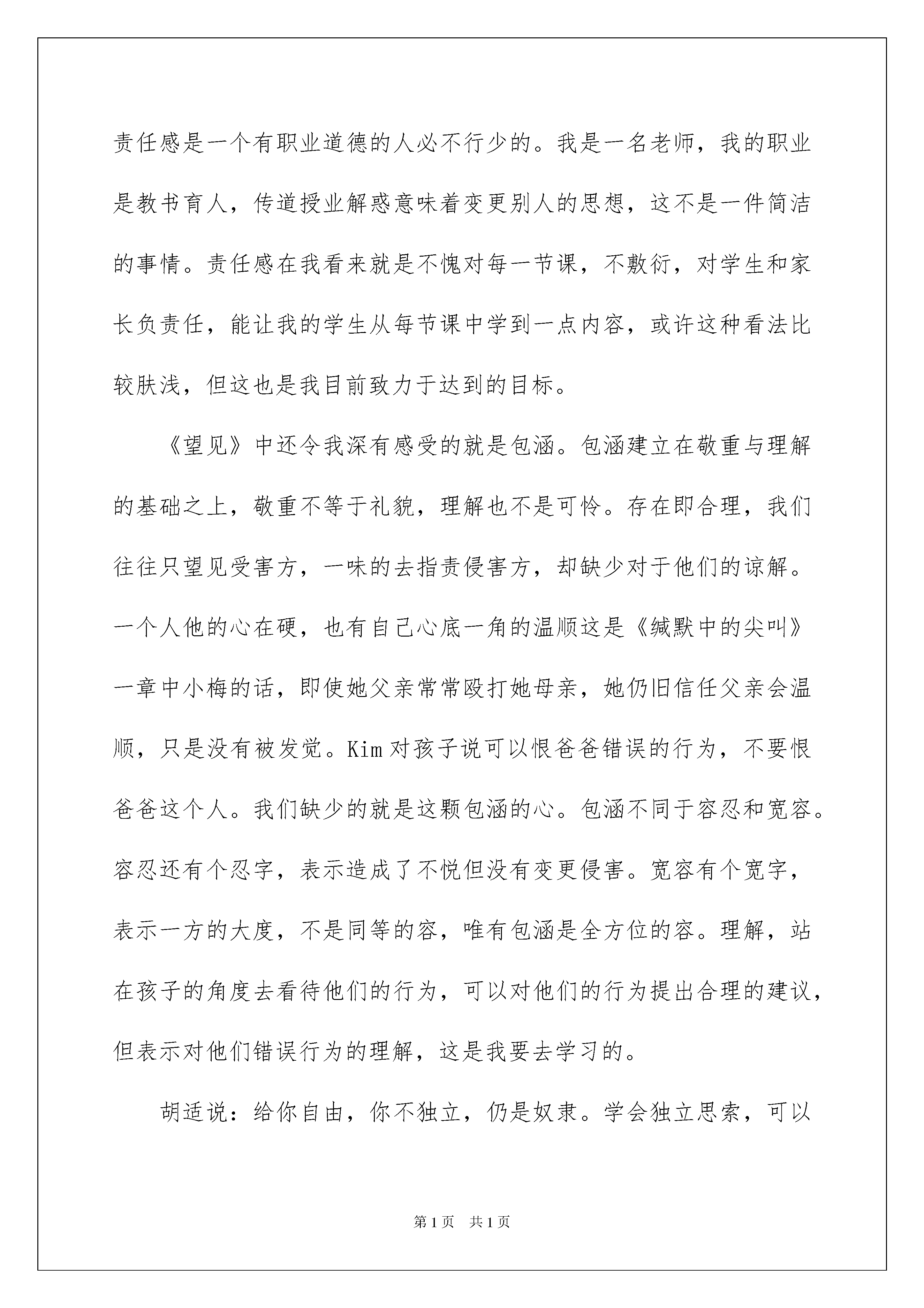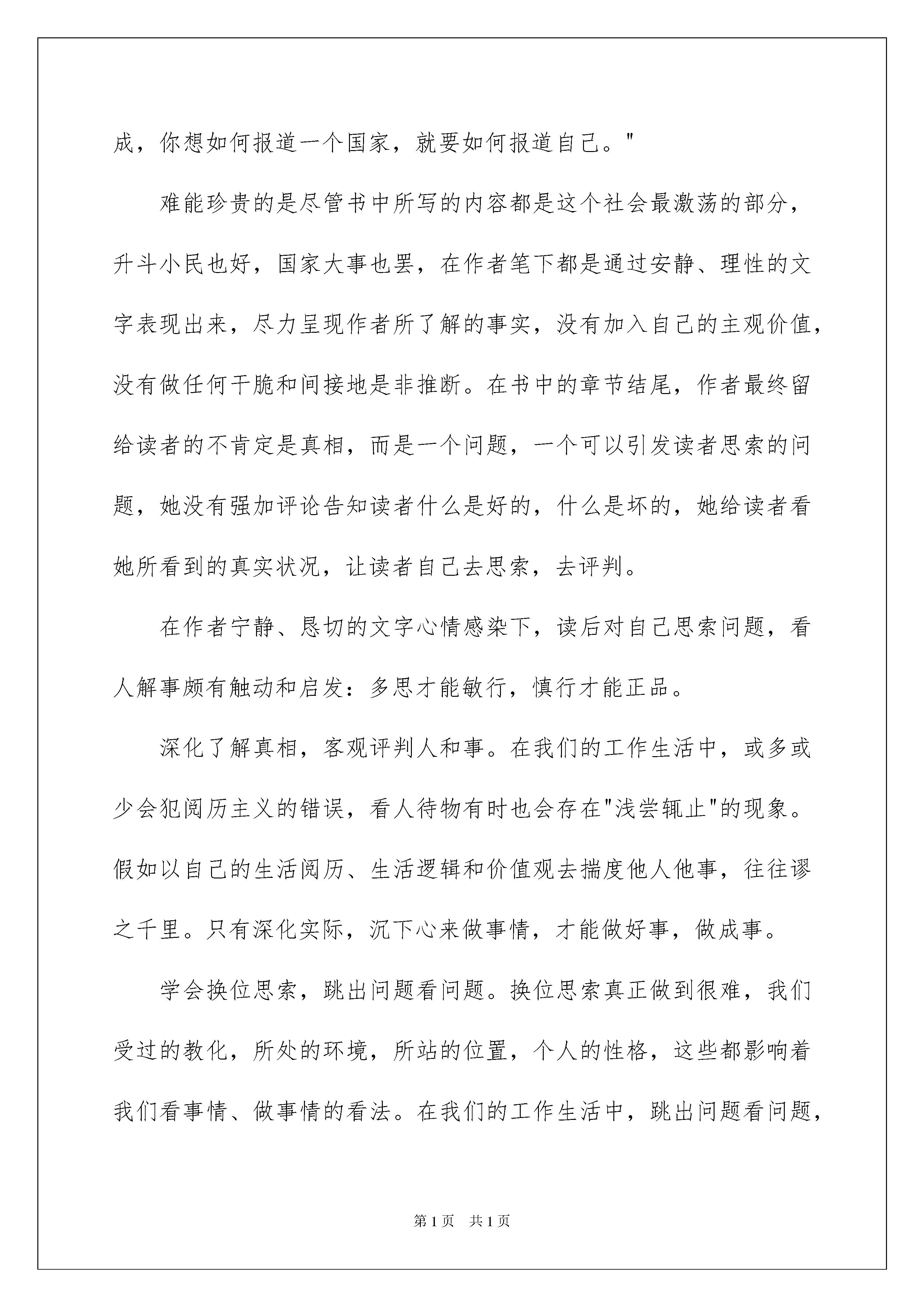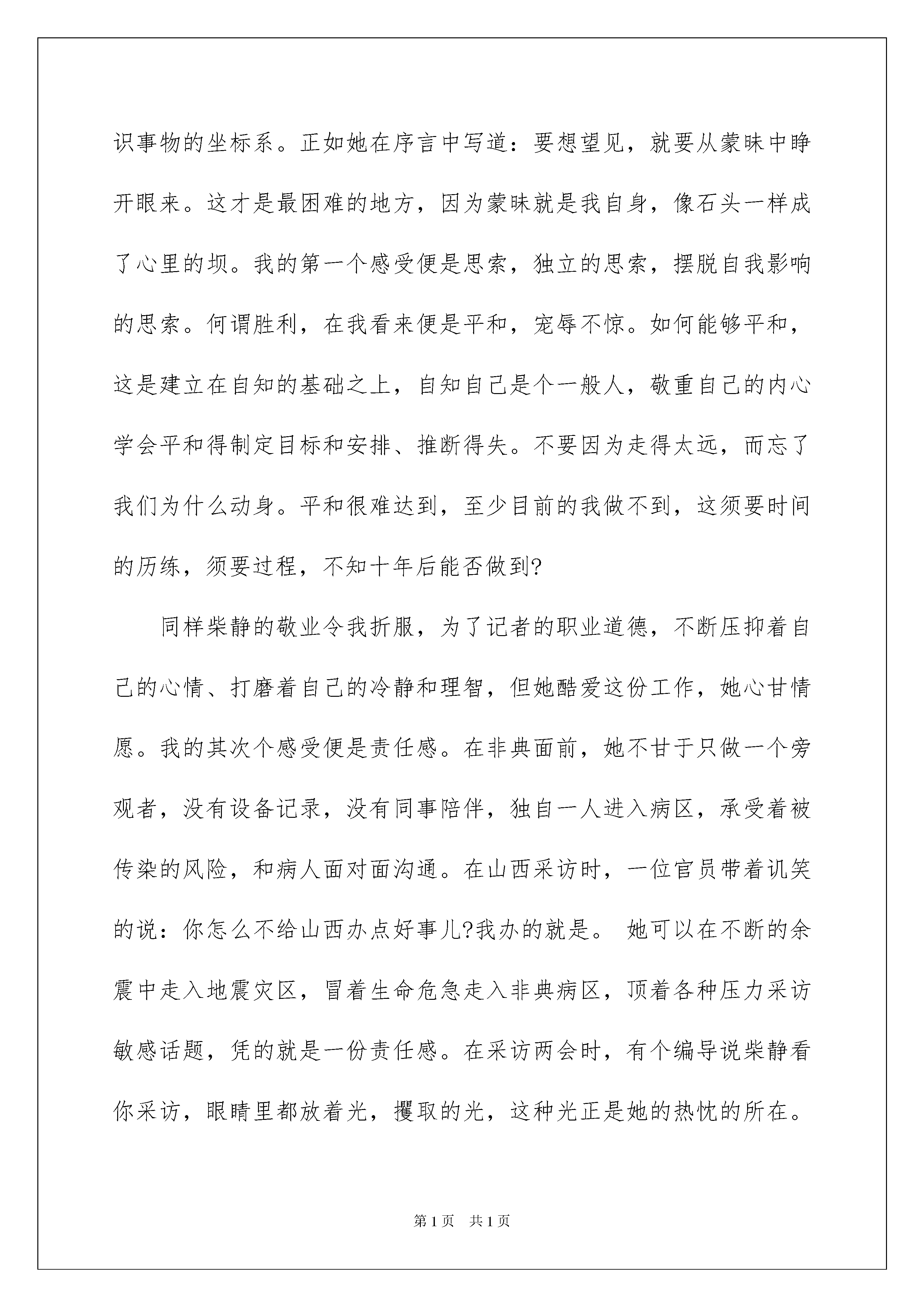 2022《看见》读书心得《望见》读书心得有了一些收获以后,好好地写一份心得体会,这么做可以让我们不断思索不断进步。那么心得体会怎么写才恰当呢?下面是我收集整理的《望见》读书心得,欢迎阅读与保藏。《望见》读书心得1中心电视台记者柴静所写的《望见》一书,可以说是中国社会十年变迁的备忘录。作者把自己在新闻第一线的真相挖掘,如北京"非典"阻击战,山西因煤矿资源过度无序开采引发的环保问题,村民选举,征地拆迁等重大事务以及新闻背后的故事,真实地记录下来。书中的文字很接地气,有民有官,有国有家,有情有理,文字平实,让读者更真实、更深刻了解身边这块土地上曾发生过的与大家的命运休戚相关的大事,知道它们如何发生,又该怎样面对。正如作者所说的"这本书中,我没有刻意选择标记性事务,也没有描绘历史的雄心,在大量的新闻报道里,我只选择了留给我剧烈生命印象的人,因为工作缘由,我恰好与这些人相遇。""一个国家由人构成,一个人也由多数他人构成,你想如何报道一个国家,就要如何报道自己。"难能珍贵的是尽管书中所写的内容都是这个社会最激荡的部分,升斗小民也好,国家大事也罢,在作者笔下都是通过安静、理性的文字表现出来,尽力呈现作者所了解的事实,没有加入自己的主观价值,没有做任何干脆和间接地是非推断。在书中的章节结尾,作者最终留给读者的不肯定是真相,而是一个问题,一个可以引发读者思索的问题,她没有强加评论告知读者什么是好的,什么是坏的,她给读者看她所看到的真实状况,让读者自己去思索,去评判。在作者宁静、恳切的文字心情感染下,读后对自己思索问题,看人解事颇有触动和启发:多思才能敏行,慎行才能正品。深化了解真相,客观评判人和事。在我们的工作生活中,或多或少会犯阅历主义的错误,看人待物有时也会存在"浅尝辄止"的现象。假如以自己的生活阅历、生活逻辑和价值观去揣度他人他事,往往谬之千里。只有深化实际,沉下心来做事情,才能做好事,做成事。学会换位思索,跳出问题看问题。换位思索真正做到很难,我们受过的教化,所处的环境,所站的位置,个人的性格,这些都影响着我们看事情、做事情的看法。在我们的工作生活中,跳出问题看问题,才能不冲动,不急躁,不盲目。加强自身修炼,踏实平和处世。人的一生从懵懂到老练,从稚嫩到成熟,走走停停,我们都有过青春热血的豪迈,现在有了中年的稳中求上进,希**年老时能与子孙共看夕阳美妙时间。岁月荏苒,不断地做好自己,锤炼自己,反省自己,做到"清""慎""勤",就能走好踏实平和的人生。《望见》读书心得2花了一周的时间,断断续续地读完了柴静的《望见》,感受良多。看书之前,在网上看了许多介绍、书评,反映甚好。我曾以为这不过是一部介绍一个优秀的记者如何成长的书,是一本出入职场的心路历程。然而令我始料未及的是,这本书很沉重,以致于我无法一目十行,速读完成。柴静在书中引用了她在工作中的采访新闻和事务,但她并不是在简洁的去描述这些片段,用这些片段去展示她的辉煌与荣耀。正如她自己所说,她试着尽可能诚恳地写下着不断犯错、不断推断、不断重建的事实和因果。她在写的,其实是自己这十年中走过的路,她自身的成长。柴静在十年中探究着逻辑,有一天她懂了,于是有了自己相识事物的坐标系。正如她在序言中写道:要想望见,就要从蒙昧中睁开眼来。这才是最困难的地方,因为蒙昧就是我自身,像石头一样成了心里的坝。我的第一个感受便是思索,独立的思索,摆脱自我影响的思索。何谓胜利,在我看来便是平和,宠辱不惊。如何能够平和,这是建立在自知的基础之上,自知自己是个一般人,敬重自己的内心学会平和得制定目标和安排、推断得失。不要因为走得太远,而忘了我们为什么动身。平和很难达到,至少目前的我做不到,这须要时间的历练,须要过程,不知十年后能否做到?同样柴静的敬业令我折服,为了记者的职业道德,不断压抑着自己的心情、打磨着自己的冷静和理智,但她酷爱这份工作,她心甘情愿。我的其次个感受便是责任感。在非典面前,她不甘于只做一个旁观者,没有设备记录,没有同事陪伴,独自一人进入病区,承受着被传染的风险,和病人面对面沟通。在山西采访时,一位官员带着讥笑的说:你怎么不给山西办点好事儿?我办的就是。她可以在不断的余震中走入地震灾区,冒着生命危急走入非典病区,顶着各种压力采访敏感话题,凭的就是一份责任感。在采访两会时,有个编导说柴静看你采访,眼睛里都放着光,攫取的光,这种光正是她的热忱的所在。责任感是一个有职业道德的人必不行少的。我是一名老师,我的职业是教书育人,传道授业解惑意味着变更别人的思想,这不是一件简洁的事情。责任感在我看来就是不愧对每一节课,不敷衍,对学生和家长负责任,能让我的学生从每节课