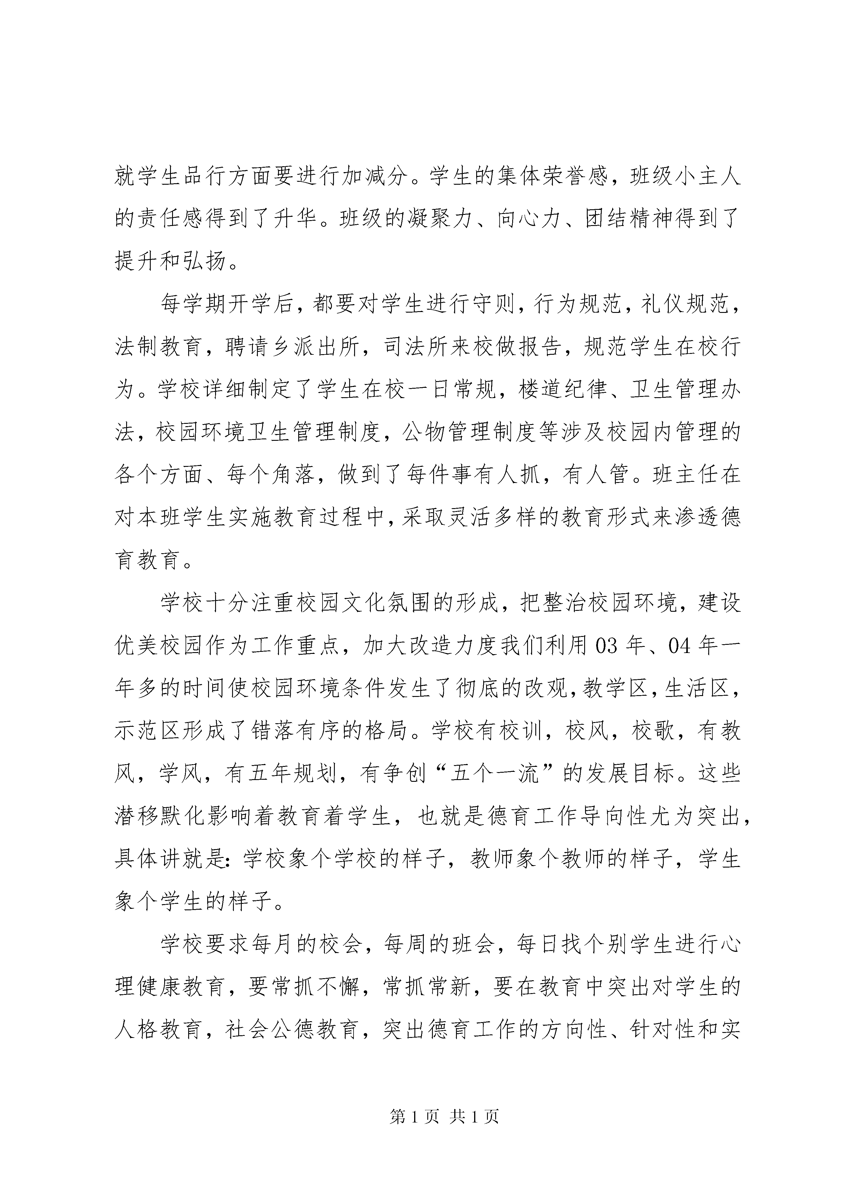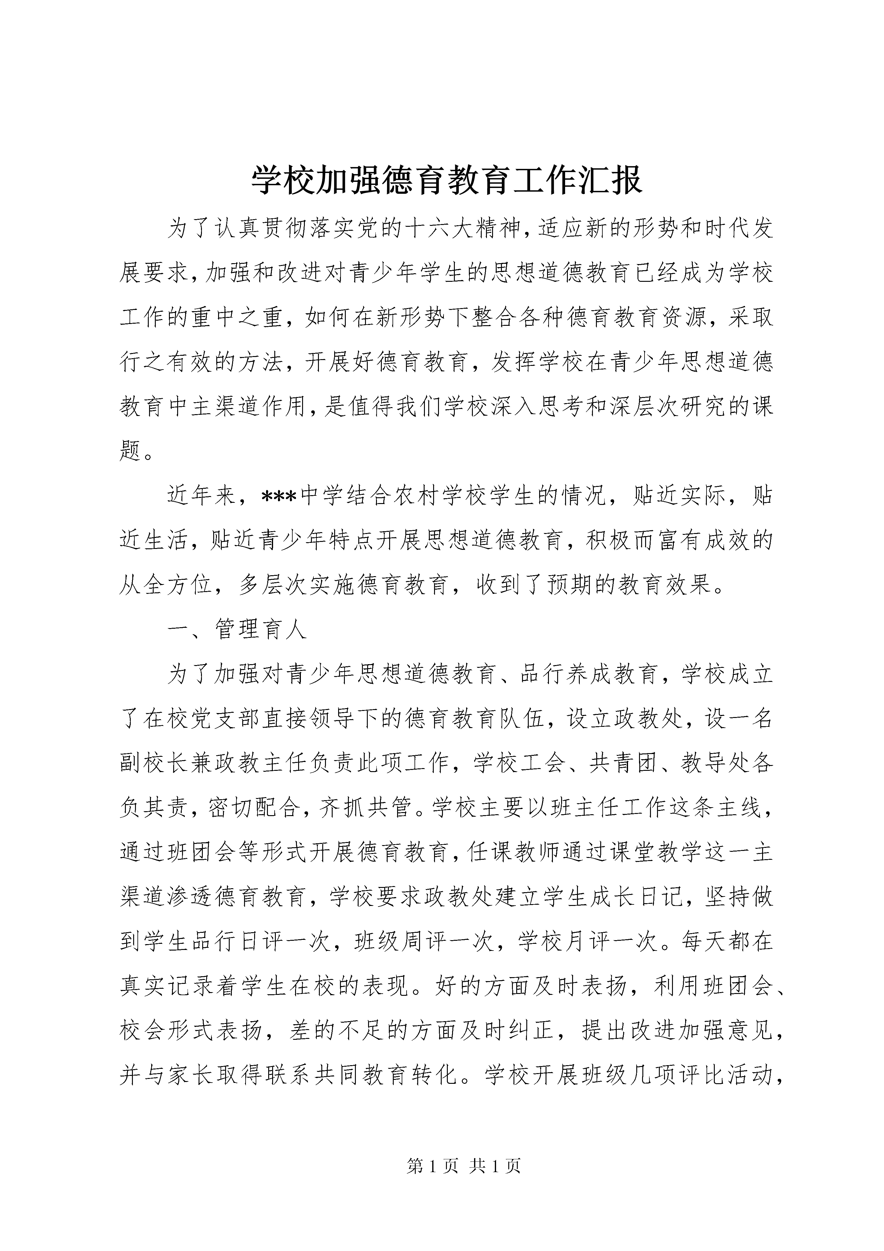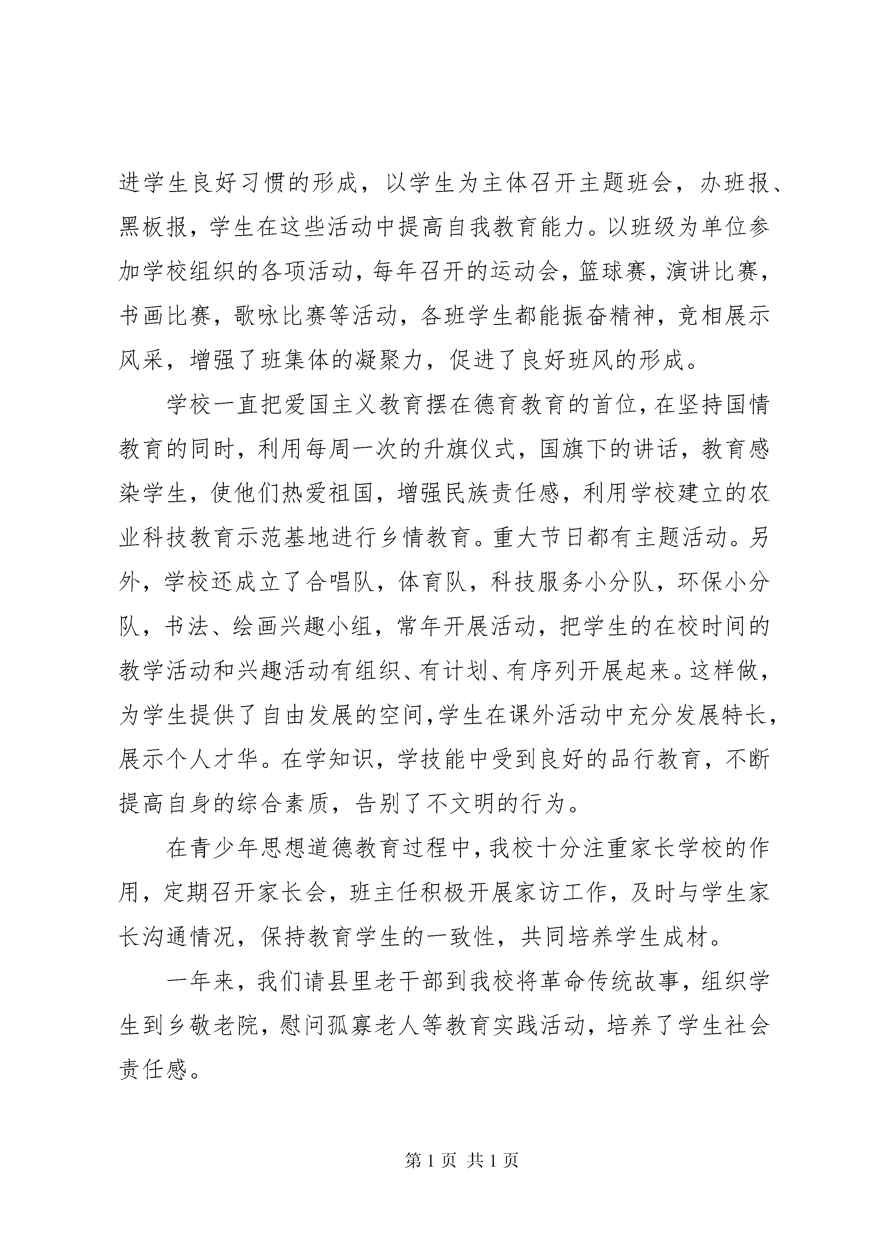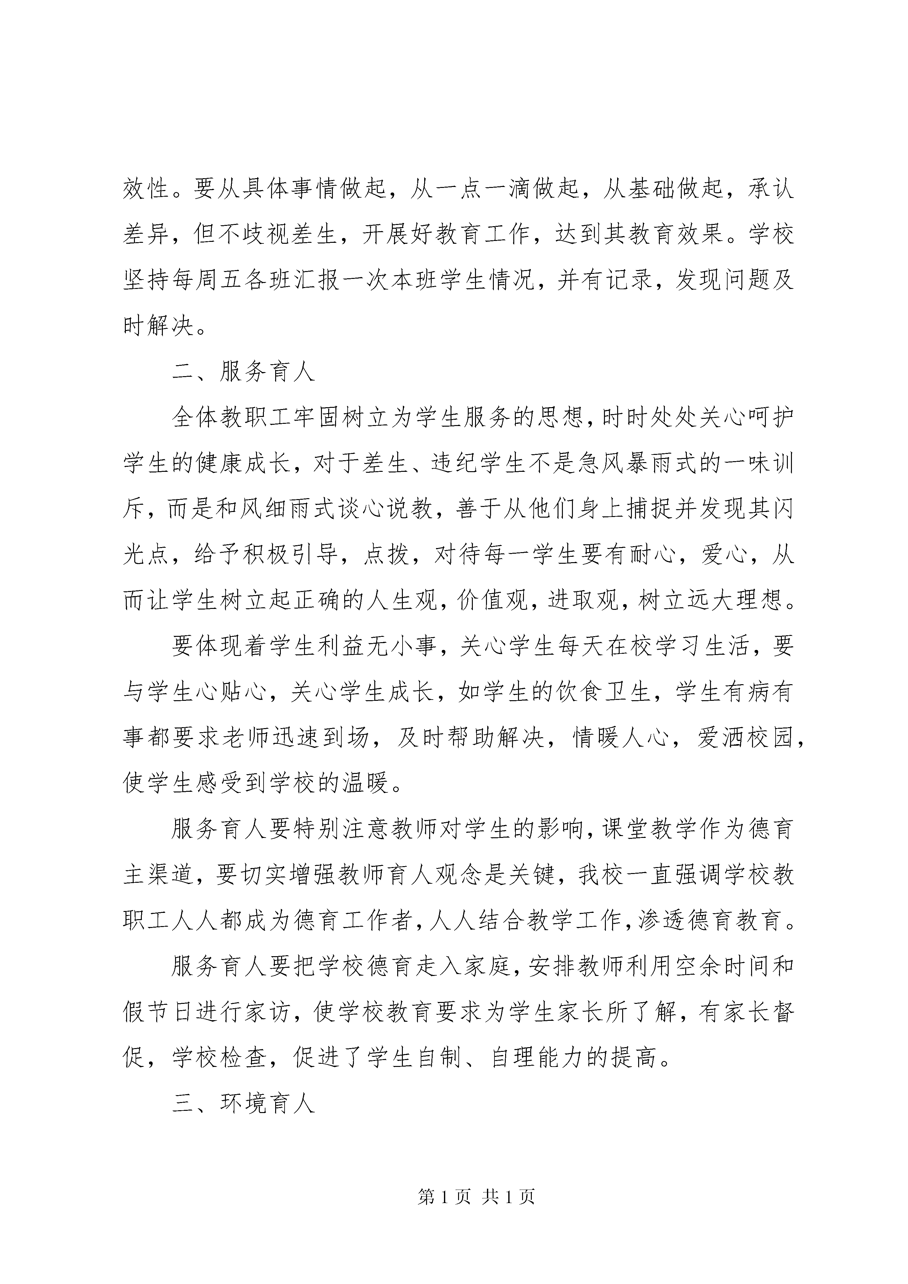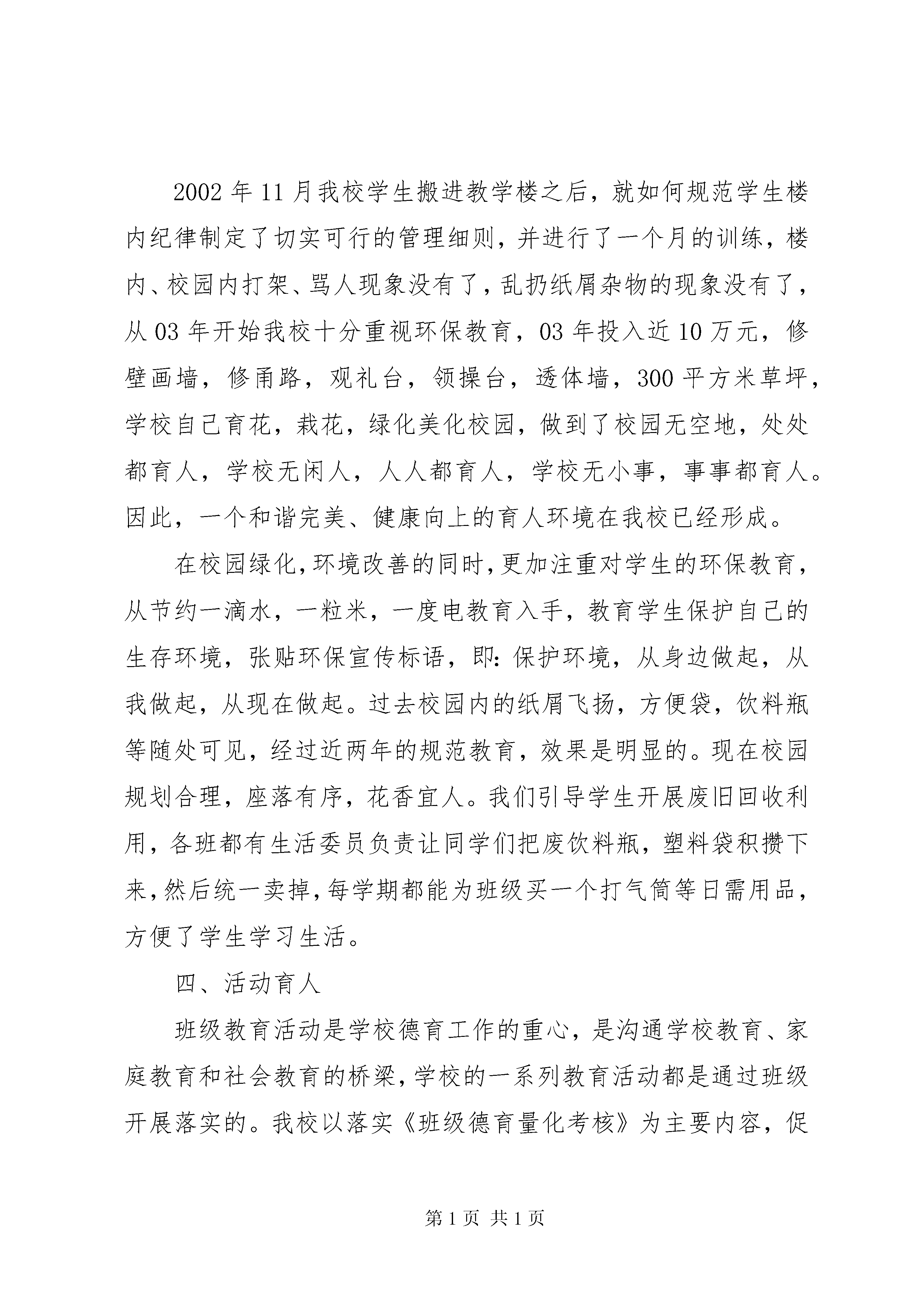 学校加强德育教育工作汇报为了认真贯彻落实党的十六大精神,适应新的形势和时代发展要求,加强和改进对青少年学生的思想道德教育已经成为学校工作的重中之重,如何在新形势下整合各种德育教育资源,采取行之有效的方法,开展好德育教育,发挥学校在青少年思想道德教育中主渠道作用,是值得我们学校深入思考和深层次研究的课题。近年来,***中学结合农村学校学生的情况,贴近实际,贴近生活,贴近青少年特点开展思想道德教育,积极而富有成效的从全方位,多层次实施德育教育,收到了预期的教育效果。一、管理育人为了加强对青少年思想道德教育、品行养成教育,学校成立了在校党支部直接领导下的德育教育队伍,设立政教处,设一名副校长兼政教主任负责此项工作,学校工会、共青团、教导处各负其责,密切配合,齐抓共管。学校主要以班主任工作这条主线,通过班团会等形式开展德育教育,任课教师通过课堂教学这一主渠道渗透德育教育,学校要求政教处建立学生成长日记,坚持做到学生品行日评一次,班级周评一次,学校月评一次。每天都在真实记录着学生在校的表现。好的方面及时表扬,利用班团会、校会形式表扬,差的不足的方面及时纠正,提出改进加强意见,并与家长取得联系共同教育转化。学校开展班级几项评比活动,就学生品行方面要进行加减分。学生的集体荣誉感,班级小主人的责任感得到了升华。班级的凝聚力、向心力、团结精神得到了提升和弘扬。每学期开学后,都要对学生进行守则,行为规范,礼仪规范,法制教育,聘请乡派出所,司法所来校做报告,规范学生在校行为。学校详细制定了学生在校一日常规,楼道纪律、卫生管理办法,校园环境卫生管理制度,公物管理制度等涉及校园内管理的各个方面、每个角落,做到了每件事有人抓,有人管。班主任在对本班学生实施教育过程中,采取灵活多样的教育形式来渗透德育教育。学校十分注重校园文化氛围的形成,把整治校园环境,建设优美校园作为工作重点,加大改造力度我们利用03年、04年一年多的时间使校园环境条件发生了彻底的改观,教学区,生活区,示范区形成了错落有序的格局。学校有校训,校风,校歌,有教风,学风,有五年规划,有争创“五个一流”的发展目标。这些潜移默化影响着教育着学生,也就是德育工作导向性尤为突出,具体讲就是:学校象个学校的样子,教师象个教师的样子,学生象个学生的样子。学校要求每月的校会,每周的班会,每日找个别学生进行心理健康教育,要常抓不懈,常抓常新,要在教育中突出对学生的人格教育,社会公德教育,突出德育工作的方向性、针对性和实效性。要从具体事情做起,从一点一滴做起,从基础做起,承认差异,但不歧视差生,开展好教育工作,达到其教育效果。学校坚持每周五各班汇报一次本班学生情况,并有记录,发现问题及时解决。二、服务育人全体教职工牢固树立为学生服务的思想,时时处处关心呵护学生的健康成长,对于差生、违纪学生不是急风暴雨式的一味训斥,而是和风细雨式谈心说教,善于从他们身上捕捉并发现其闪光点,给予积极引导,点拨,对待每一学生要有耐心,爱心,从而让学生树立起正确的人生观,价值观,进取观,树立远大理想。要体现着学生利益无小事,关心学生每天在校学习生活,要与学生心贴心,关心学生成长,如学生的饮食卫生,学生有病有事都要求老师迅速到场,及时帮助解决,情暖人心,爱洒校园,使学生感受到学校的温暖。服务育人要特别注意教师对学生的影响,课堂教学作为德育主渠道,要切实增强教师育人观念是关键,我校一直强调学校教职工人人都成为德育工作者,人人结合教学工作,渗透德育教育。服务育人要把学校德育走入家庭,安排教师利用空余时间和假节日进行家访,使学校教育要求为学生家长所了解,有家长督促,学校检查,促进了学生自制、自理能力的提高。三、环境育人2002年11月我校学生搬进教学楼之后,就如何规范学生楼内纪律制定了切实可行的管理细则,并进行了一个月的训练,楼内、校园内打架、骂人现象没有了,乱扔纸屑杂物的现象没有了,从03年开始我校十分重视环保教育,03年投入近10万元,修壁画墙,修甬路,观礼台,领操台,透体墙,300平方米草坪,学校自己育花,栽花,绿化美化校园,做到了校园无空地,处处都育人,学校无闲人,人人都育人,学校无小事,事事都育人。因此,一个和谐完美、健康向上的育人环境在我校已经形成。在校园绿化,环境改善的同时,更加注重对学生的环保教育,从节约一滴水,一粒米,一度电教育入手,教育学生保护自己的生存环境,张贴环保宣传标语,即:保护环境,从身边做起,从我做起,从现在做起。过去校园内的纸屑飞扬,方便袋,饮料瓶等随处可见,经过近两年的规范教育,效果是明显的。现在校园规划合理,座落有序,花香宜人。我们引导学生开展废旧回收利用,各班都有生活委员负责让同学们把废饮料瓶,塑料袋积攒下来,然后统一卖掉,每学期都能为班级买一个打气筒等日需用品,方便了学生学习