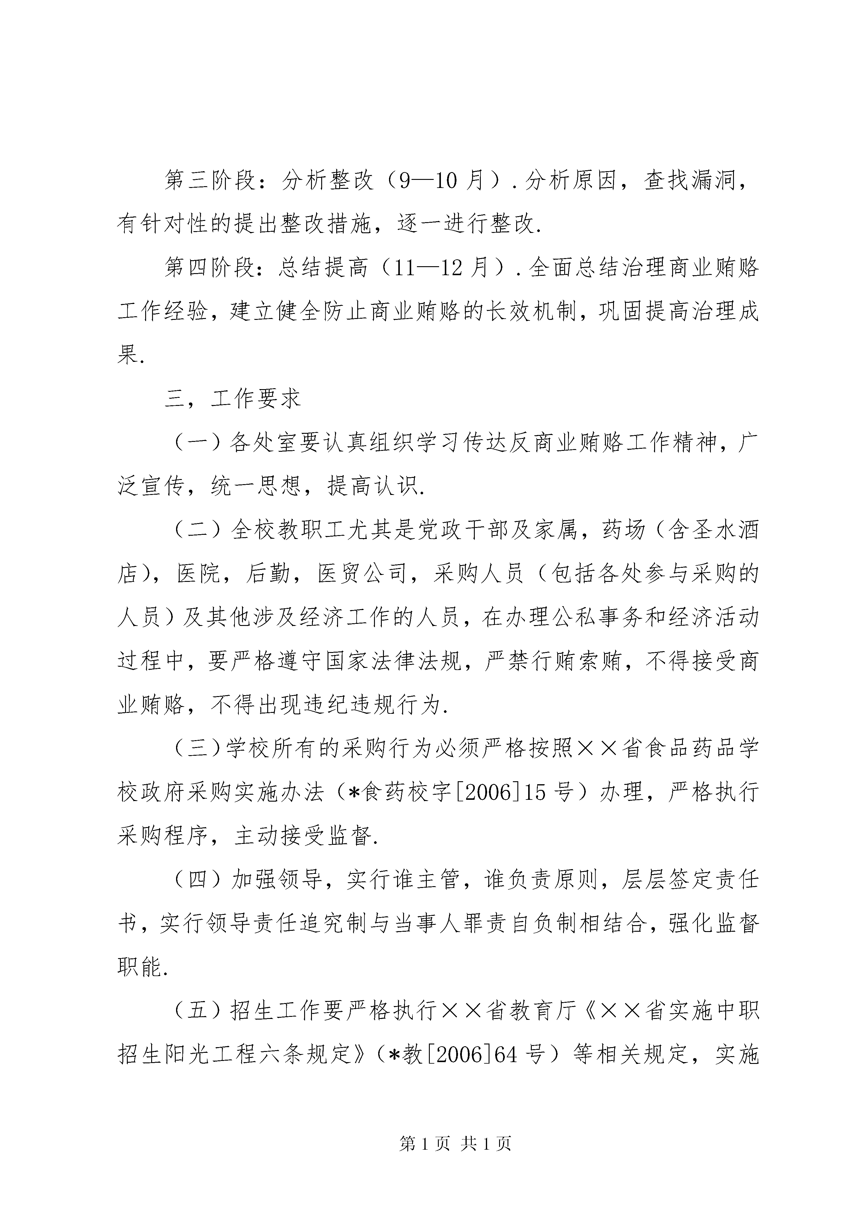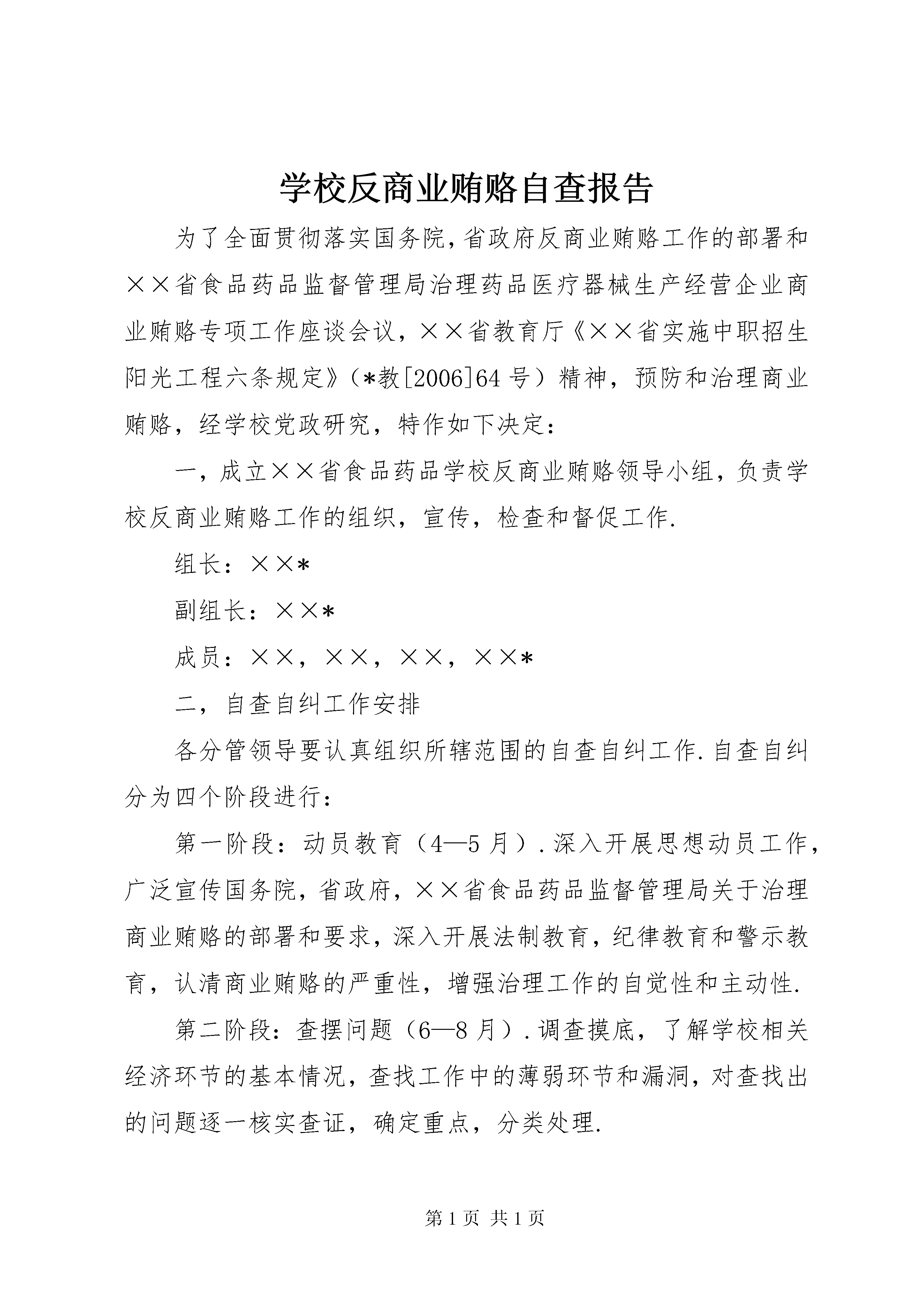 学校反商业贿赂自查报告为了全面贯彻落实国务院,省政府反商业贿赂工作的部署和××省食品药品监督管理局治理药品医疗器械生产经营企业商业贿赂专项工作座谈会议,××省教育厅《××省实施中职招生阳光工程六条规定》(*教[2006]64号)精神,预防和治理商业贿赂,经学校党政研究,特作如下决定:一,成立××省食品药品学校反商业贿赂领导小组,负责学校反商业贿赂工作的组织,宣传,检查和督促工作.组长:××*副组长:××*成员:××,××,××,××*二,自查自纠工作安排各分管领导要认真组织所辖范围的自查自纠工作.自查自纠分为四个阶段进行:第一阶段:动员教育(4—5月).深入开展思想动员工作,广泛宣传国务院,省政府,××省食品药品监督管理局关于治理商业贿赂的部署和要求,深入开展法制教育,纪律教育和警示教育,认清商业贿赂的严重性,增强治理工作的自觉性和主动性.第二阶段:查摆问题(6—8月).调查摸底,了解学校相关经济环节的基本情况,查找工作中的薄弱环节和漏洞,对查找出的问题逐一核实查证,确定重点,分类处理.第三阶段:分析整改(9—10月).分析原因,查找漏洞,有针对性的提出整改措施,逐一进行整改.第四阶段:总结提高(11—12月).全面总结治理商业贿赂工作经验,建立健全防止商业贿赂的长效机制,巩固提高治理成果.三,工作要求(一)各处室要认真组织学习传达反商业贿赂工作精神,广泛宣传,统一思想,提高认识.(二)全校教职工尤其是党政干部及家属,药场(含圣水酒店),医院,后勤,医贸公司,采购人员(包括各处参与采购的人员)及其他涉及经济工作的人员,在办理公私事务和经济活动过程中,要严格遵守国家法律法规,严禁行贿索贿,不得接受商业贿赂,不得出现违纪违规行为.(三)学校所有的采购行为必须严格按照××省食品药品学校政府采购实施办法(*食药校字[2006]15号)办理,严格执行采购程序,主动接受监督.(四)加强领导,实行谁主管,谁负责原则,层层签定责任书,实行领导责任追究制与当事人罪责自负制相结合,强化监督职能.(五)招生工作要严格执行××省教育厅《××省实施中职招生阳光工程六条规定》(*教[2006]64号)等相关规定,实施招生阳光工程.1.严格执行招生工作六公开:招生政策公开,学校招生资格及有关考生资格公开,招生计划公开,考生咨询及申诉渠道公开,重大违规事件处理结果公开.2.严禁用经济手段组织生源:生源学校(含个人)不得向招生学校收取或变相收取生源组织费,招生学校(含个人)不得采取经济手段组织生源.3.严禁非法招生活动:生源学校(含个人)不准协助,参与非法招生活动,招生学校不准利用中介机构或个人进行违规强拉生源,虚假宣传,有偿招生,取缔并严厉打击非法招生中介机构,招生贩子.(六)教师,班主任,辅导员及相关工作人员不得向相对人及其家属亲友索贿或变相索贿,不得接受可能影响公正的宴请和贵重礼品.(七)相关人员因公接受其他单位或个人贵重礼品的,返校后应及时上交学校,并向纪检监察部门备案.