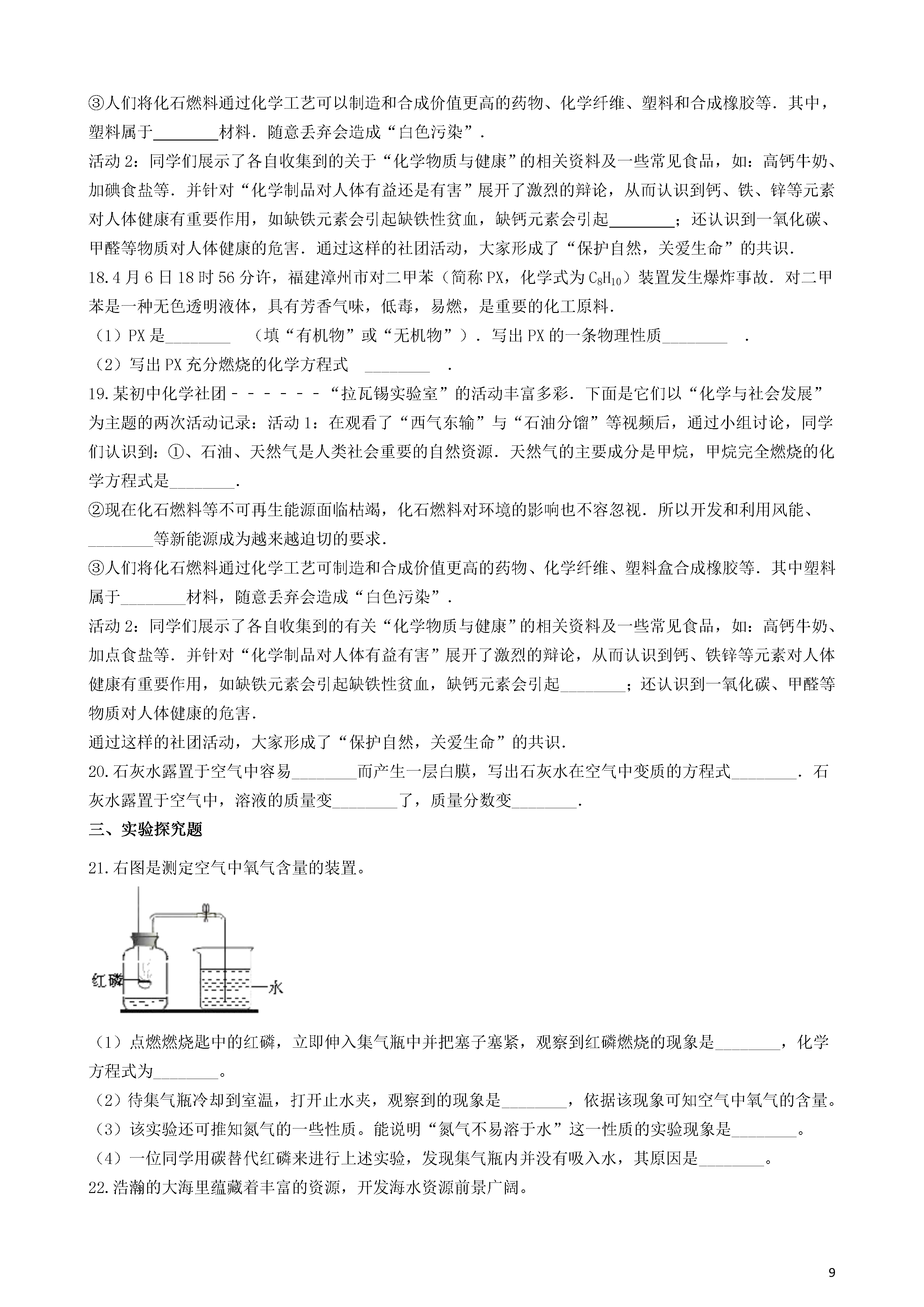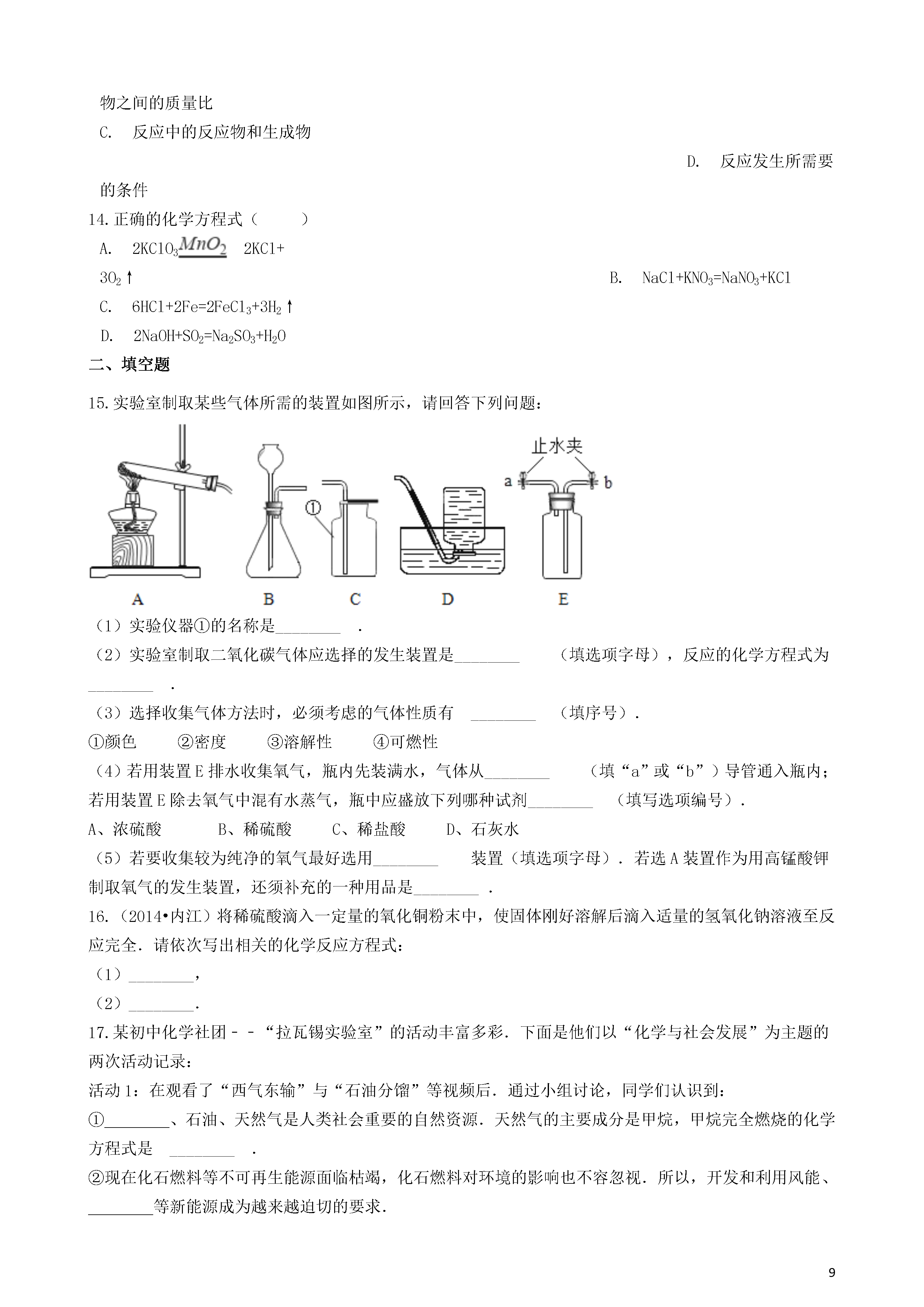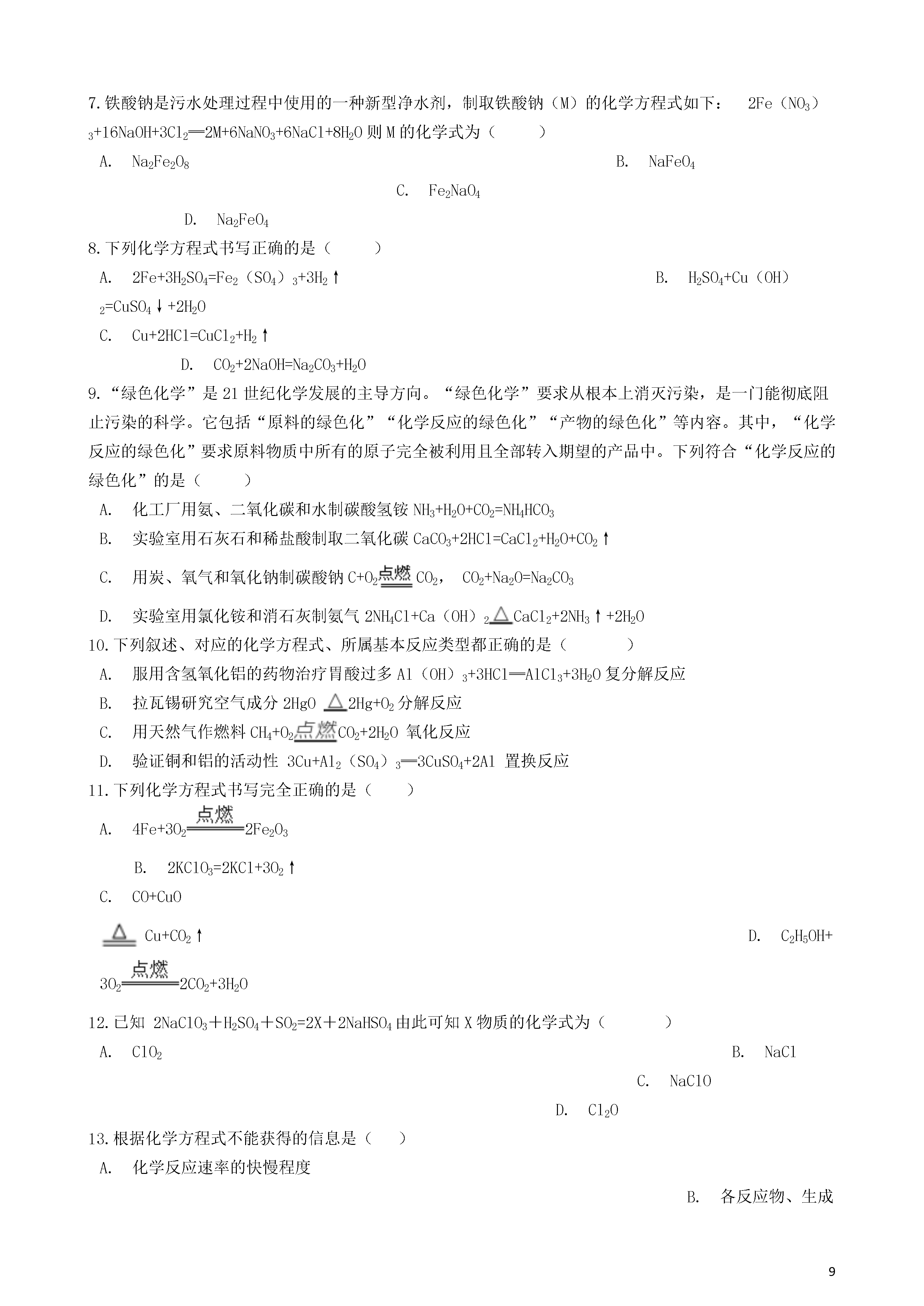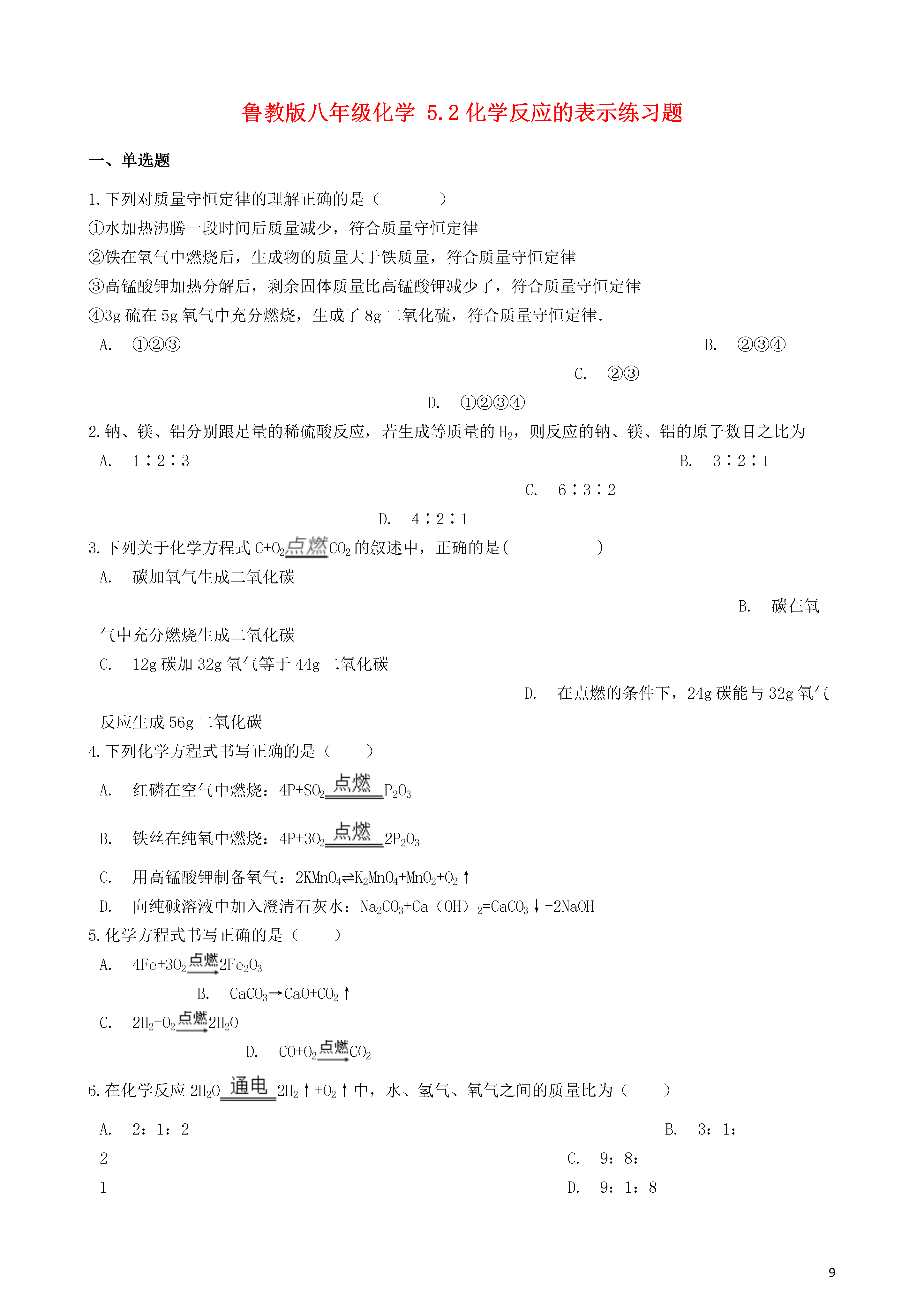 …………○…………外…………○…………装…………○…………订…………○…………线…………○…………※※请※※不※※要※※在※※装※※订※※线※※内※※答※※题※※…………○…………内…………○…………装…………○…………订…………○…………线…………○…………9鲁教版八年级化学5.2化学反应的表示练习题一、单选题1.下列对质量守恒定律的理解正确的是()①水加热沸腾一段时间后质量减少,符合质量守恒定律②铁在氧气中燃烧后,生成物的质量大于铁质量,符合质量守恒定律③高锰酸钾加热分解后,剩余固体质量比高锰酸钾减少了,符合质量守恒定律④3g硫在5g氧气中充分燃烧,生成了8g二氧化硫,符合质量守恒定律.A.①②③B.②③④C.②③D.①②③④2.钠、镁、铝分别跟足量的稀硫酸反应,若生成等质量的H2,则反应的钠、镁、铝的原子数目之比为A.1∶2∶3B.3∶2∶1C.6∶3∶2D.4∶2∶13.下列关于化学方程式C+O2CO2的叙述中,正确的是()A.碳加氧气生成二氧化碳B.碳在氧气中充分燃烧生成二氧化碳C.12g碳加32g氧气等于44g二氧化碳D.在点燃的条件下,24g碳能与32g氧气反应生成56g二氧化碳4.下列化学方程式书写正确的是()A.红磷在空气中燃烧:4P+SO2P2O3B.铁丝在纯氧中燃烧:4P+3O22P2O3C.用高锰酸钾制备氧气:2KMnO4⇌K2MnO4+MnO2+O2↑D.向纯碱溶液中加入澄清石灰水:Na2CO3+Ca(OH)2=CaCO3↓+2NaOH5.化学方程式书写正确的是()A.4Fe+3O22Fe2O3B.CaCO3→CaO+CO2↑C.2H2+O22H2OD.CO+O2CO26.在化学反应2H2O2H2↑+O2↑中,水、氢气、氧气之间的质量比为()A.2:1:2B.3:1:2C.9:8:1D.9:1:87.铁酸钠是污水处理过程中使用的一种新型净水剂,制取铁酸钠(M)的化学方程式如下:2Fe(NO3)3+16NaOH+3Cl2═2M+6NaNO3+6NaCl+8H2O则M的化学式为()A.Na2Fe2O8B.NaFeO4C.Fe2NaO4D.Na2FeO48.下列化学方程式书写正确的是()A.2Fe+3H2SO4=Fe2(SO4)3+3H2↑B.H2SO4+Cu(OH)2=CuSO4↓+2H2OC.Cu+2HCl=CuCl2+H2↑D.CO2+2NaOH=Na2CO3+H2O9.“绿色化学”是21世纪化学发展的主导方向。“绿色化学”要求从根本上消灭污染,是一门能彻底阻止污染的科学。它包括“原料的绿色化”“化学反应的绿色化”“产物的绿色化”等内容。其中,“化学反应的绿色化”要求原料物质中所有的原子完全被利用且全部转入期望的产品中。下列符合“化学反应的绿色化”的是()A.化工厂用氨、二氧化碳和水制碳酸氢铵NH3+H2O+CO2=NH4HCO3B.实验室用石灰石和稀盐酸制取二氧化碳CaCO3+2HCl=CaCl2+H2O+CO2↑C.用炭、氧气和氧化钠制碳酸钠C+O2CO2,CO2+Na2O=Na2CO3D.实验室用氯化铵和消石灰制氨气2NH4Cl+Ca(OH)2CaCl2+2NH3↑+2H2O10.下列叙述、对应的化学方程式、所属基本反应类型都正确的是()A