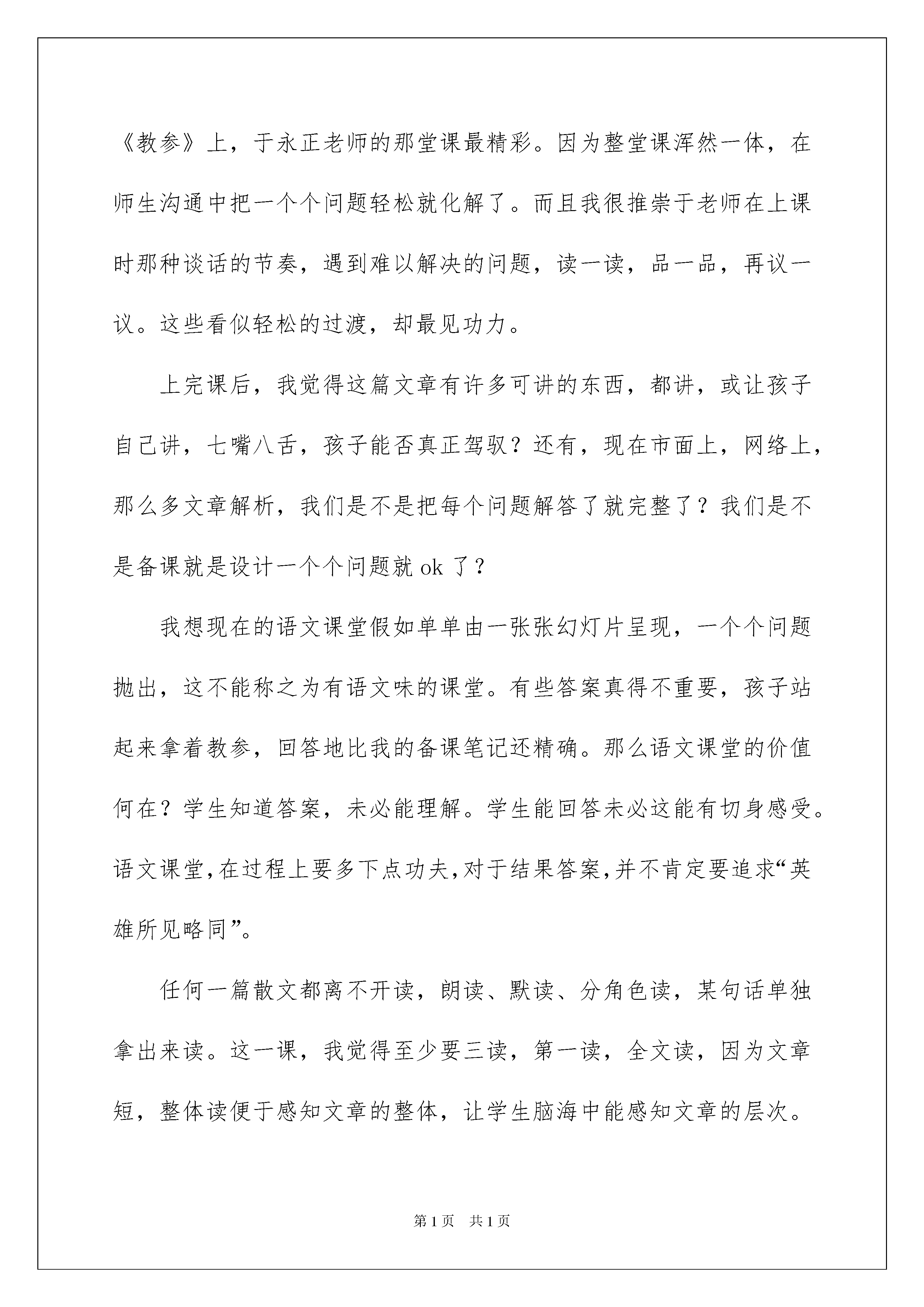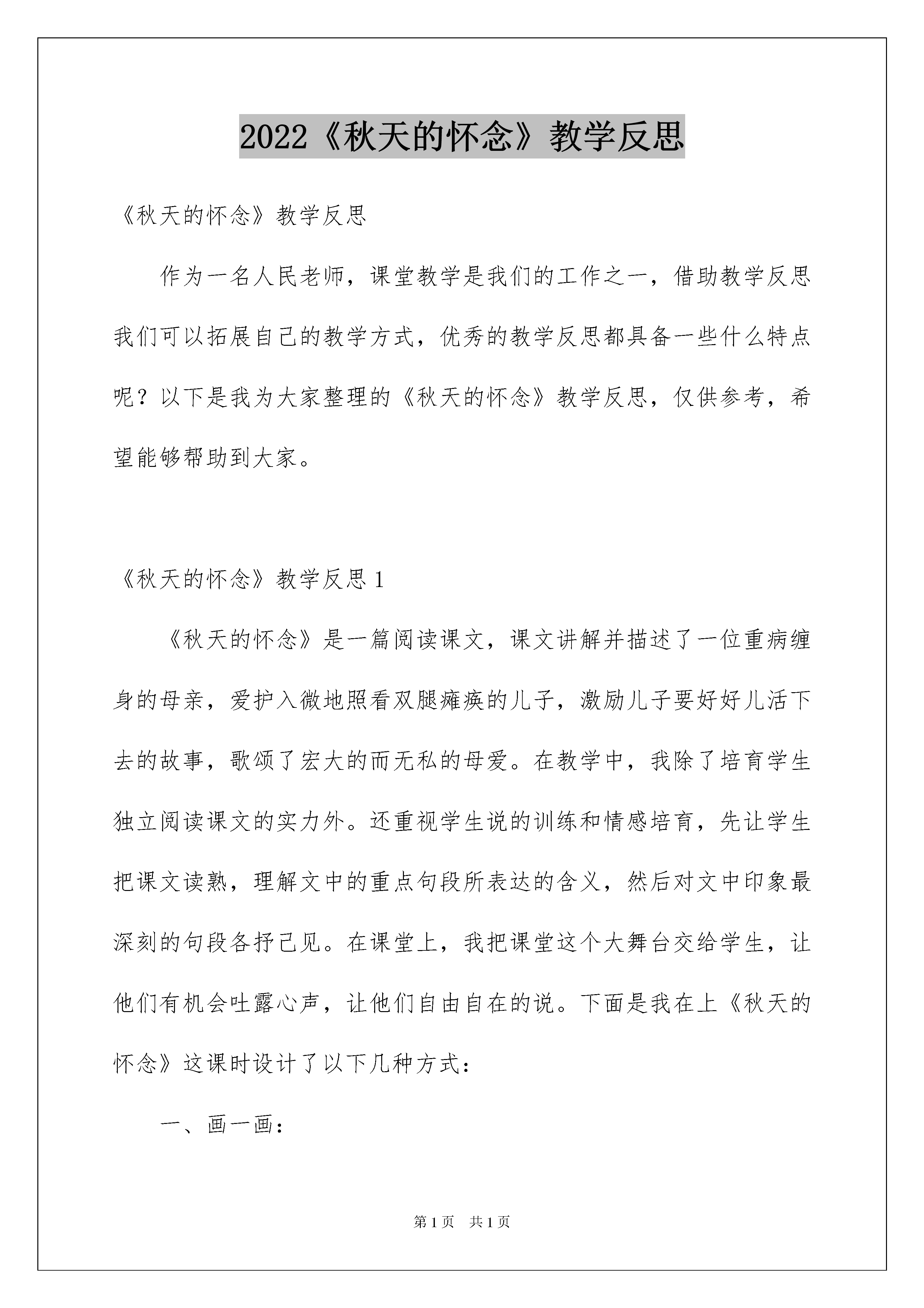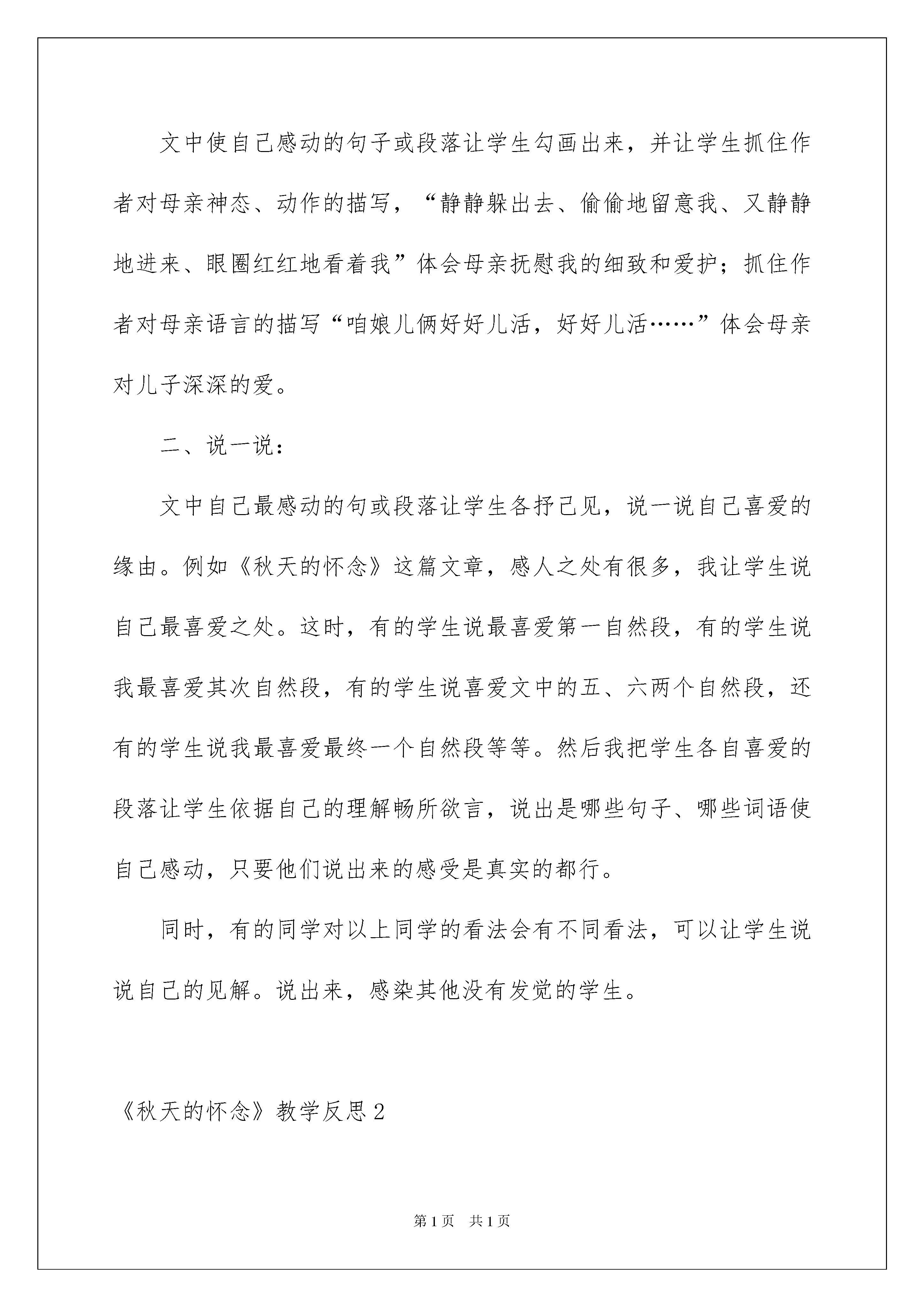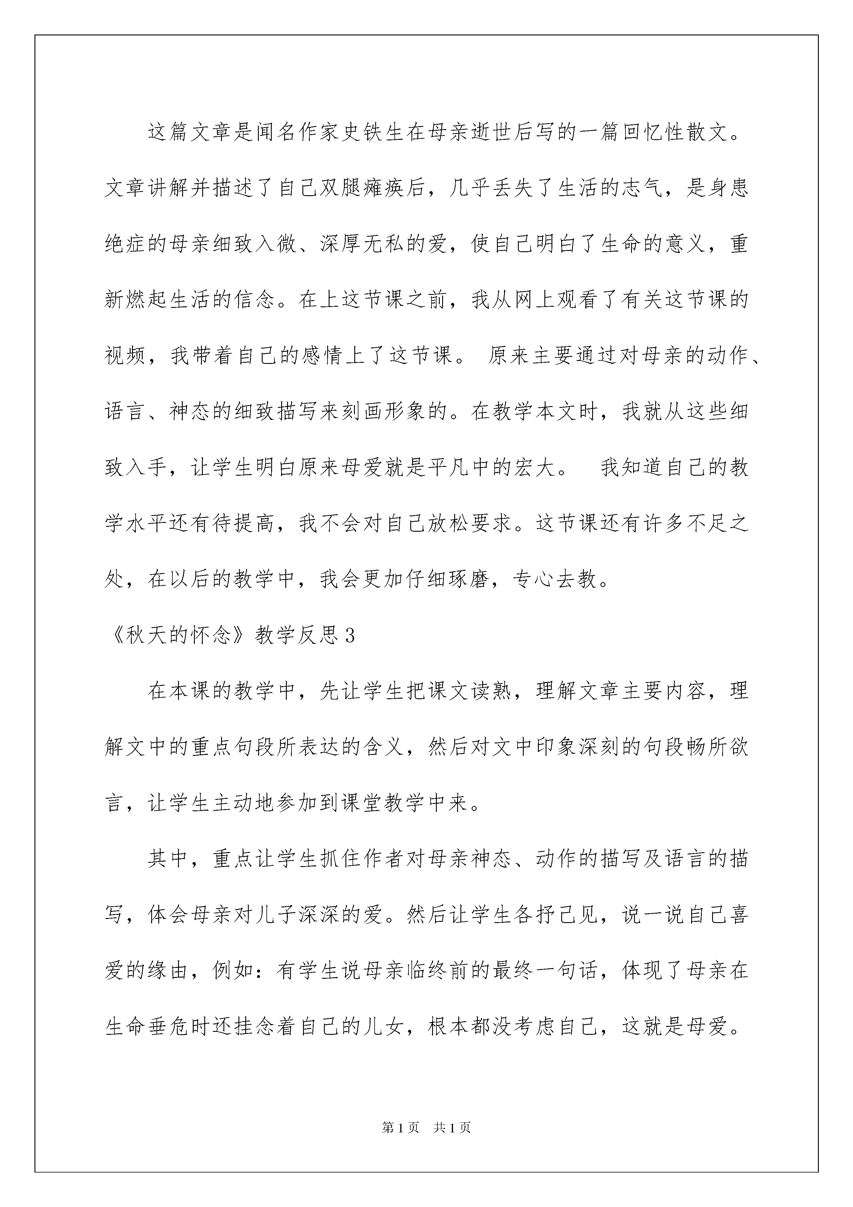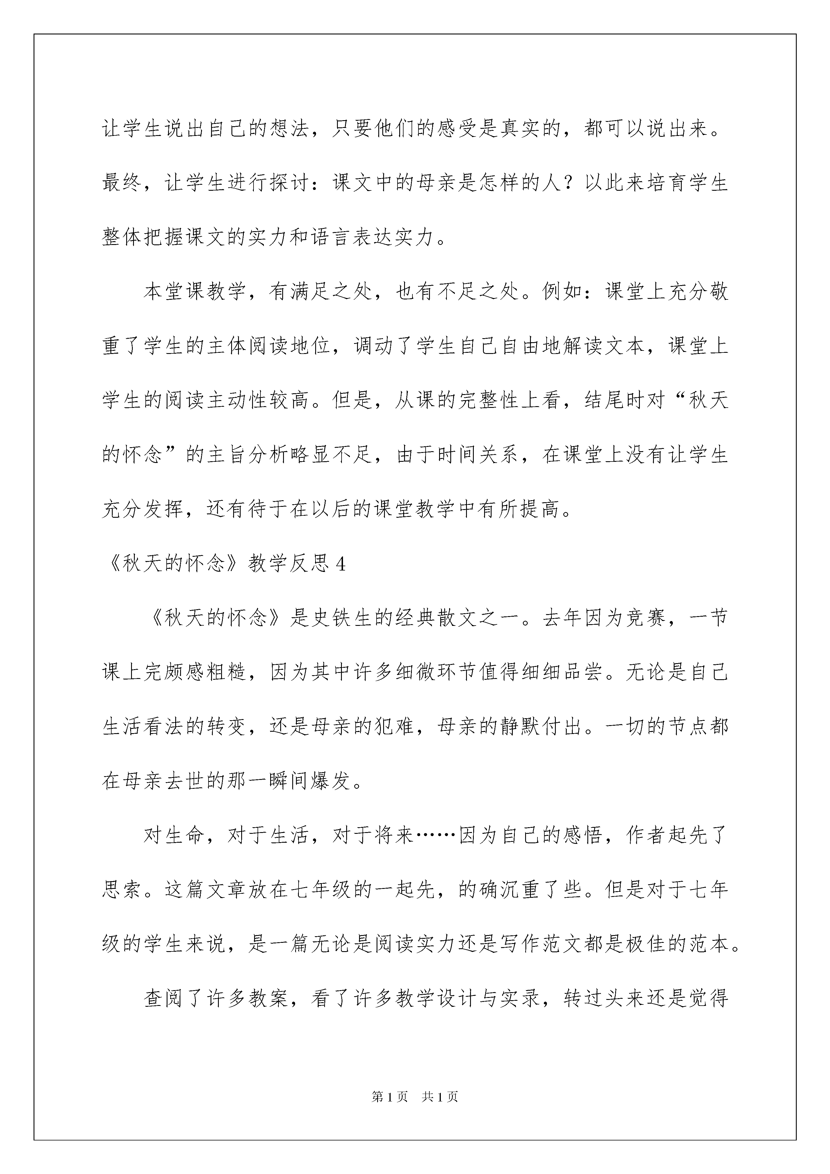 2022《秋天的怀念》教学反思《秋天的怀念》教学反思作为一名人民老师,课堂教学是我们的工作之一,借助教学反思我们可以拓展自己的教学方式,优秀的教学反思都具备一些什么特点呢?以下是我为大家整理的《秋天的怀念》教学反思,仅供参考,希望能够帮助到大家。《秋天的怀念》教学反思1《秋天的怀念》是一篇阅读课文,课文讲解并描述了一位重病缠身的母亲,爱护入微地照看双腿瘫痪的儿子,激励儿子要好好儿活下去的故事,歌颂了宏大的而无私的母爱。在教学中,我除了培育学生独立阅读课文的实力外。还重视学生说的训练和情感培育,先让学生把课文读熟,理解文中的重点句段所表达的含义,然后对文中印象最深刻的句段各抒己见。在课堂上,我把课堂这个大舞台交给学生,让他们有机会吐露心声,让他们自由自在的说。下面是我在上《秋天的怀念》这课时设计了以下几种方式:一、画一画:文中使自己感动的句子或段落让学生勾画出来,并让学生抓住作者对母亲神态、动作的描写,“静静躲出去、偷偷地留意我、又静静地进来、眼圈红红地看着我”体会母亲抚慰我的细致和爱护;抓住作者对母亲语言的描写“咱娘儿俩好好儿活,好好儿活……”体会母亲对儿子深深的爱。二、说一说:文中自己最感动的句或段落让学生各抒己见,说一说自己喜爱的缘由。例如《秋天的怀念》这篇文章,感人之处有很多,我让学生说自己最喜爱之处。这时,有的学生说最喜爱第一自然段,有的学生说我最喜爱其次自然段,有的学生说喜爱文中的五、六两个自然段,还有的学生说我最喜爱最终一个自然段等等。然后我把学生各自喜爱的段落让学生依据自己的理解畅所欲言,说出是哪些句子、哪些词语使自己感动,只要他们说出来的感受是真实的都行。同时,有的同学对以上同学的看法会有不同看法,可以让学生说说自己的见解。说出来,感染其他没有发觉的学生。《秋天的怀念》教学反思2这篇文章是闻名作家史铁生在母亲逝世后写的一篇回忆性散文。文章讲解并描述了自己双腿瘫痪后,几乎丢失了生活的志气,是身患绝症的母亲细致入微、深厚无私的爱,使自己明白了生命的意义,重新燃起生活的信念。在上这节课之前,我从网上观看了有关这节课的视频,我带着自己的感情上了这节课。原来主要通过对母亲的动作、语言、神态的细致描写来刻画形象的。在教学本文时,我就从这些细致入手,让学生明白原来母爱就是平凡中的宏大。我知道自己的教学水平还有待提高,我不会对自己放松要求。这节课还有许多不足之处,在以后的教学中,我会更加仔细琢磨,专心去教。《秋天的怀念》教学反思3在本课的教学中,先让学生把课文读熟,理解文章主要内容,理解文中的重点句段所表达的含义,然后对文中印象深刻的句段畅所欲言,让学生主动地参加到课堂教学中来。其中,重点让学生抓住作者对母亲神态、动作的描写及语言的描写,体会母亲对儿子深深的爱。然后让学生各抒己见,说一说自己喜爱的缘由,例如:有学生说母亲临终前的最终一句话,体现了母亲在生命垂危时还挂念着自己的儿女,根本都没考虑自己,这就是母爱。让学生说出自己的想法,只要他们的感受是真实的,都可以说出来。最终,让学生进行探讨:课文中的母亲是怎样的人?以此来培育学生整体把握课文的实力和语言表达实力。本堂课教学,有满足之处,也有不足之处。例如:课堂上充分敬重了学生的主体阅读地位,调动了学生自己自由地解读文本,课堂上学生的阅读主动性较高。但是,从课的完整性上看,结尾时对“秋天的怀念”的主旨分析略显不足,由于时间关系,在课堂上没有让学生充分发挥,还有待于在以后的课堂教学中有所提高。《秋天的怀念》教学反思4《秋天的怀念》是史铁生的经典散文之一。去年因为竞赛,一节课上完颇感粗糙,因为其中许多细微环节值得细细品尝。无论是自己生活看法的转变,还是母亲的犯难,母亲的静默付出。一切的节点都在母亲去世的那一瞬间爆发。对生命,对于生活,对于将来……因为自己的感悟,作者起先了思索。这篇文章放在七年级的一起先,的确沉重了些。但是对于七年级的学生来说,是一篇无论是阅读实力还是写作范文都是极佳的范本。查阅了许多教案,看了许多教学设计与实录,转过头来还是觉得《教参》上,于永正老师的那堂课最精彩。因为整堂课浑然一体,在师生沟通中把一个个问题轻松就化解了。而且我很推崇于老师在上课时那种谈话的节奏,遇到难以解决的问题,读一读,品一品,再议一议。这些看似轻松的过渡,却最见功力。上完课后,我觉得这篇文章有许多可讲的东西,都讲,或让孩子自己讲,七嘴八舌,孩子能否真正驾驭?还有,现在市面上,网络上,那么多文章解析,我们是不是把每个问题解答了就完整了?我们是不是备课就是设计一个个问题就ok了?我想现在的语文课堂假如单单由一张张幻灯片呈现,一个个问题抛出,这