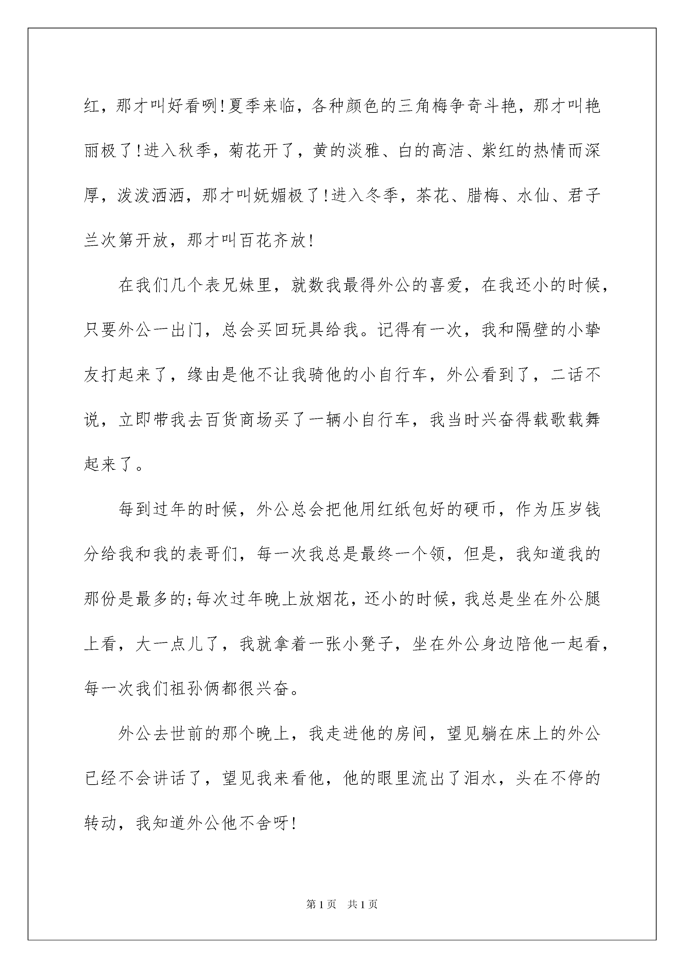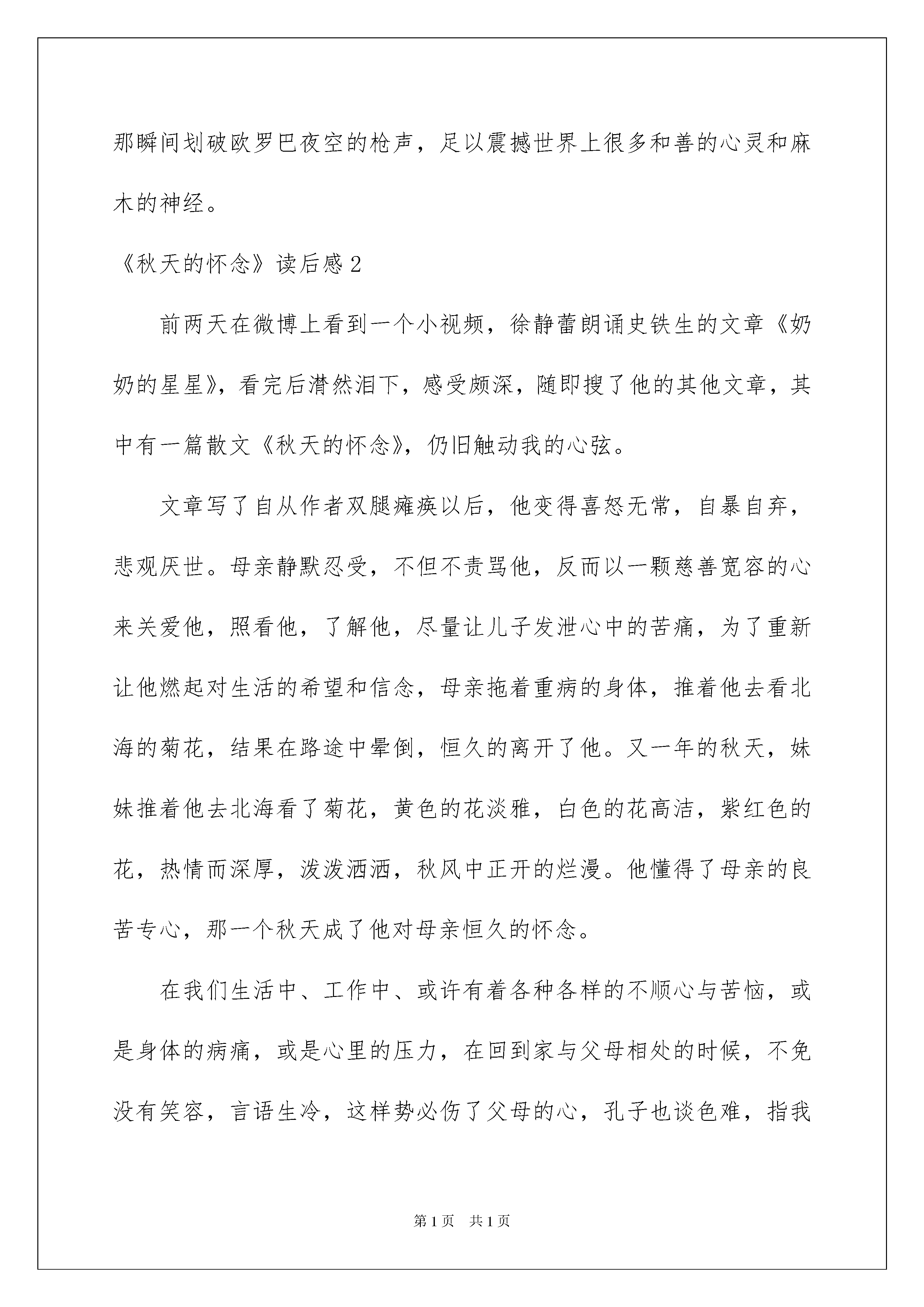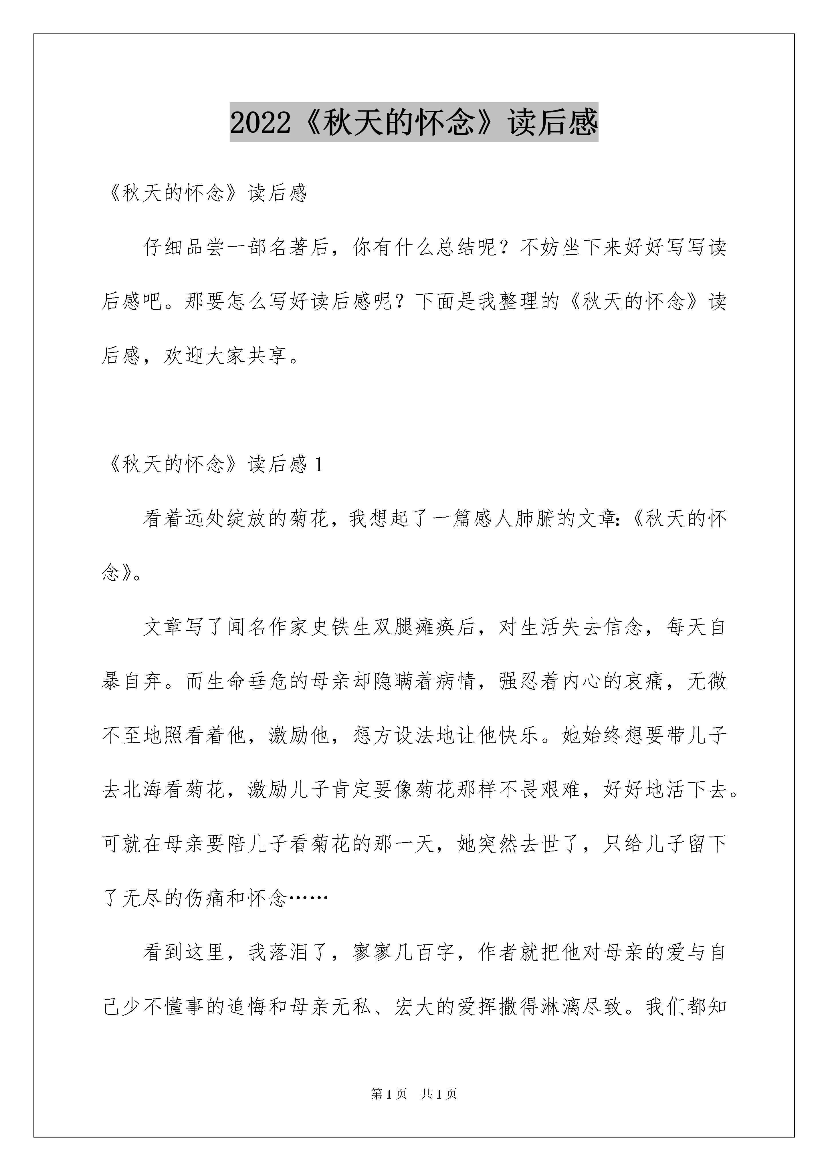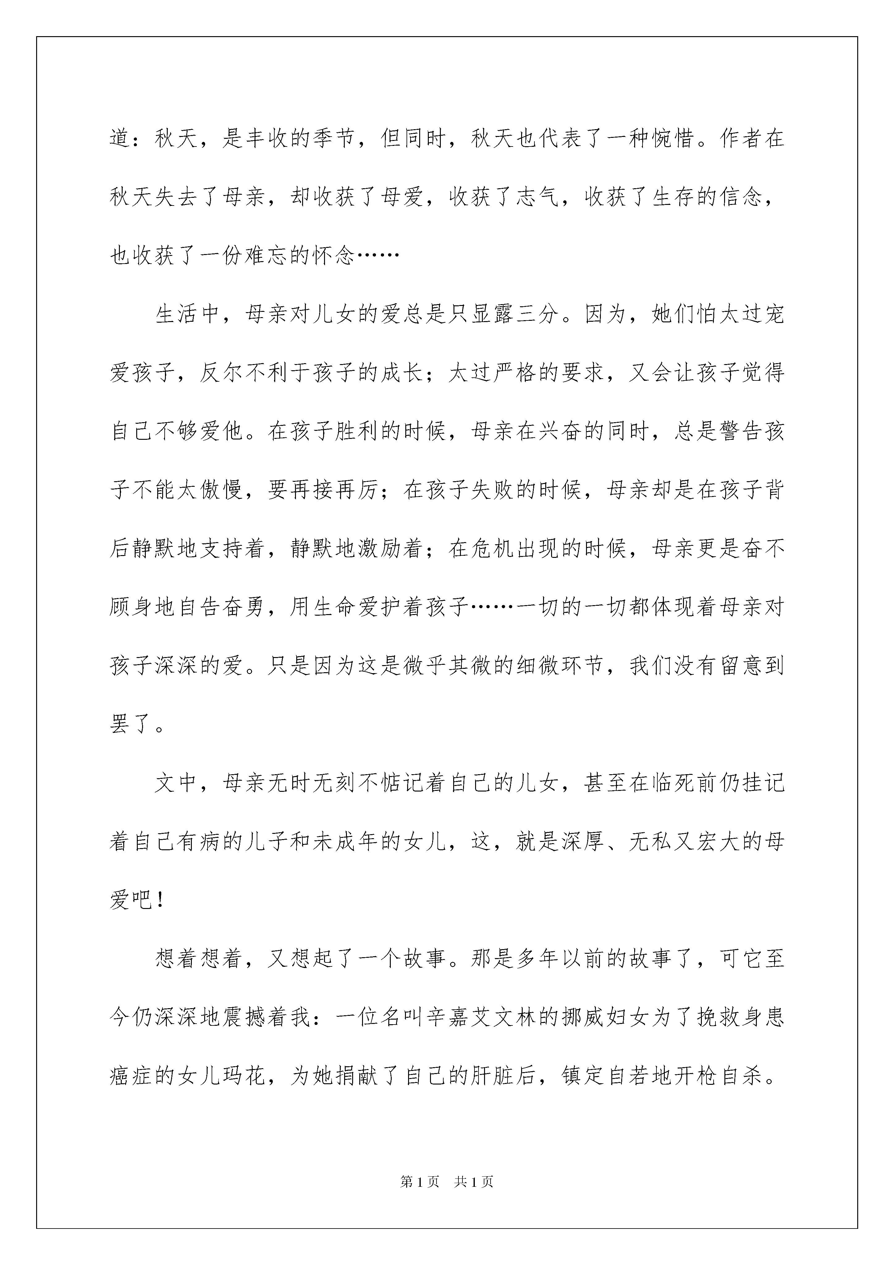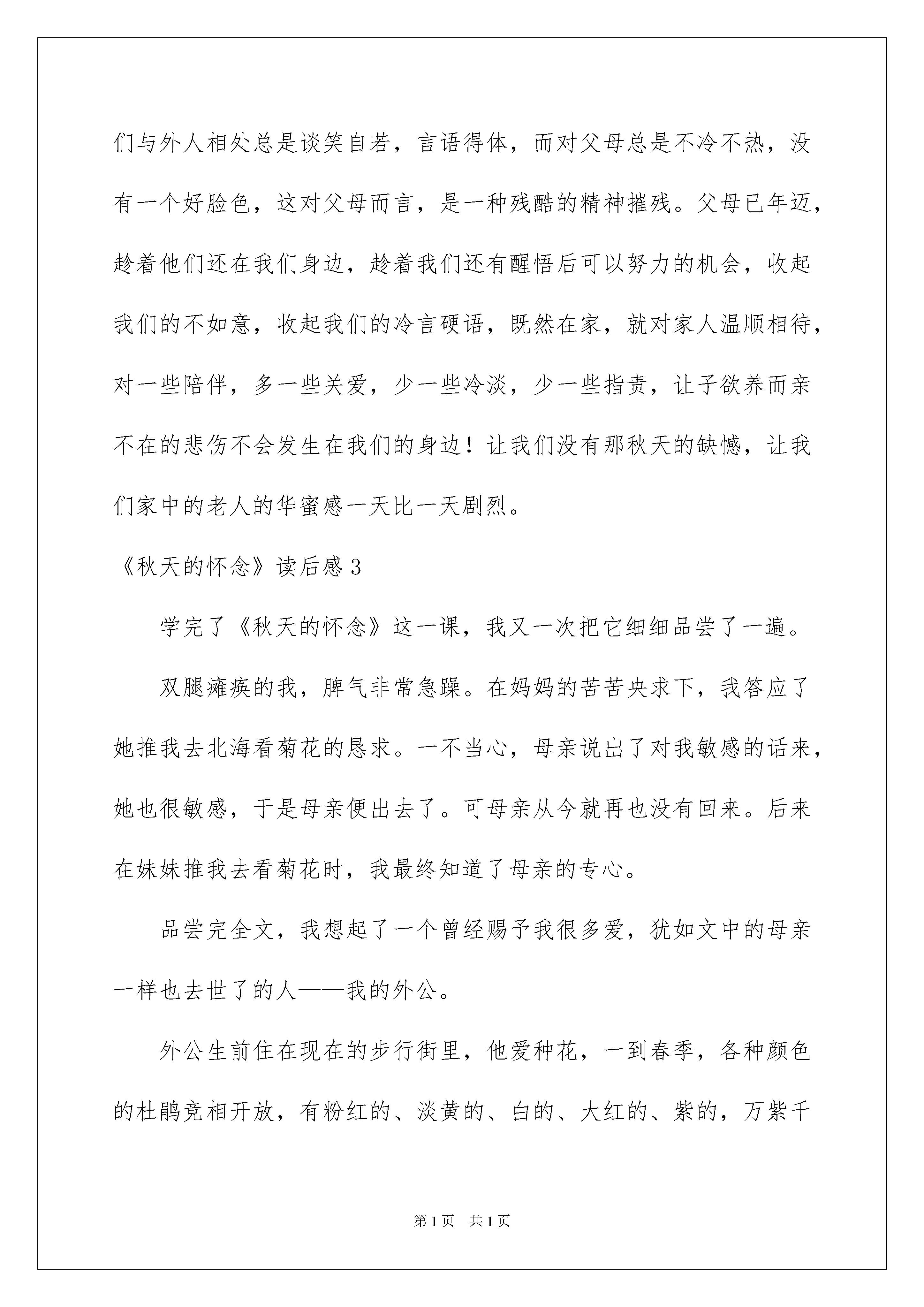 2022《秋天的怀念》读后感《秋天的怀念》读后感仔细品尝一部名著后,你有什么总结呢?不妨坐下来好好写写读后感吧。那要怎么写好读后感呢?下面是我整理的《秋天的怀念》读后感,欢迎大家共享。《秋天的怀念》读后感1看着远处绽放的菊花,我想起了一篇感人肺腑的文章:《秋天的怀念》。文章写了闻名作家史铁生双腿瘫痪后,对生活失去信念,每天自暴自弃。而生命垂危的母亲却隐瞒着病情,强忍着内心的哀痛,无微不至地照看着他,激励他,想方设法地让他快乐。她始终想要带儿子去北海看菊花,激励儿子肯定要像菊花那样不畏艰难,好好地活下去。可就在母亲要陪儿子看菊花的那一天,她突然去世了,只给儿子留下了无尽的伤痛和怀念……看到这里,我落泪了,寥寥几百字,作者就把他对母亲的爱与自己少不懂事的追悔和母亲无私、宏大的爱挥撒得淋漓尽致。我们都知道:秋天,是丰收的季节,但同时,秋天也代表了一种惋惜。作者在秋天失去了母亲,却收获了母爱,收获了志气,收获了生存的信念,也收获了一份难忘的怀念……生活中,母亲对儿女的爱总是只显露三分。因为,她们怕太过宠爱孩子,反尔不利于孩子的成长;太过严格的要求,又会让孩子觉得自己不够爱他。在孩子胜利的时候,母亲在兴奋的同时,总是警告孩子不能太傲慢,要再接再厉;在孩子失败的时候,母亲却是在孩子背后静默地支持着,静默地激励着;在危机出现的时候,母亲更是奋不顾身地自告奋勇,用生命爱护着孩子……一切的一切都体现着母亲对孩子深深的爱。只是因为这是微乎其微的细微环节,我们没有留意到罢了。文中,母亲无时无刻不惦记着自己的儿女,甚至在临死前仍挂记着自己有病的儿子和未成年的女儿,这,就是深厚、无私又宏大的母爱吧!想着想着,又想起了一个故事。那是多年以前的故事了,可它至今仍深深地震撼着我:一位名叫辛嘉艾文林的挪威妇女为了挽救身患癌症的女儿玛花,为她捐献了自己的肝脏后,镇定自若地开枪自杀。那瞬间划破欧罗巴夜空的枪声,足以震撼世界上很多和善的心灵和麻木的神经。《秋天的怀念》读后感2前两天在微博上看到一个小视频,徐静蕾朗诵史铁生的文章《奶奶的星星》,看完后潸然泪下,感受颇深,随即搜了他的其他文章,其中有一篇散文《秋天的怀念》,仍旧触动我的心弦。文章写了自从作者双腿瘫痪以后,他变得喜怒无常,自暴自弃,悲观厌世。母亲静默忍受,不但不责骂他,反而以一颗慈善宽容的心来关爱他,照看他,了解他,尽量让儿子发泄心中的苦痛,为了重新让他燃起对生活的希望和信念,母亲拖着重病的身体,推着他去看北海的菊花,结果在路途中晕倒,恒久的离开了他。又一年的秋天,妹妹推着他去北海看了菊花,黄色的花淡雅,白色的花高洁,紫红色的花,热情而深厚,泼泼洒洒,秋风中正开的烂漫。他懂得了母亲的良苦专心,那一个秋天成了他对母亲恒久的怀念。在我们生活中、工作中、或许有着各种各样的不顺心与苦恼,或是身体的病痛,或是心里的压力,在回到家与父母相处的时候,不免没有笑容,言语生冷,这样势必伤了父母的心,孔子也谈色难,指我们与外人相处总是谈笑自若,言语得体,而对父母总是不冷不热,没有一个好脸色,这对父母而言,是一种残酷的精神摧残。父母已年迈,趁着他们还在我们身边,趁着我们还有醒悟后可以努力的机会,收起我们的不如意,收起我们的冷言硬语,既然在家,就对家人温顺相待,对一些陪伴,多一些关爱,少一些冷淡,少一些指责,让子欲养而亲不在的悲伤不会发生在我们的身边!让我们没有那秋天的缺憾,让我们家中的老人的华蜜感一天比一天剧烈。《秋天的怀念》读后感3学完了《秋天的怀念》这一课,我又一次把它细细品尝了一遍。双腿瘫痪的我,脾气非常急躁。在妈妈的苦苦央求下,我答应了她推我去北海看菊花的恳求。一不当心,母亲说出了对我敏感的话来,她也很敏感,于是母亲便出去了。可母亲从今就再也没有回来。后来在妹妹推我去看菊花时,我最终知道了母亲的专心。品尝完全文,我想起了一个曾经赐予我很多爱,犹如文中的母亲一样也去世了的人——我的外公。外公生前住在现在的步行街里,他爱种花,一到春季,各种颜色的杜鹃竞相开放,有粉红的、淡黄的、白的、大红的、紫的,万紫千红,那才叫好看咧!夏季来临,各种颜色的三角梅争奇斗艳,那才叫艳丽极了!进入秋季,菊花开了,黄的淡雅、白的高洁、紫红的热情而深厚,泼泼洒洒,那才叫妩媚极了!进入冬季,茶花、腊梅、水仙、君子兰次第开放,那才叫百花齐放!在我们几个表兄妹里,就数我最得外公的喜爱,在我还小的时候,只要外公一出门,总会买回玩具给我。记得有一次,我和隔壁的小挚友打起来了,缘由是他不让我骑他的小自行车,外公看到了,二话不说,立即带我去百货商场买了一辆小自行车,我当时兴奋得载歌载舞起来了。每到过年的时候,