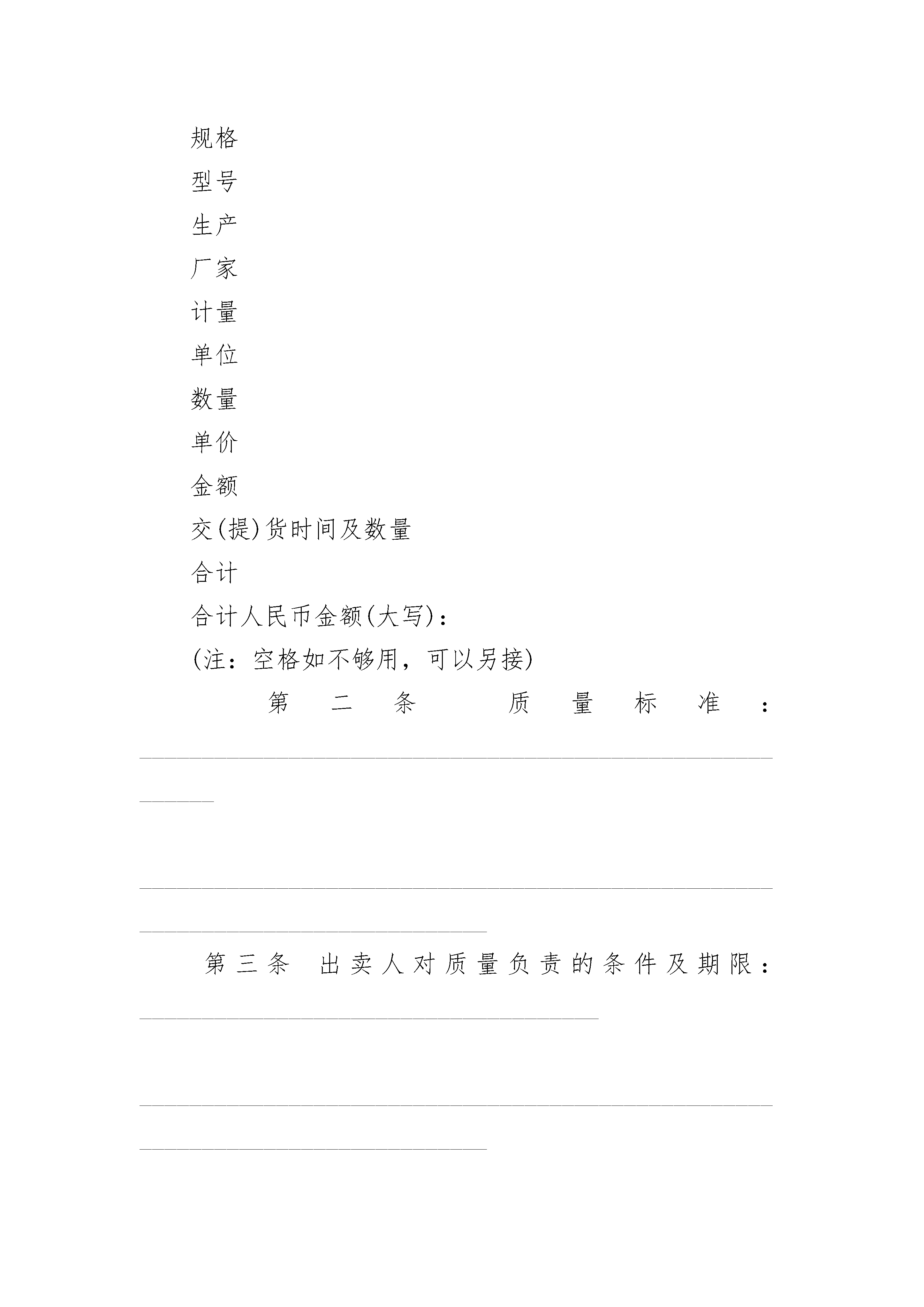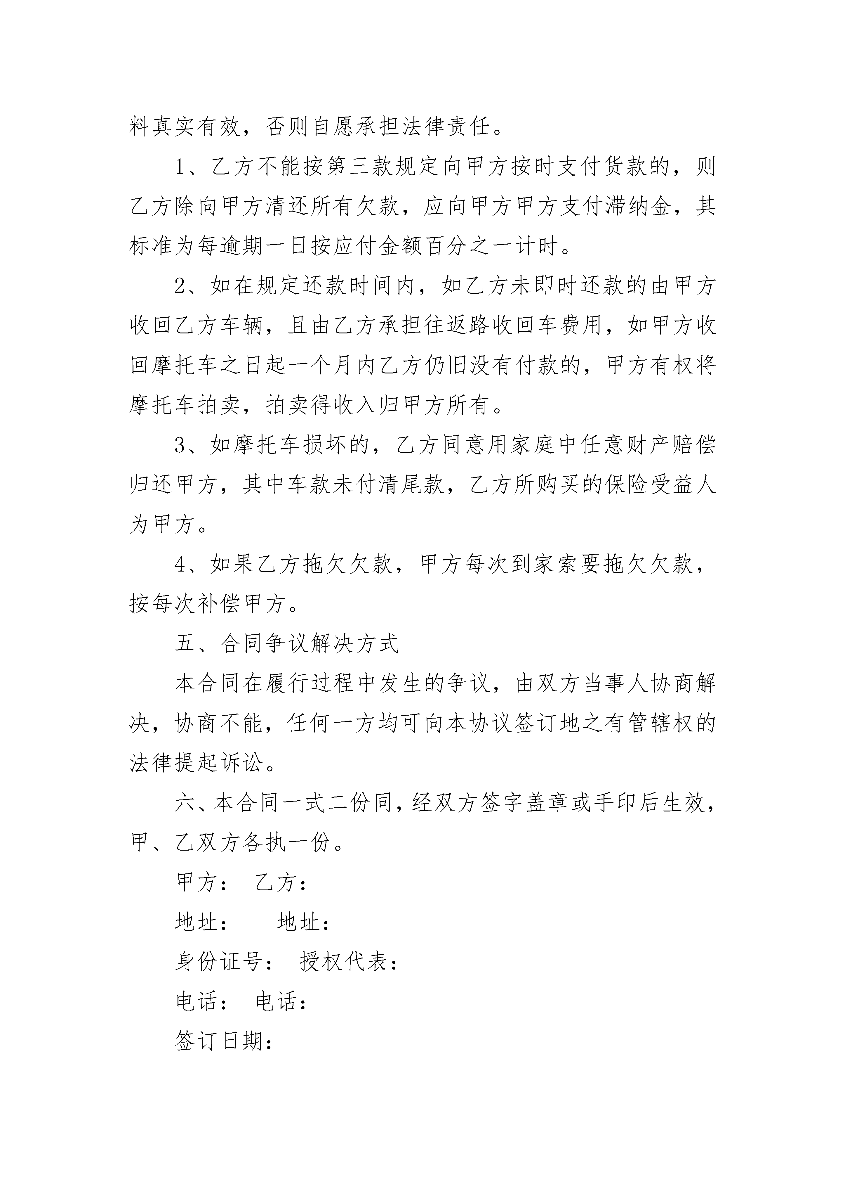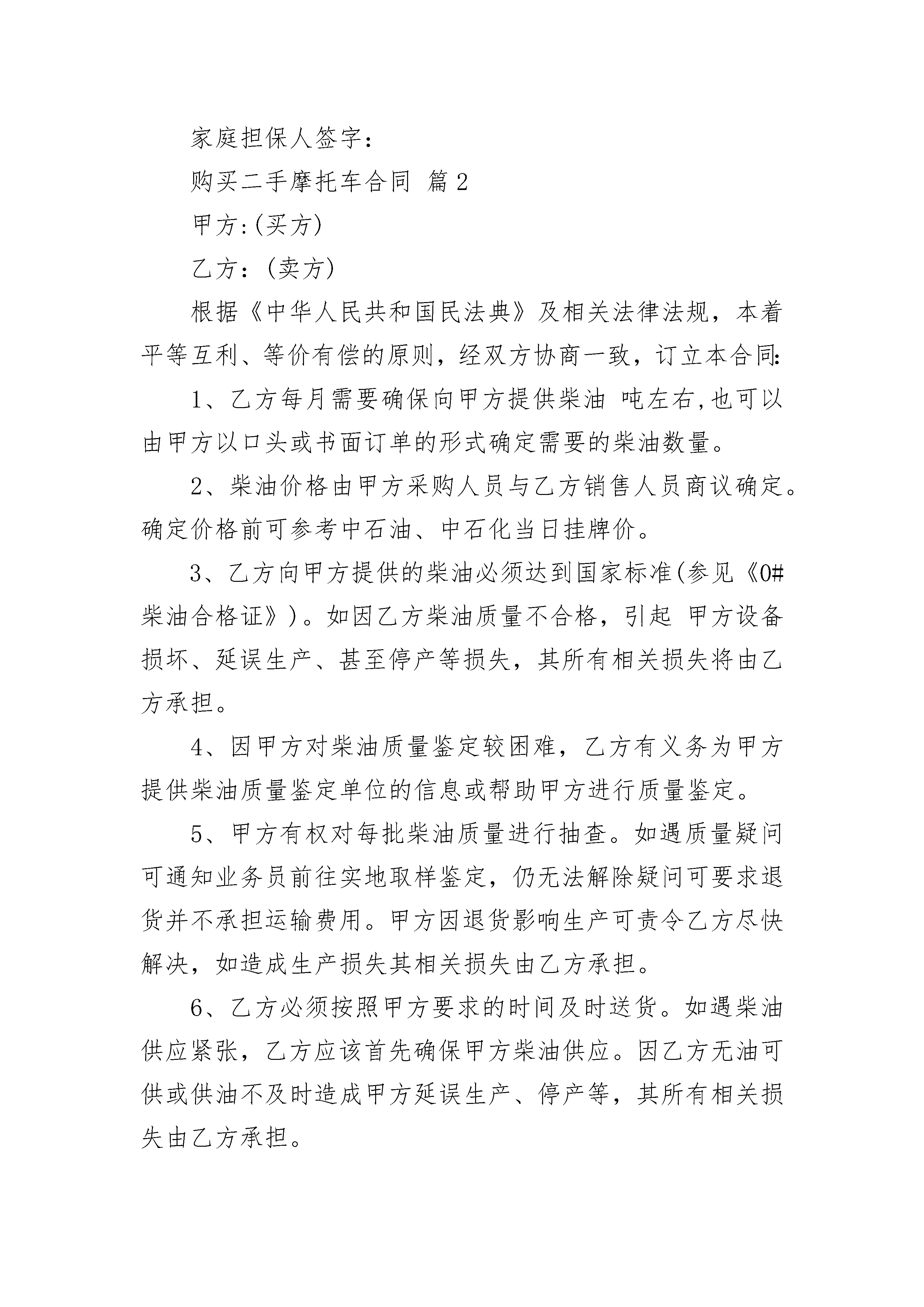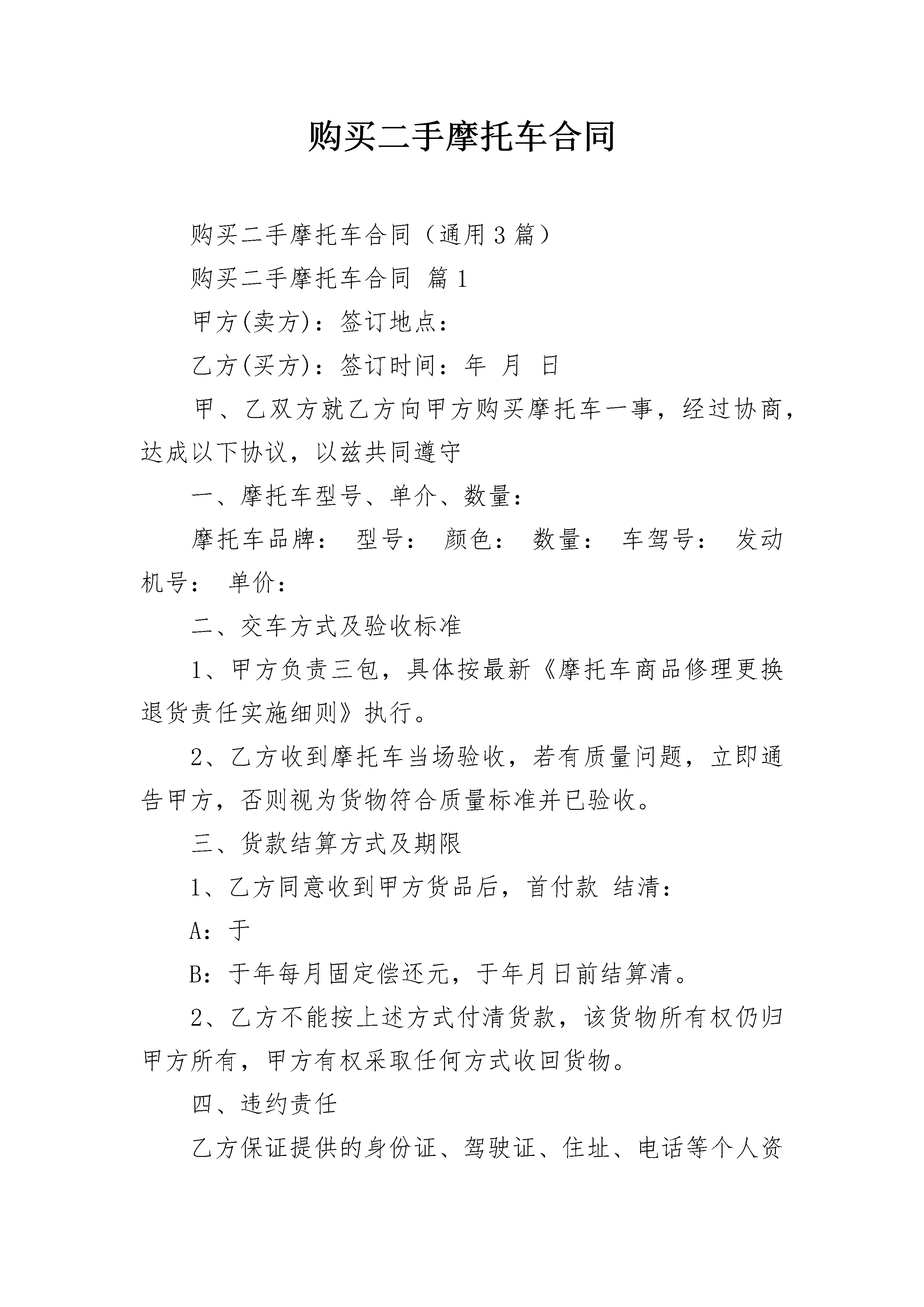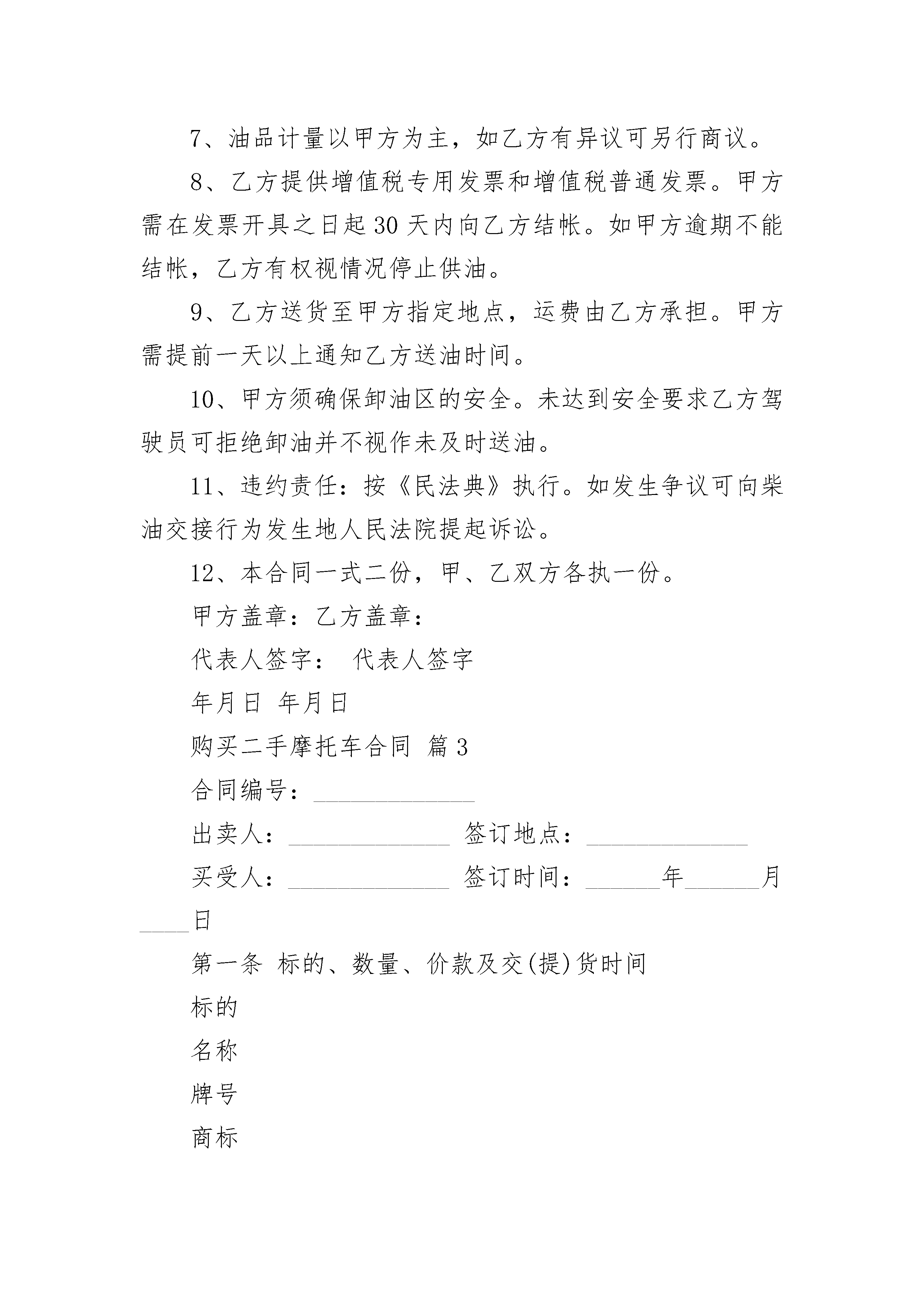 购买二手摩托车合同购买二手摩托车合同(通用3篇)购买二手摩托车合同篇1甲方(卖方):签订地点:乙方(买方):签订时间:年月日甲、乙双方就乙方向甲方购买摩托车一事,经过协商,达成以下协议,以兹共同遵守一、摩托车型号、单介、数量:摩托车品牌:型号:颜色:数量:车驾号:发动机号:单价:二、交车方式及验收标准1、甲方负责三包,具体按最新《摩托车商品修理更换退货责任实施细则》执行。2、乙方收到摩托车当场验收,若有质量问题,立即通告甲方,否则视为货物符合质量标准并已验收。三、货款结算方式及期限1、乙方同意收到甲方货品后,首付款结清:A:于B:于年每月固定偿还元,于年月日前结算清。2、乙方不能按上述方式付清货款,该货物所有权仍归甲方所有,甲方有权采取任何方式收回货物。四、违约责任乙方保证提供的身份证、驾驶证、住址、电话等个人资料真实有效,否则自愿承担法律责任。1、乙方不能按第三款规定向甲方按时支付货款的,则乙方除向甲方清还所有欠款,应向甲方甲方支付滞纳金,其标准为每逾期一日按应付金额百分之一计时。2、如在规定还款时间内,如乙方未即时还款的由甲方收回乙方车辆,且由乙方承担往返路收回车费用,如甲方收回摩托车之日起一个月内乙方仍旧没有付款的,甲方有权将摩托车拍卖,拍卖得收入归甲方所有。3、如摩托车损坏的,乙方同意用家庭中任意财产赔偿归还甲方,其中车款未付清尾款,乙方所购买的保险受益人为甲方。4、如果乙方拖欠欠款,甲方每次到家索要拖欠欠款,按每次补偿甲方。五、合同争议解决方式本合同在履行过程中发生的争议,由双方当事人协商解决,协商不能,任何一方均可向本协议签订地之有管辖权的法律提起诉讼。六、本合同一式二份同,经双方签字盖章或手印后生效,甲、乙双方各执一份。甲方:乙方:地址:地址:身份证号:授权代表:电话:电话:签订日期:家庭担保人签字:购买二手摩托车合同篇2甲方:(买方)乙方:(卖方)根据《中华人民共和国民法典》及相关法律法规,本着平等互利、等价有偿的原则,经双方协商一致,订立本合同:1、乙方每月需要确保向甲方提供柴油吨左右,也可以由甲方以口头或书面订单的形式确定需要的柴油数量。2、柴油价格由甲方采购人员与乙方销售人员商议确定。确定价格前可参考中石油、中石化当日挂牌价。3、乙方向甲方提供的柴油必须达到国家标准(参见《0#柴油合格证》)。如因乙方柴油质量不合格,引起甲方设备损坏、延误生产、甚至停产等损失,其所有相关损失将由乙方承担。4、因甲方对柴油质量鉴定较困难,乙方有义务为甲方提供柴油质量鉴定单位的信息或帮助甲方进行质量鉴定。5、甲方有权对每批柴油质量进行抽查。如遇质量疑问可通知业务员前往实地取样鉴定,仍无法解除疑问可要求退货并不承担运输费用。甲方因退货影响生产可责令乙方尽快解决,如造成生产损失其相关损失由乙方承担。6、乙方必须按照甲方要求的时间及时送货。如遇柴油供应紧张,乙方应该首先确保甲方柴油供应。因乙方无油可供或供油不及时造成甲方延误生产、停产等,其所有相关损失由乙方承担。7、油品计量以甲方为主,如乙方有异议可另行商议。8、乙方提供增值税专用发票和增值税普通发票。甲方需在发票开具之日起30天内向乙方结帐。如甲方逾期不能结帐,乙方有权视情况停止供油。9、乙方送货至甲方指定地点,运费由乙方承担。甲方需提前一天以上通知乙方送油时间。10、甲方须确保卸油区的安全。未达到安全要求乙方驾驶员可拒绝卸油并不视作未及时送油。11、违约责任:按《民法典》执行。如发生争议可向柴油交接行为发生地人民法院提起诉讼。12、本合同一式二份,甲、乙双方各执一份。甲方盖章:乙方盖章:代表人签字:代表人签字年月日年月日购买二手摩托车合同篇3合同编号:_____________出卖人:_____________签订地点:_____________买受人:_____________签订时间:______年______月____日第一条标的、数量、价款及交(提)货时间标的名称牌号商标规格型号生产厂家计量单位数量单价金额交(提)货时间及数量合计合计人民币金额(大写):(注:空格如不够用,可以另接)第二条质量标准:________________________________________________________________________________________________________________________________________第三条出卖人对质量负责的条件及期限:____________________________________________________________________________________________________________________第四条包装标准、包装物的