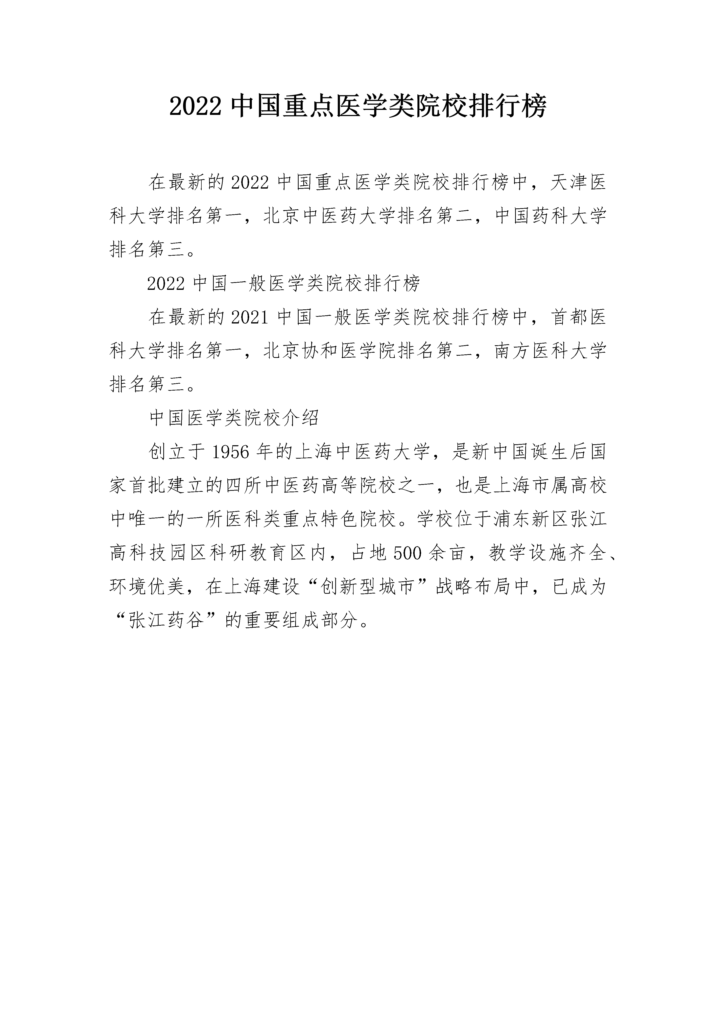 2022中国重点医学类院校排行榜在最新的2022中国重点医学类院校排行榜中,天津医科大学排名第一,北京中医药大学排名第二,中国药科大学排名第三。2022中国一般医学类院校排行榜在最新的2021中国一般医学类院校排行榜中,首都医科大学排名第一,北京协和医学院排名第二,南方医科大学排名第三。中国医学类院校介绍创立于1956年的上海中医药大学,是新中国诞生后国家首批建立的四所中医药高等院校之一,也是上海市属高校中唯一的一所医科类重点特色院校。学校位于浦东新区张江高科技园区科研教育区内,占地500余亩,教学设施齐全、环境优美,在上海建设“创新型城市”战略布局中,已成为“张江药谷”的重要组成部分。