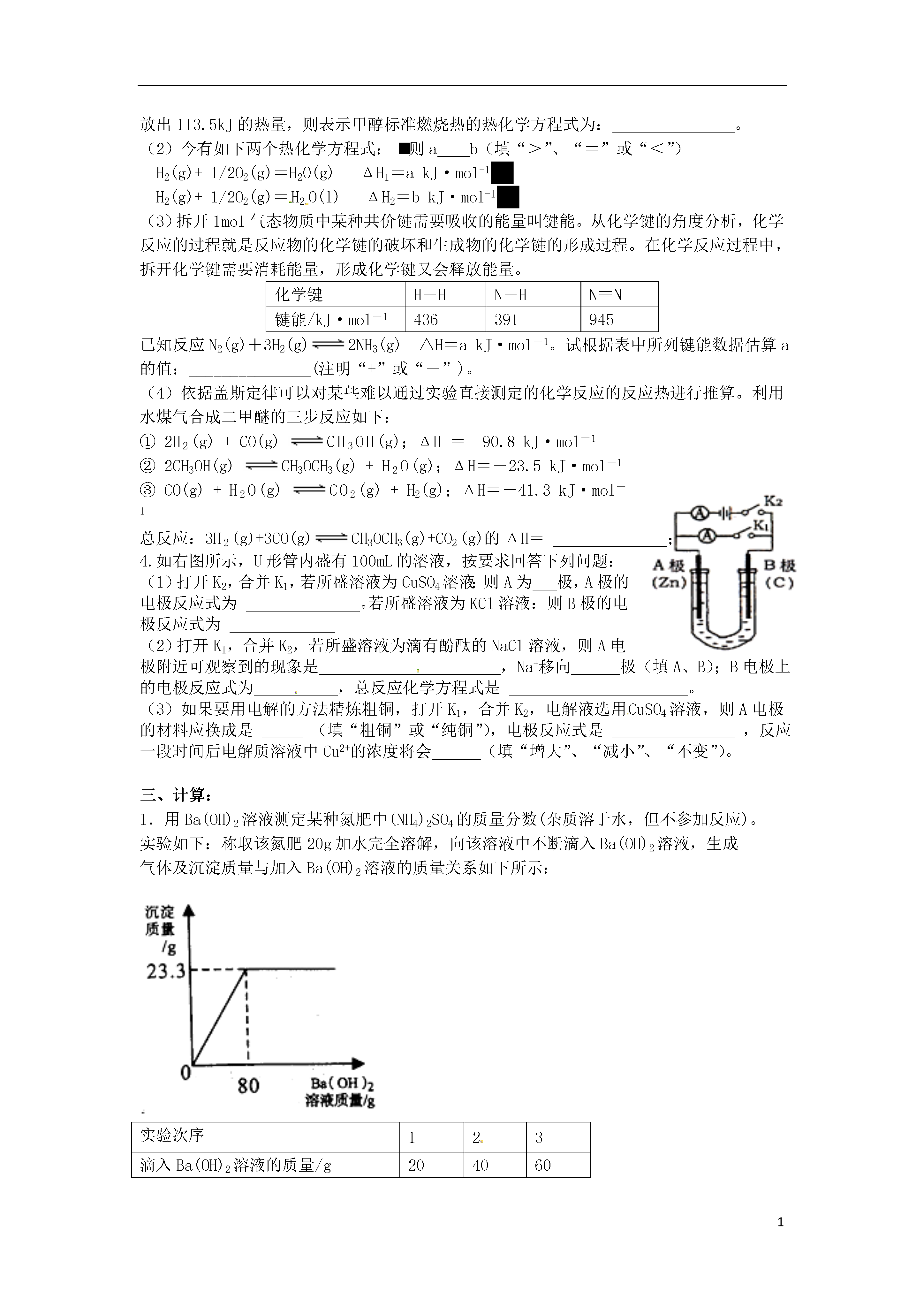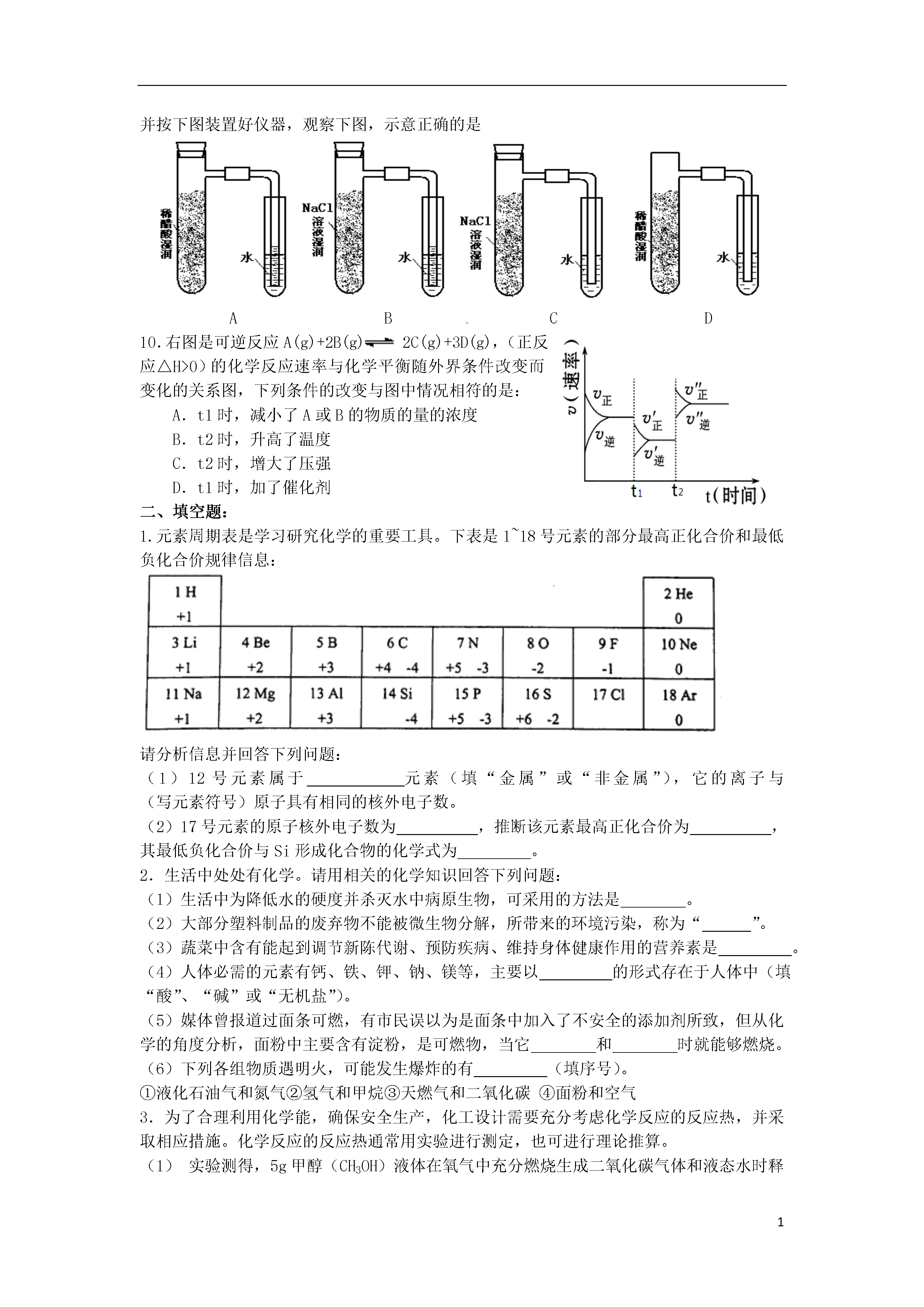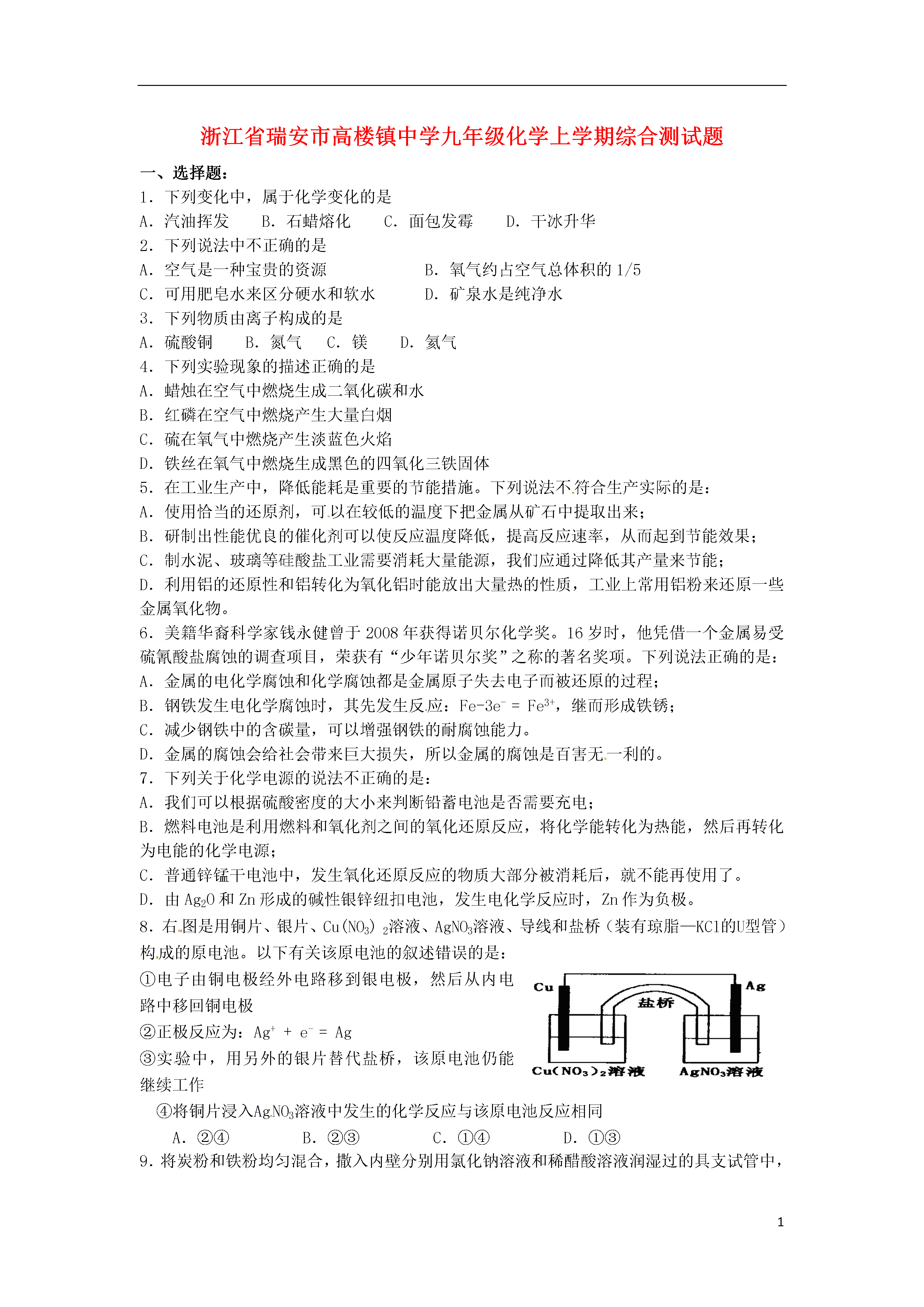 1浙江省瑞安市高楼镇中学九年级化学上学期综合测试题一、选择题:1.下列变化中,属于化学变化的是A.汽油挥发B.石蜡熔化C.面包发霉D.干冰升华2.下列说法中不正确的是A.空气是一种宝贵的资源B.氧气约占空气总体积的1/5C.可用肥皂水来区分硬水和软水D.矿泉水是纯净水3.下列物质由离子构成的是A.硫酸铜B.氮气C.镁D.氦气4.下列实验现象的描述正确的是A.蜡烛在空气中燃烧生成二氧化碳和水B.红磷在空气中燃烧产生大量白烟C.硫在氧气中燃烧产生淡蓝色火焰D.铁丝在氧气中燃烧生成黑色的四氧化三铁固体5.在工业生产中,降低能耗是重要的节能措施。下列说法不符合生产实际的是:A.使用恰当的还原剂,可以在较低的温度下把金属从矿石中提取出来;B.研制出性能优良的催化剂可以使反应温度降低,提高反应速率,从而起到节能效果;C.制水泥、玻璃等硅酸盐工业需要消耗大量能源,我们应通过降低其产量来节能;D.利用铝的还原性和铝转化为氧化铝时能放出大量热的性质,工业上常用铝粉来还原一些金属氧化物。6.美籍华裔科学家钱永健曾于2008年获得诺贝尔化学奖。16岁时,他凭借一个金属易受硫氰酸盐腐蚀的调查项目,荣获有“少年诺贝尔奖”之称的著名奖项。下列说法正确的是:A.金属的电化学腐蚀和化学腐蚀都是金属原子失去电子而被还原的过程;B.钢铁发生电化学腐蚀时,其先发生反应:Fe-3e-=Fe3+,继而形成铁锈;C.减少钢铁中的含碳量,可以增强钢铁的耐腐蚀能力。D.金属的腐蚀会给社会带来巨大损失,所以金属的腐蚀是百害无一利的。7.下列关于化学电源的说法不正确的是:A.我们可以根据硫酸密度的大小来判断铅蓄电池是否需要充电;B.燃料电池是利用燃料和氧化剂之间的氧化还原反应,将化学能转化为热能,然后再转化为电能的化学电源;C.普通锌锰干电池中,发生氧化还原反应的物质大部分被消耗后,就不能再使用了。D.由Ag2O和Zn形成的碱性银锌纽扣电池,发生电化学反应时,Zn作为负极。8.右图是用铜片、银片、Cu(NO3)2溶液、AgNO3溶液、导线和盐桥(装有琼脂—KCl的U型管)构成的原电池。以下有关该原电池的叙述错误的是:①电子由铜电极经外电路移到银电极,然后从内电路中移回铜电极②正极反应为:Ag++e-=Ag③实验中,用另外的银片替代盐桥,该原电池仍能继续工作④将铜片浸入AgNO3溶液中发生的化学反应与该原电池反应相同A.②④B.②③C.①④D.①③9.将炭粉和铁粉均匀混合,撒入内壁分别用氯化钠溶液和稀醋酸溶液润湿过的具支试管中,并按下图装置好仪器,观察下图,示意正确的是ABCD10.右图是可逆反应A(g)+2B(g)2C(g)+3D(g),(正反应△H>0)的化学反应速率与化学平衡随外界条件改变而变化的关系图,下列条件的改变与图中情况相符的是:A.t1时,减小了A或B的物质的量的浓度B.t2时,升高了温度C.t2时,增大了压强D.t1时,加了催化剂二、填空题:1.元素周期表是学习研究化学的重要工具。下表是1~18号元素的部分最高正化合价和最低负化合价规律信息:请分析信息并回答下列问题:(1)12号元素属于元素(填“金属”或“非金属”),它的离子与(写元素符号)原子具有相同的核外电子数。(2)17号元素的原子核外电子数为,推断该元素最高正化合价为,其最低负化合价与Si形成化合物的化学式为。2.生活中处处有化学。请用相关的化学知识回答下列问题:(1)生活中为降低水的硬度并杀灭水中病原生物,可采用的方法是。(2)大部分塑料制品的废弃物不能被微生物分解,所带来的环境污染,称为“”。(3)蔬菜中含有能起到调节新陈代谢、预防疾病、维持身体健康作用的营养素是。(4)人体必需的元素有钙、铁、钾、钠、镁等,主要以的形式存在于人体中(填“酸”、“碱”或“无机盐”)。(5)媒体曾报道过面条可燃,有市民误以为是面条中加入了不安全的添加剂所致,但从化学的角度分析,面粉中主要含有淀粉,是可燃物,当它和时就能够燃烧。(6)下列各组物质遇明火,可能发生爆炸的有(填序号)。①液化石油气和氮气②氢气和甲烷③天燃气和二氧化碳④面粉和空气3.为了合理利用化学能,确保安全生产,化工设计需要充分考虑化学反应的反应热,并采取相应措施。化学反应的反应热通常用实验进行测定,也可进行理论推算。(1)实验测得,5g甲醇(CH3OH)液体在氧气中充分燃烧生成二氧化碳气体和液态水时释放出113.5kJ的热量,则表示甲醇标准燃烧热的热化学方程式为:。(2)今有如下两个热化学方程式:则ab(填“>”、“=”或“<”)H2(g)+1/2O2(g)=H2O(g)ΔH1=akJ·mol-1H2(g)+1/2O