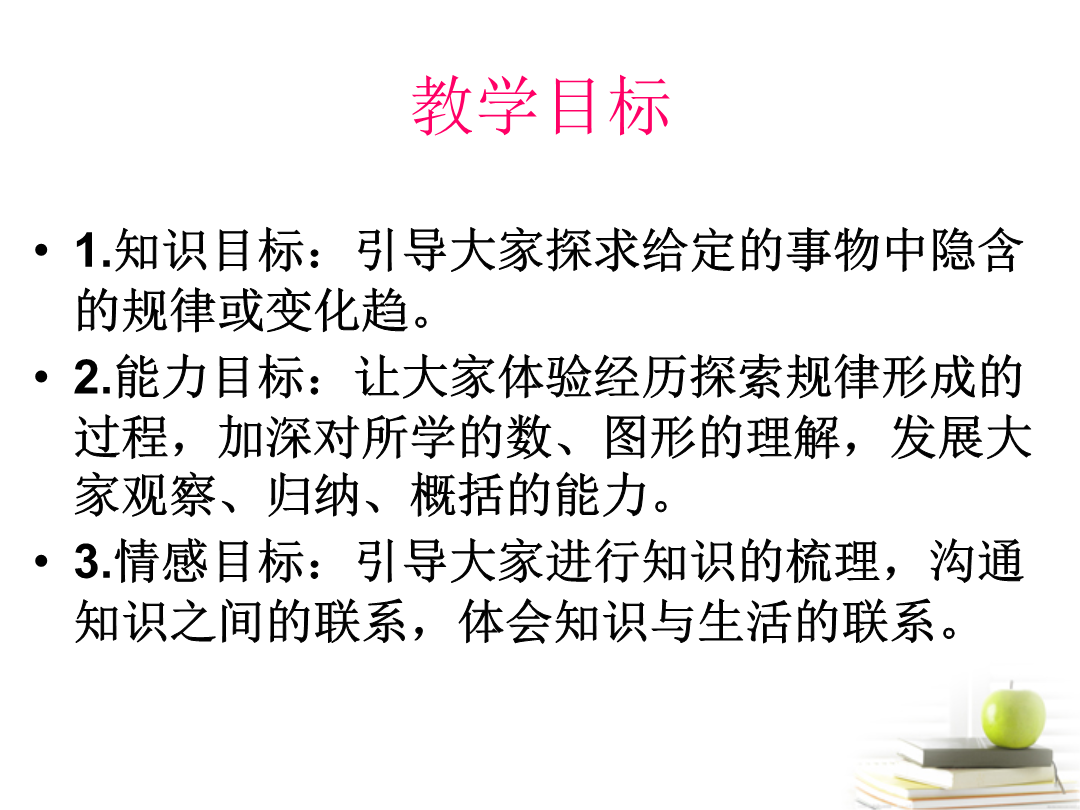 北师大六年级数学下册教学目标问题:我校餐厅内若按下图方式摆放桌子和椅子。1.六(2)班同学在六一国际儿童节按下面的规律在教室里挂上气球。第20个汽球是什么颜色的?第27个呢?请说明理由。2.一些小球按下面的方式堆放:你知道第5堆有多少个小球吗?第8堆呢?问题:我校餐厅内若按下图方式摆放桌子和椅子。本课小结