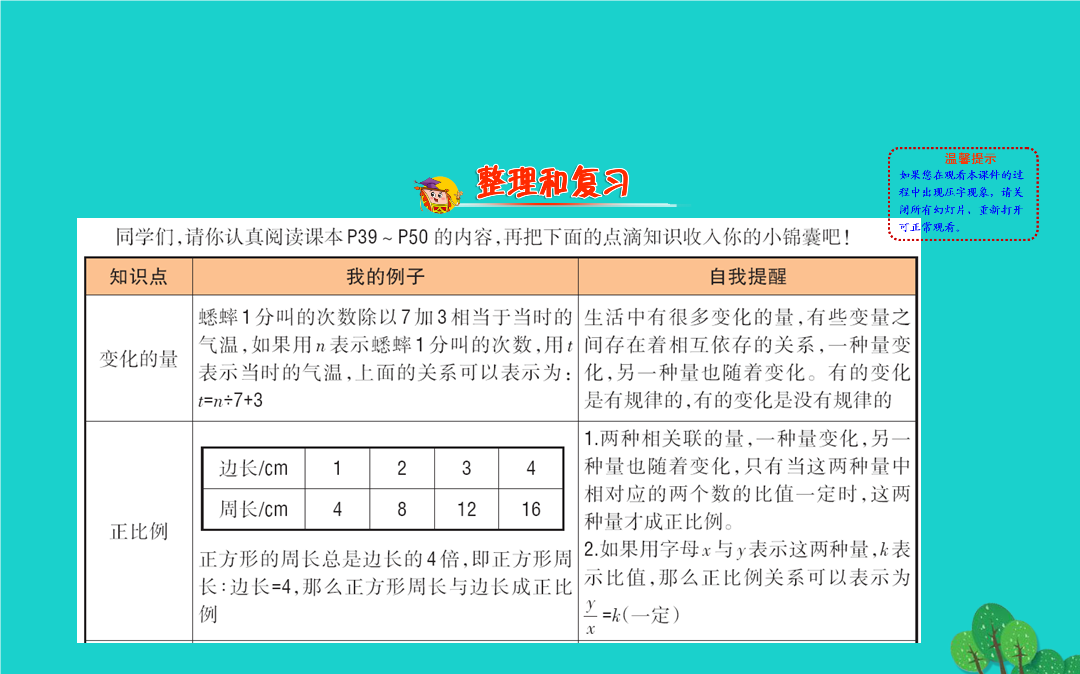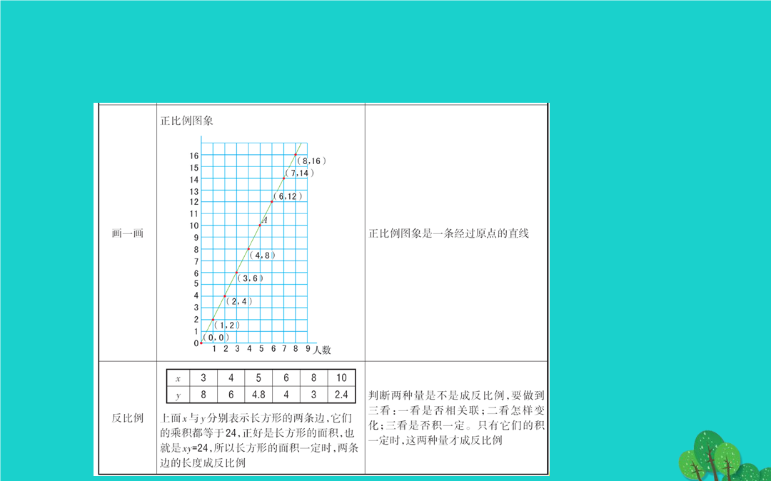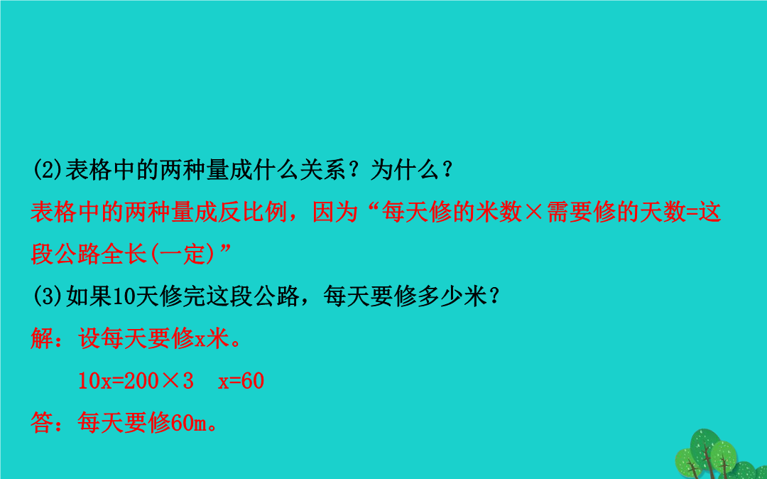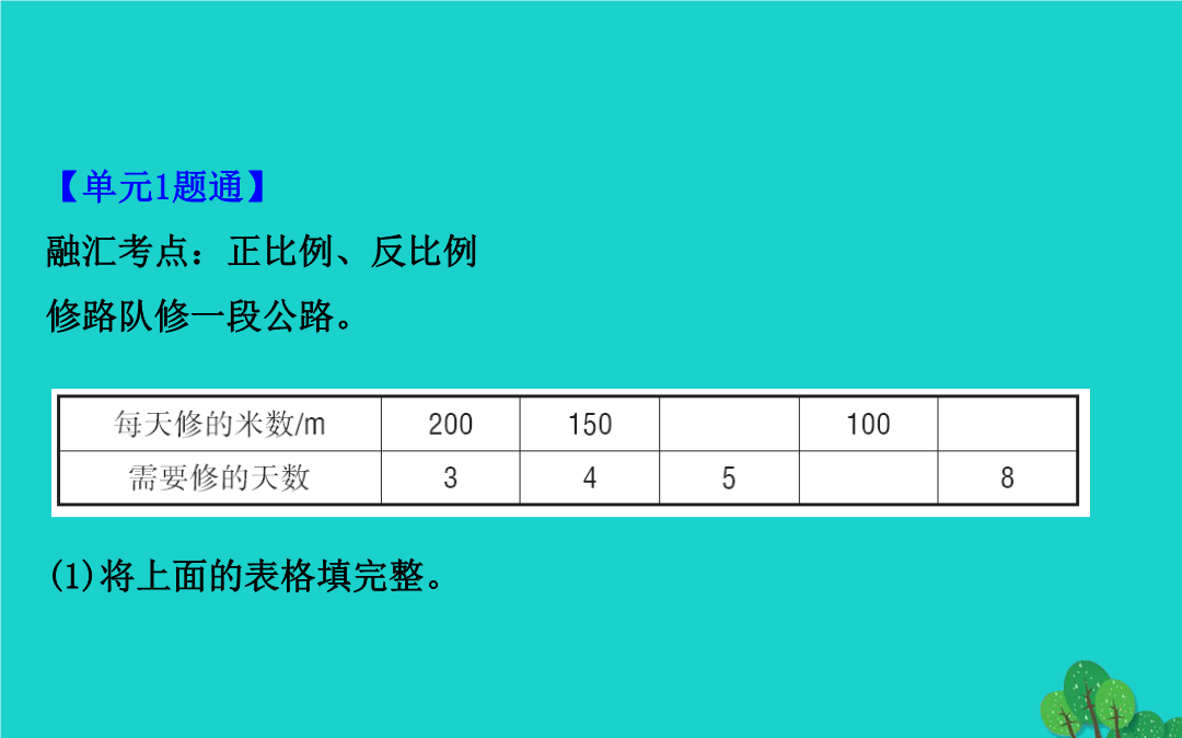 单元整合提升【单元1题通】融汇考点:正比例、反比例修路队修一段公路。(1)将上面的表格填完整。(2)表格中的两种量成什么关系?为什么?表格中的两种量成反比例,因为“每天修的米数×需要修的天数=这段公路全长(一定)”(3)如果10天修完这段公路,每天要修多少米?解:设每天要修x米。10x=200×3x=60答:每天要修60m。(4)按照题(3)的效率,7天可以修多少米?(用比例解)解:设7天可以修y米。600∶10=y∶7y=420答:7天可以修420m。1.填一填。(24分)(1)分子一定,分母与分数值成()比例;分母一定,分子与分数值成()比例。(2)圆锥的高一定,体积和底面积()比例。(3)车轮的直径一定,所行驶的路程和车轮的转数()比例。(4)正方体的表面积与它的棱长()比例。(5)x=,x与y成()比例;=4n,m与n成()比例;,x与y成()比例。2.判断。(15分)(1)订阅《小学生数学报》的份数和钱数不成比例。()(2)被减数一定,减数和差成反比例。()(3)a=5b,那么a与b成反比例。()(4)出粉率一定,小麦的质量与面粉的质量成正比例。()(5)(弱项1)圆柱的高一定,体积和底面半径成正比例。()3.选一选。(15分)(1)把一根铁丝截成同样长的小段,截成的段数和每段的长度()。A.成正比例B.不成正比例C.成反比例(2)修一幢楼房,参加修建的工人数与所修天数()。A.成正比例B.不成正比例C.成反比例(3)一架客机从北京飞往上海,飞行速度和所用时间()。A.成正比例B.成反比例C.不成比例(4)每箱苹果质量一定,箱数和苹果总质量()。A.成正比例B.成反比例C.不成比例(5)已知x和y是相关联的量,当x=3时,y=6;当x=5时,y=10。则x和y之间()。A.成正比例B.成反比例C.不成比例4.某造纸厂每小时造纸1.5吨,2小时、3小时、4小时……各造纸多少吨。(22分)(1)把下表填写完整。(2)根据表中的数据,在下图中描出造纸时间和造纸吨数对应的点,再把它们连起来。(3)造纸吨数与造纸时间成正比例吗?为什么?因为=每小时造纸吨数(一定),所以每小时造纸吨数一定时,造纸吨数与造纸时间成正比例。(4)先根据图象判断,5小时造纸多少吨?再计算。根据图象判断,5小时造纸7.5吨。解:设5小时造纸x吨。x∶5=3∶2x=7.5答:5小时造纸7.5吨。5.用比例知识解下面各题。(24分)(1)一辆汽车行驶90km需要5L汽油,照这样计算,40L的油箱全部加满后能行驶多少千米?解:设全部加满后能行驶x千米。90∶5=x∶40x=720答:全部加满后能行驶720km。(2)张老师骑自行车上班,每分行240m,需要28分到校,张老师改骑电动车后,仅用了12分就到了学校,骑电动车每分行多少米?解:设骑电动车每分行x米。x×12=240×28x=560答:骑电动车每分行560m。(3)一对互相啮合的齿轮,主动轮有40个齿,从动轮有30个齿,如果主动轮每分转180圈,从动轮每分转多少圈?解:设从动轮每分转x圈。30x=40×180x=240答:从动轮每分转240圈。【动脑筋】装修会议室,用边长2dm的方砖需要500块,如果改用边长4dm的方砖铺,需要多少块?解:设需要x块。42×x=22×500x=125答:需要125块。