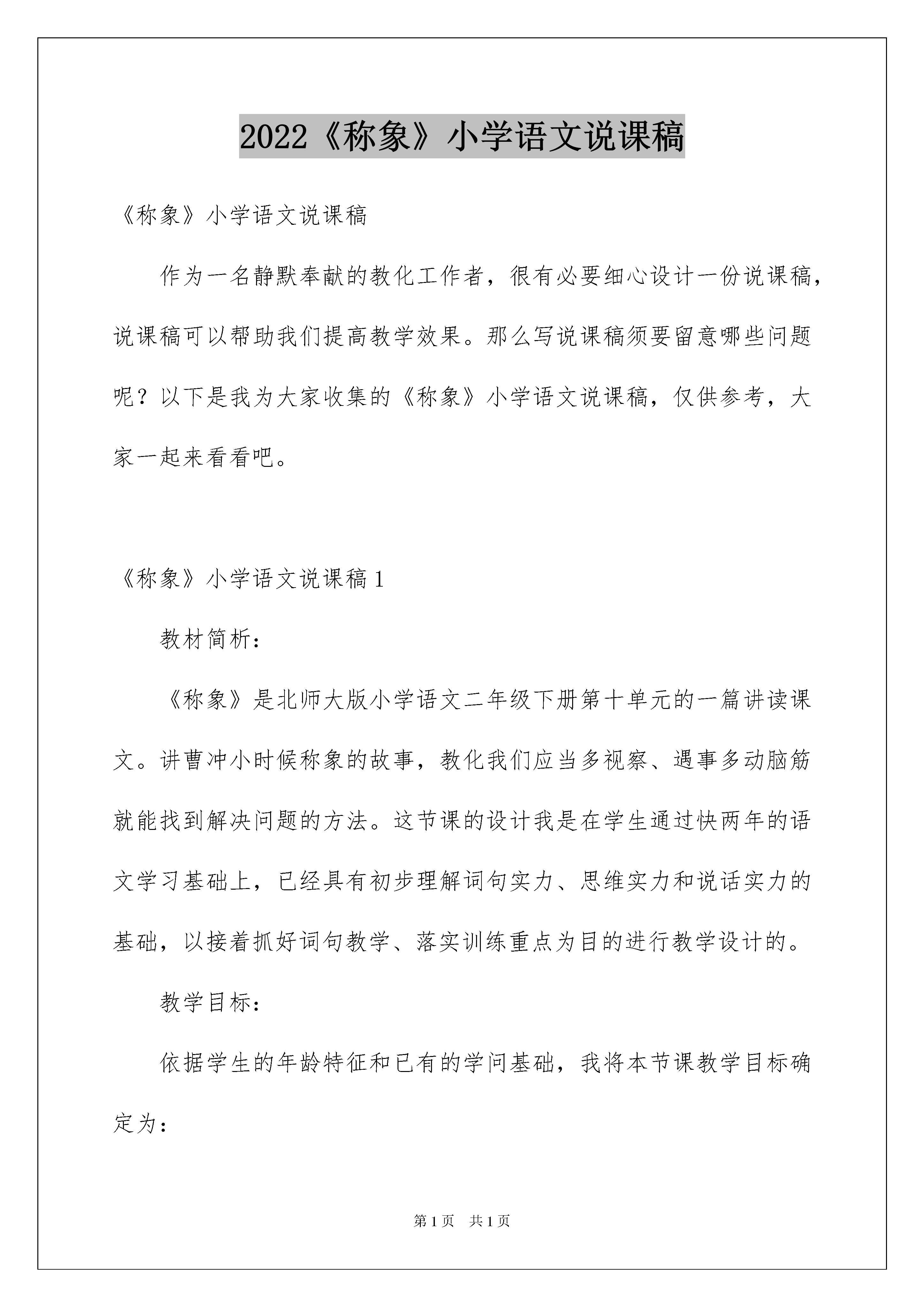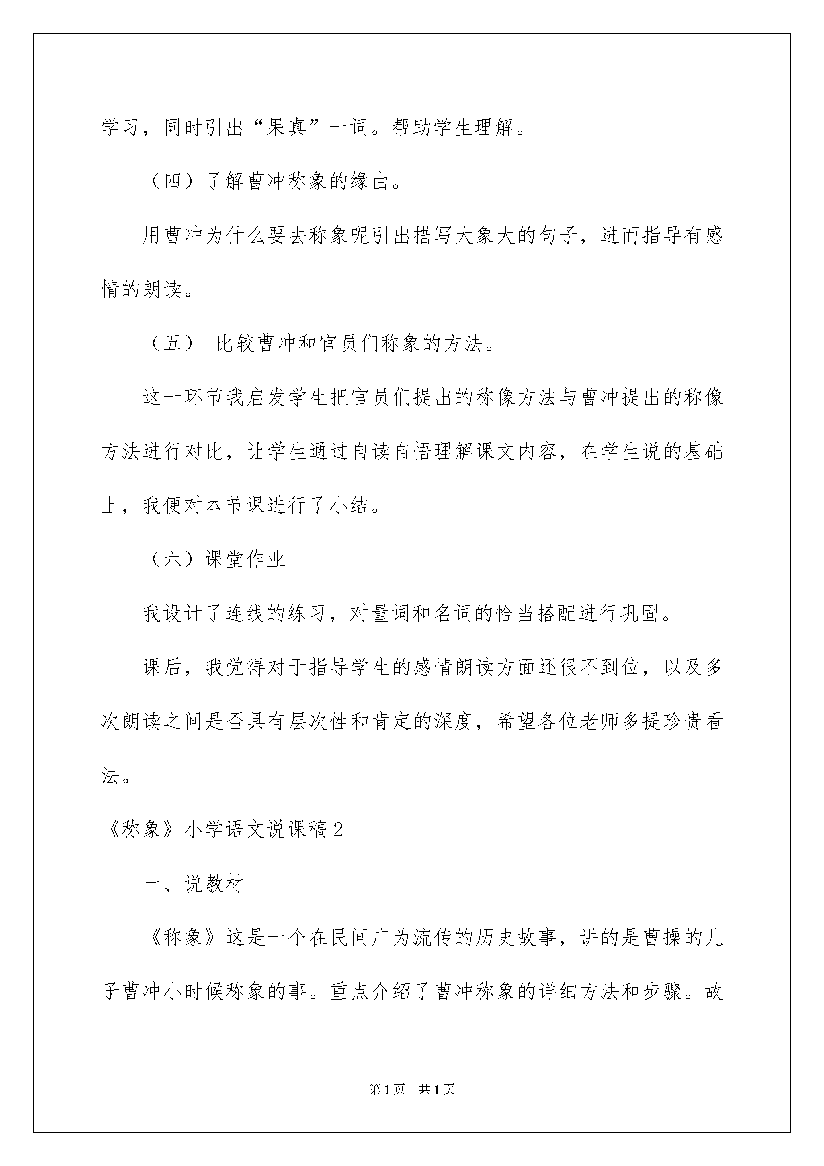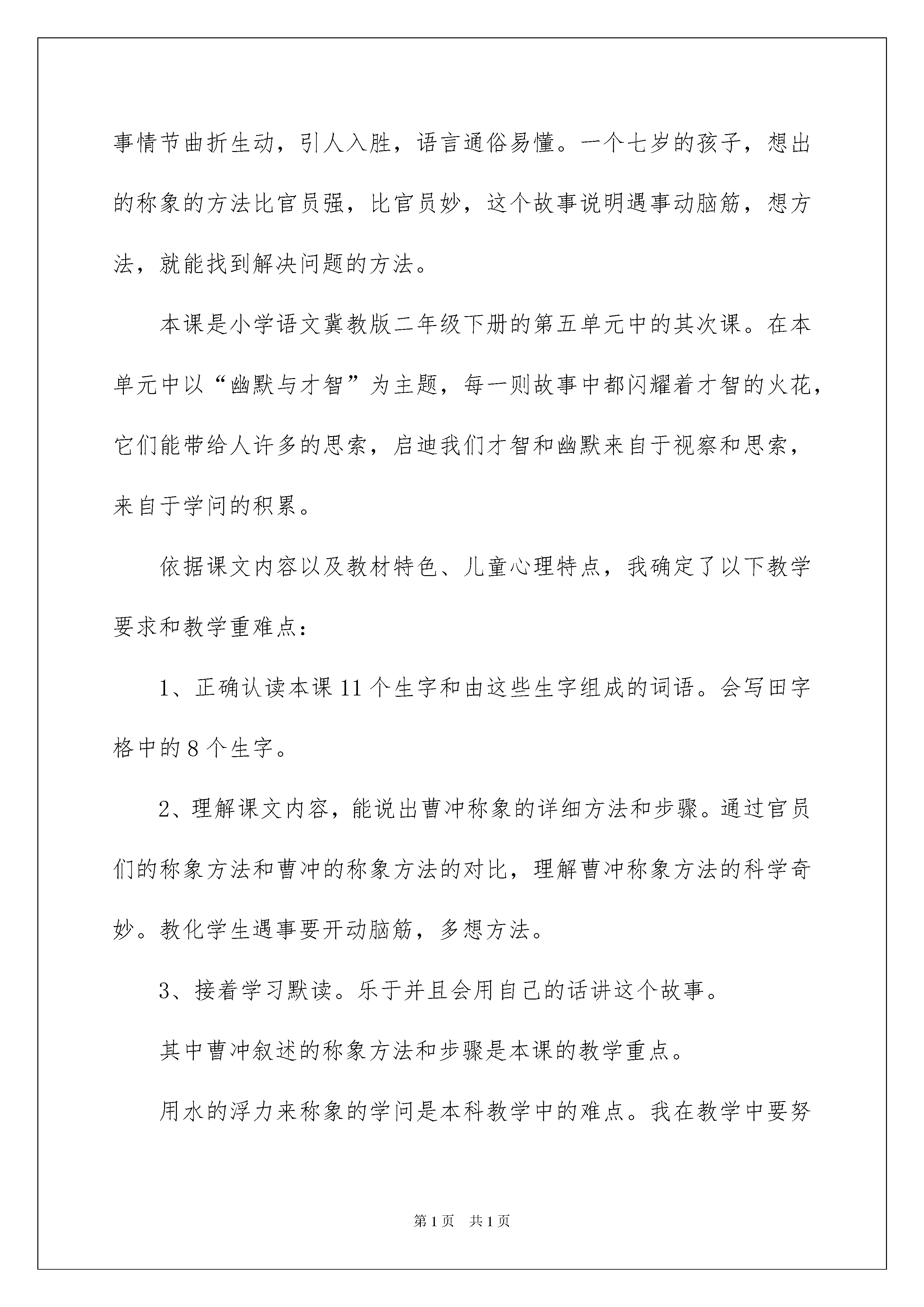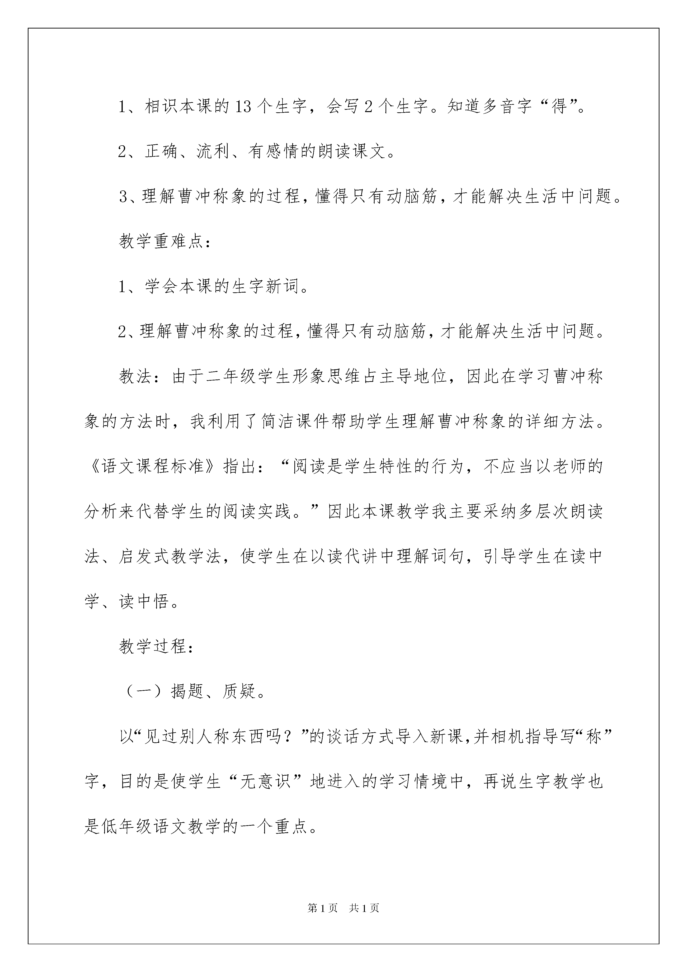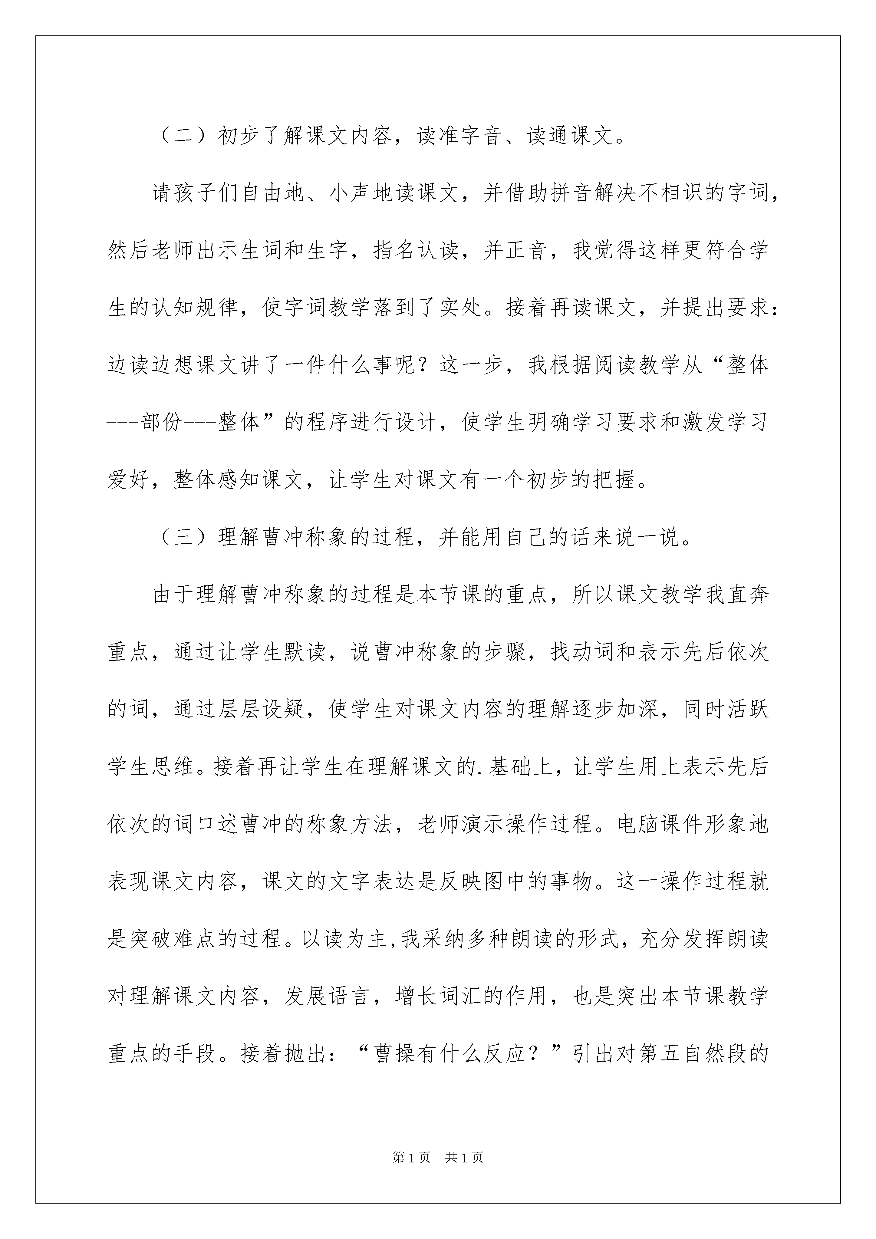 2022《称象》小学语文说课稿《称象》小学语文说课稿作为一名静默奉献的教化工作者,很有必要细心设计一份说课稿,说课稿可以帮助我们提高教学效果。那么写说课稿须要留意哪些问题呢?以下是我为大家收集的《称象》小学语文说课稿,仅供参考,大家一起来看看吧。《称象》小学语文说课稿1教材简析:《称象》是北师大版小学语文二年级下册第十单元的一篇讲读课文。讲曹冲小时候称象的故事,教化我们应当多视察、遇事多动脑筋就能找到解决问题的方法。这节课的设计我是在学生通过快两年的语文学习基础上,已经具有初步理解词句实力、思维实力和说话实力的基础,以接着抓好词句教学、落实训练重点为目的进行教学设计的。教学目标:依据学生的年龄特征和已有的学问基础,我将本节课教学目标确定为:1、相识本课的13个生字,会写2个生字。知道多音字“得”。2、正确、流利、有感情的朗读课文。3、理解曹冲称象的过程,懂得只有动脑筋,才能解决生活中问题。教学重难点:1、学会本课的生字新词。2、理解曹冲称象的过程,懂得只有动脑筋,才能解决生活中问题。教法:由于二年级学生形象思维占主导地位,因此在学习曹冲称象的方法时,我利用了简洁课件帮助学生理解曹冲称象的详细方法。《语文课程标准》指出:“阅读是学生特性的行为,不应当以老师的分析来代替学生的阅读实践。”因此本课教学我主要采纳多层次朗读法、启发式教学法,使学生在以读代讲中理解词句,引导学生在读中学、读中悟。教学过程:(一)揭题、质疑。以“见过别人称东西吗?”的谈话方式导入新课,并相机指导写“称”字,目的是使学生“无意识”地进入的学习情境中,再说生字教学也是低年级语文教学的一个重点。(二)初步了解课文内容,读准字音、读通课文。请孩子们自由地、小声地读课文,并借助拼音解决不相识的字词,然后老师出示生词和生字,指名认读,并正音,我觉得这样更符合学生的认知规律,使字词教学落到了实处。接着再读课文,并提出要求:边读边想课文讲了一件什么事呢?这一步,我根据阅读教学从“整体---部份---整体”的程序进行设计,使学生明确学习要求和激发学习爱好,整体感知课文,让学生对课文有一个初步的把握。(三)理解曹冲称象的过程,并能用自己的话来说一说。由于理解曹冲称象的过程是本节课的重点,所以课文教学我直奔重点,通过让学生默读,说曹冲称象的步骤,找动词和表示先后依次的词,通过层层设疑,使学生对课文内容的理解逐步加深,同时活跃学生思维。接着再让学生在理解课文的.基础上,让学生用上表示先后依次的词口述曹冲的称象方法,老师演示操作过程。电脑课件形象地表现课文内容,课文的文字表达是反映图中的事物。这一操作过程就是突破难点的过程。以读为主,我采纳多种朗读的形式,充分发挥朗读对理解课文内容,发展语言,增长词汇的作用,也是突出本节课教学重点的手段。接着抛出:“曹操有什么反应?”引出对第五自然段的学习,同时引出“果真”一词。帮助学生理解。(四)了解曹冲称象的缘由。用曹冲为什么要去称象呢引出描写大象大的句子,进而指导有感情的朗读。(五)比较曹冲和官员们称象的方法。这一环节我启发学生把官员们提出的称像方法与曹冲提出的称像方法进行对比,让学生通过自读自悟理解课文内容,在学生说的基础上,我便对本节课进行了小结。(六)课堂作业我设计了连线的练习,对量词和名词的恰当搭配进行巩固。课后,我觉得对于指导学生的感情朗读方面还很不到位,以及多次朗读之间是否具有层次性和肯定的深度,希望各位老师多提珍贵看法。《称象》小学语文说课稿2一、说教材《称象》这是一个在民间广为流传的历史故事,讲的是曹操的儿子曹冲小时候称象的事。重点介绍了曹冲称象的详细方法和步骤。故事情节曲折生动,引人入胜,语言通俗易懂。一个七岁的孩子,想出的称象的方法比官员强,比官员妙,这个故事说明遇事动脑筋,想方法,就能找到解决问题的方法。本课是小学语文冀教版二年级下册的第五单元中的其次课。在本单元中以“幽默与才智”为主题,每一则故事中都闪耀着才智的火花,它们能带给人许多的思索,启迪我们才智和幽默来自于视察和思索,来自于学问的积累。依据课文内容以及教材特色、儿童心理特点,我确定了以下教学要求和教学重难点:1、正确认读本课11个生字和由这些生字组成的词语。会写田字格中的8个生字。2、理解课文内容,能说出曹冲称象的详细方法和步骤。通过官员们的称象方法和曹冲的称象方法的对比,理解曹冲称象方法的科学奇妙。教化学生遇事要开动脑筋,多想方法。3、接着学习默读。乐于并且会用自己的话讲这个故事。其中曹冲叙述的称象方法和步骤是本课的教学重点。用水的浮力来称象的学问是本科教学中的难点。我在教学中要努力使文章中抽象的语言文