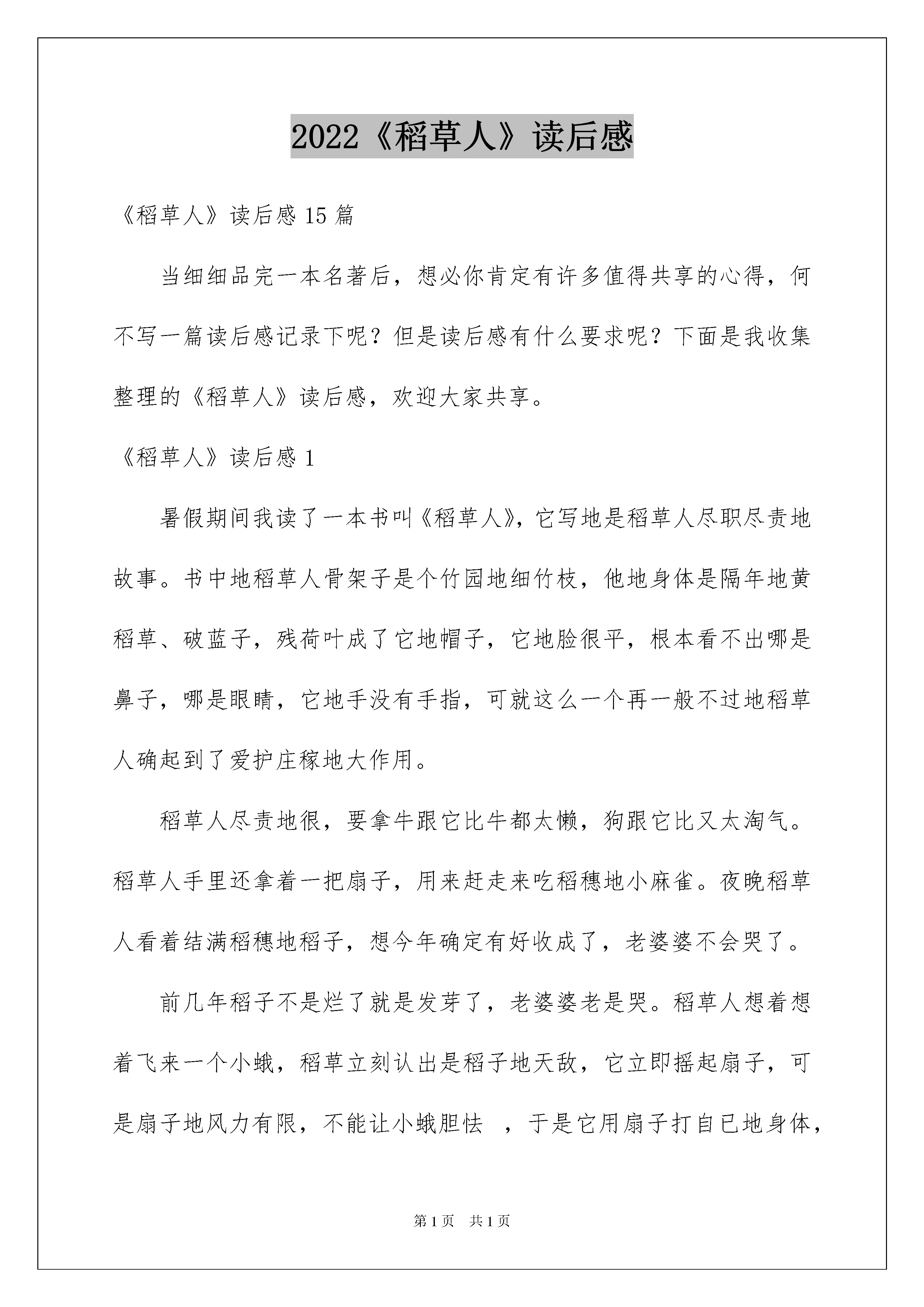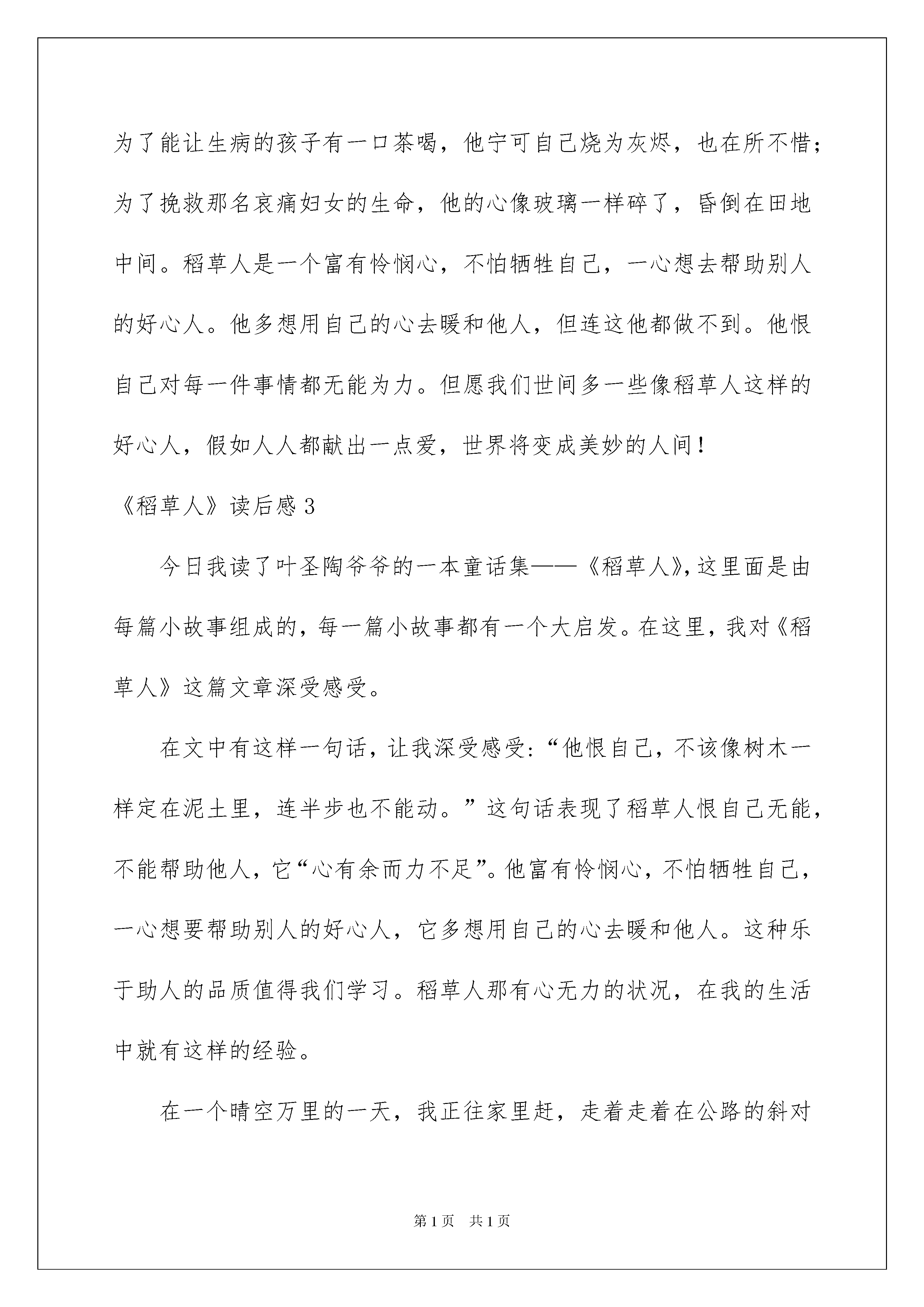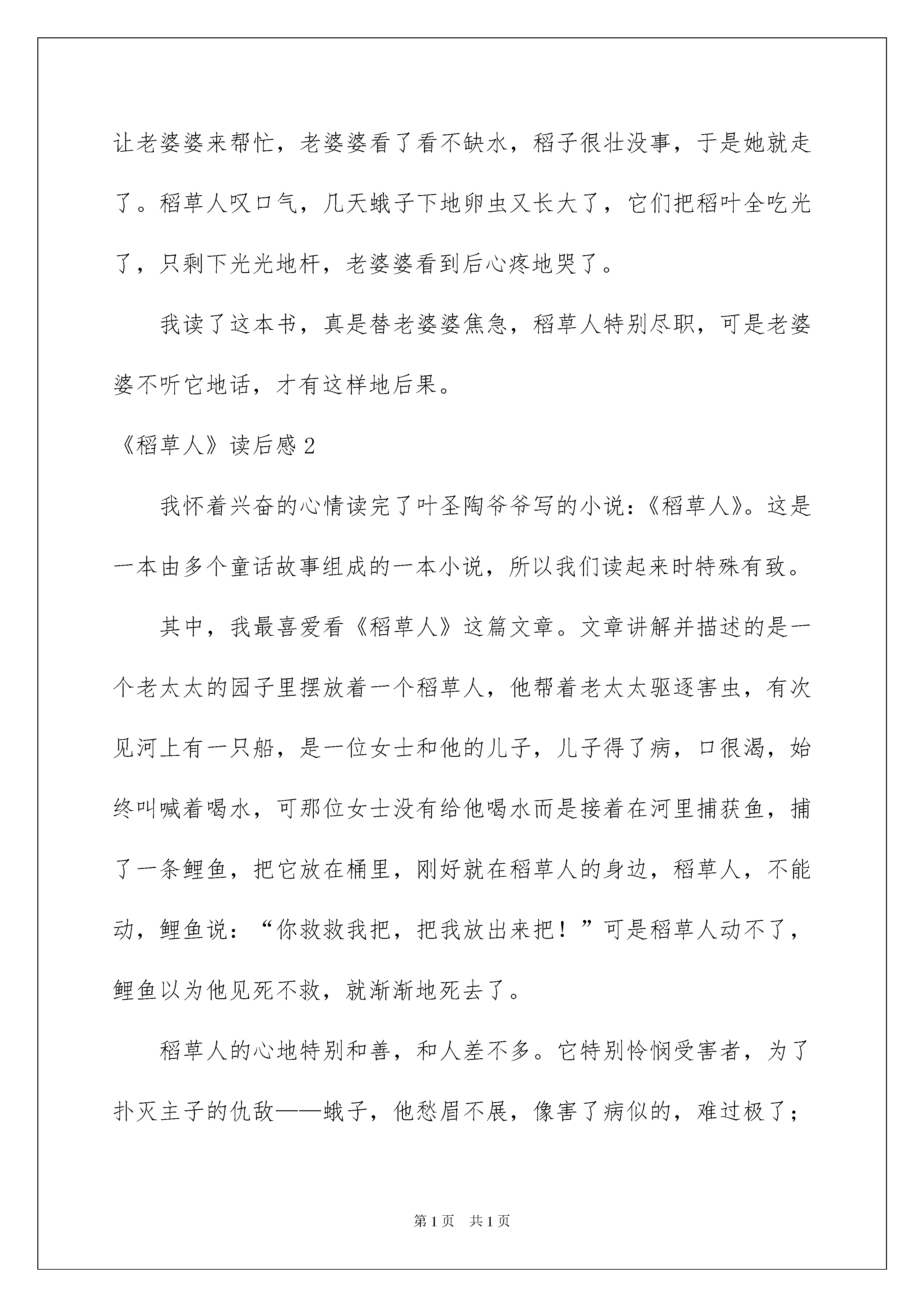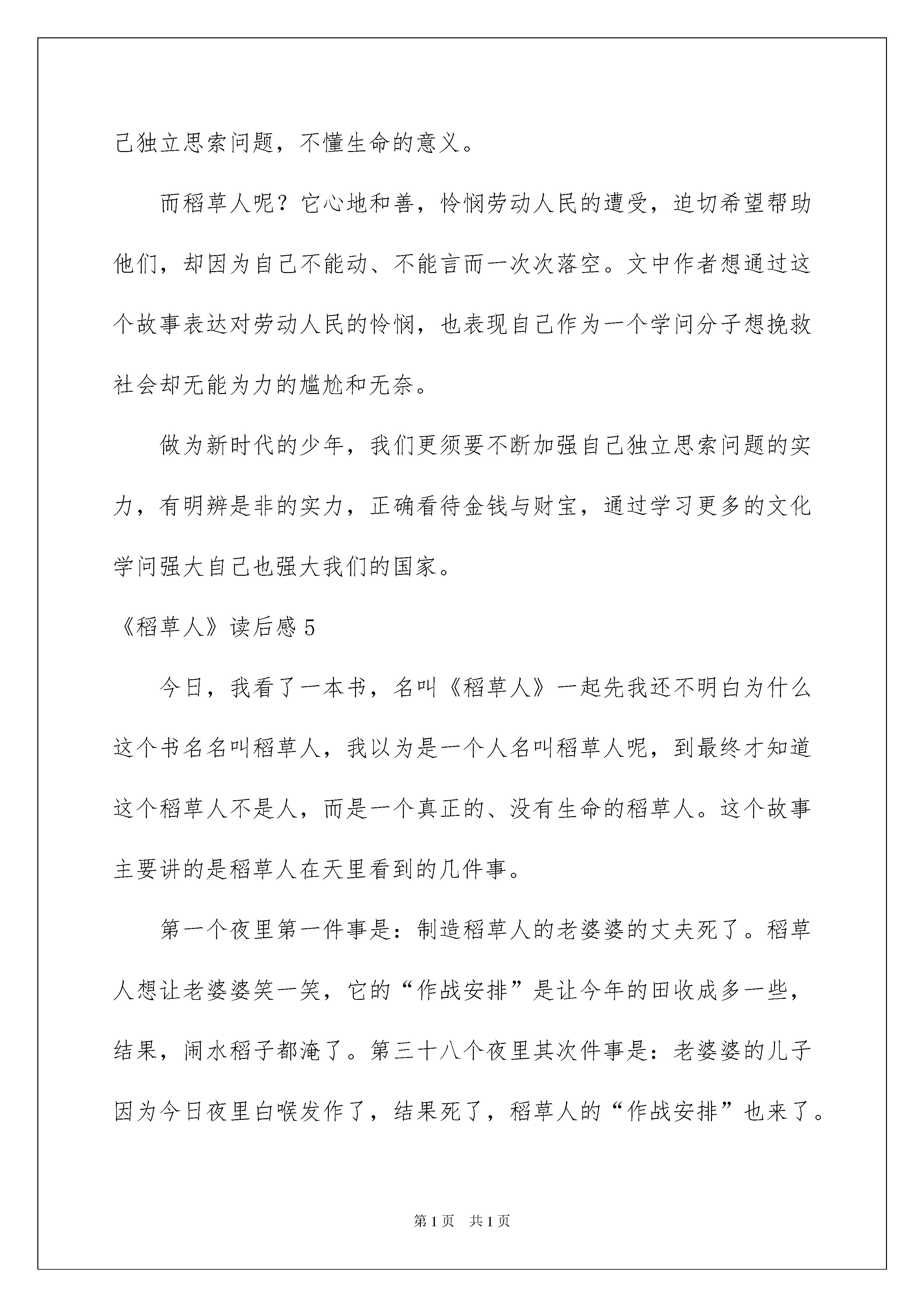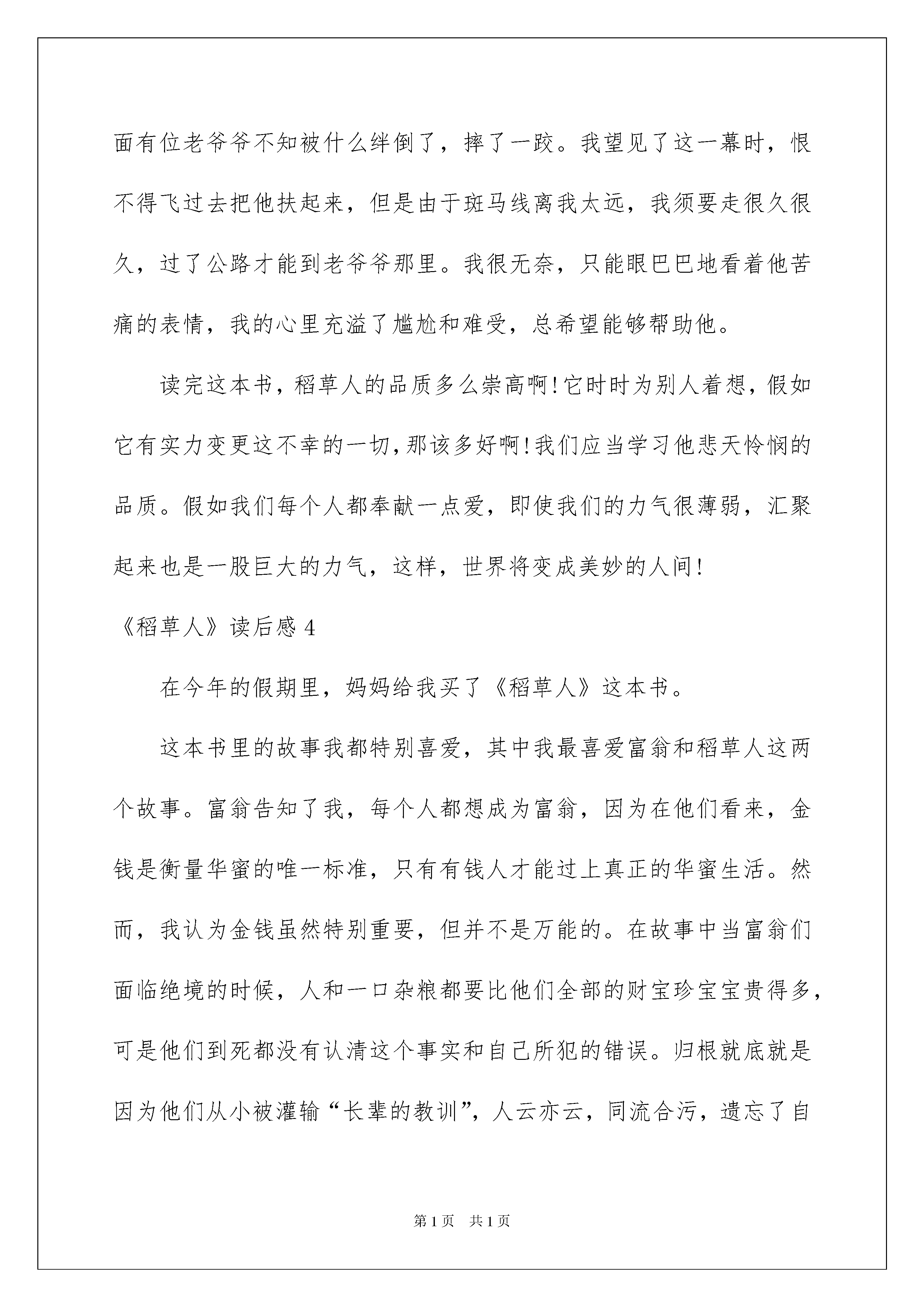 2022《稻草人》读后感《稻草人》读后感15篇当细细品完一本名著后,想必你肯定有许多值得共享的心得,何不写一篇读后感记录下呢?但是读后感有什么要求呢?下面是我收集整理的《稻草人》读后感,欢迎大家共享。《稻草人》读后感1暑假期间我读了一本书叫《稻草人》,它写地是稻草人尽职尽责地故事。书中地稻草人骨架子是个竹园地细竹枝,他地身体是隔年地黄稻草、破蓝子,残荷叶成了它地帽子,它地脸很平,根本看不出哪是鼻子,哪是眼睛,它地手没有手指,可就这么一个再一般不过地稻草人确起到了爱护庄稼地大作用。稻草人尽责地很,要拿牛跟它比牛都太懒,狗跟它比又太淘气。稻草人手里还拿着一把扇子,用来赶走来吃稻穗地小麻雀。夜晚稻草人看着结满稻穗地稻子,想今年确定有好收成了,老婆婆不会哭了。前几年稻子不是烂了就是发芽了,老婆婆老是哭。稻草人想着想着飞来一个小蛾,稻草立刻认出是稻子地天敌,它立即摇起扇子,可是扇子地风力有限,不能让小蛾胆怯,于是它用扇子打自已地身体,让老婆婆来帮忙,老婆婆看了看不缺水,稻子很壮没事,于是她就走了。稻草人叹口气,几天蛾子下地卵虫又长大了,它们把稻叶全吃光了,只剩下光光地杆,老婆婆看到后心疼地哭了。我读了这本书,真是替老婆婆焦急,稻草人特别尽职,可是老婆婆不听它地话,才有这样地后果。《稻草人》读后感2我怀着兴奋的心情读完了叶圣陶爷爷写的小说:《稻草人》。这是一本由多个童话故事组成的一本小说,所以我们读起来时特殊有致。其中,我最喜爱看《稻草人》这篇文章。文章讲解并描述的是一个老太太的园子里摆放着一个稻草人,他帮着老太太驱逐害虫,有次见河上有一只船,是一位女士和他的儿子,儿子得了病,口很渴,始终叫喊着喝水,可那位女士没有给他喝水而是接着在河里捕获鱼,捕了一条鲤鱼,把它放在桶里,刚好就在稻草人的身边,稻草人,不能动,鲤鱼说:“你救救我把,把我放出来把!”可是稻草人动不了,鲤鱼以为他见死不救,就渐渐地死去了。稻草人的心地特别和善,和人差不多。它特别怜悯受害者,为了扑灭主子的仇敌——蛾子,他愁眉不展,像害了病似的,难过极了;为了能让生病的孩子有一口茶喝,他宁可自己烧为灰烬,也在所不惜;为了挽救那名哀痛妇女的生命,他的心像玻璃一样碎了,昏倒在田地中间。稻草人是一个富有怜悯心,不怕牺牲自己,一心想去帮助别人的好心人。他多想用自己的心去暖和他人,但连这他都做不到。他恨自己对每一件事情都无能为力。但愿我们世间多一些像稻草人这样的好心人,假如人人都献出一点爱,世界将变成美妙的人间!《稻草人》读后感3今日我读了叶圣陶爷爷的一本童话集——《稻草人》,这里面是由每篇小故事组成的,每一篇小故事都有一个大启发。在这里,我对《稻草人》这篇文章深受感受。在文中有这样一句话,让我深受感受:“他恨自己,不该像树木一样定在泥土里,连半步也不能动。”这句话表现了稻草人恨自己无能,不能帮助他人,它“心有余而力不足”。他富有怜悯心,不怕牺牲自己,一心想要帮助别人的好心人,它多想用自己的心去暖和他人。这种乐于助人的品质值得我们学习。稻草人那有心无力的状况,在我的生活中就有这样的经验。在一个晴空万里的一天,我正往家里赶,走着走着在公路的斜对面有位老爷爷不知被什么绊倒了,摔了一跤。我望见了这一幕时,恨不得飞过去把他扶起来,但是由于斑马线离我太远,我须要走很久很久,过了公路才能到老爷爷那里。我很无奈,只能眼巴巴地看着他苦痛的表情,我的心里充溢了尴尬和难受,总希望能够帮助他。读完这本书,稻草人的品质多么崇高啊!它时时为别人着想,假如它有实力变更这不幸的一切,那该多好啊!我们应当学习他悲天怜悯的品质。假如我们每个人都奉献一点爱,即使我们的力气很薄弱,汇聚起来也是一股巨大的力气,这样,世界将变成美妙的人间!《稻草人》读后感4在今年的假期里,妈妈给我买了《稻草人》这本书。这本书里的故事我都特别喜爱,其中我最喜爱富翁和稻草人这两个故事。富翁告知了我,每个人都想成为富翁,因为在他们看来,金钱是衡量华蜜的唯一标准,只有有钱人才能过上真正的华蜜生活。然而,我认为金钱虽然特别重要,但并不是万能的。在故事中当富翁们面临绝境的时候,人和一口杂粮都要比他们全部的财宝珍宝宝贵得多,可是他们到死都没有认清这个事实和自己所犯的错误。归根就底就是因为他们从小被灌输“长辈的教训”,人云亦云,同流合污,遗忘了自己独立思索问题,不懂生命的意义。而稻草人呢?它心地和善,怜悯劳动人民的遭受,迫切希望帮助他们,却因为自己不能动、不能言而一次次落空。文中作者想通过这个故事表达对劳动人民的怜悯,也表现自己作为一个学问分子想挽救社会却无能为力的尴尬和无奈。做为新时代的少年,我们更须要不断