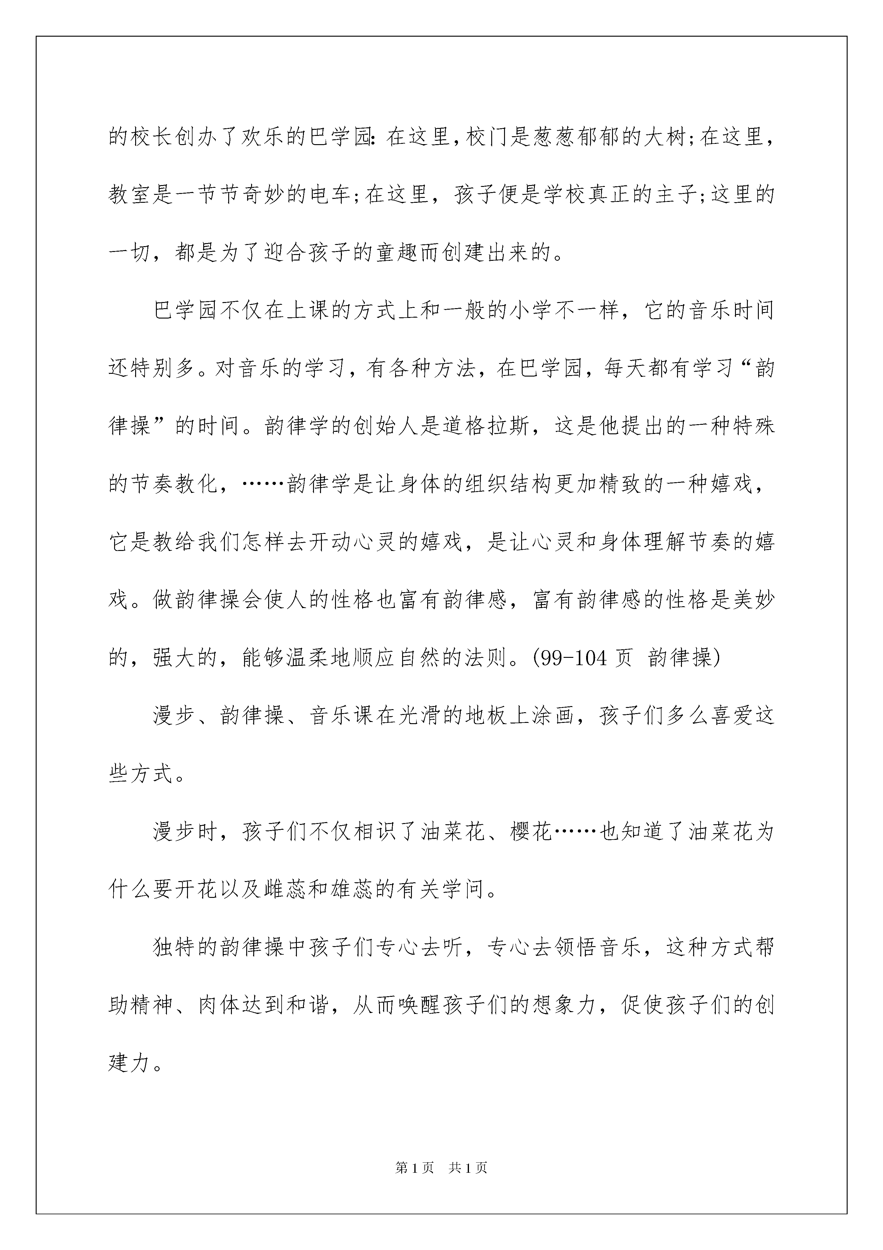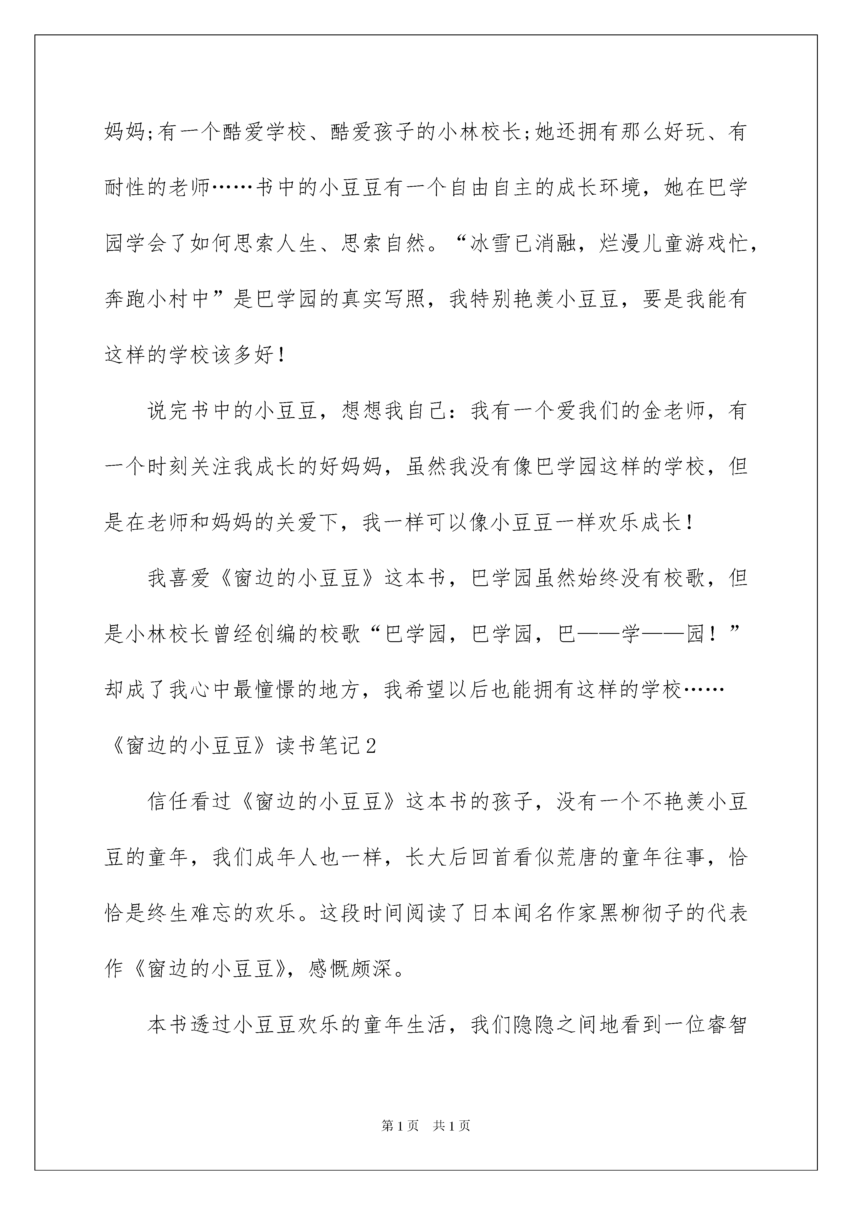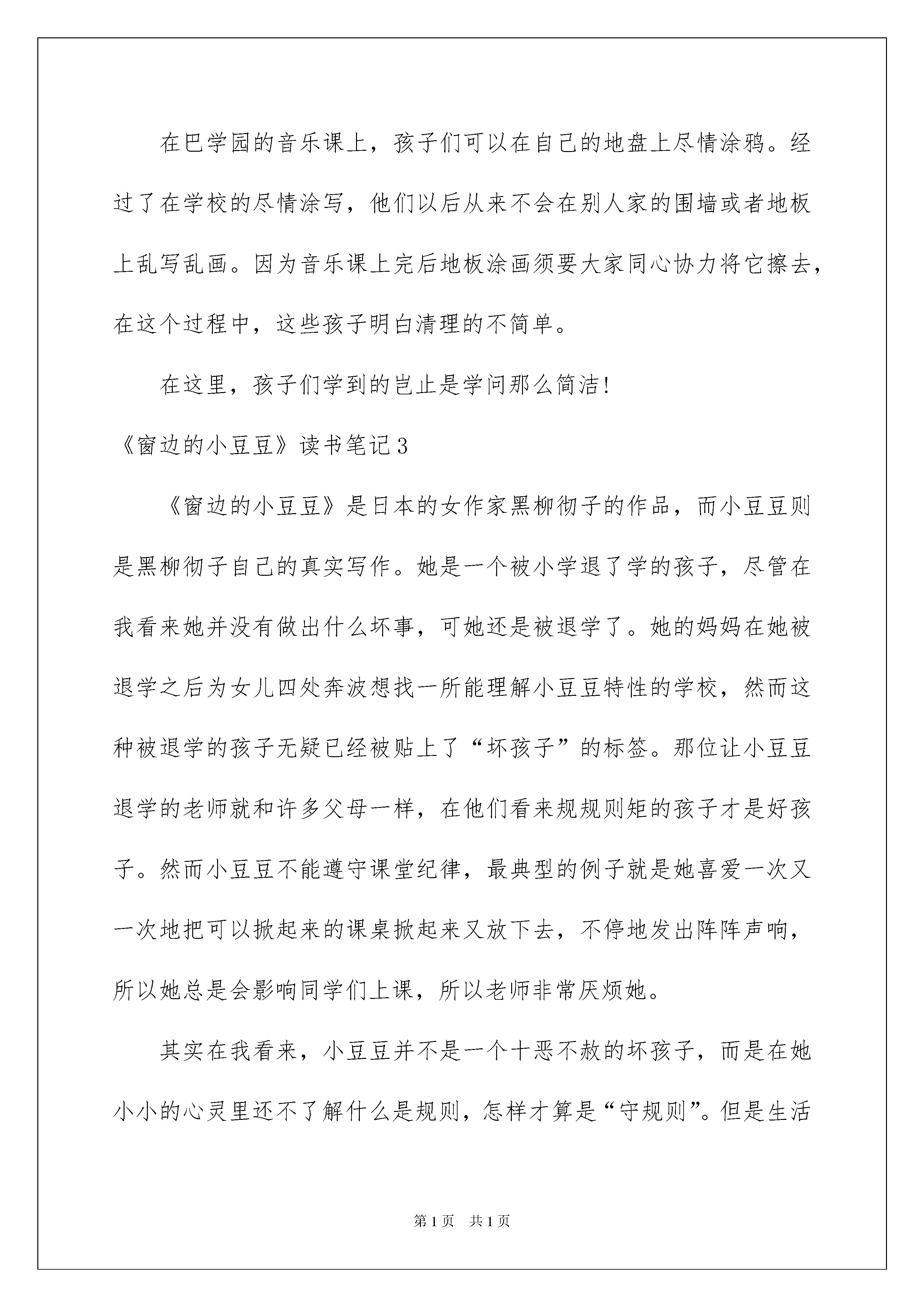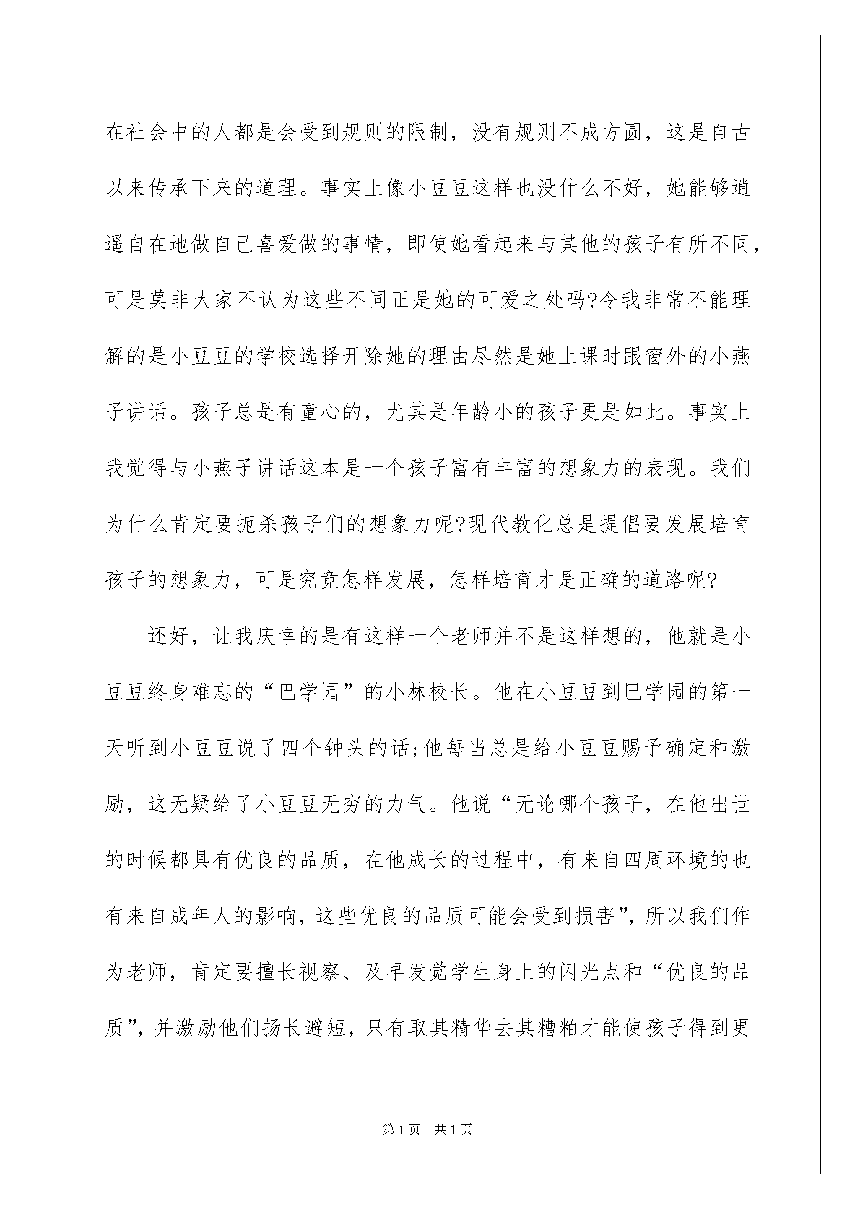 2022《窗边的小豆豆》读书笔记《窗边的小豆豆》读书笔记11篇读完一本经典名著后,想必你有不少可以共享的东西,不妨坐下来好好写写读书笔记吧。那么你真的懂得怎么写读书笔记吗?以下是我整理的《窗边的小豆豆》读书笔记,供大家参考借鉴,希望可以帮助到有须要的挚友。《窗边的小豆豆》读书笔记1老师送给我一本书《窗边的小豆豆》。一看到这本书的名字,我心里就很新奇:小豆豆在窗边干什么?小豆豆是个什么样的孩子?书中讲了什么?……这些疑问始终在我脑海中萦绕,我的妈妈对这本书也很感爱好,所以我和妈妈一起读完了这本书。《窗边的小豆豆》讲解并描述了作者上小学时的一段真实的故事。作者因调皮被原学校退学后,来到巴学园。在小林校长的爱惜和引导下,在一般人眼里“怪怪”的小豆豆渐渐变成了一个大家都能接受的孩子,并奠定了她一生的基础。读完这本书,我觉得书中的小豆豆很幸运!她有一个理解她的好妈妈;有一个酷爱学校、酷爱孩子的小林校长;她还拥有那么好玩、有耐性的老师……书中的小豆豆有一个自由自主的成长环境,她在巴学园学会了如何思索人生、思索自然。“冰雪已消融,烂漫儿童游戏忙,奔跑小村中”是巴学园的真实写照,我特别艳羡小豆豆,要是我能有这样的学校该多好!说完书中的小豆豆,想想我自己:我有一个爱我们的金老师,有一个时刻关注我成长的好妈妈,虽然我没有像巴学园这样的学校,但是在老师和妈妈的关爱下,我一样可以像小豆豆一样欢乐成长!我喜爱《窗边的小豆豆》这本书,巴学园虽然始终没有校歌,但是小林校长曾经创编的校歌“巴学园,巴学园,巴——学——园!”却成了我心中最憧憬的地方,我希望以后也能拥有这样的学校……《窗边的小豆豆》读书笔记2信任看过《窗边的小豆豆》这本书的孩子,没有一个不艳羡小豆豆的童年,我们成年人也一样,长大后回首看似荒唐的童年往事,恰恰是终生难忘的欢乐。这段时间阅读了日本闻名作家黑柳彻子的代表作《窗边的小豆豆》,感慨颇深。本书透过小豆豆欢乐的童年生活,我们隐隐之间地看到一位睿智的校长创办了欢乐的巴学园:在这里,校门是葱葱郁郁的大树;在这里,教室是一节节奇妙的电车;在这里,孩子便是学校真正的主子;这里的一切,都是为了迎合孩子的童趣而创建出来的。巴学园不仅在上课的方式上和一般的小学不一样,它的音乐时间还特别多。对音乐的学习,有各种方法,在巴学园,每天都有学习“韵律操”的时间。韵律学的创始人是道格拉斯,这是他提出的一种特殊的节奏教化,……韵律学是让身体的组织结构更加精致的一种嬉戏,它是教给我们怎样去开动心灵的嬉戏,是让心灵和身体理解节奏的嬉戏。做韵律操会使人的性格也富有韵律感,富有韵律感的性格是美妙的,强大的,能够温柔地顺应自然的法则。(99-104页韵律操)漫步、韵律操、音乐课在光滑的地板上涂画,孩子们多么喜爱这些方式。漫步时,孩子们不仅相识了油菜花、樱花……也知道了油菜花为什么要开花以及雌蕊和雄蕊的有关学问。独特的韵律操中孩子们专心去听,专心去领悟音乐,这种方式帮助精神、肉体达到和谐,从而唤醒孩子们的想象力,促使孩子们的创建力。在巴学园的音乐课上,孩子们可以在自己的地盘上尽情涂鸦。经过了在学校的尽情涂写,他们以后从来不会在别人家的围墙或者地板上乱写乱画。因为音乐课上完后地板涂画须要大家同心协力将它擦去,在这个过程中,这些孩子明白清理的不简单。在这里,孩子们学到的岂止是学问那么简洁!《窗边的小豆豆》读书笔记3《窗边的小豆豆》是日本的女作家黑柳彻子的作品,而小豆豆则是黑柳彻子自己的真实写作。她是一个被小学退了学的孩子,尽管在我看来她并没有做出什么坏事,可她还是被退学了。她的妈妈在她被退学之后为女儿四处奔波想找一所能理解小豆豆特性的学校,然而这种被退学的孩子无疑已经被贴上了“坏孩子”的标签。那位让小豆豆退学的老师就和许多父母一样,在他们看来规规则矩的孩子才是好孩子。然而小豆豆不能遵守课堂纪律,最典型的例子就是她喜爱一次又一次地把可以掀起来的课桌掀起来又放下去,不停地发出阵阵声响,所以她总是会影响同学们上课,所以老师非常厌烦她。其实在我看来,小豆豆并不是一个十恶不赦的坏孩子,而是在她小小的心灵里还不了解什么是规则,怎样才算是“守规则”。但是生活在社会中的人都是会受到规则的限制,没有规则不成方圆,这是自古以来传承下来的道理。事实上像小豆豆这样也没什么不好,她能够逍遥自在地做自己喜爱做的事情,即使她看起来与其他的孩子有所不同,可是莫非大家不认为这些不同正是她的可爱之处吗?令我非常不能理解的是小豆豆的学校选择开除她的理由尽然是她上课时跟窗外的小燕子讲话。孩子总是有童心的,尤其是年龄小的孩子更是如此。事实上我觉得与小燕子讲话这本是一个孩
