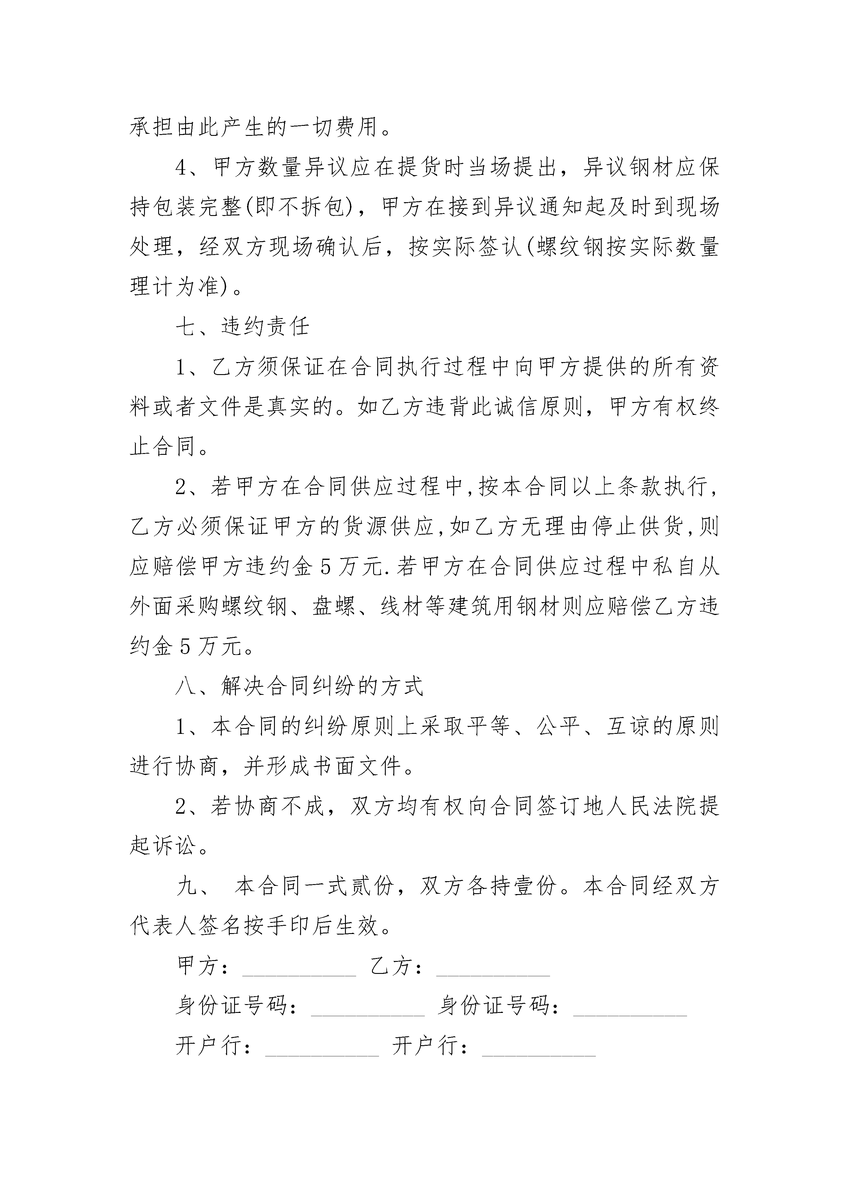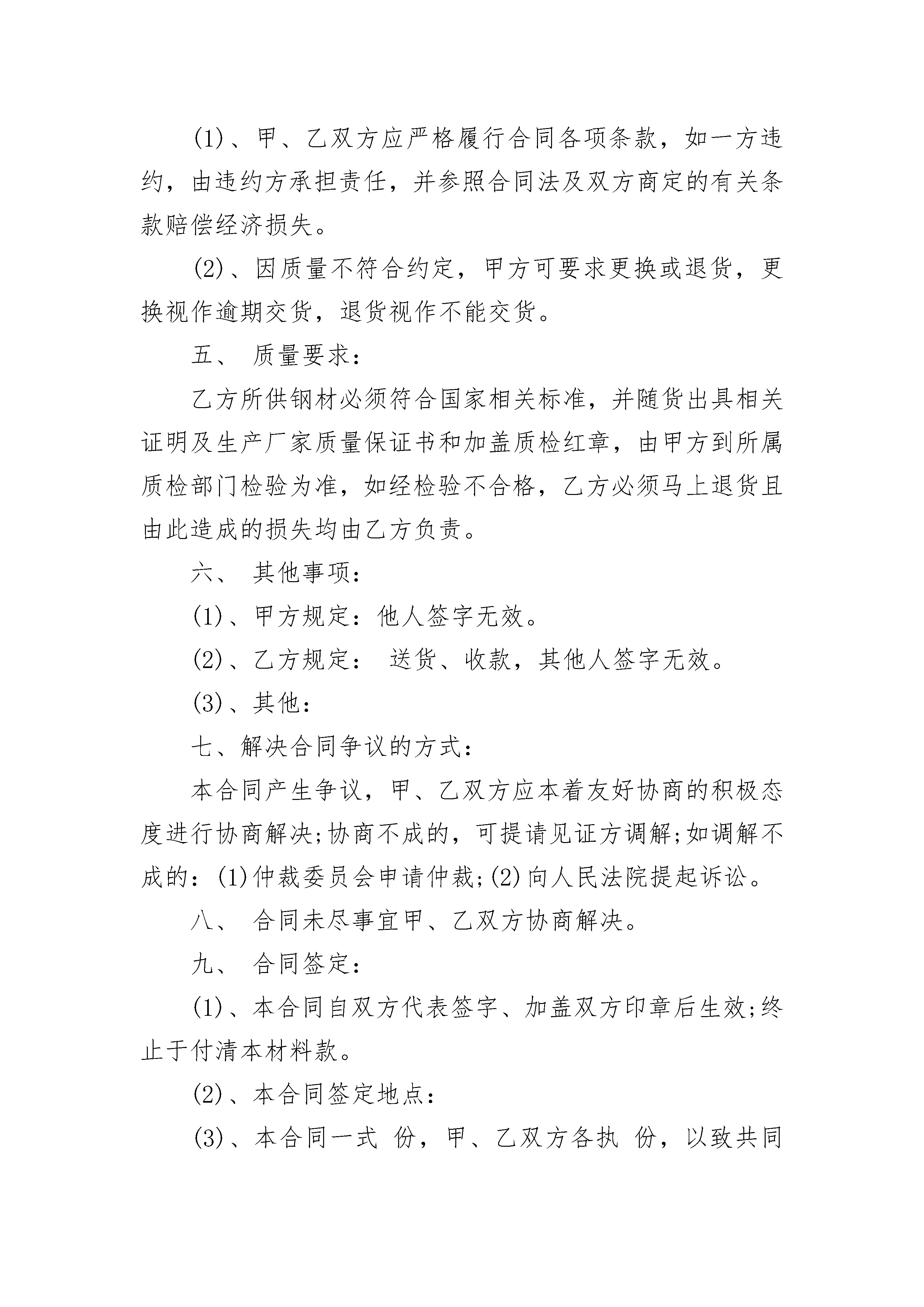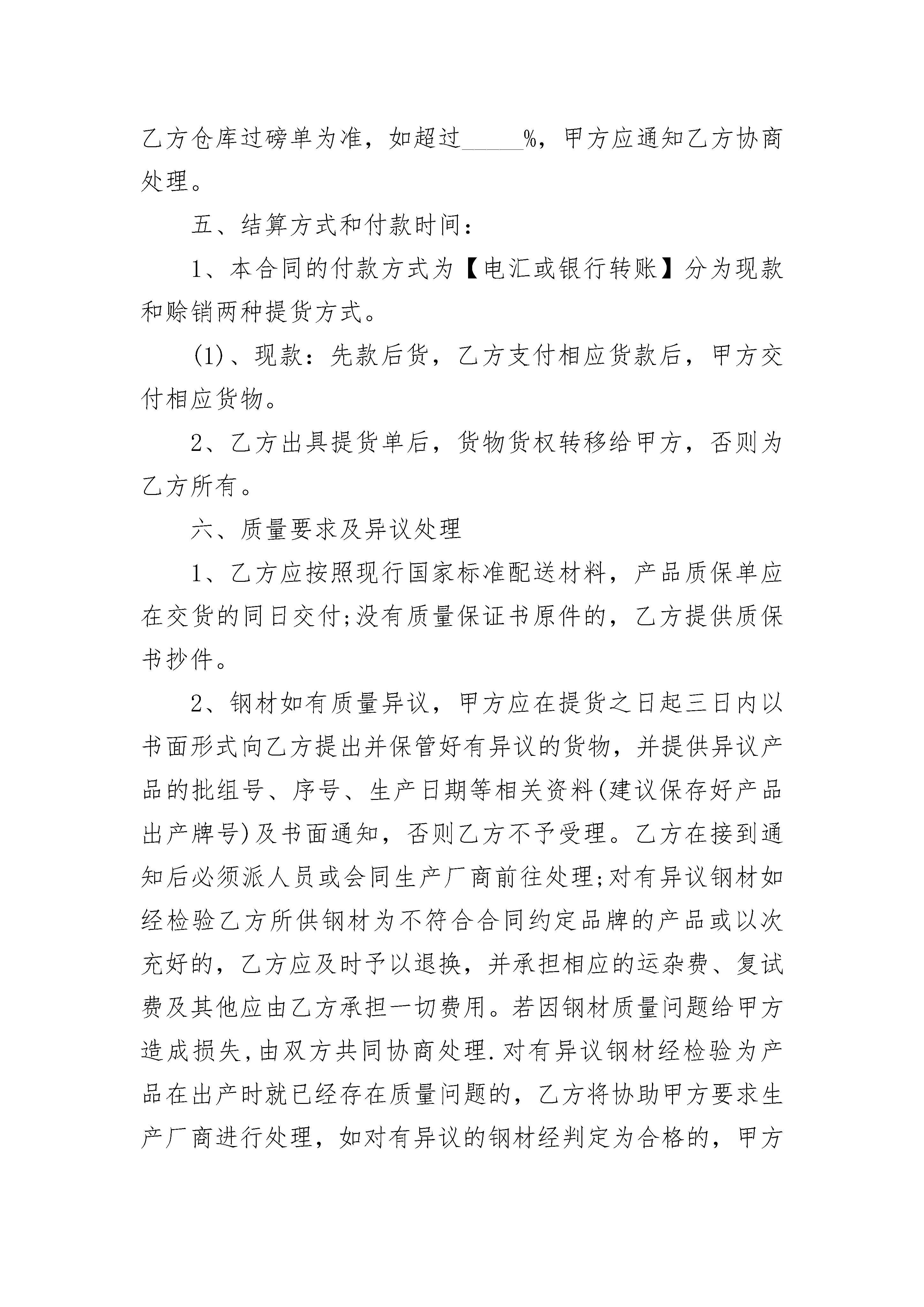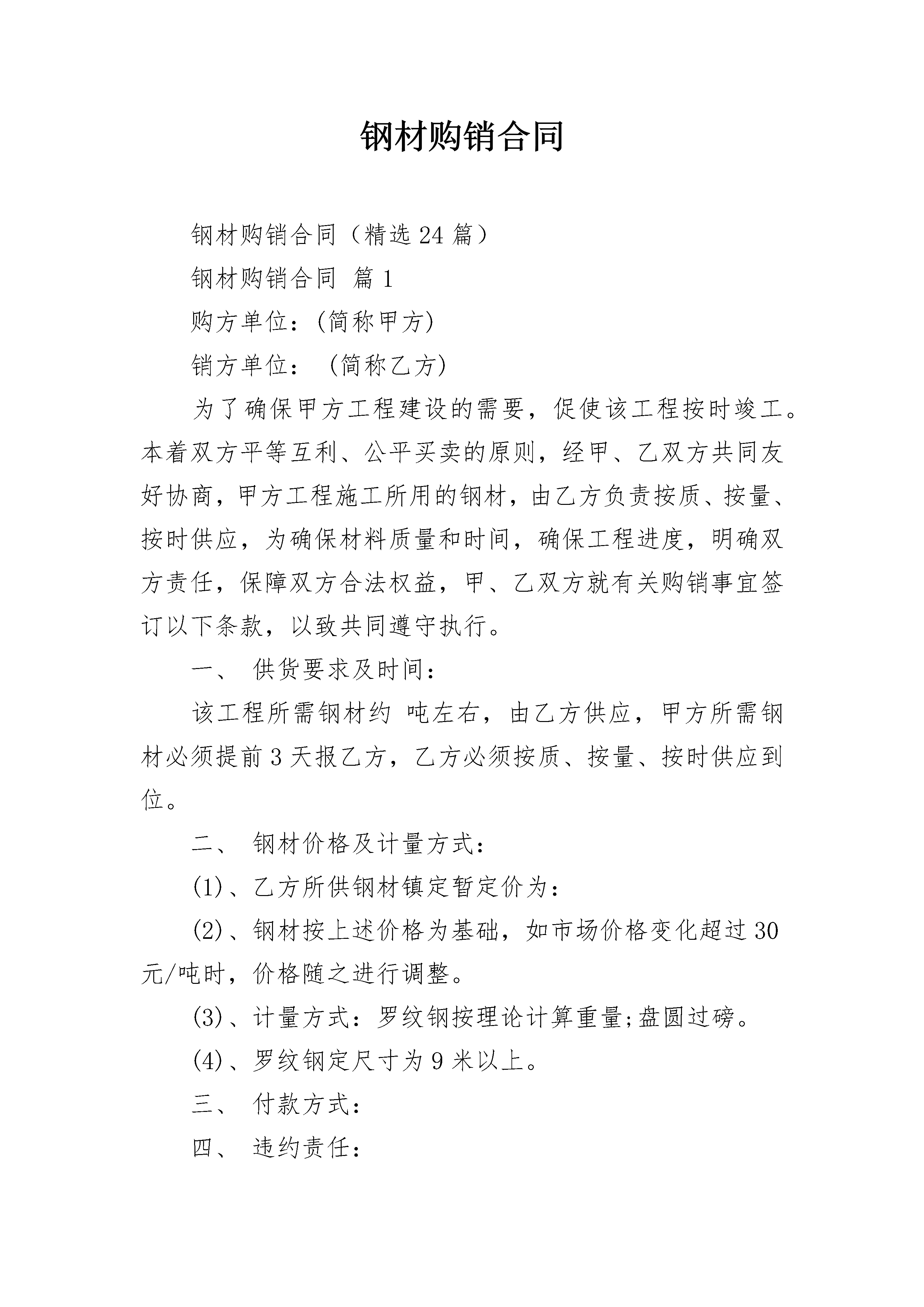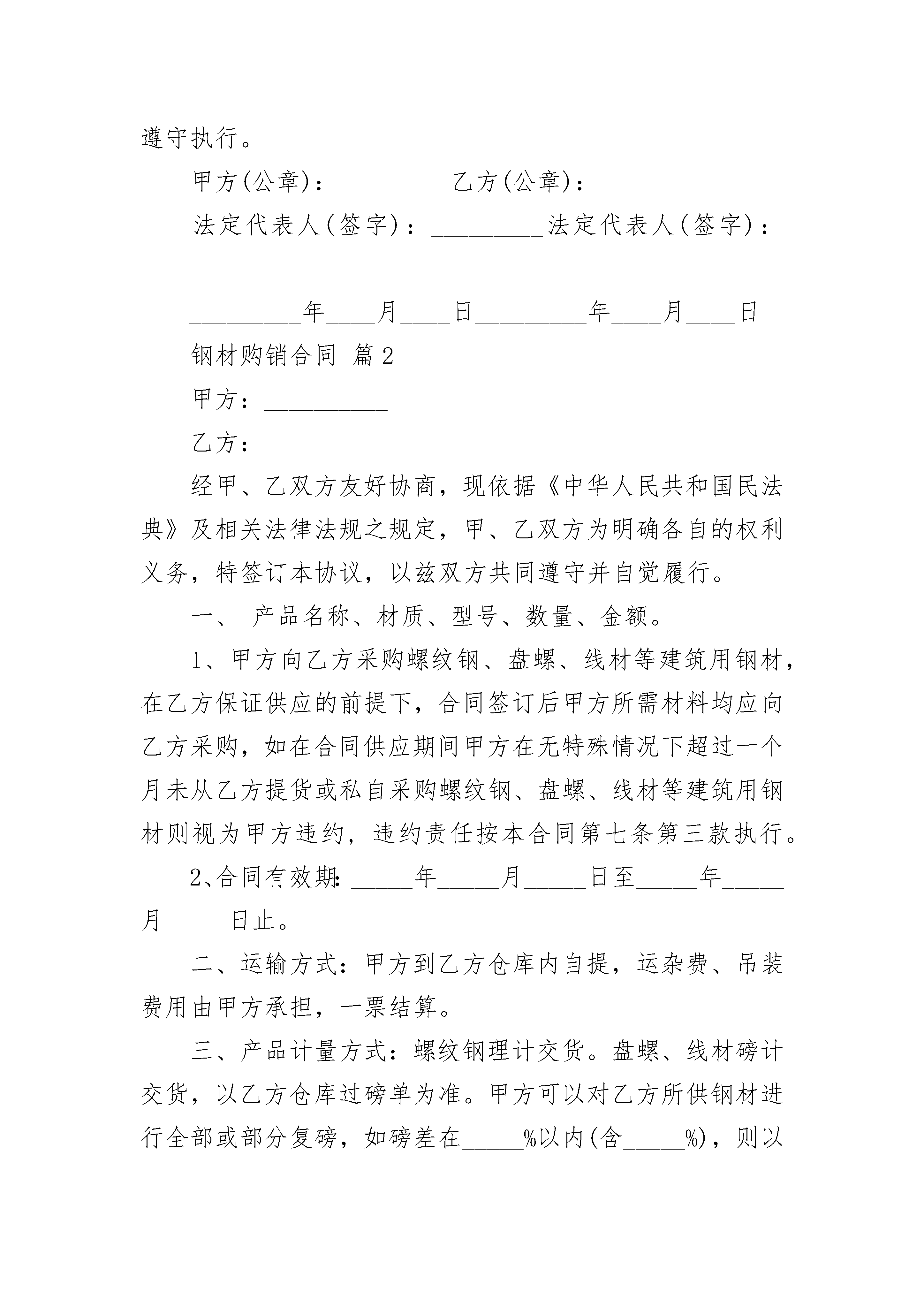 钢材购销合同钢材购销合同(精选24篇)钢材购销合同篇1购方单位:(简称甲方)销方单位:(简称乙方)为了确保甲方工程建设的需要,促使该工程按时竣工。本着双方平等互利、公平买卖的原则,经甲、乙双方共同友好协商,甲方工程施工所用的钢材,由乙方负责按质、按量、按时供应,为确保材料质量和时间,确保工程进度,明确双方责任,保障双方合法权益,甲、乙双方就有关购销事宜签订以下条款,以致共同遵守执行。一、供货要求及时间:该工程所需钢材约吨左右,由乙方供应,甲方所需钢材必须提前3天报乙方,乙方必须按质、按量、按时供应到位。二、钢材价格及计量方式:(1)、乙方所供钢材镇定暂定价为:(2)、钢材按上述价格为基础,如市场价格变化超过30元/吨时,价格随之进行调整。(3)、计量方式:罗纹钢按理论计算重量;盘圆过磅。(4)、罗纹钢定尺寸为9米以上。三、付款方式:四、违约责任:(1)、甲、乙双方应严格履行合同各项条款,如一方违约,由违约方承担责任,并参照合同法及双方商定的有关条款赔偿经济损失。(2)、因质量不符合约定,甲方可要求更换或退货,更换视作逾期交货,退货视作不能交货。五、质量要求:乙方所供钢材必须符合国家相关标准,并随货出具相关证明及生产厂家质量保证书和加盖质检红章,由甲方到所属质检部门检验为准,如经检验不合格,乙方必须马上退货且由此造成的损失均由乙方负责。六、其他事项:(1)、甲方规定:他人签字无效。(2)、乙方规定:送货、收款,其他人签字无效。(3)、其他:七、解决合同争议的方式:本合同产生争议,甲、乙双方应本着友好协商的积极态度进行协商解决;协商不成的,可提请见证方调解;如调解不成的:(1)仲裁委员会申请仲裁;(2)向人民法院提起诉讼。八、合同未尽事宜甲、乙双方协商解决。九、合同签定:(1)、本合同自双方代表签字、加盖双方印章后生效;终止于付清本材料款。(2)、本合同签定地点:(3)、本合同一式份,甲、乙双方各执份,以致共同遵守执行。甲方(公章):_________乙方(公章):_________法定代表人(签字):_________法定代表人(签字):__________________年____月____日_________年____月____日钢材购销合同篇2甲方:__________乙方:__________经甲、乙双方友好协商,现依据《中华人民共和国民法典》及相关法律法规之规定,甲、乙双方为明确各自的权利义务,特签订本协议,以兹双方共同遵守并自觉履行。一、产品名称、材质、型号、数量、金额。1、甲方向乙方采购螺纹钢、盘螺、线材等建筑用钢材,在乙方保证供应的前提下,合同签订后甲方所需材料均应向乙方采购,如在合同供应期间甲方在无特殊情况下超过一个月未从乙方提货或私自采购螺纹钢、盘螺、线材等建筑用钢材则视为甲方违约,违约责任按本合同第七条第三款执行。2、合同有效期:_____年_____月_____日至_____年_____月_____日止。二、运输方式:甲方到乙方仓库内自提,运杂费、吊装费用由甲方承担,一票结算。三、产品计量方式:螺纹钢理计交货。盘螺、线材磅计交货,以乙方仓库过磅单为准。甲方可以对乙方所供钢材进行全部或部分复磅,如磅差在_____%以内(含_____%),则以乙方仓库过磅单为准,如超过_____%,甲方应通知乙方协商处理。五、结算方式和付款时间:1、本合同的付款方式为【电汇或银行转账】分为现款和赊销两种提货方式。(1)、现款:先款后货,乙方支付相应货款后,甲方交付相应货物。2、乙方出具提货单后,货物货权转移给甲方,否则为乙方所有。六、质量要求及异议处理1、乙方应按照现行国家标准配送材料,产品质保单应在交货的同日交付;没有质量保证书原件的,乙方提供质保书抄件。2、钢材如有质量异议,甲方应在提货之日起三日内以书面形式向乙方提出并保管好有异议的货物,并提供异议产品的批组号、序号、生产日期等相关资料(建议保存好产品出产牌号)及书面通知,否则乙方不予受理。乙方在接到通知后必须派人员或会同生产厂商前往处理;对有异议钢材如经检验乙方所供钢材为不符合合同约定品牌的产品或以次充好的,乙方应及时予以退换,并承担相应的运杂费、复试费及其他应由乙方承担一切费用。若因钢材质量问题给甲方造成损失,由双方共同协商处理.对有异议钢材经检验为产品在出产时就已经存在质量问题的,乙方将协助甲方要求生产厂商进行处理,如对有异议的钢材经判定为合格的,甲方承担由此产生的一切费用。4、甲方数量异议应在提货时当场提出,异议钢材应保持包装完整(即不拆包),甲方在接到异议通知起及时到现场处理,经双方现场确认后,按实际签认(螺纹钢按实际数量理计为准)。七、违约责任1、乙方须保证在合同执行过程中向甲方提供的所有资料或者文件是真实的。如乙方违背此诚信原则,甲方有权终止合同。2、