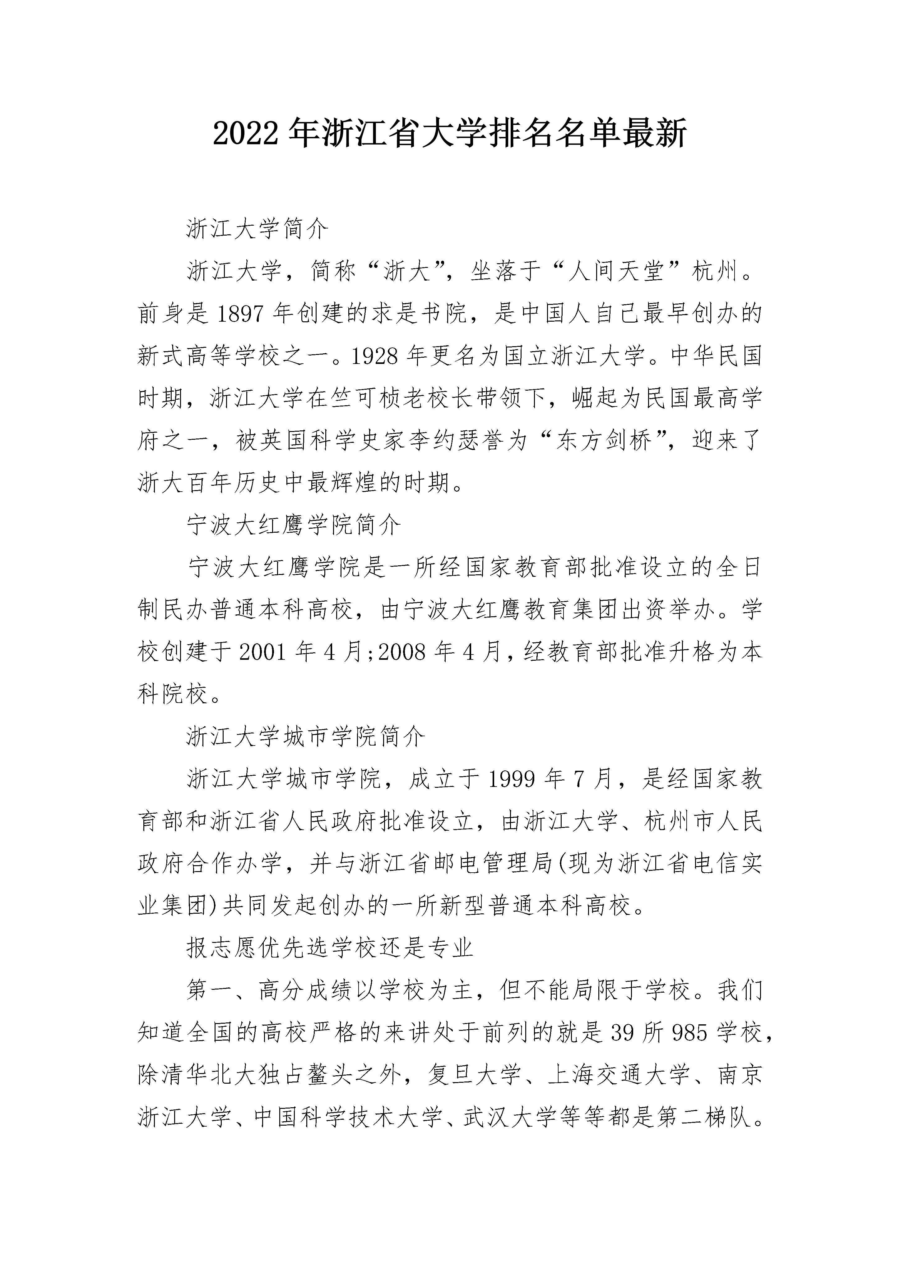 2022年浙江省大学排名名单最新浙江大学简介浙江大学,简称“浙大”,坐落于“人间天堂”杭州。前身是1897年创建的求是书院,是中国人自己最早创办的新式高等学校之一。1928年更名为国立浙江大学。中华民国时期,浙江大学在竺可桢老校长带领下,崛起为民国最高学府之一,被英国科学史家李约瑟誉为“东方剑桥”,迎来了浙大百年历史中最辉煌的时期。宁波大红鹰学院简介宁波大红鹰学院是一所经国家教育部批准设立的全日制民办普通本科高校,由宁波大红鹰教育集团出资举办。学校创建于2001年4月;2008年4月,经教育部批准升格为本科院校。浙江大学城市学院简介浙江大学城市学院,成立于1999年7月,是经国家教育部和浙江省人民政府批准设立,由浙江大学、杭州市人民政府合作办学,并与浙江省邮电管理局(现为浙江省电信实业集团)共同发起创办的一所新型普通本科高校。报志愿优先选学校还是专业第一、高分成绩以学校为主,但不能局限于学校。我们知道全国的高校严格的来讲处于前列的就是39所985学校,除清华北大独占鳌头之外,复旦大学、上海交通大学、南京浙江大学、中国科学技术大学、武汉大学等等都是第二梯队。其他的诸如哈尔滨工业大学、西安交通大学、中山大学、厦门大学等等为第三梯队,最后一个梯队,也就是西北农林科技大学是第五梯队,其余的都可以归为第四梯队。如果学生的分数能够考到清华大学,北京大学,那坚决以学校为主。其余的学校可以在兼顾专业的前提下,适当降低学校的层次,以学自己心仪的专业为主,做到学校专业两相顾,但是要把学校放到第一位。第二、中高分学生,要尽可能兼顾学校、专业。除985以外,211学校也就70多所。能够达到这个层次的这部分的学生应当以兼顾211学校为主。毕竟现在的本科出身越来越被重视。但是,同第一条一样,保专业可以适当降低学校层次,毕竟有211的名头对将来考研、就业相对好一些。但绝不建议去诸如__大学等照顾性的偏远地区211学校。同时要结合自己的职业发展规划来确定学校,但前提必须要把专业放到第一位。第三、低分学生要以专业为主。现今的社会分工越来越细,对专业技术人才的要求也越来越高。这部分学生必须以专业为主,统筹考虑地域和学校,但是老驴地域要大于考虑学校。如果本科就业的学生,还要考虑学校当地产业链的完备情况。如果准备考研,那就以学校为主。第四、最后的一部分学生果断以专业为导向。专业要学习那些操作性强、技术性强的专业,确保学习一技之长。不要为了自己所谓的面子,去上一些所谓的本科院校,结果什么都学不到,白白耽误了几年的青春时光。这部分学生选专业必须要做到精挑细选,学习一技之长是他们必须要完成的任务。填报高考志愿的窍门1、选择哪个学校在这提醒朋友们,填报的几个志愿中一定要注意梯度,尤其是分数正好卡线的朋友。不要一味的追求名校,把所有志愿选择同一层次的学校,更忌全部志愿扎堆名校。2、选择什么专业其实专业并无冷热之分,就算当时火热,谁也说不上等你毕业的时候会是什么样。而且,大学毕业后,很大一部分人从事的工作与自己的专业不对口。选择专业最主要的是结合自己的兴趣和基础,或者毕业后想从事的工作有特殊要求的专业,比如想当医生,就得选择相对应的专业。3、尽早了解填报的相关信息不要高考完就一味的进入疯狂模式,要尽早的去了解学校和专业。很多名称看起来相似的专业其实所学的课程、发展方向的禅意是非常大的。举个例子:口腔医学技术专业压根不能当牙医,能当牙医的是口腔医学专业。所以不要等到该填报了,才想起来去了解。
