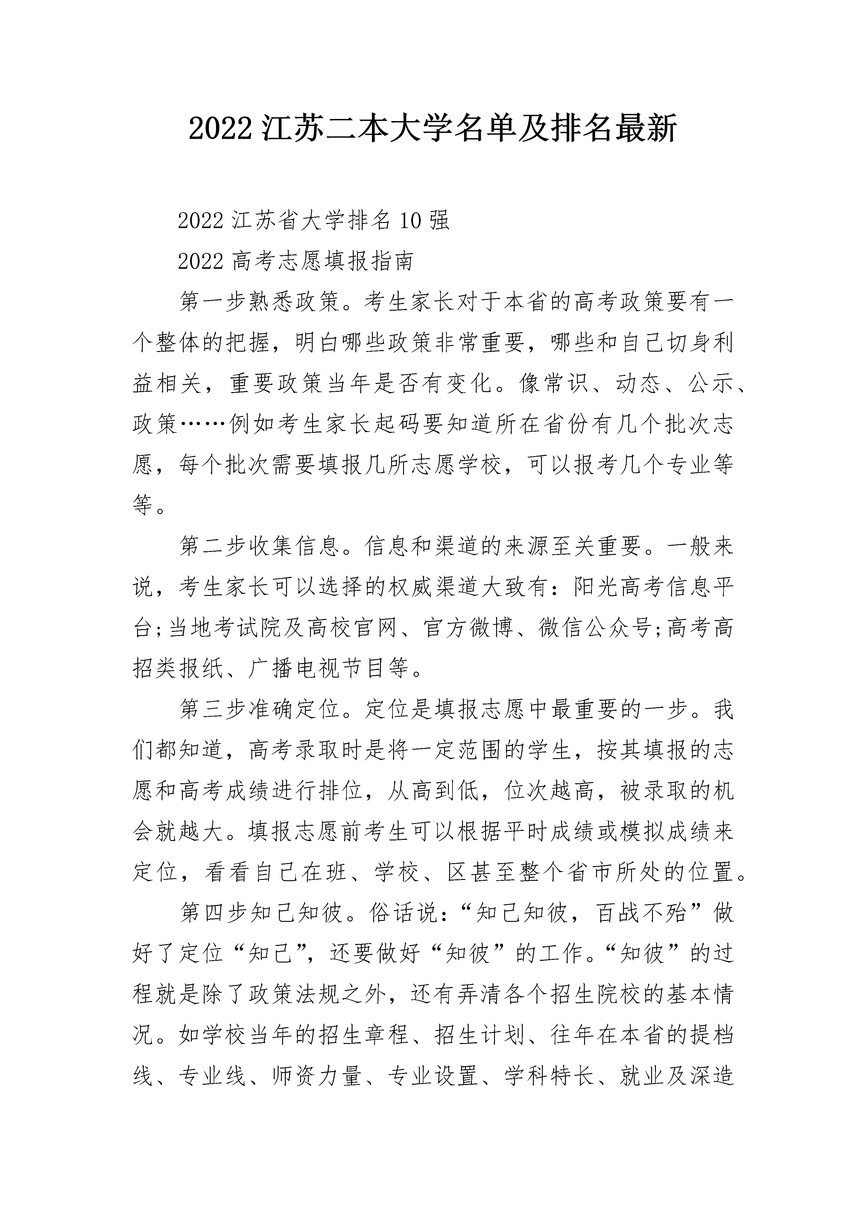 2022江苏二本大学名单及排名最新2022江苏省大学排名10强2022高考志愿填报指南第一步熟悉政策。考生家长对于本省的高考政策要有一个整体的把握,明白哪些政策非常重要,哪些和自己切身利益相关,重要政策当年是否有变化。像常识、动态、公示、政策……例如考生家长起码要知道所在省份有几个批次志愿,每个批次需要填报几所志愿学校,可以报考几个专业等等。第二步收集信息。信息和渠道的来源至关重要。一般来说,考生家长可以选择的权威渠道大致有:阳光高考信息平台;当地考试院及高校官网、官方微博、微信公众号;高考高招类报纸、广播电视节目等。第三步准确定位。定位是填报志愿中最重要的一步。我们都知道,高考录取时是将一定范围的学生,按其填报的志愿和高考成绩进行排位,从高到低,位次越高,被录取的机会就越大。填报志愿前考生可以根据平时成绩或模拟成绩来定位,看看自己在班、学校、区甚至整个省市所处的位置。第四步知己知彼。俗话说:“知己知彼,百战不殆”做好了定位“知己”,还要做好“知彼”的工作。“知彼”的过程就是除了政策法规之外,还有弄清各个招生院校的基本情况。如学校当年的招生章程、招生计划、往年在本省的提档线、专业线、师资力量、专业设置、学科特长、就业及深造情况等等。第五步初选志愿。“初选志愿”是结合自己的成绩定位,确定目标院校。完成第三、四两步考生和家长对高考志愿应该已有方向了。这时,考生可以大致划定一些在本省有招生计划的院校,并认真阅读招生章程,比较各院校之间专业的招生人数、录取分数等数据,选择和自己兴趣、分数、批次相符合的院校。第六步模拟填报。“模拟填报”就是根据本省、市的志愿设置情况,将考生的高考志愿草表完整的呈现出来,做一遍真实的模拟。高考志愿都是在网上填报,在规定时间内完成,逾期不予补报。每年在志愿填报中出现的操作失误、丢失密码等问题比比皆是,再加上网络系统繁忙难免手忙脚乱,所以提前模拟有备无患。
